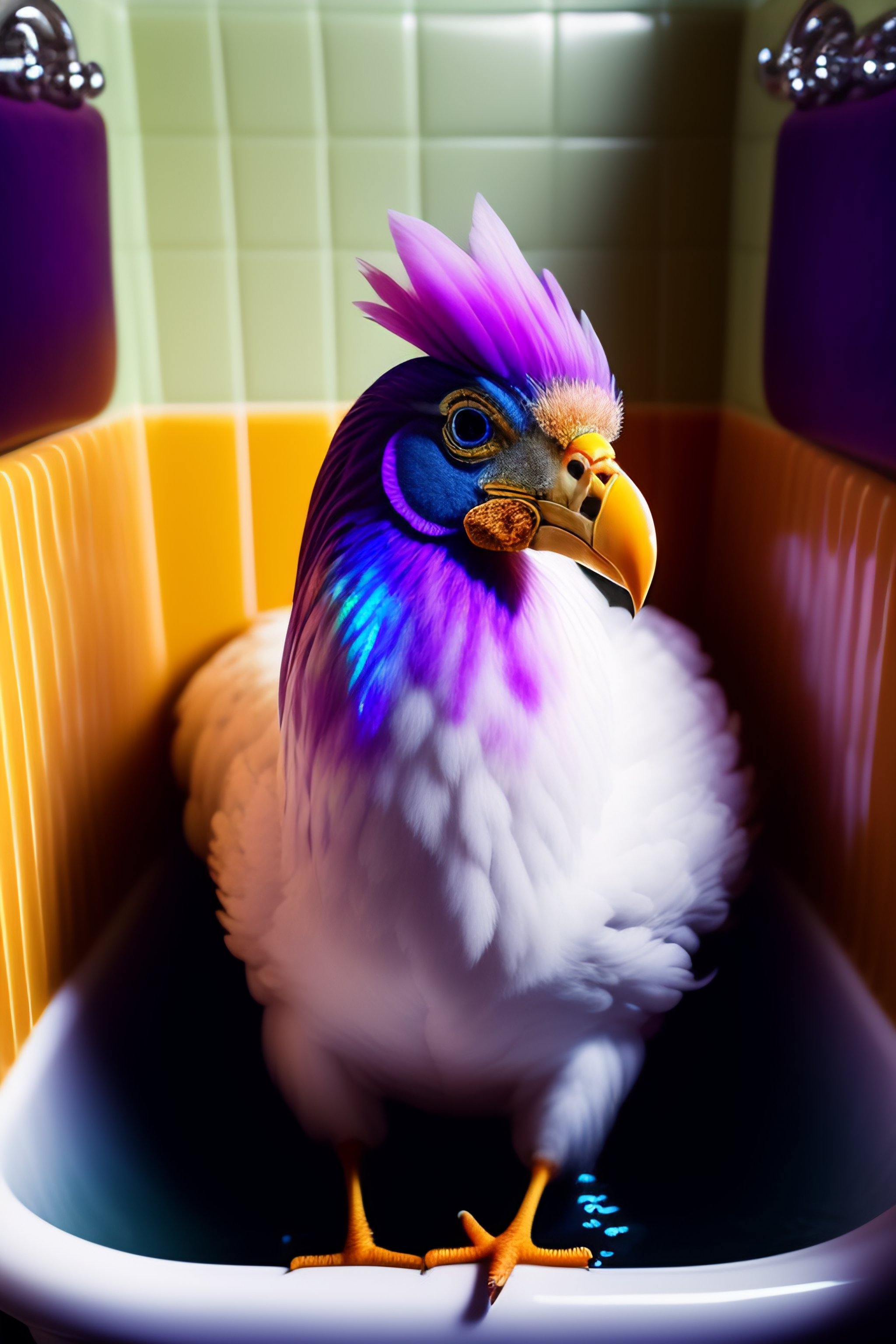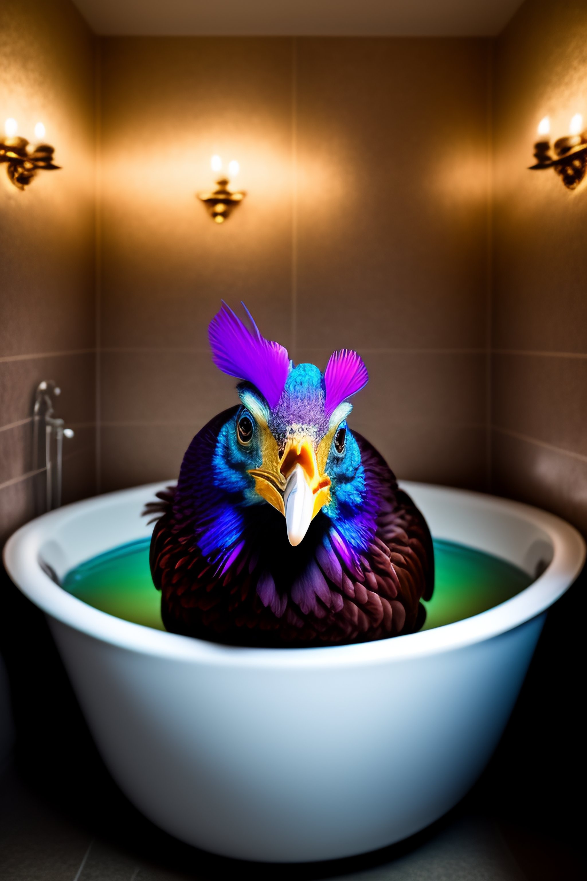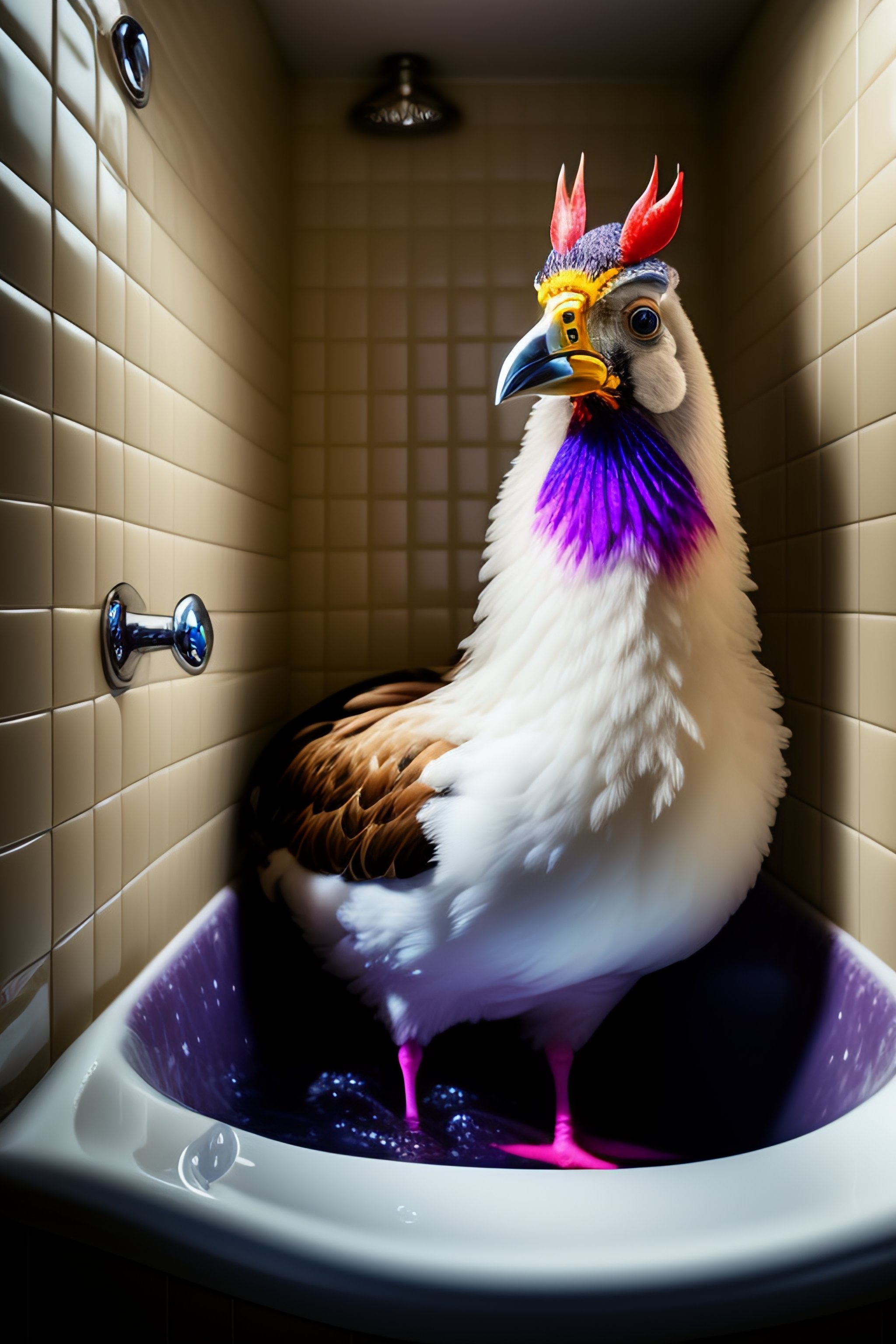 The bathtub chicken was a monstrosity to behold; its feathered body reaching over two feet tall and four feet wide, easily taking up the entire length of the bathtub. its feathers were plump and moist from being submerged in the hot, soapy water, and glimmered in a spectrum of iridescent hues ranging from orange to purple. its enormous eyes seemed to gaze directly into one's soul, while its beak opened wide and uttered a cacophony of eerie noises that echoed through the bathroom walls. one could hardly believe such a creature could fit inside a bathtub