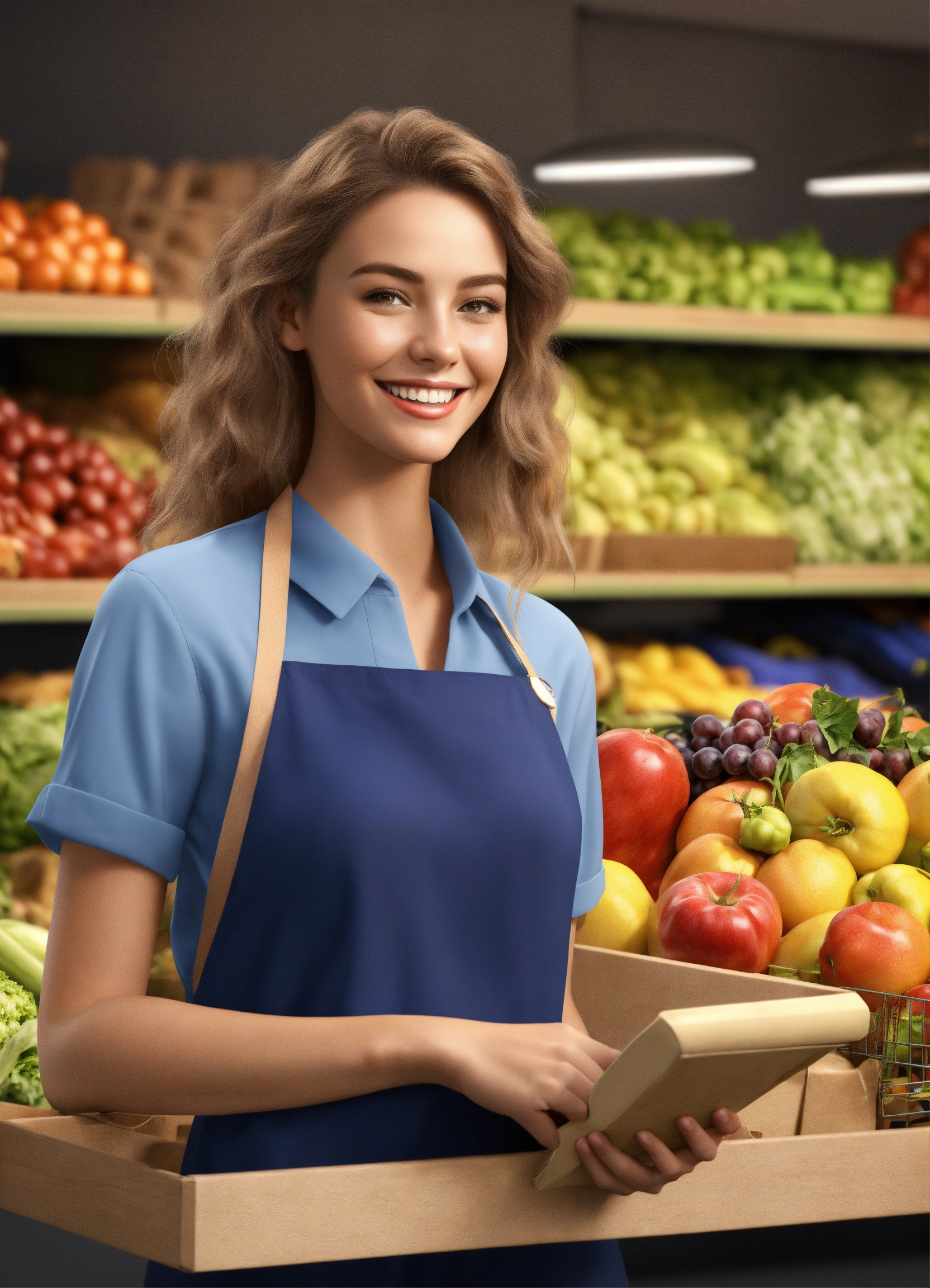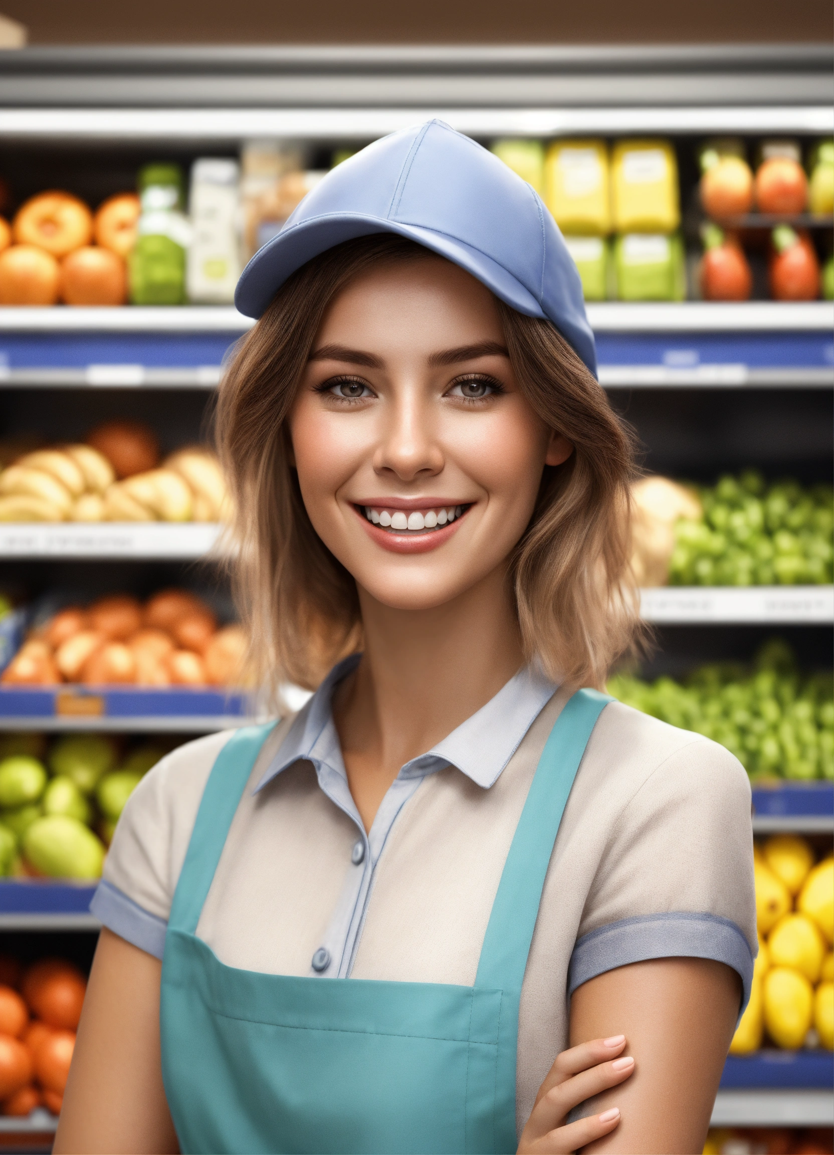 Smiling european young woman, grocery store worker, studio photo, hyper realistic, fashion, photorealistic, 3d render, blank background