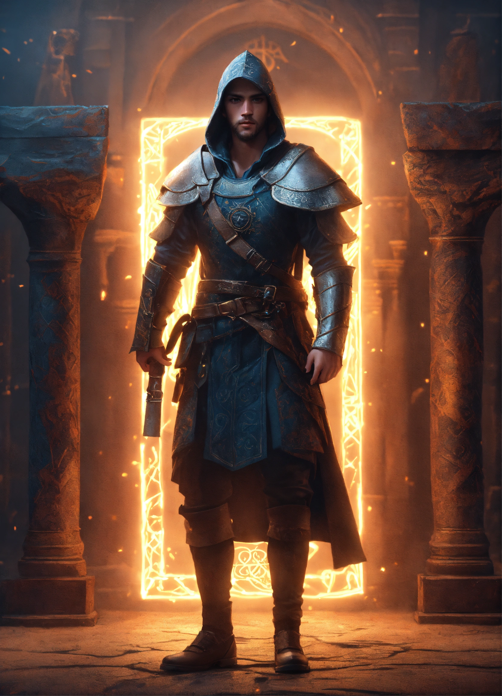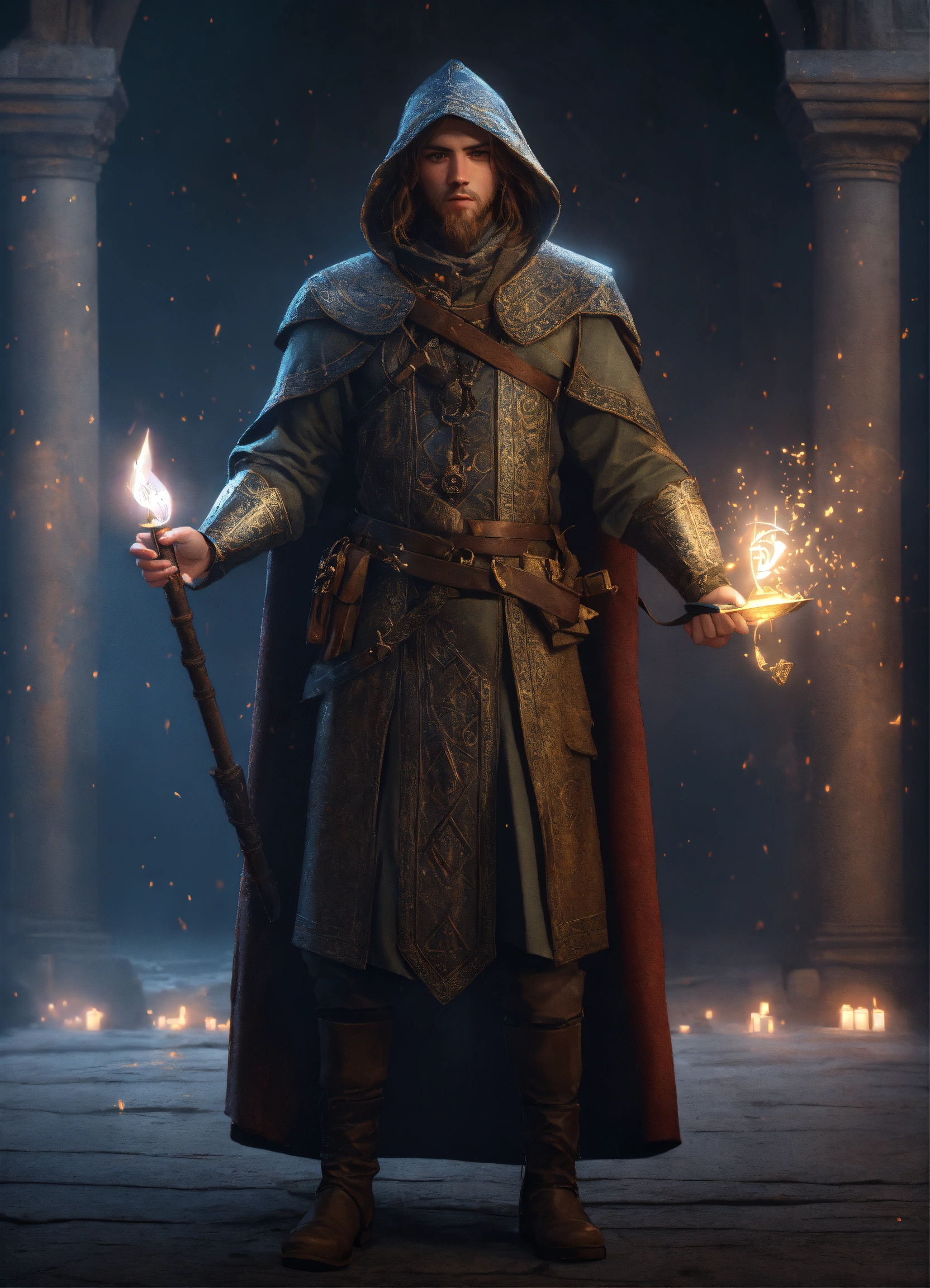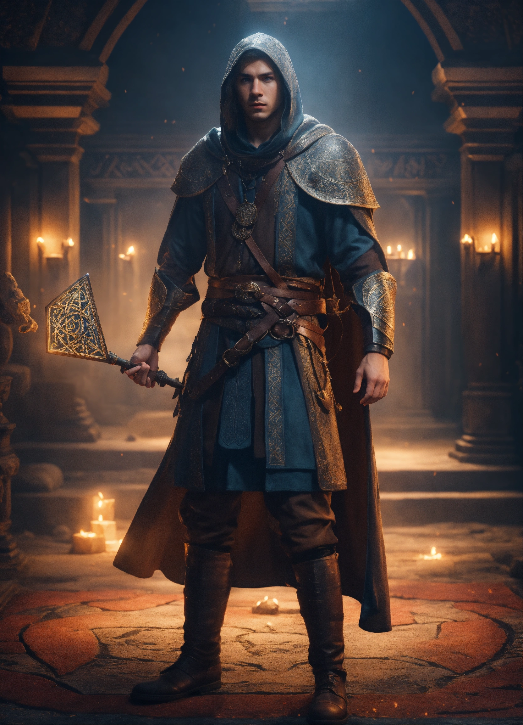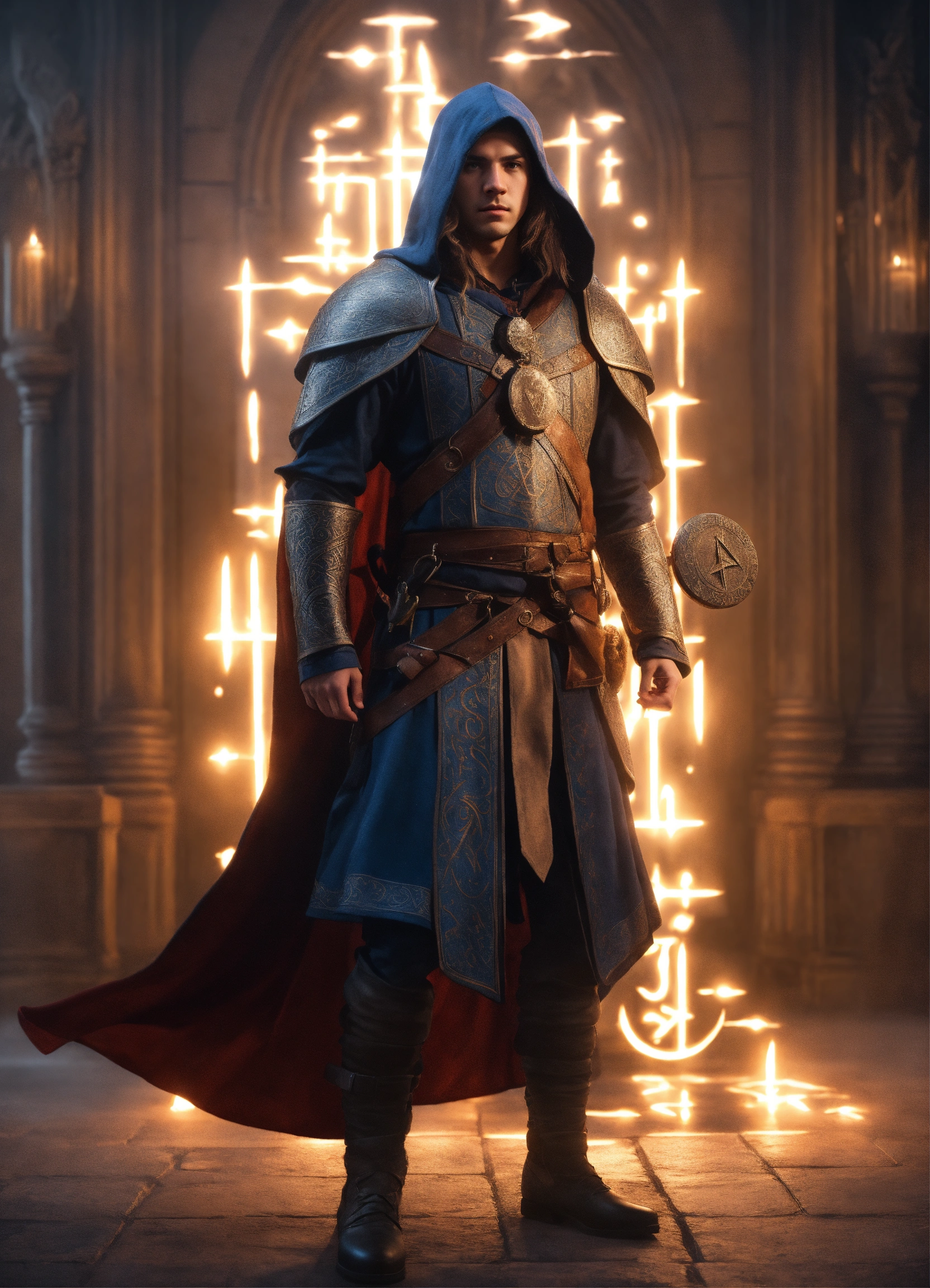 A realistic full body portrait of a medival young rune master, runes, magic, neutral background, moody, photorealistic, cinematic scene, super detailed, hyper realistic, bright lights, 8 k