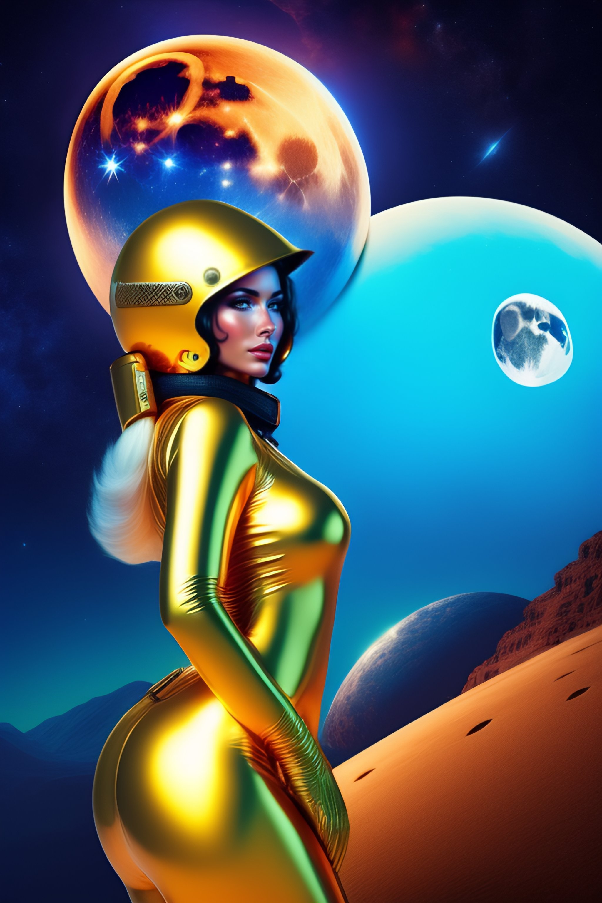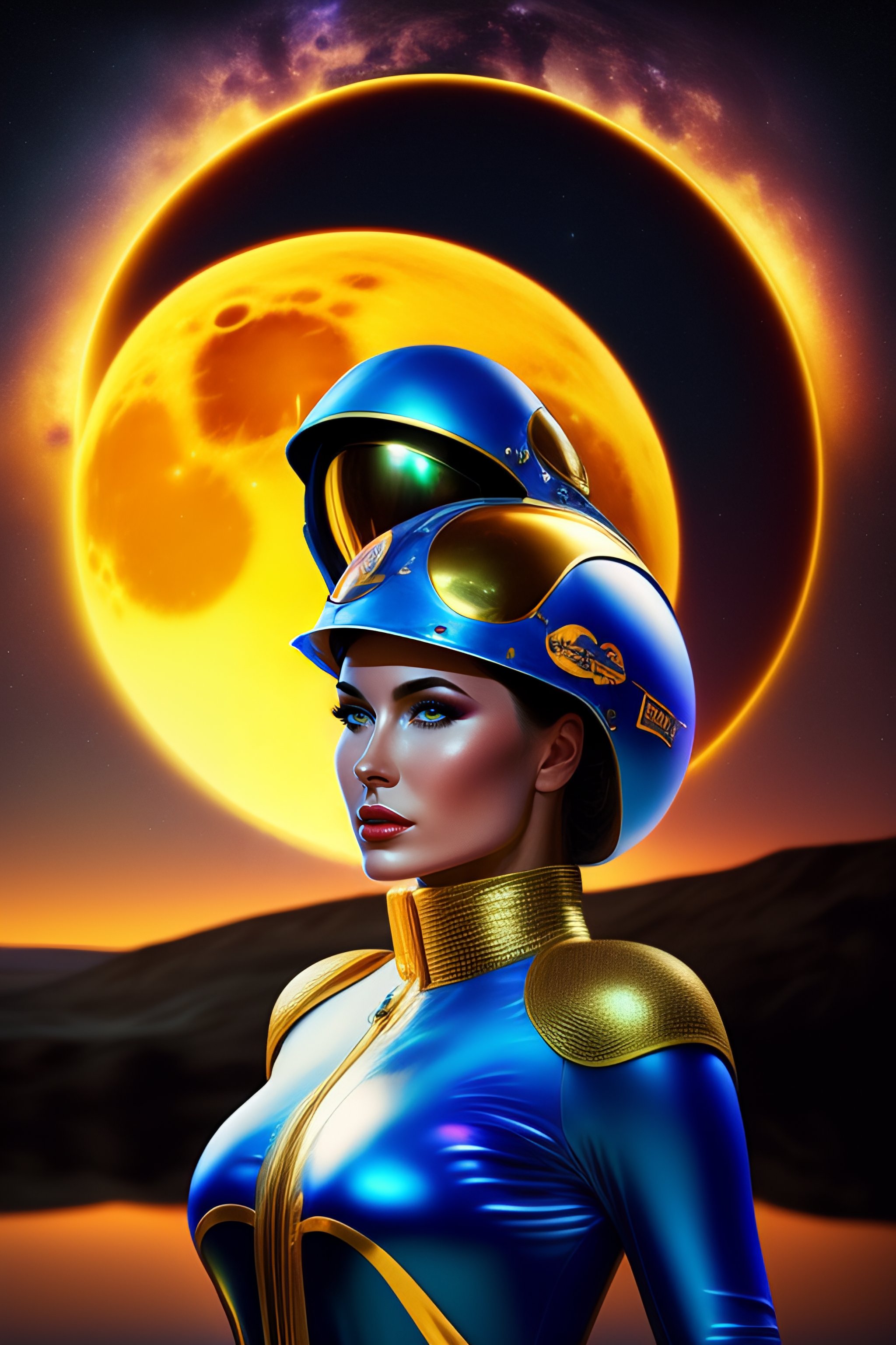 Hot spacegirl in catsuit with future golden helmet in front of a blue moon