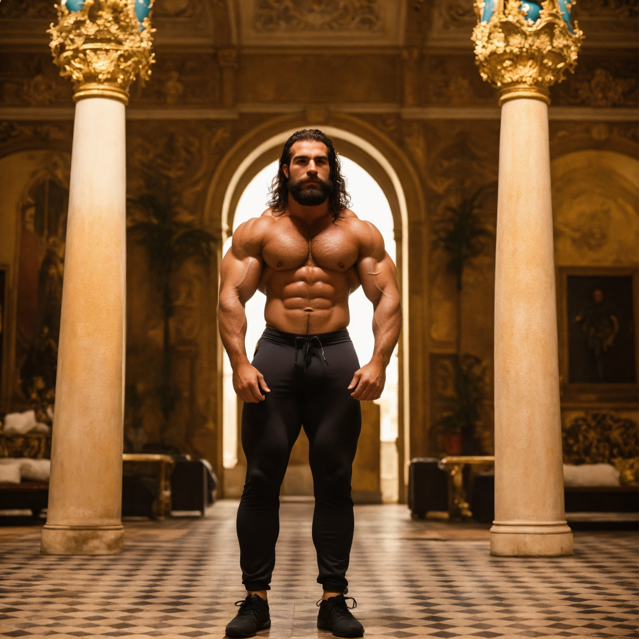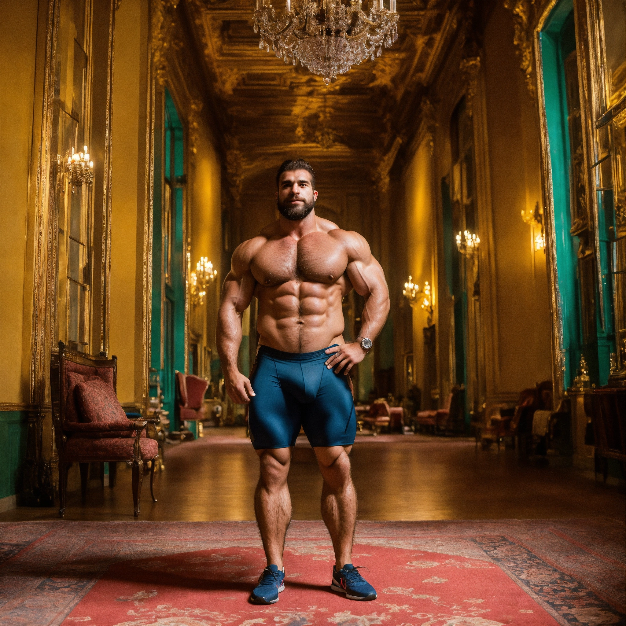 30-year-old hairy argentine man with big muscles, big bodybuilder, body like a wrestler, in a beautiful palace