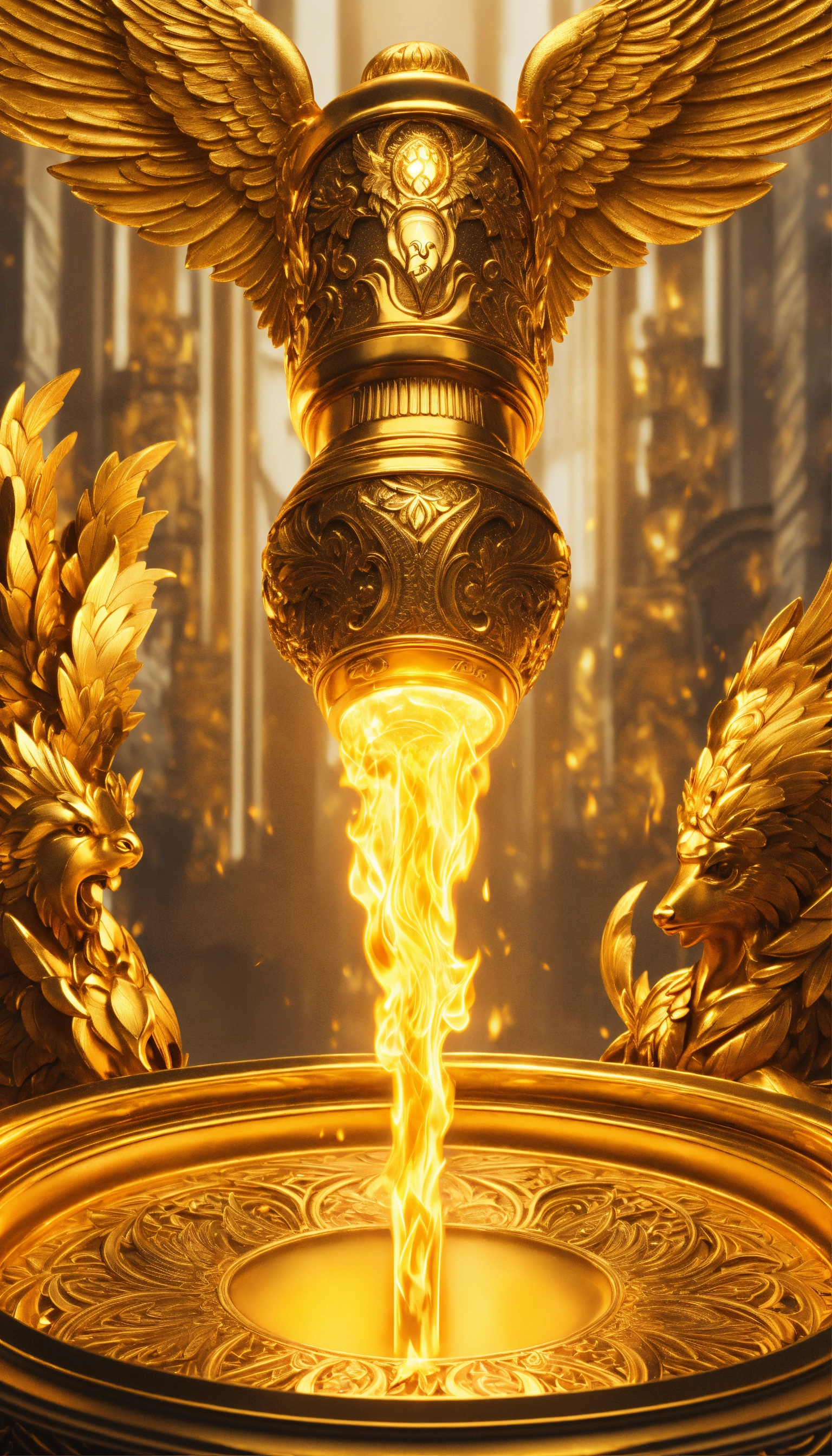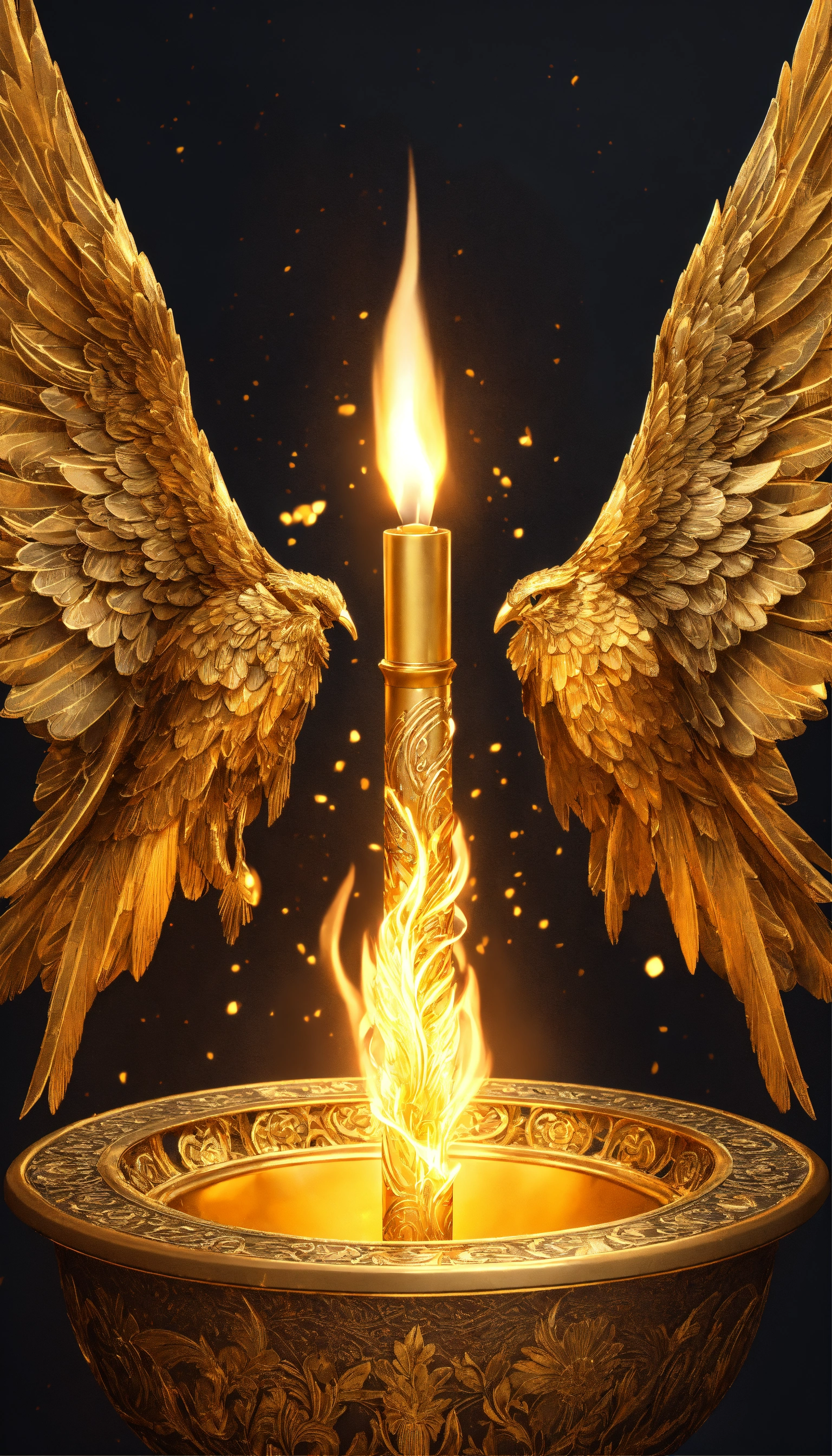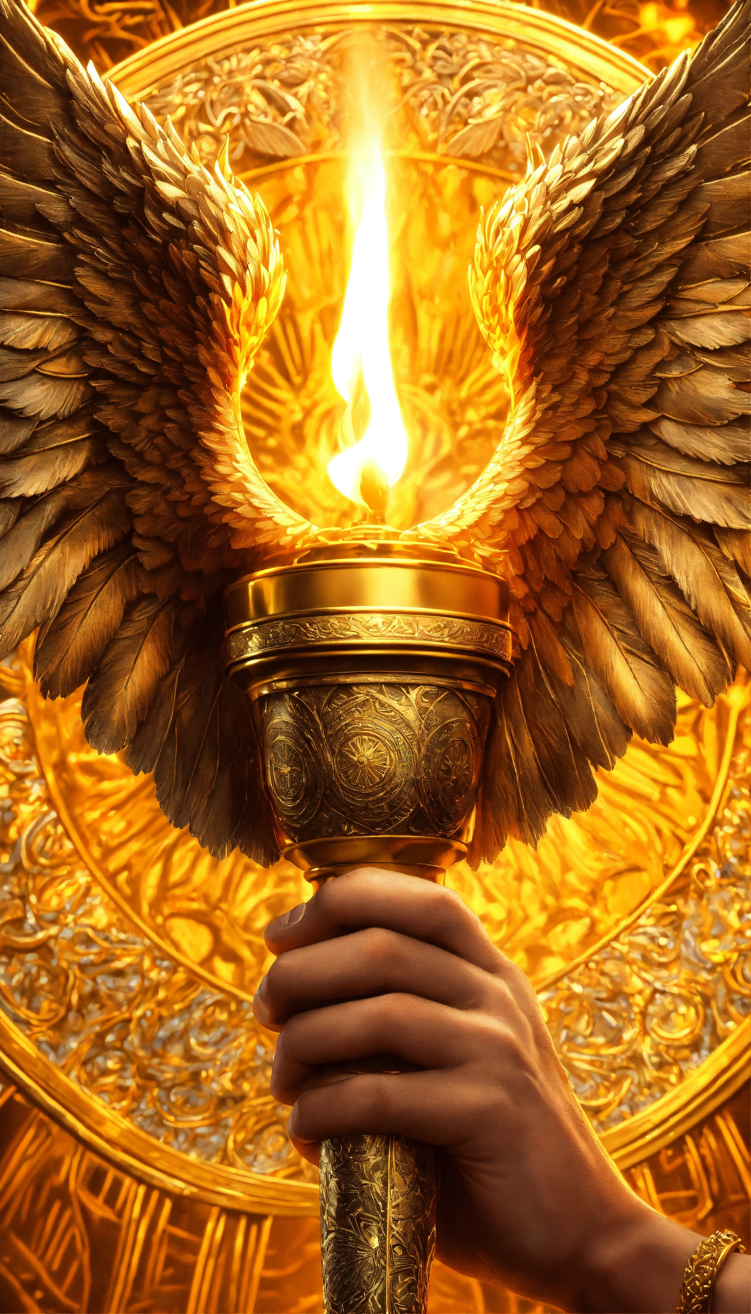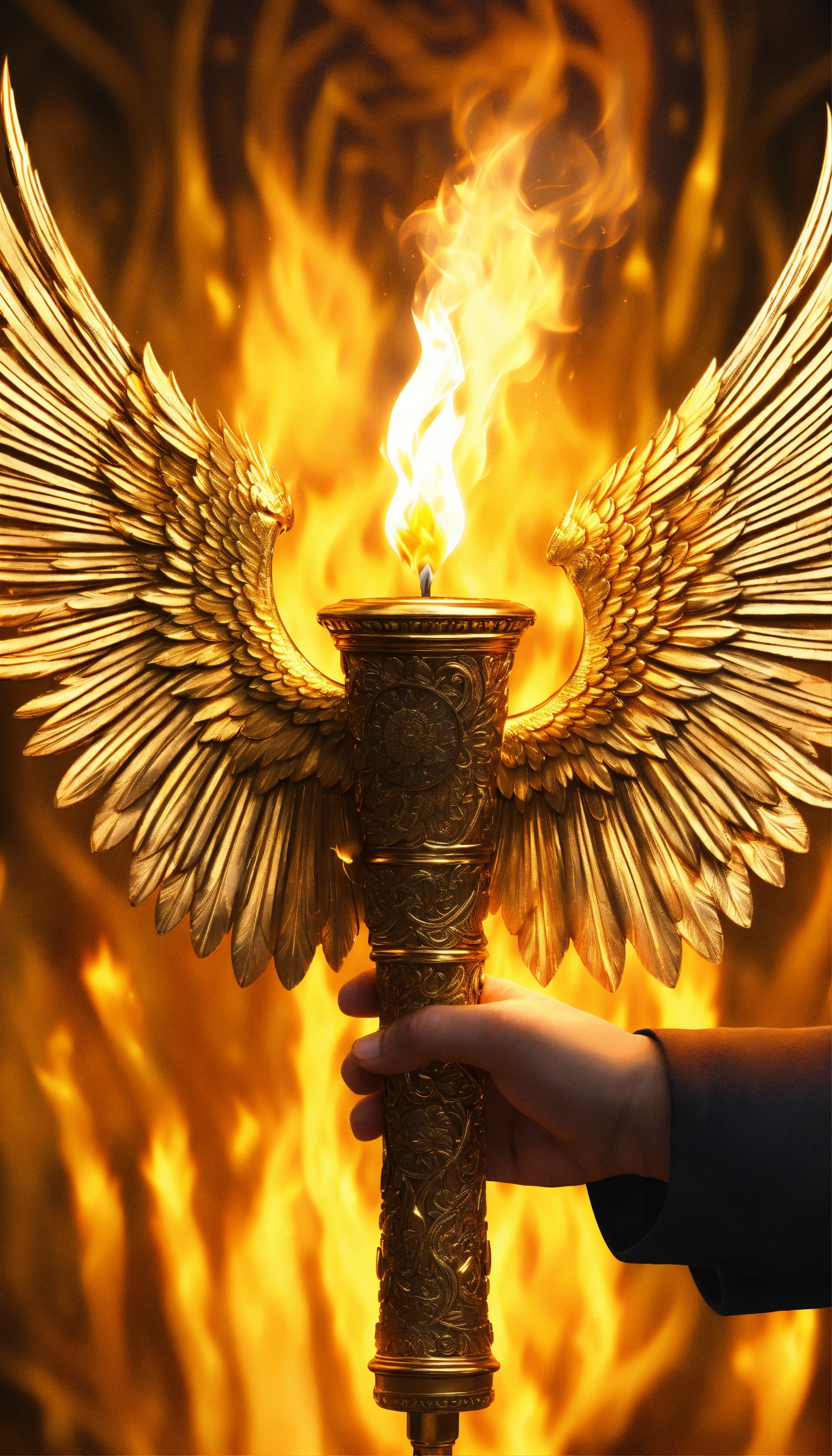 Hands. beautiful and detailed men taking a powerful torch, detailed, digital illustration, real, 3d, golden colored torch with a yellow flame with white and golden details, on each side of the torch there are golden and detailed wings, luminous mandala shape background golden, sharp focus, cinematic illustration, 8k, hyperrealistic digital painting, hd, high quality and resolution