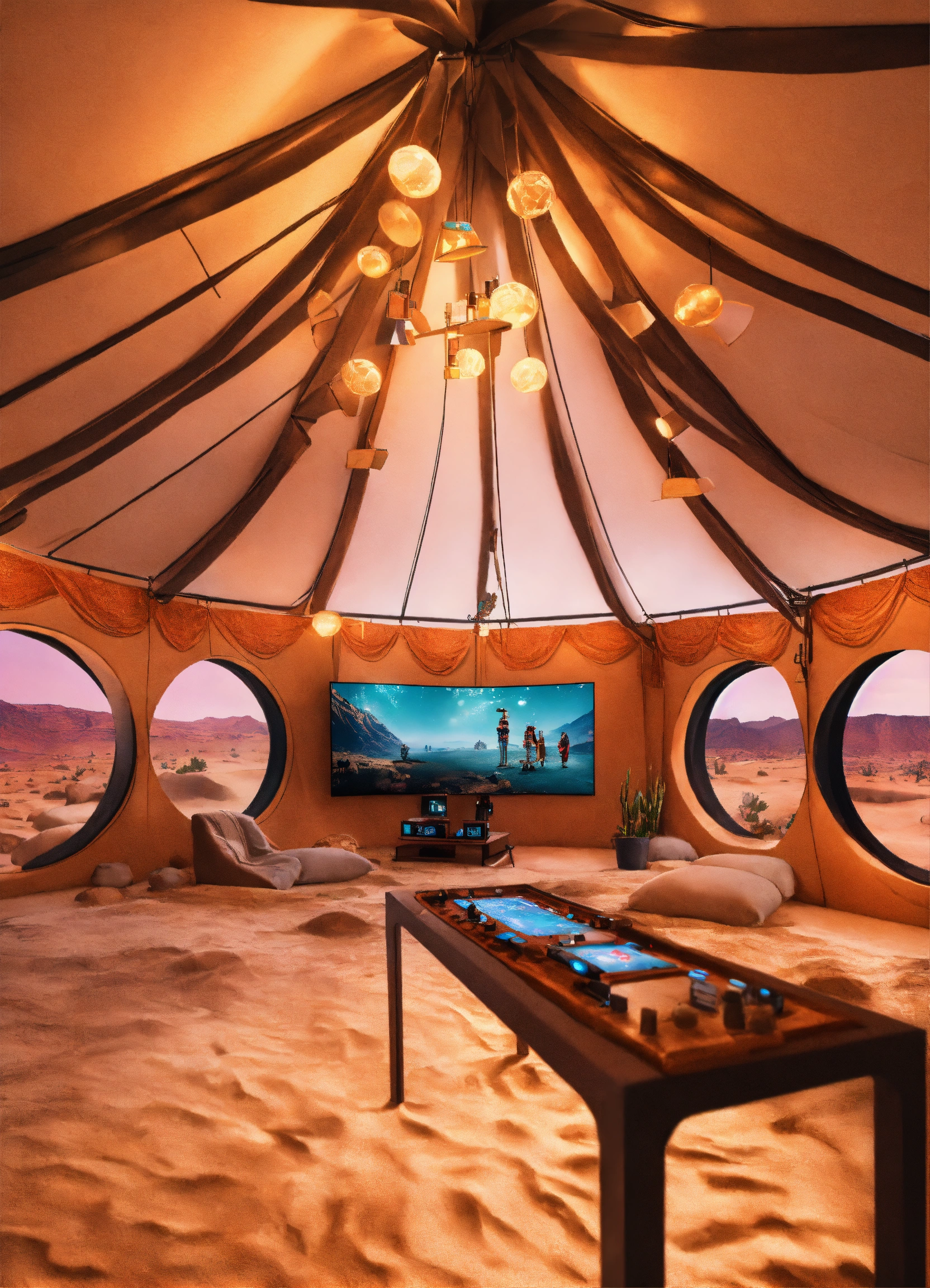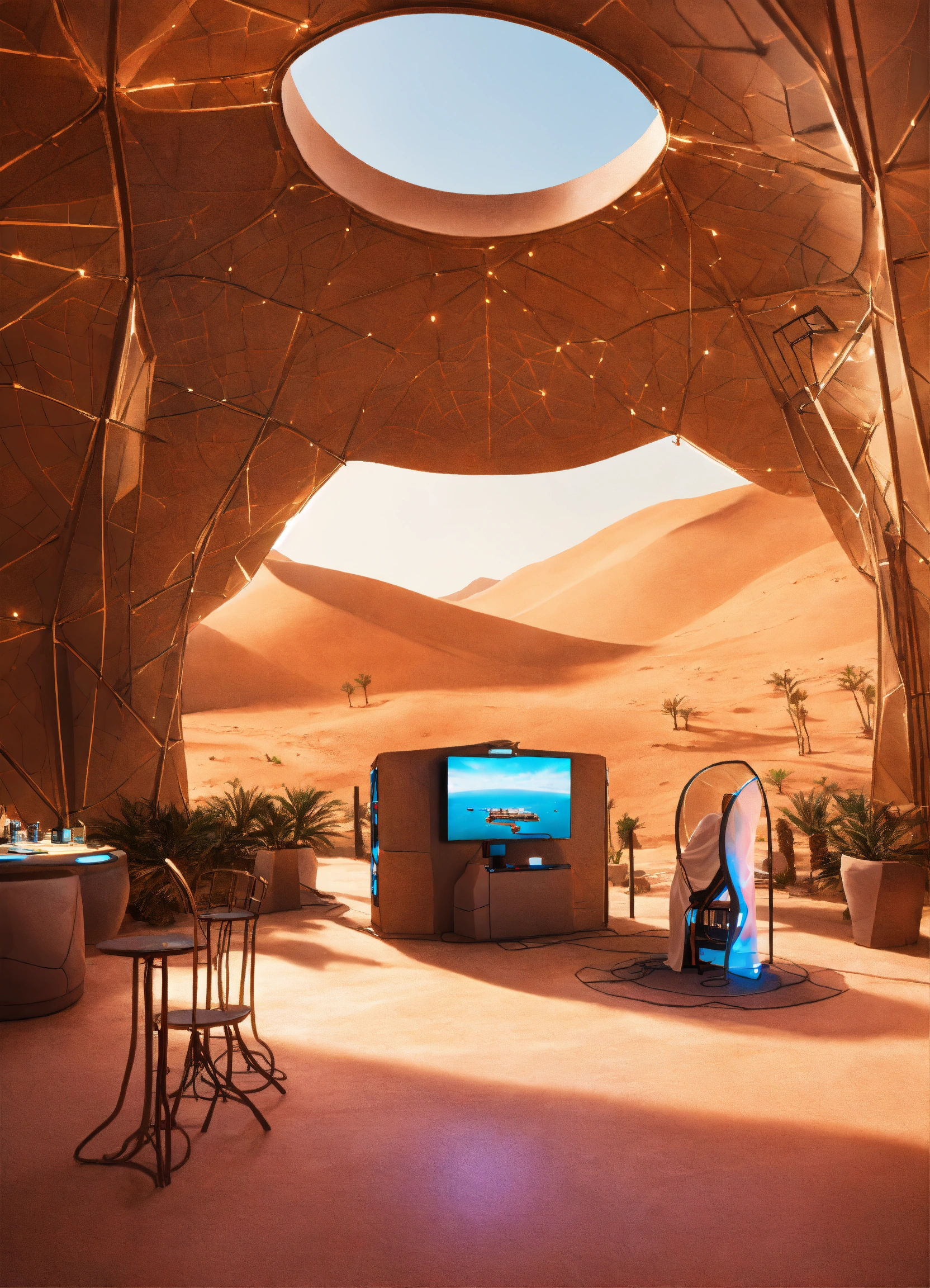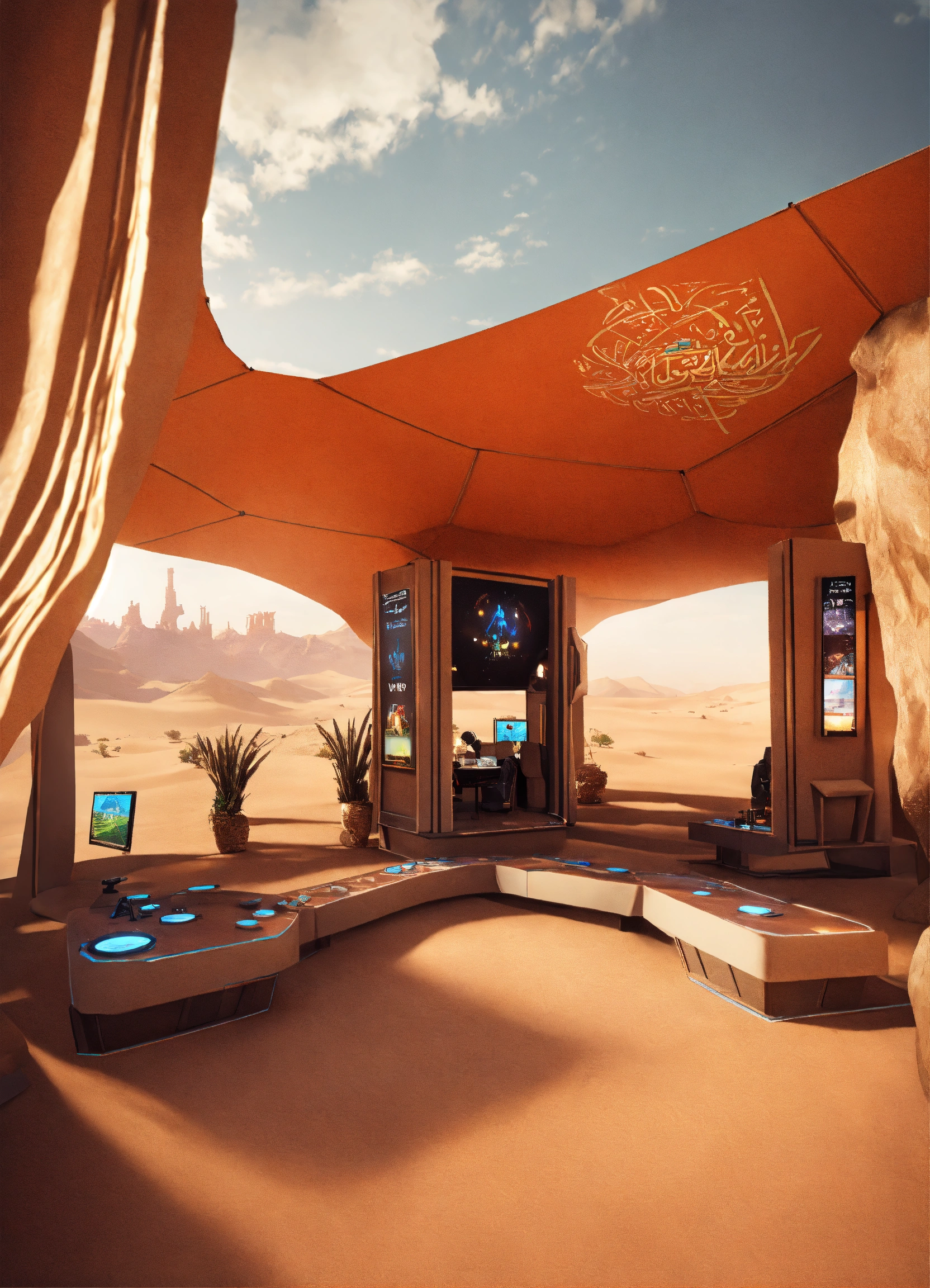 Create an image of the vr station, where visitors are immersed in a virtual desert landscape with gaming elements. in a futuristic arabic saudi theme tents, indoor