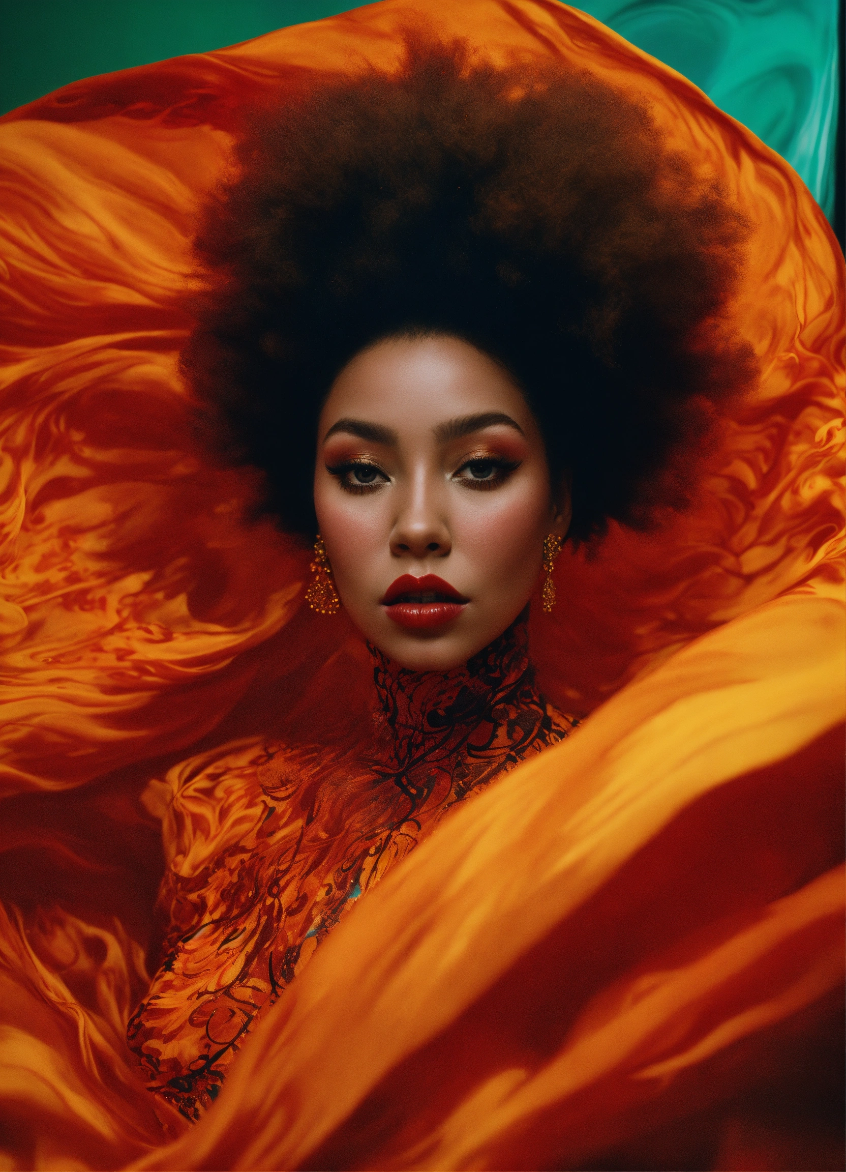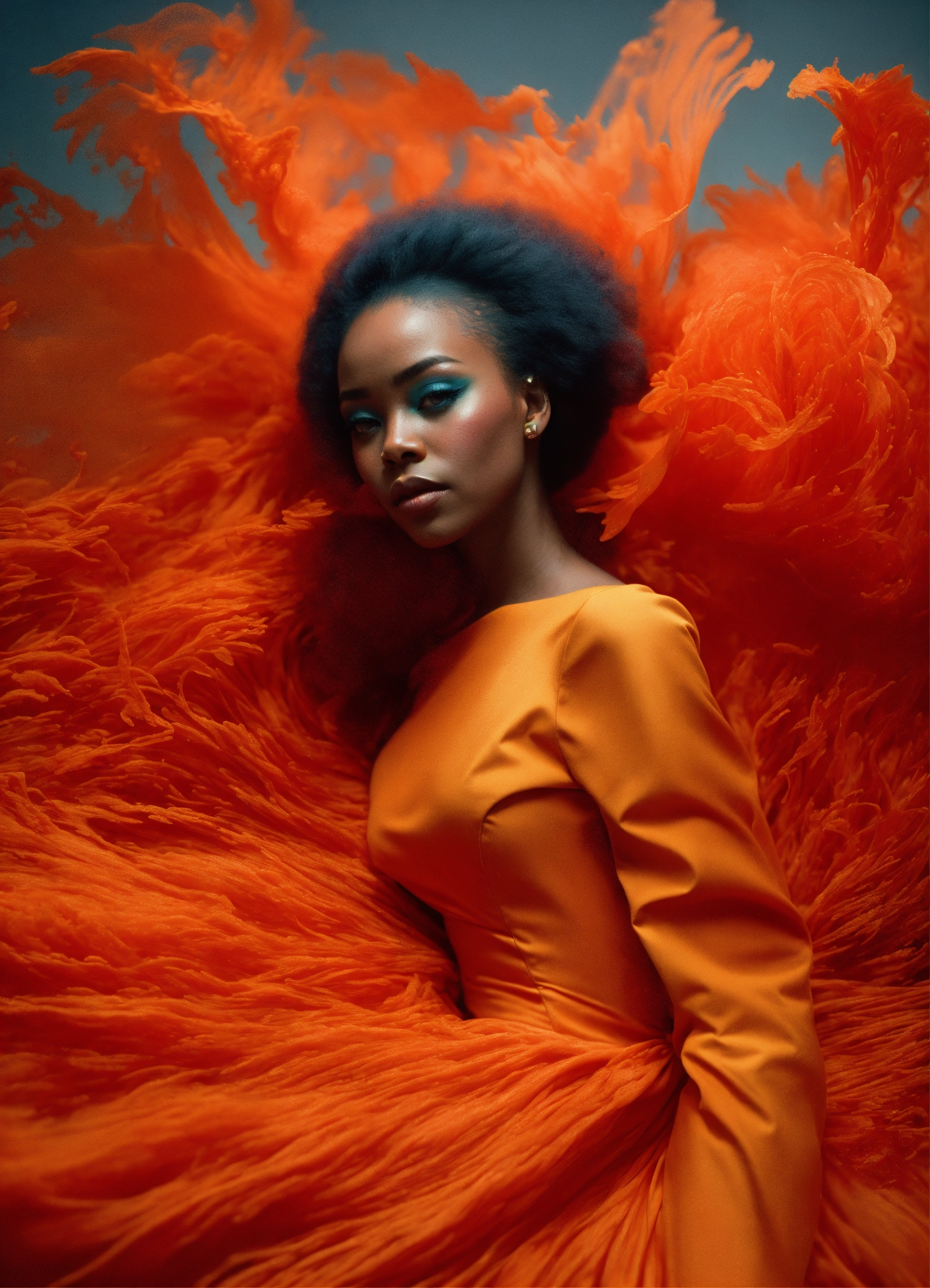 Abstract 1998, fashion photography, 24mm, long shot, 60's black woman in orange ball gown with red hair, 160 degree view, art by victor moscoso and bridget riley kodak ektar 100 8k, make it magical by carne griffiths fluid art, conrad roset ilya kuvshinov, mark fielding, zwy studio high lights in eyes, salt. art by sergio lopez, natalie shau.