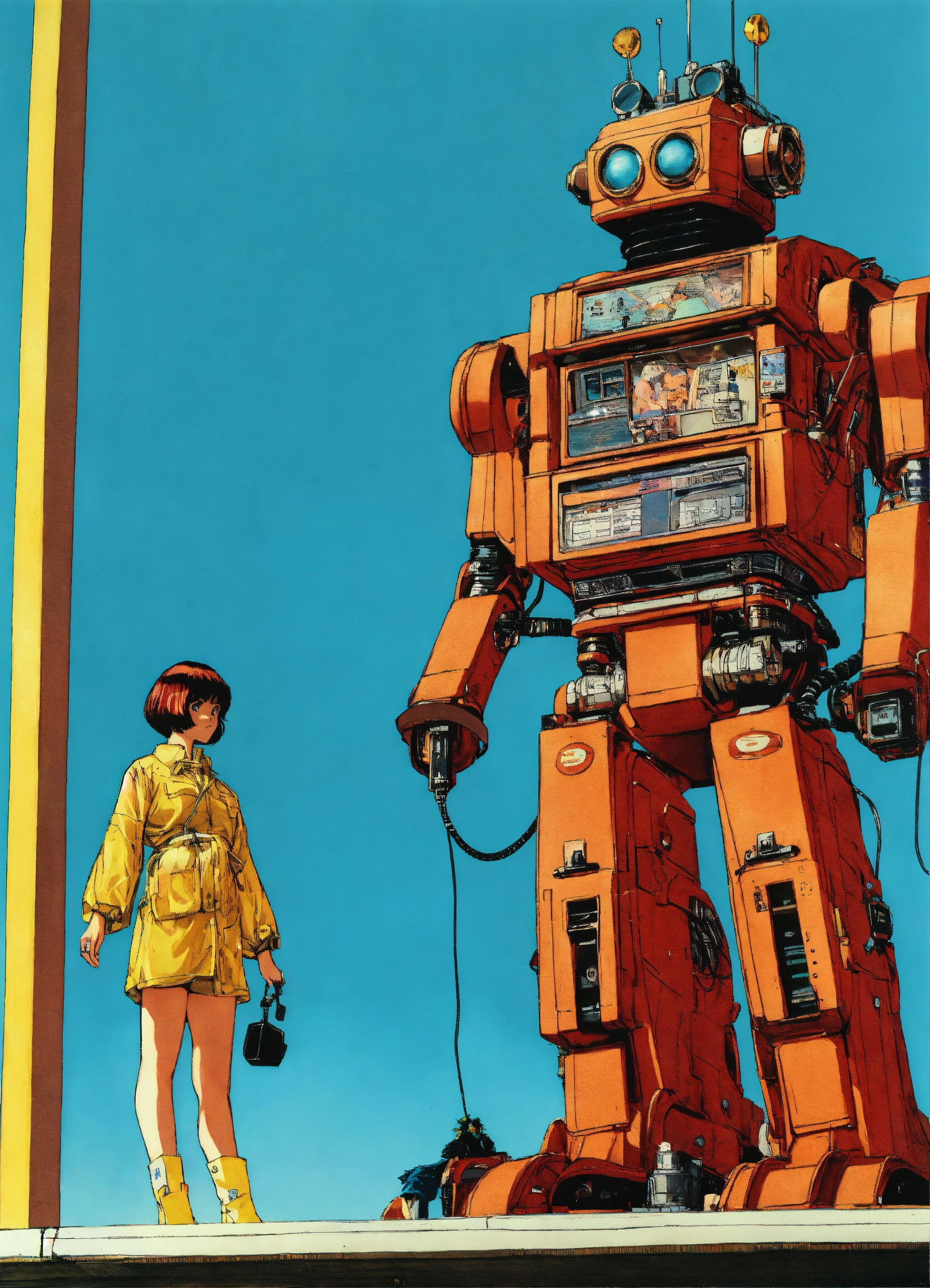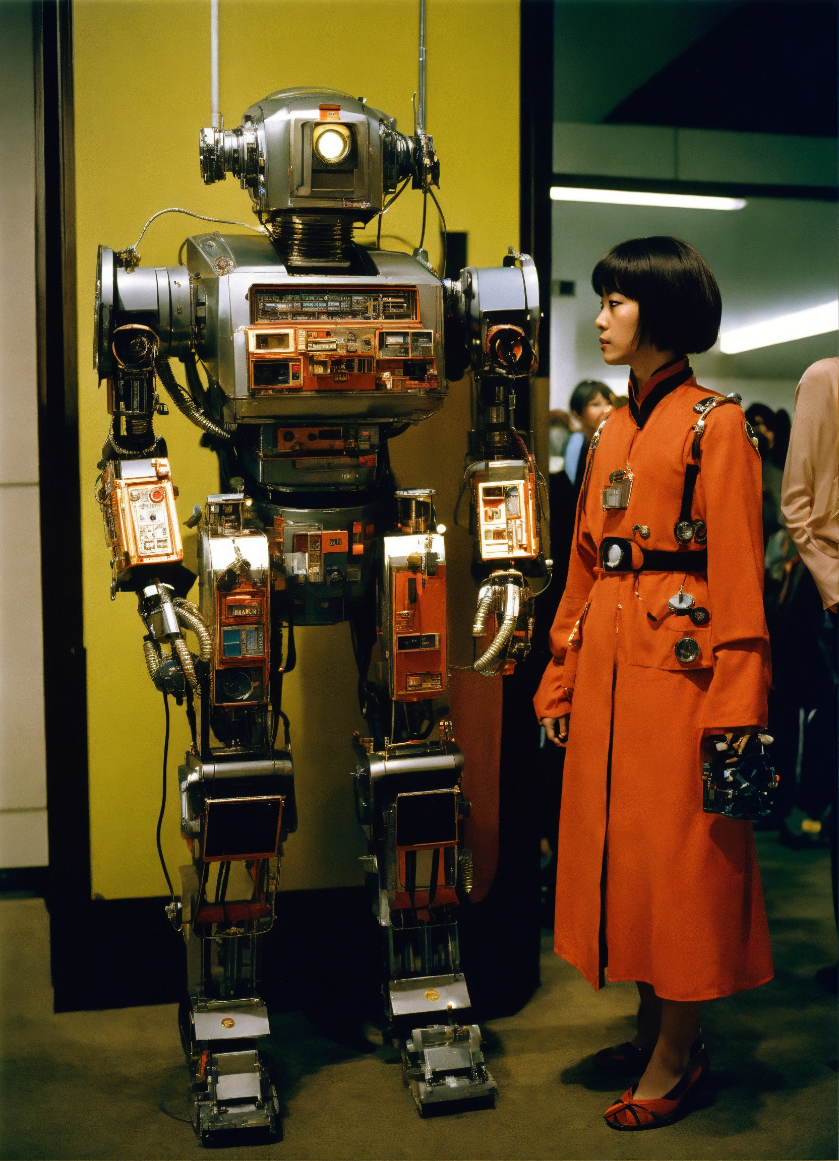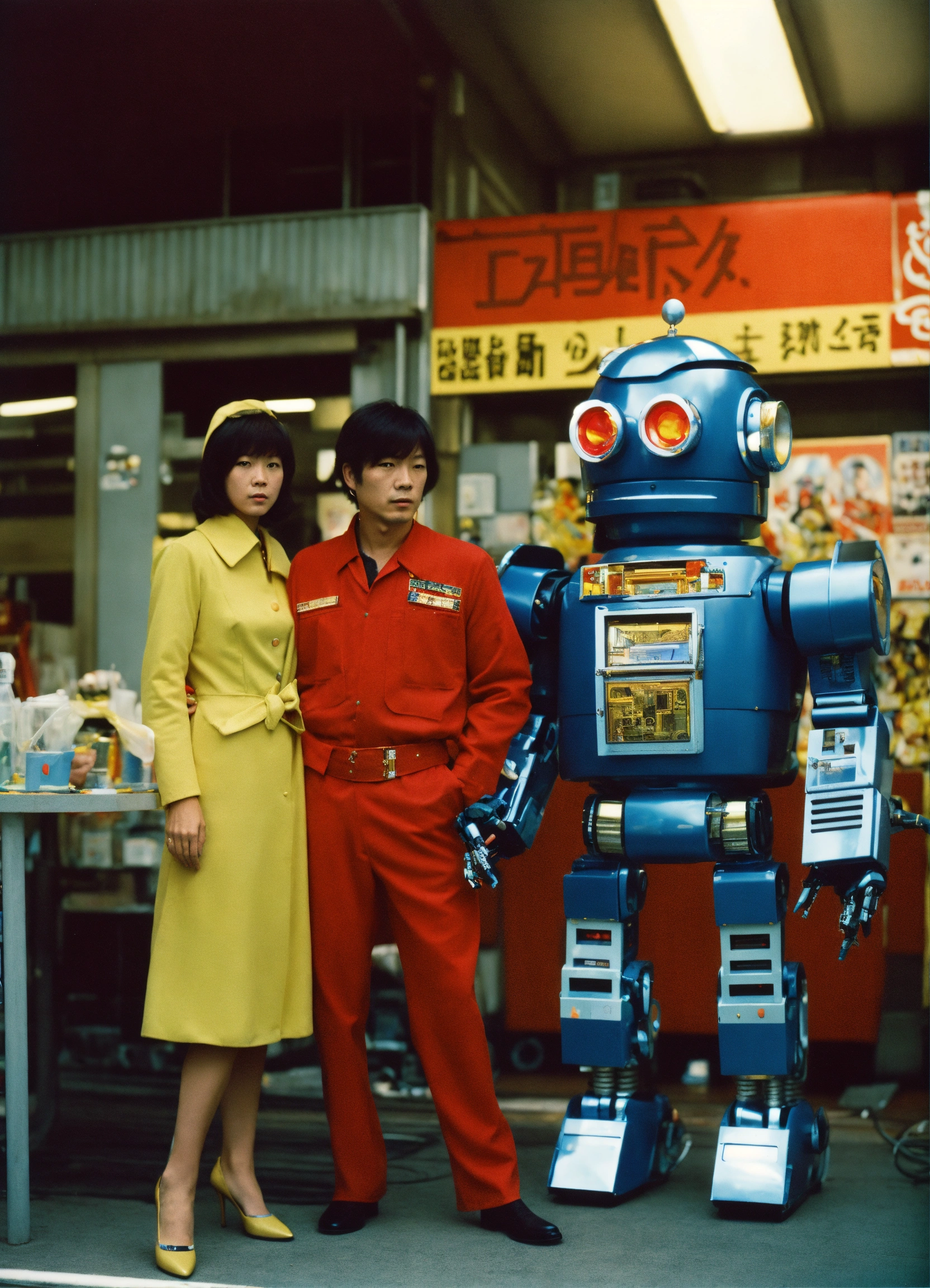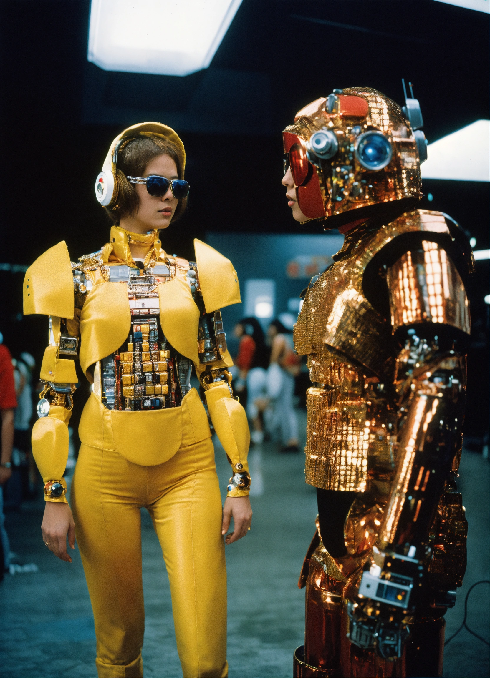 A man dressed in a robot costume next to woman in a costume, in the style of katsuhiro otomo, kodak elite chrome extra color, tetsuo hara, larry elmore, 1970–present, poolcore, ricoh ff-9d --ar 5293