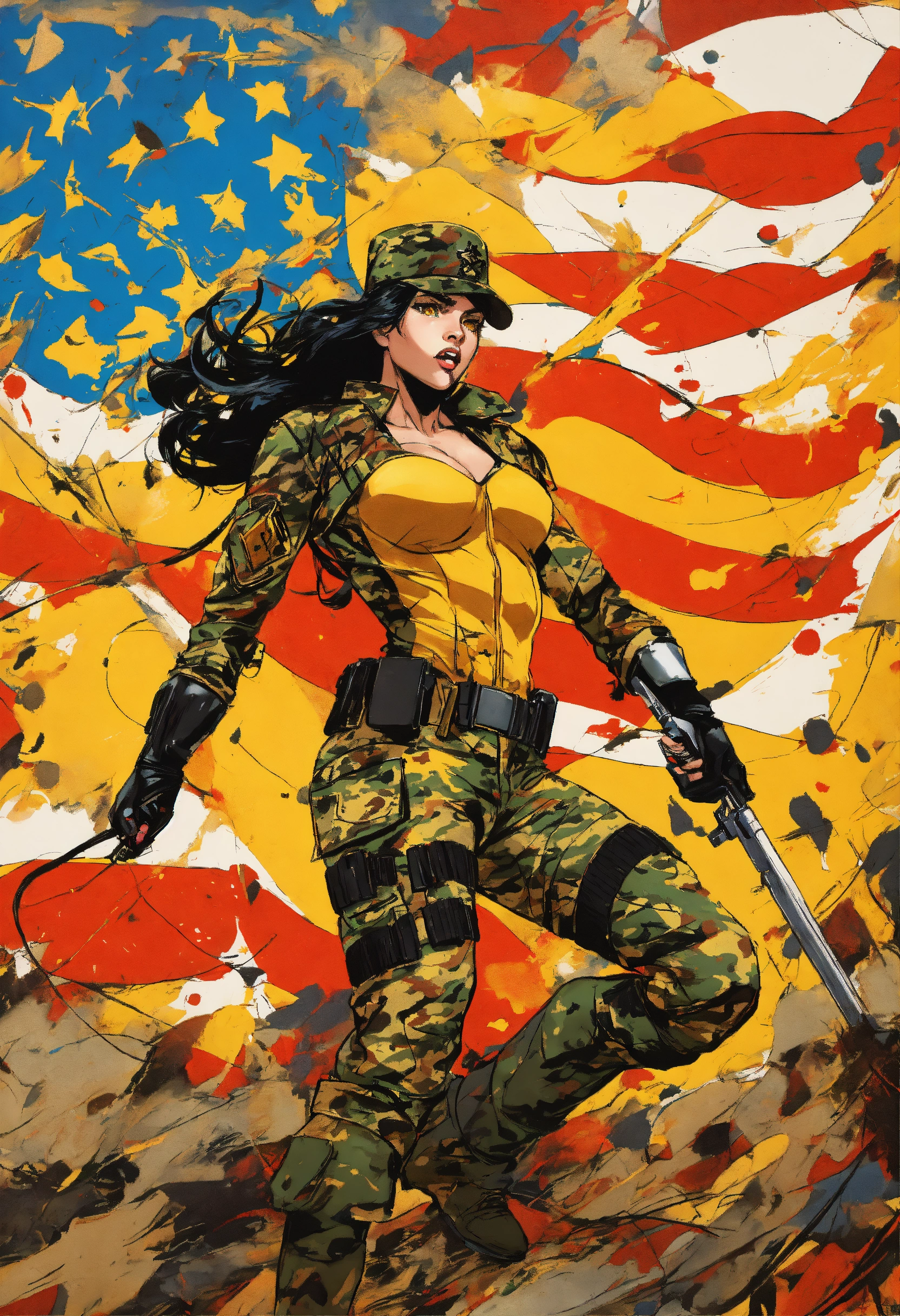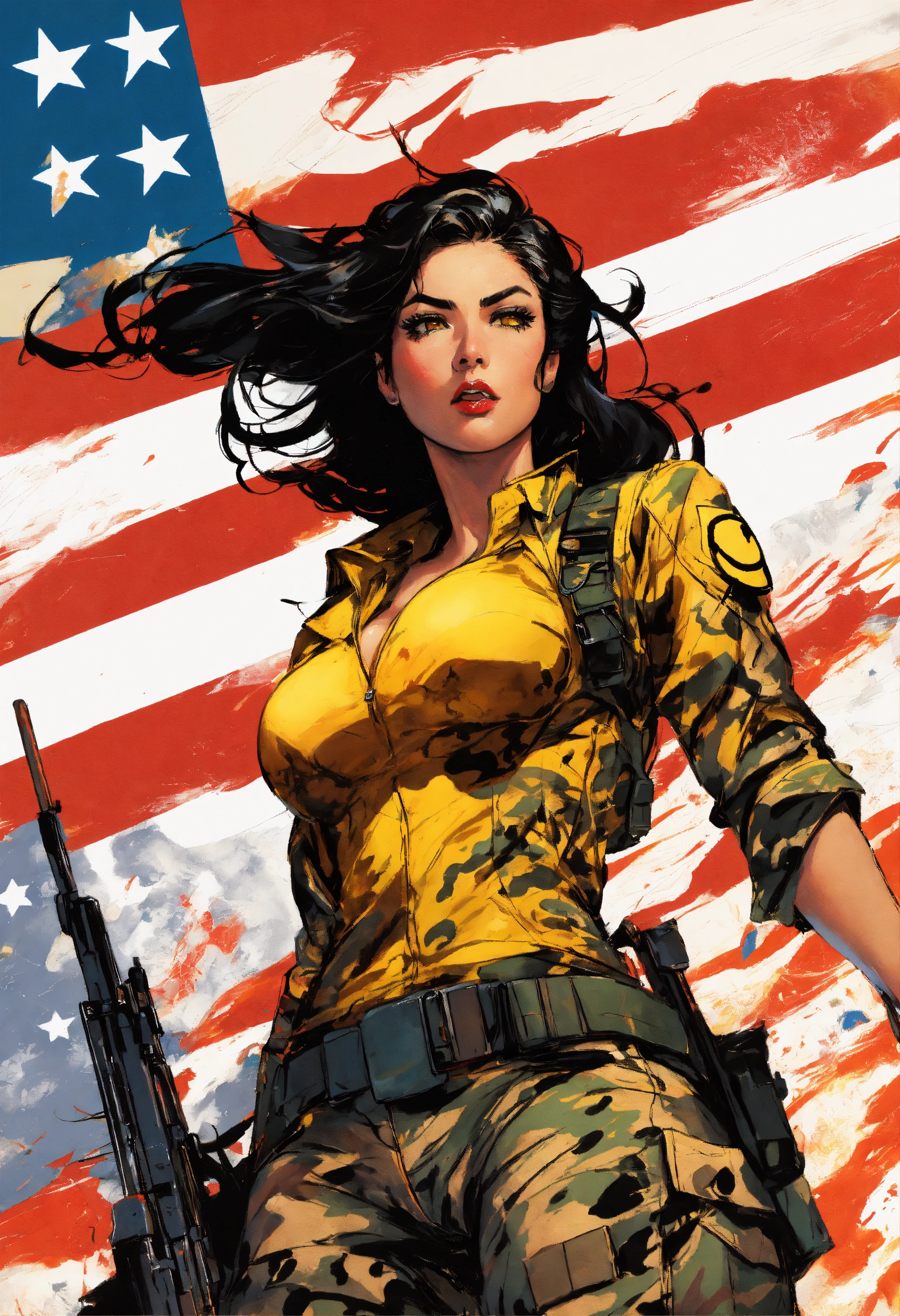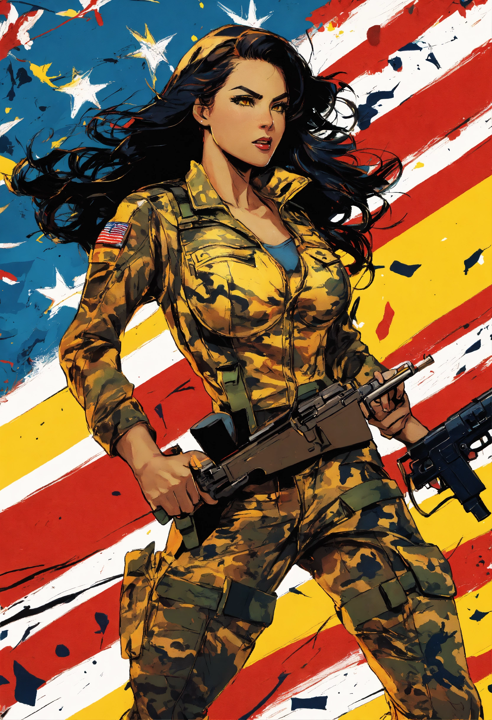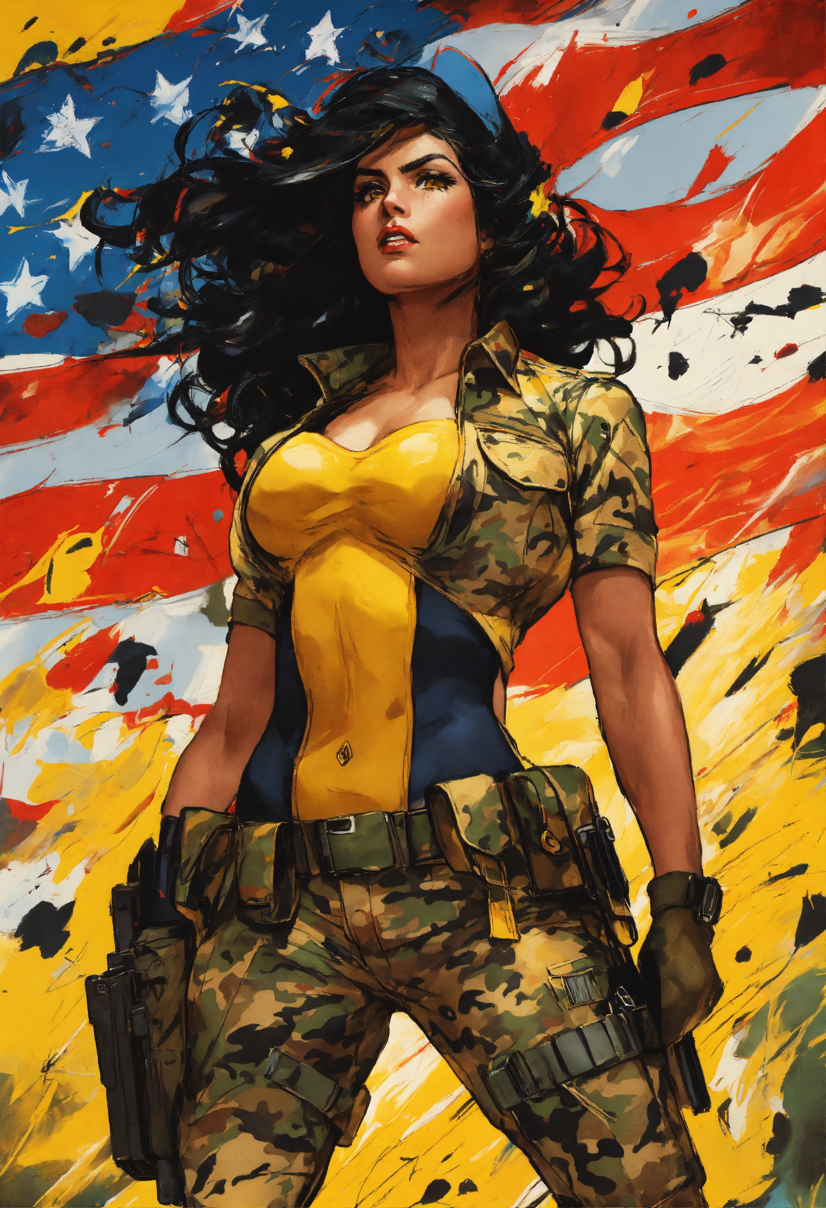 Strong latina superheroine, action pose, golden yellow eyes, sharp focus, bold and abstract art by jackson pollock, wearing a camouflage military uniform, powerful, and fierce, surrealism, american flag surrounds her comic book art style.