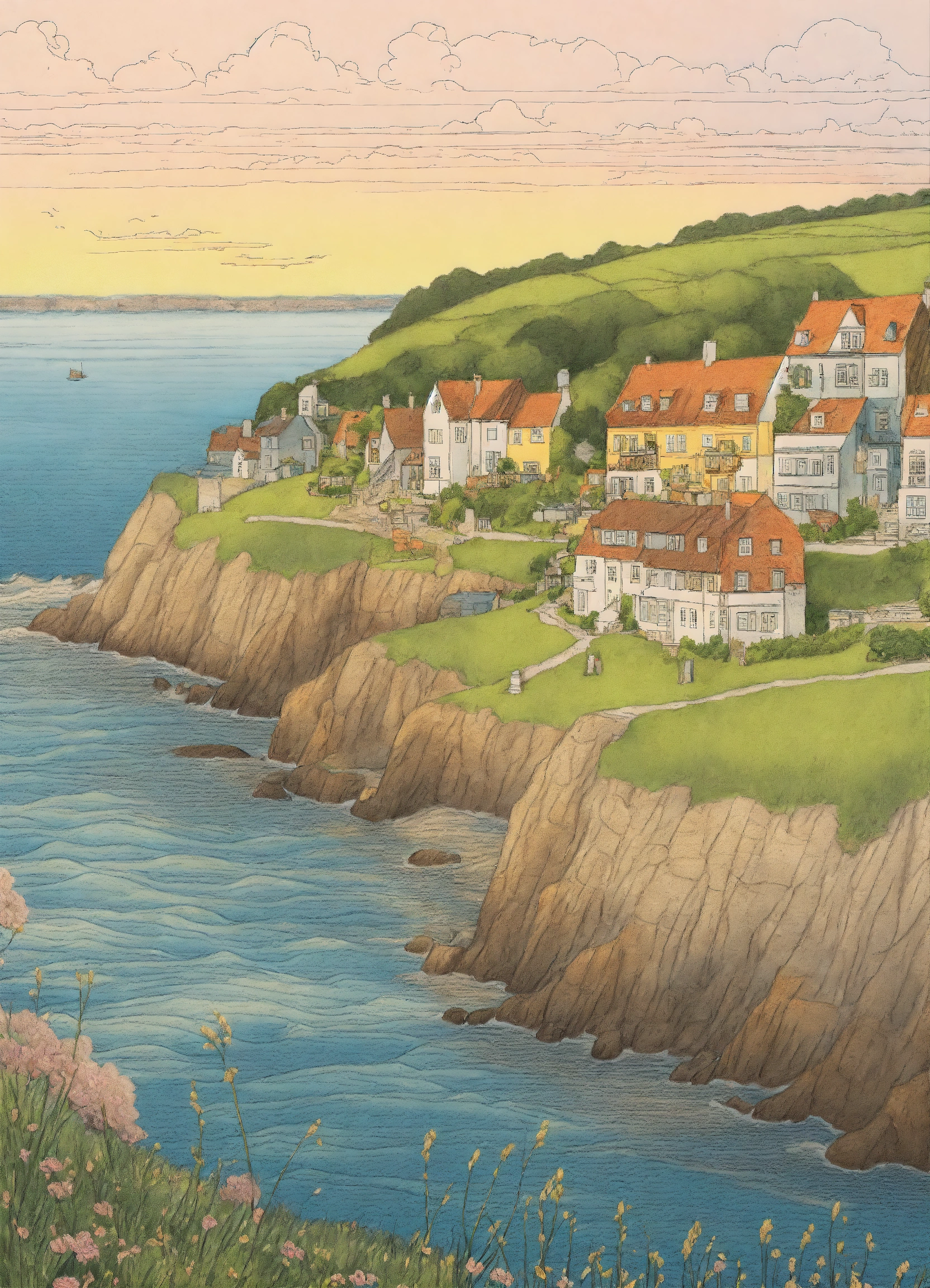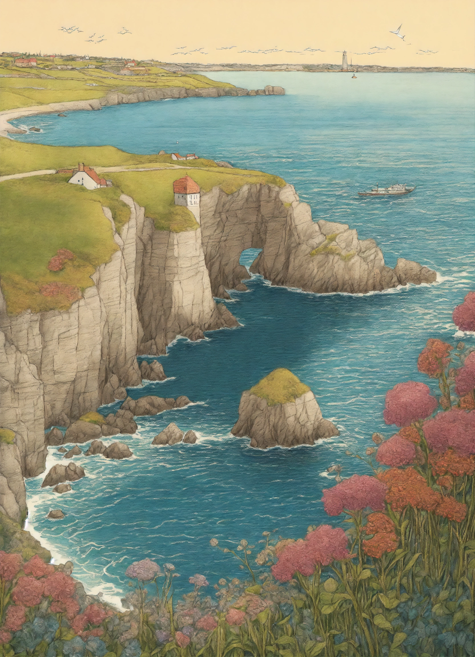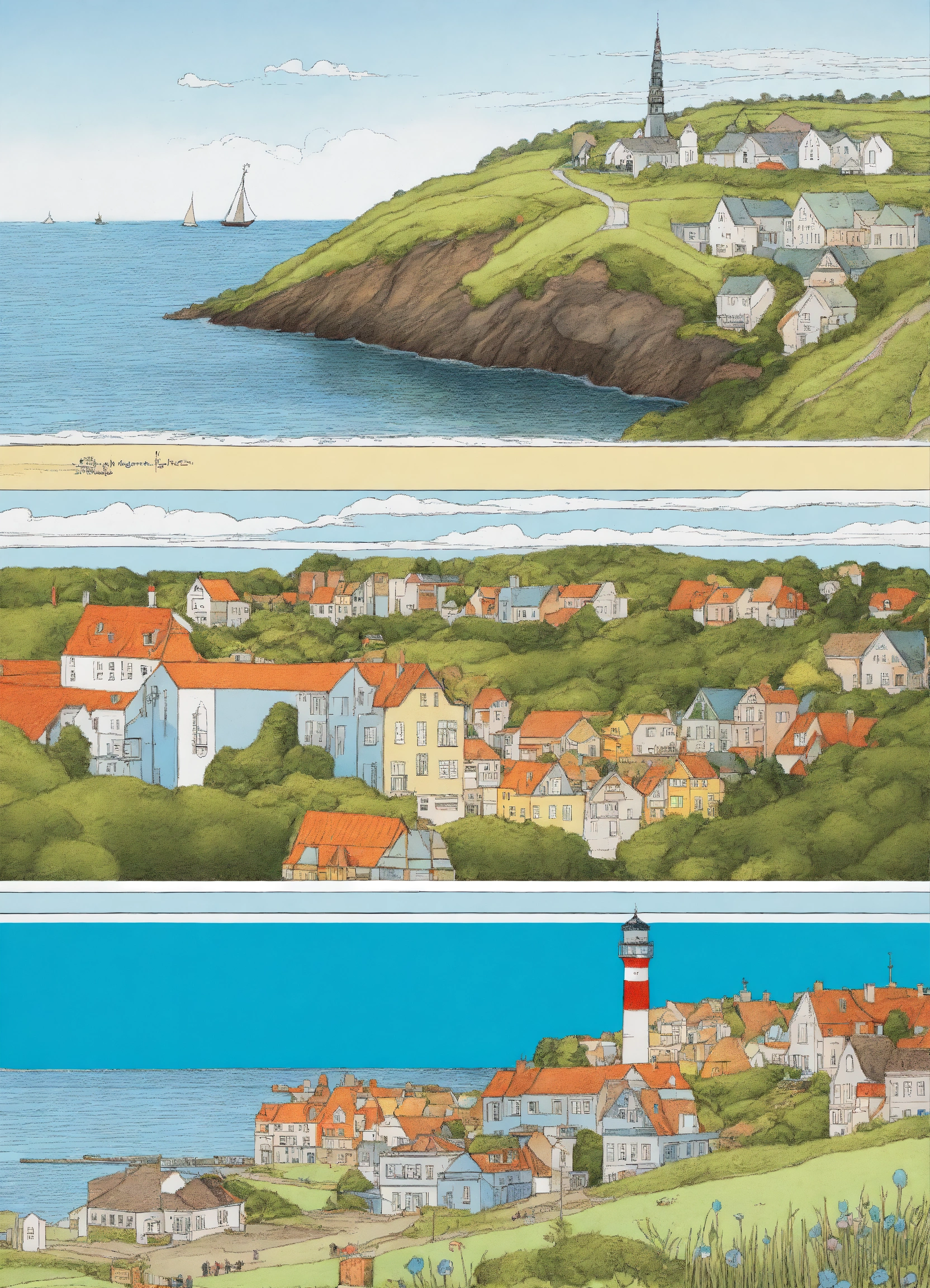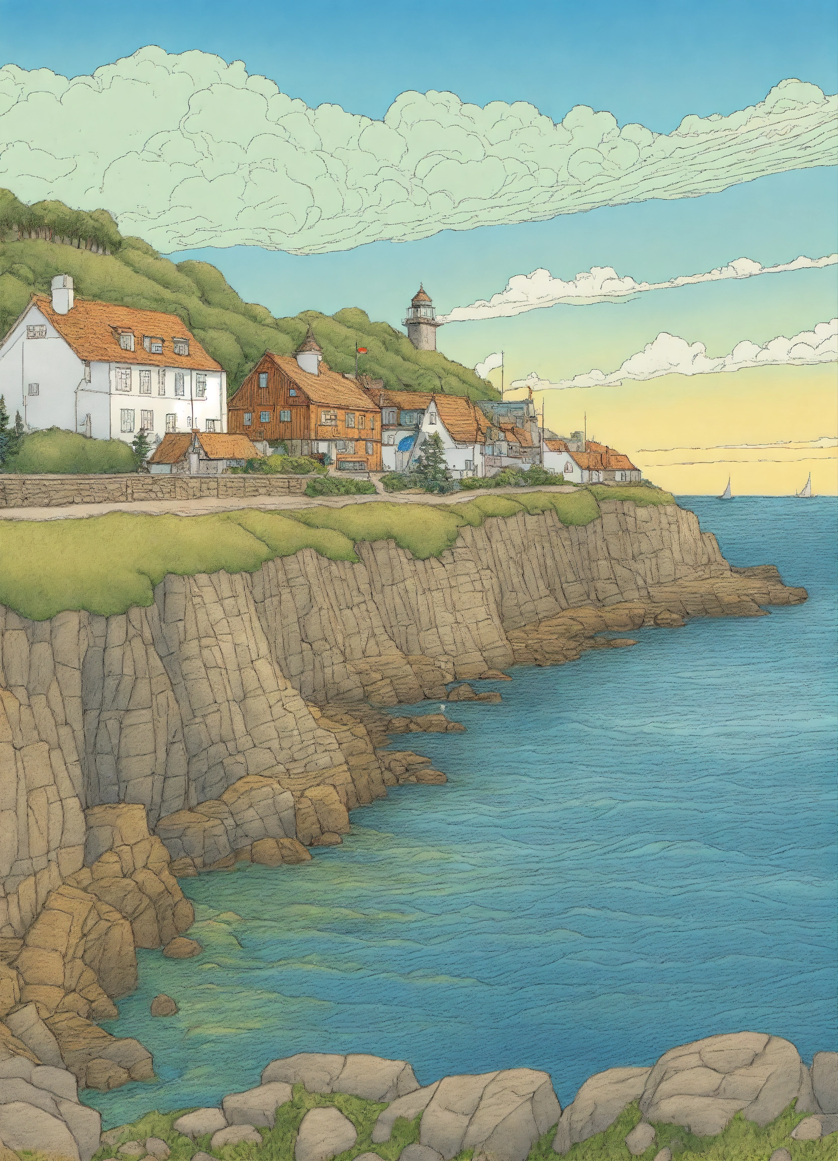 Drawing the danish coasts. crystal clear, line drawing, clean clear lines, coloring book style, bright colors, intricate details, elegant, discreete, serene, peaceful, magical, fine details, pastel pencils, winsor mccay style