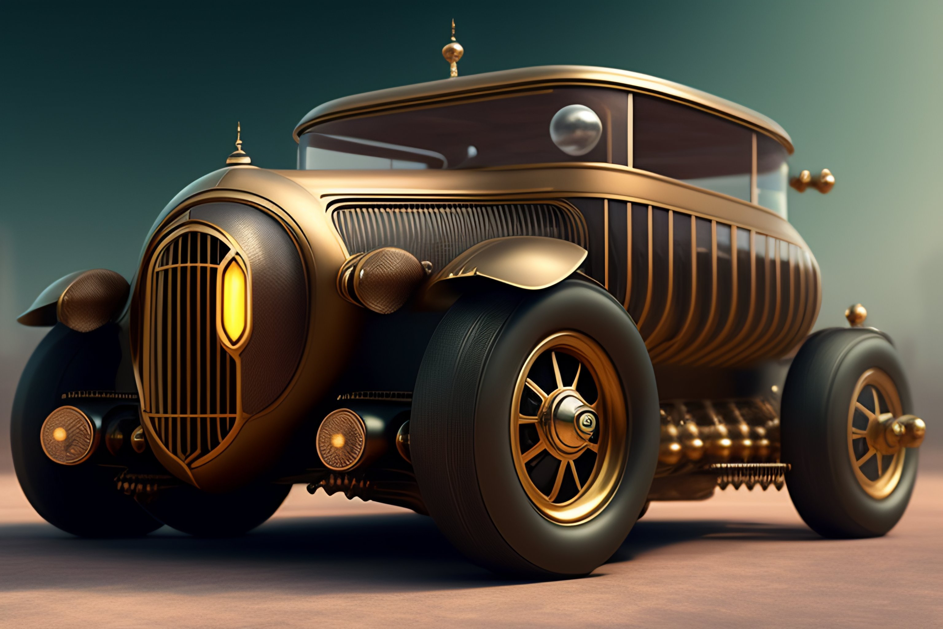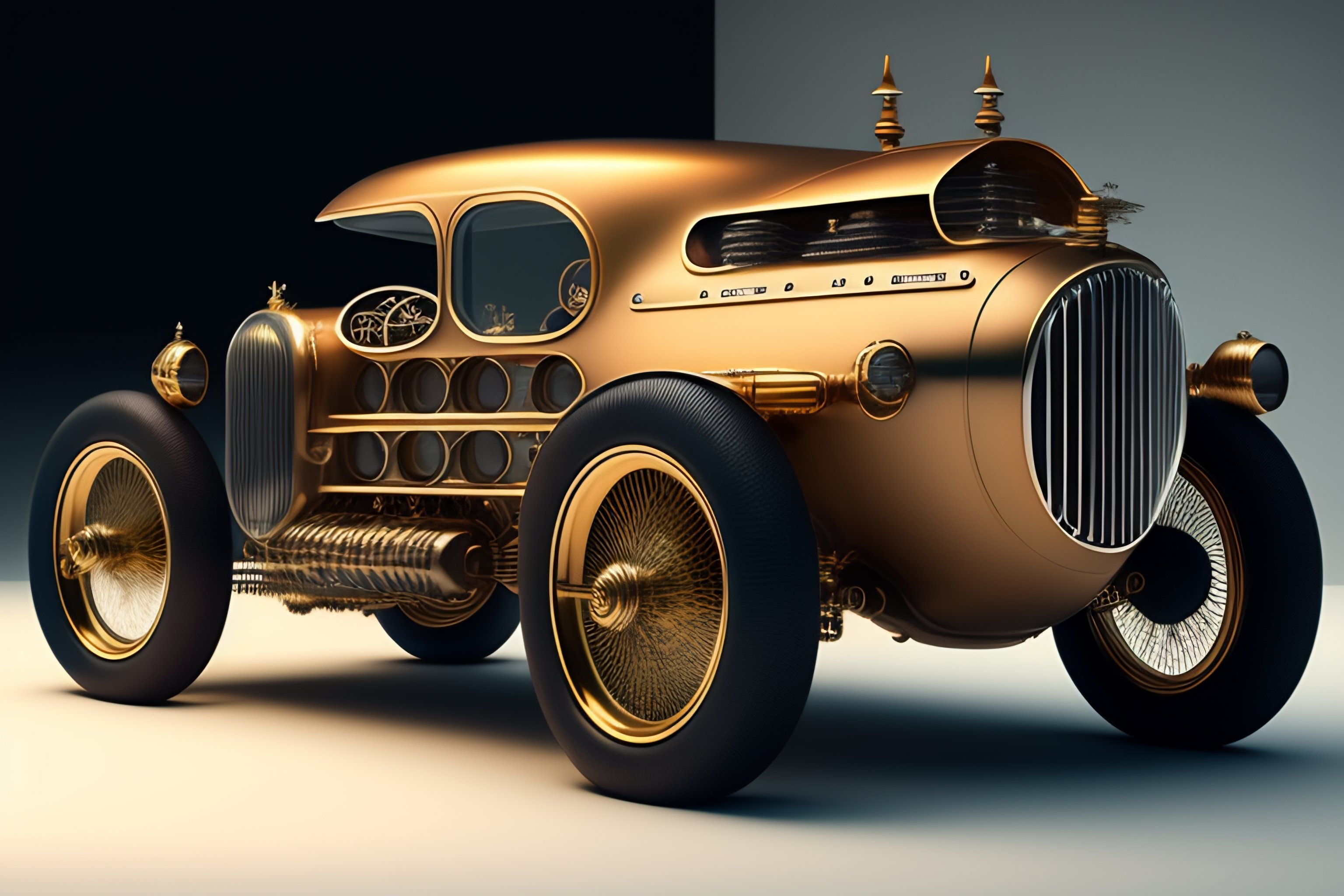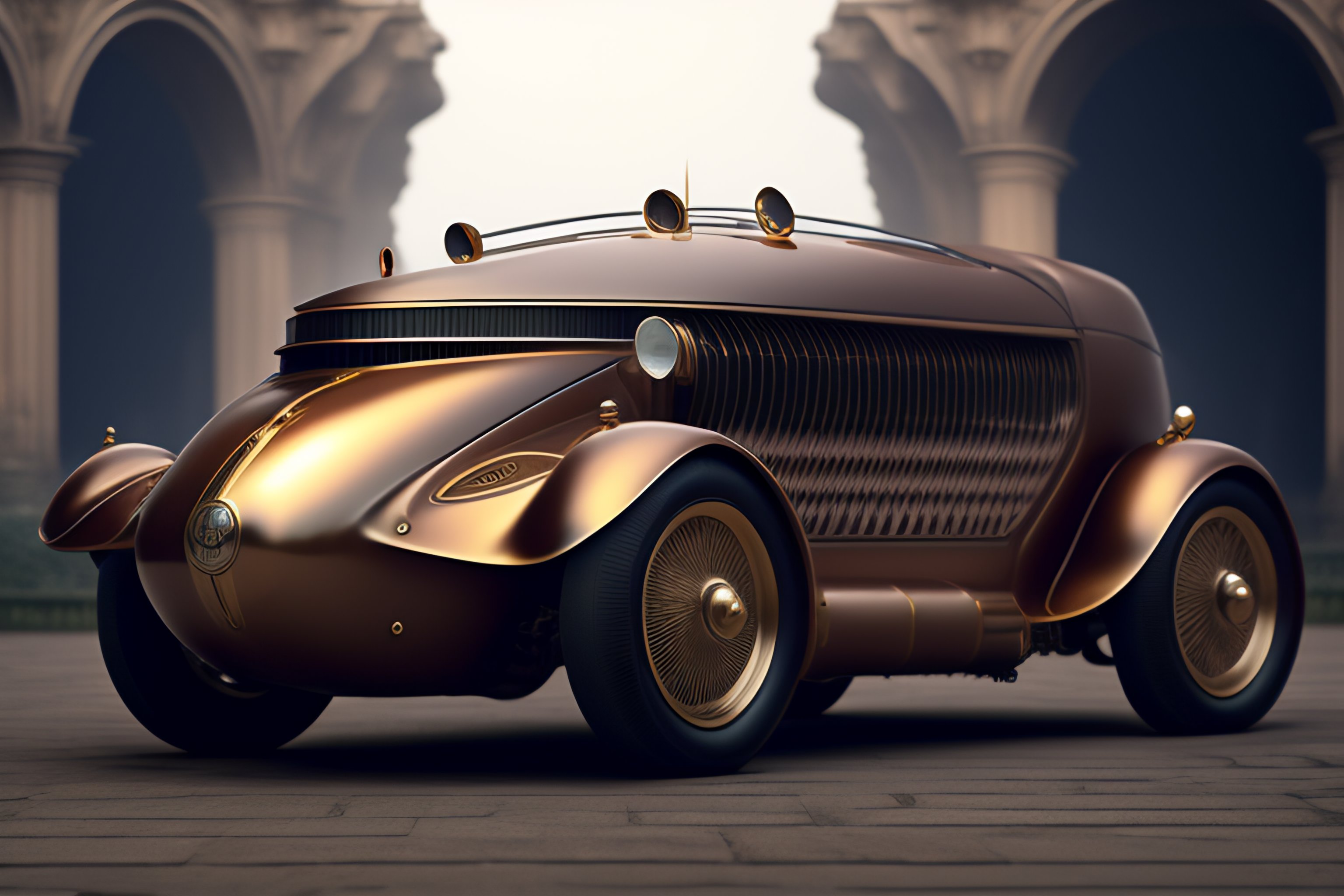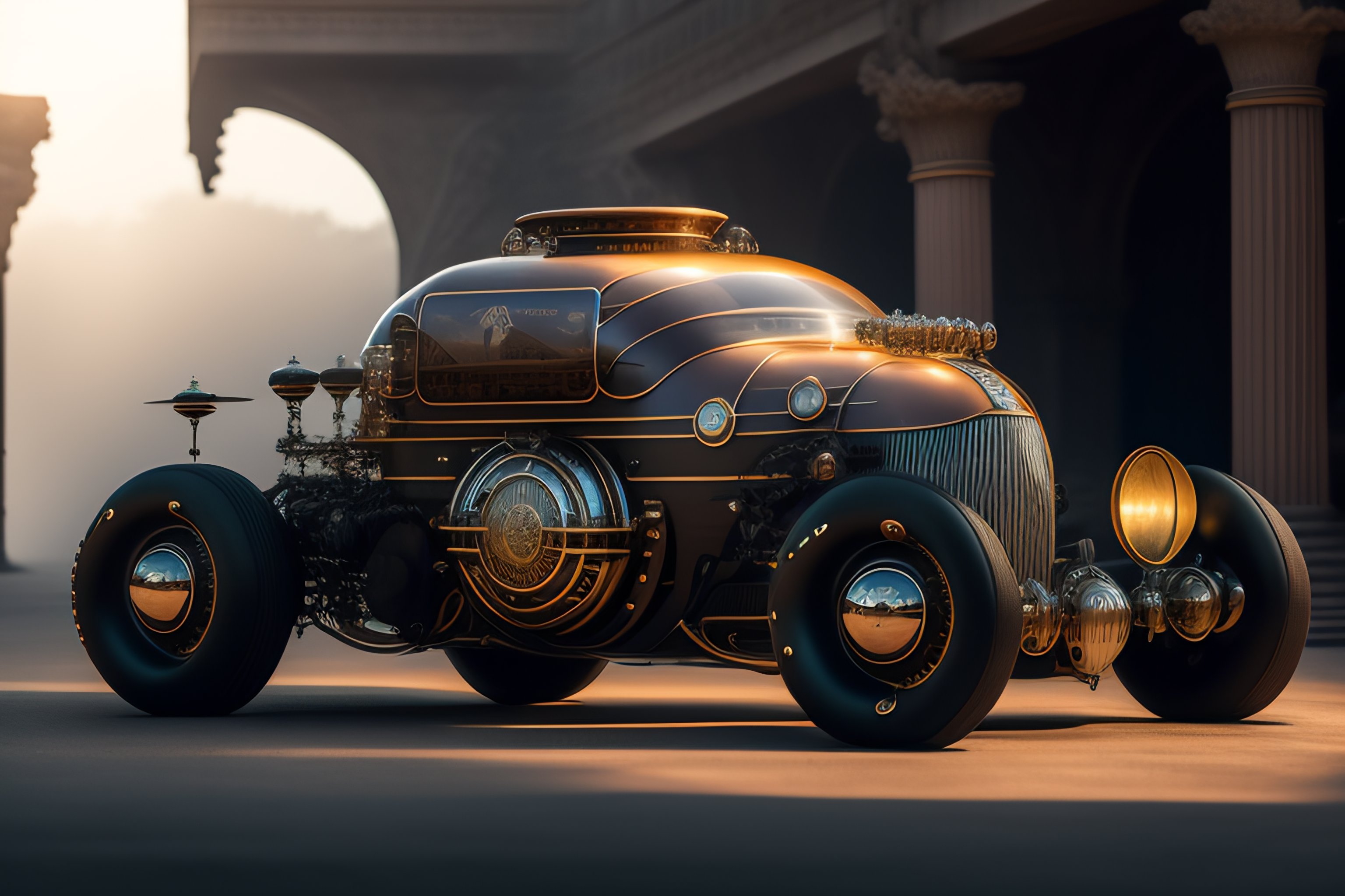 Wide shot of a minimal biomechanical steampunk vehicle reminiscent of 20s car 1920, with robotic parts and glowing headlights parked in ancient lush palace, gothic and baroque, brutalist architecture, ultradetailed, creepy ambiance, fog, artgerm, giger, by ellen jewett and josan gonzalez and giuseppe arcimboldo