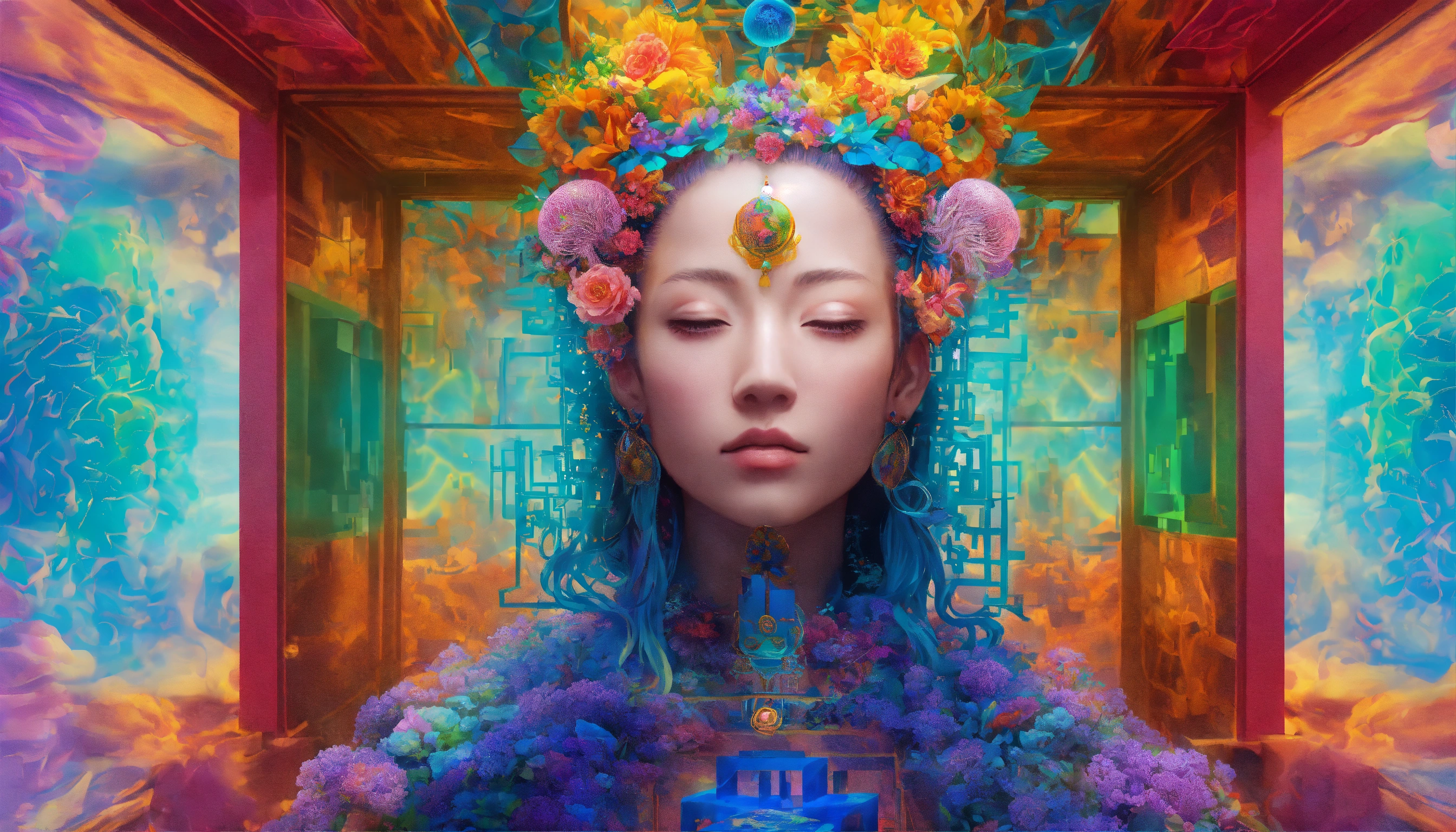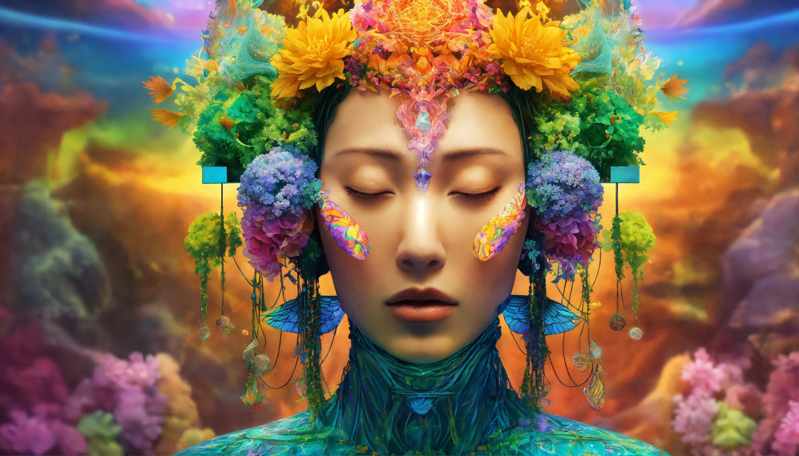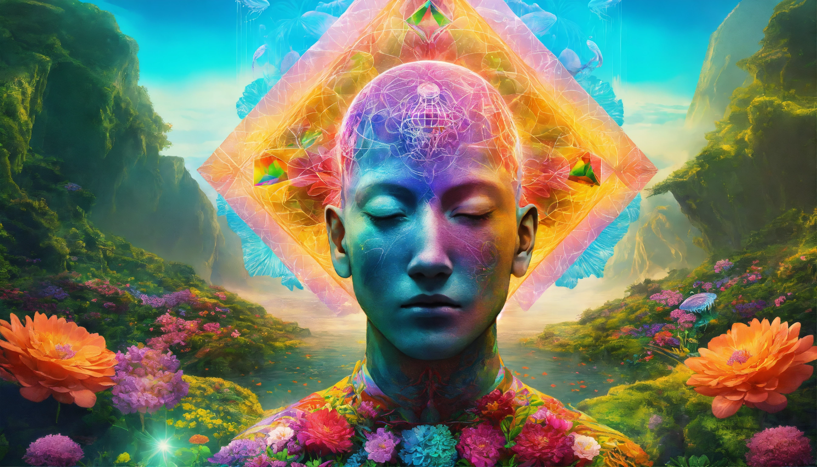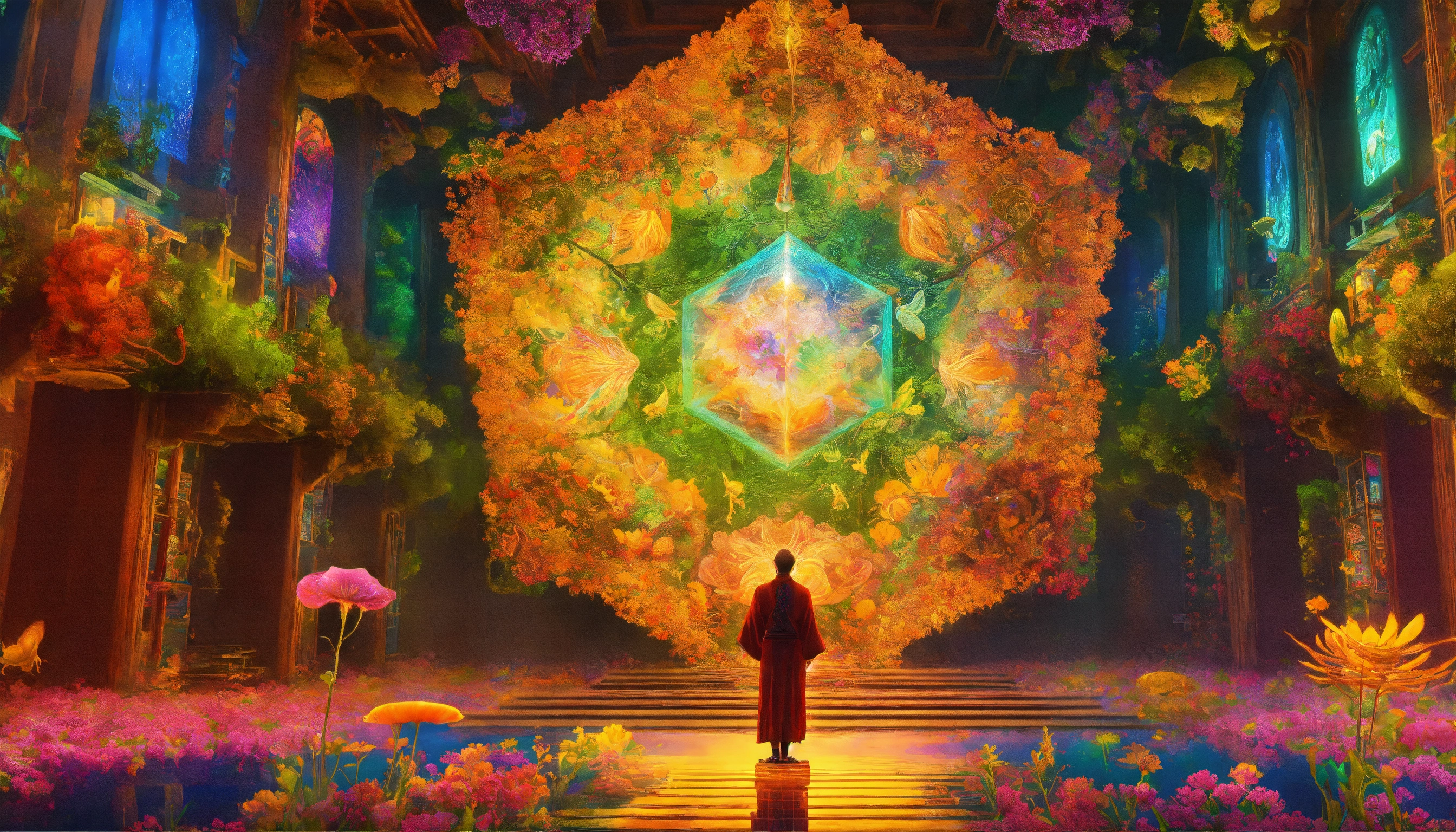 Taoist monk tesseract body fractal three point perspective hypercube mirror zen face brain mayan mantis jellyfish face underwater, rainbow colors, angel wings, flowers everywhere