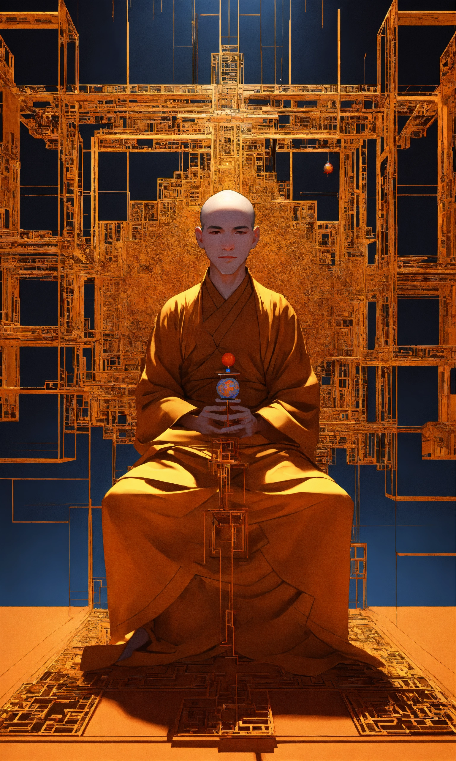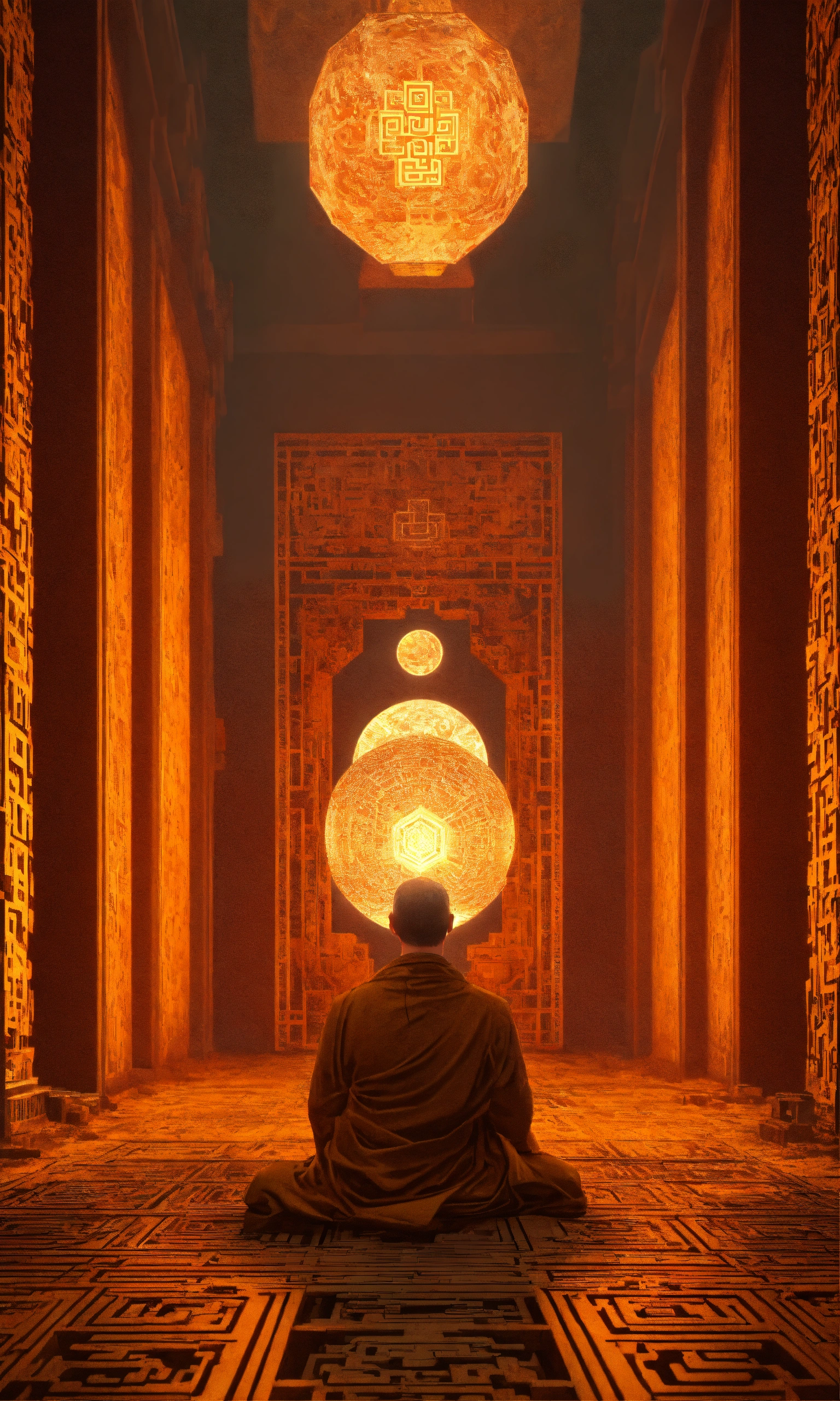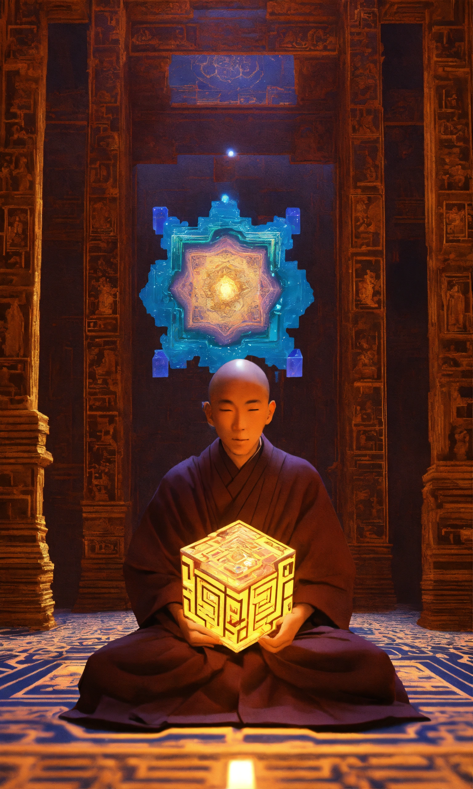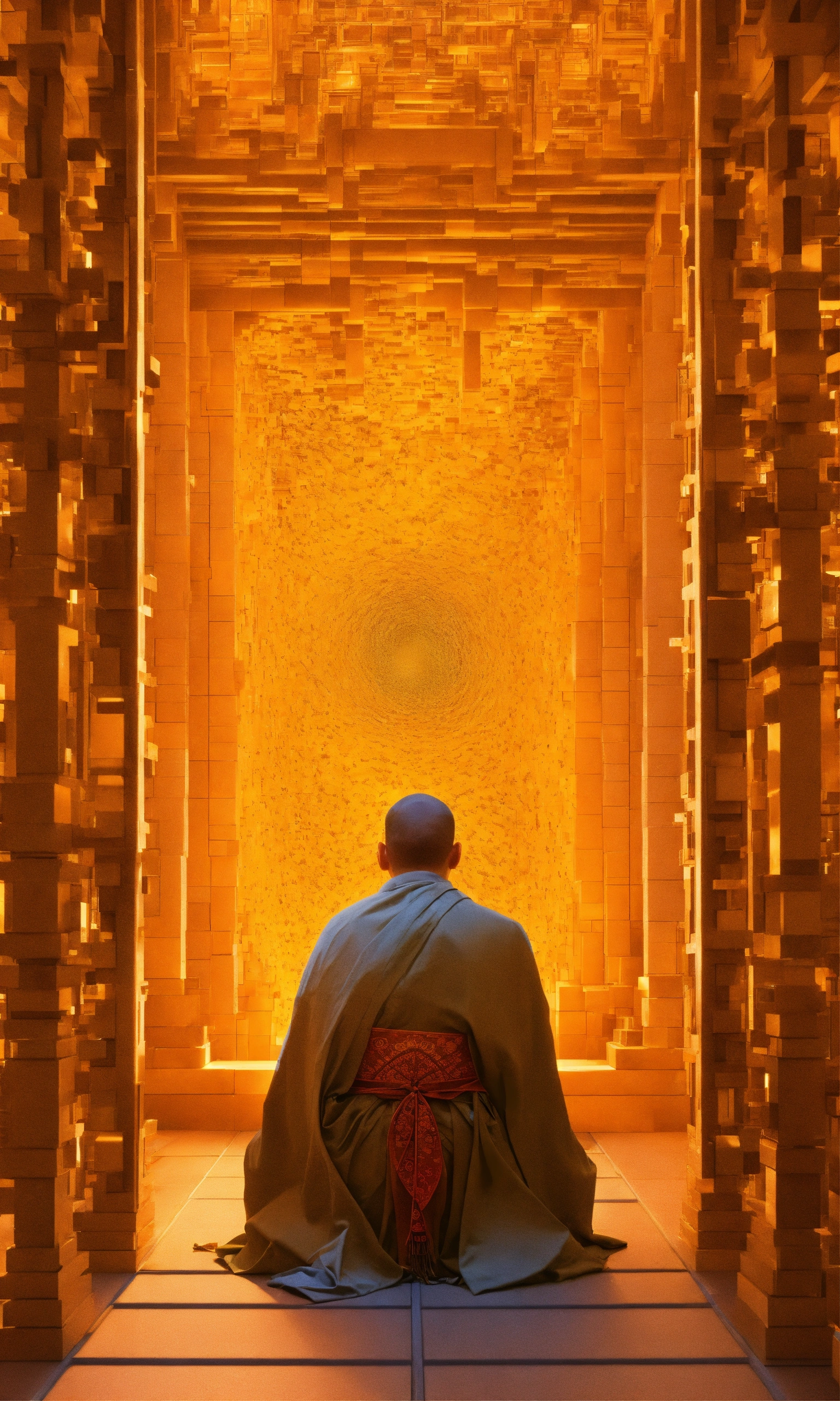 Sitting taoist monk tesseract body fractal three point perspective hypercube melting mandelbrot artefacts