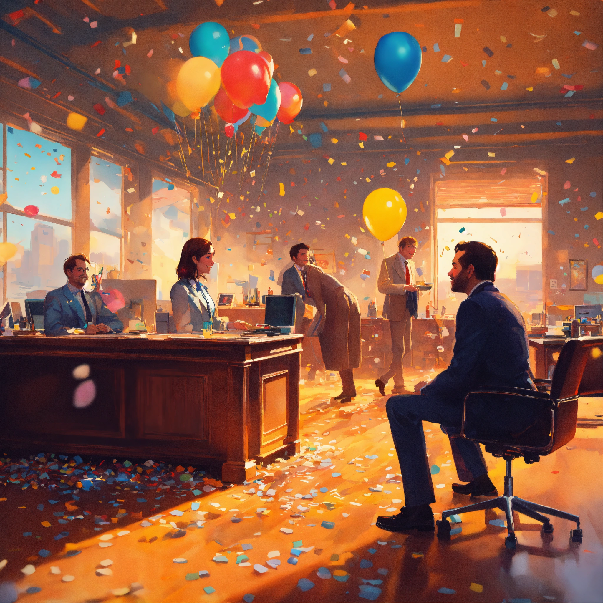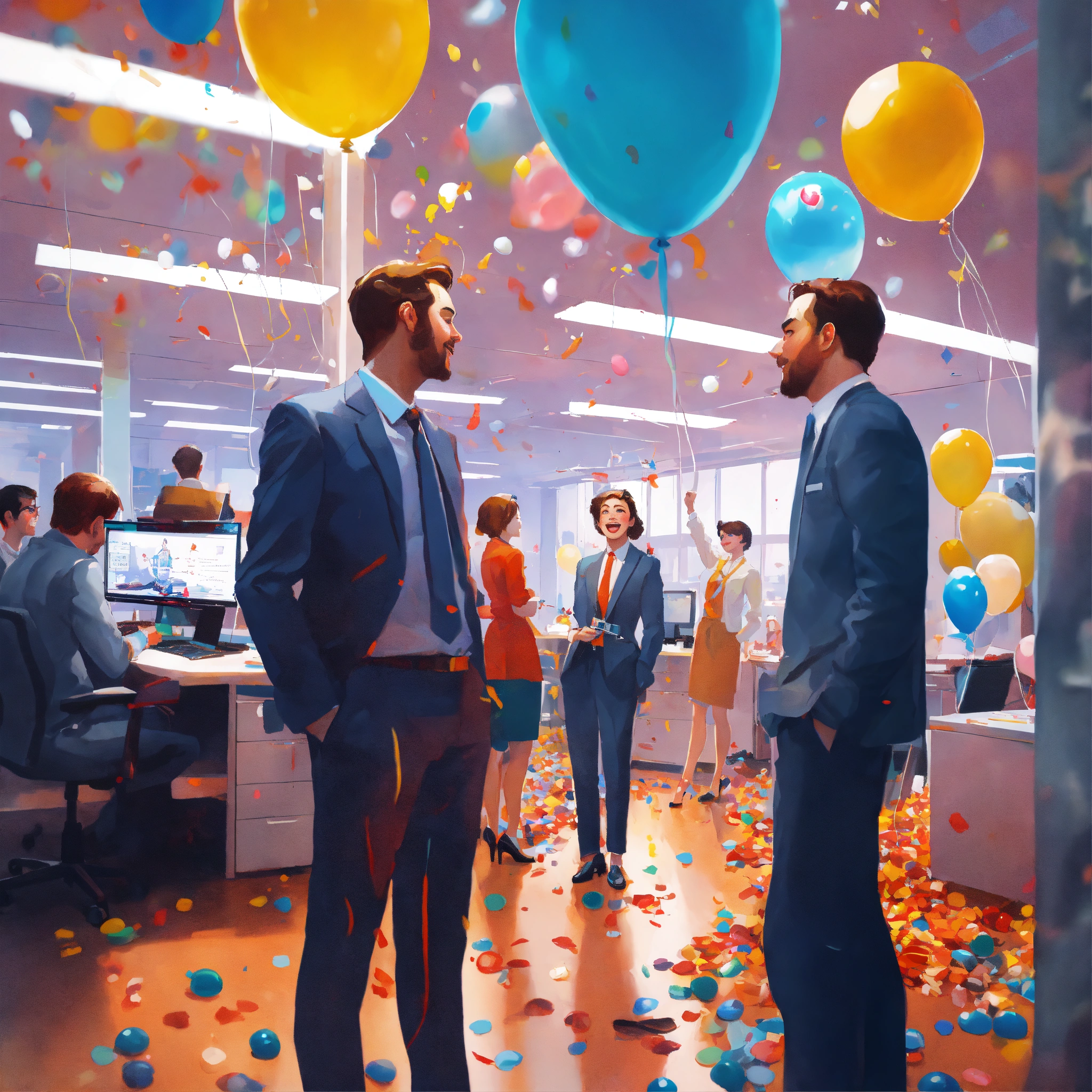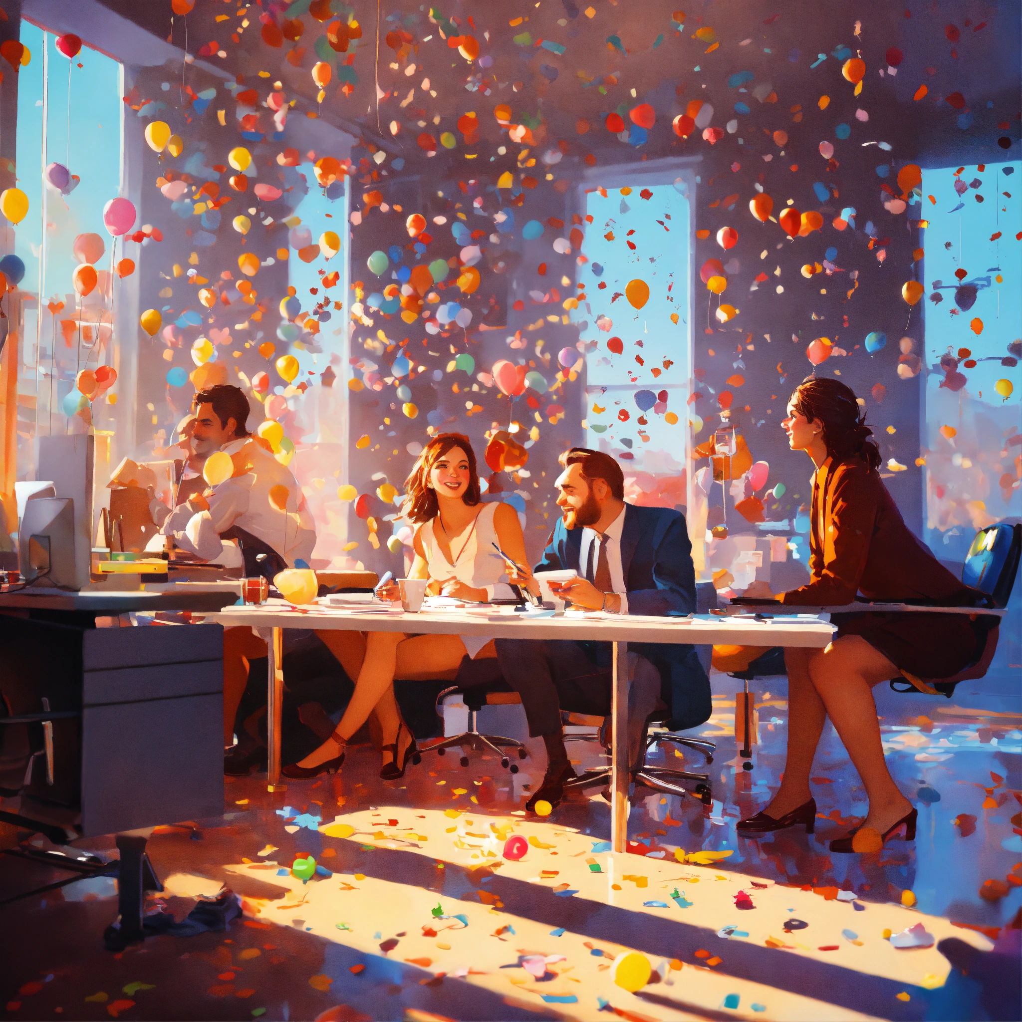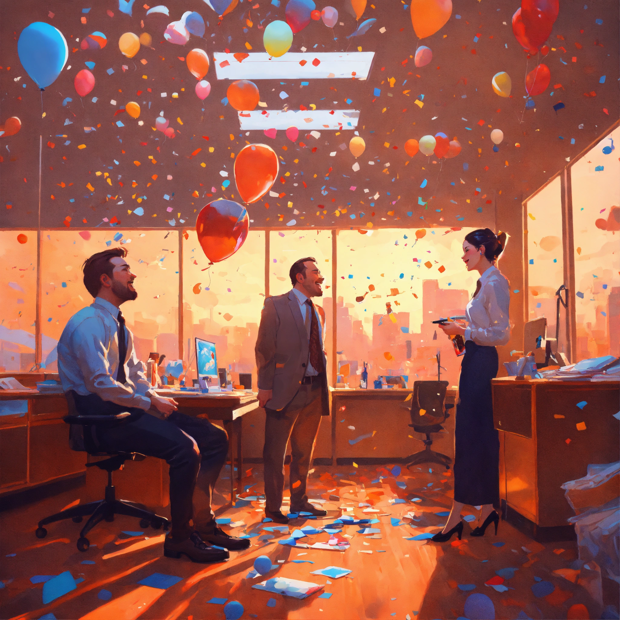 Tilt-shifted photo of three people in modern office, happy, team is smiling and celebrating, confetti, balloons around, 8k, very coherent, surrealism, airbrush, realistic detailed image of mark brooks, in the style of francis bacon, in the style of francis bacon and syd mead and edward hopper and norman rockwell and beksinski, open ceiling, highly detailed, painted by francis bacon, painted by james gilleard, surrealism, airbrush, ilya kuvshinov, wlop, stanley artgerm, very coherent