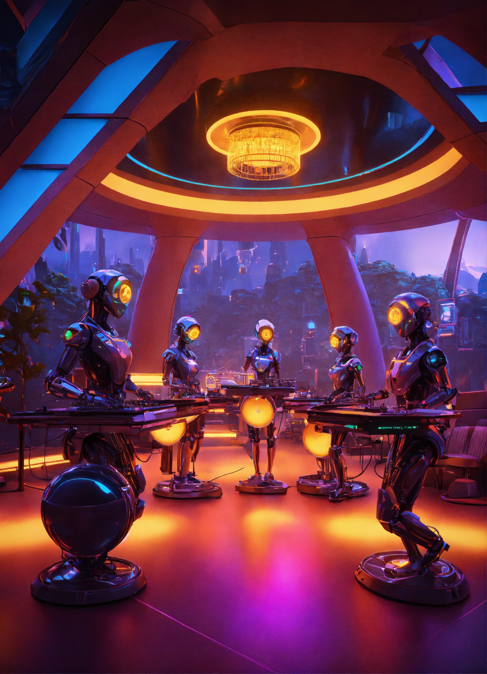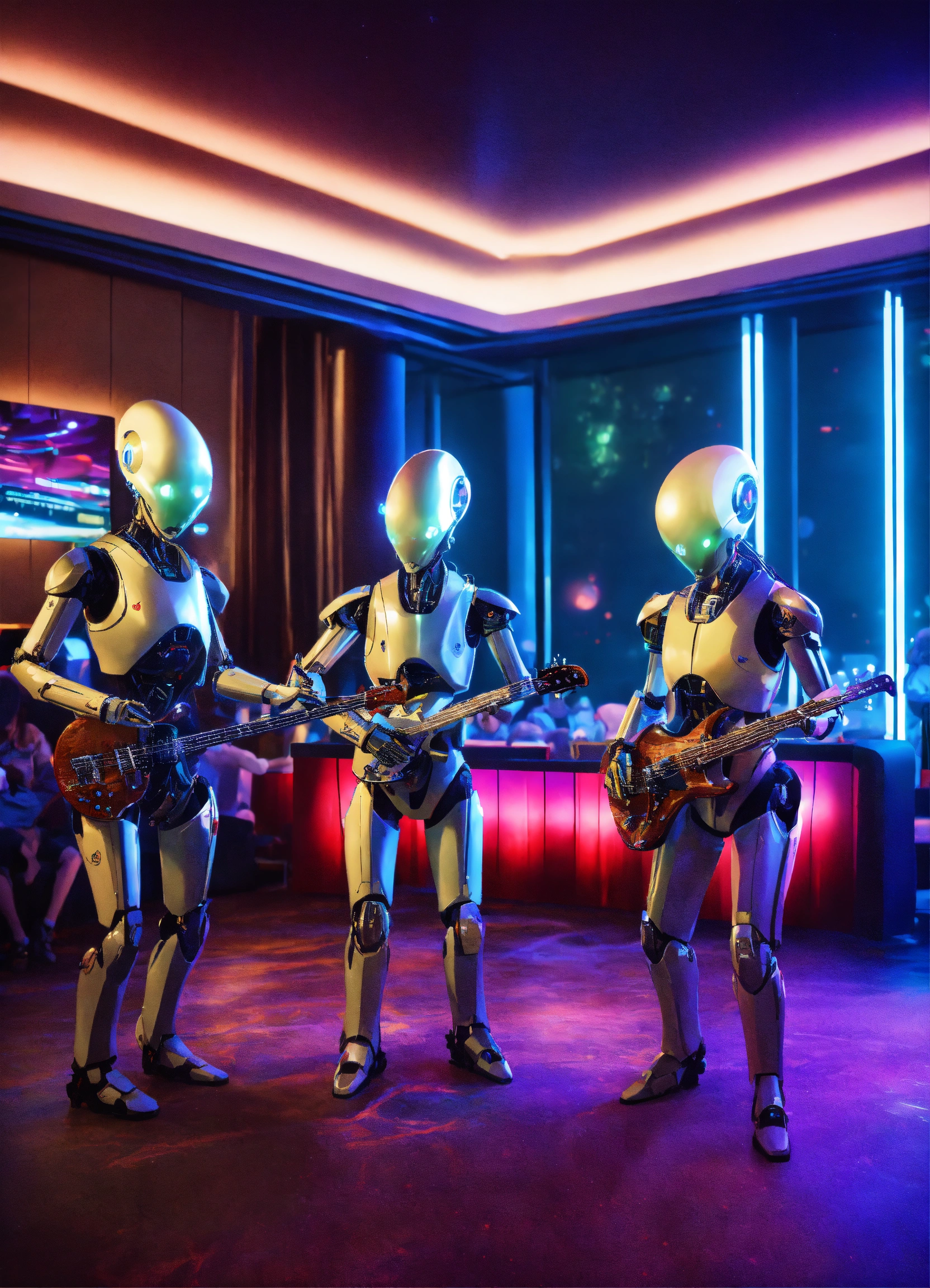Band of 4 robot musicians with alien electric instruments playing hypnotic music on stage to a crowd of zombie like people in a luxury space port lounge reception area, realistic, futuristic, sci-fi, 8k, unreal engine, pixar, disney, zaha hadid