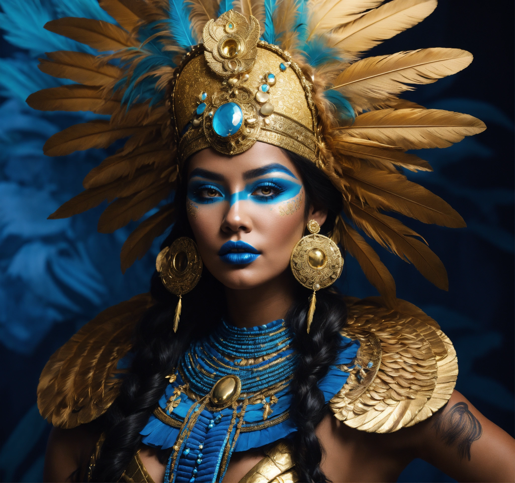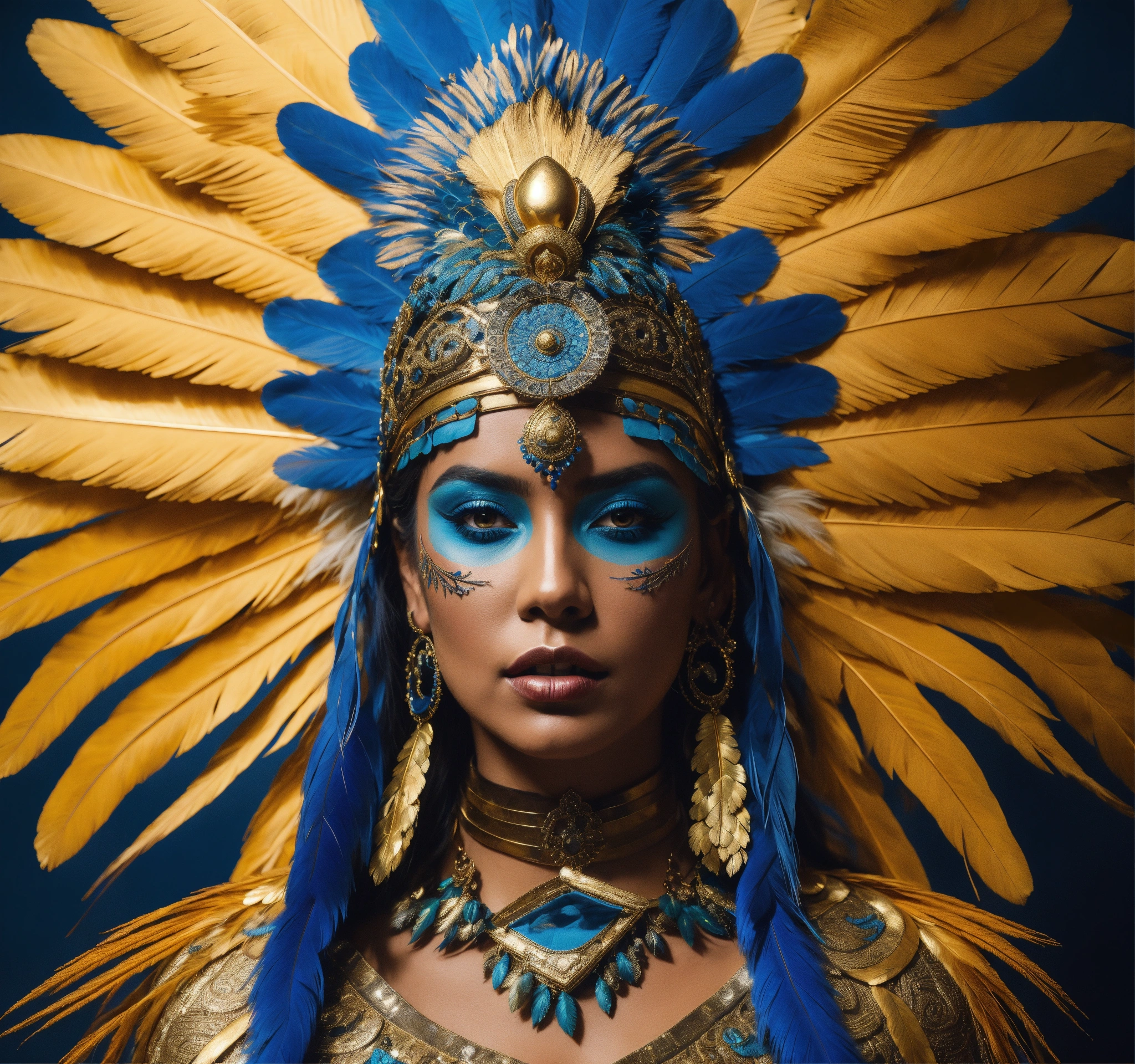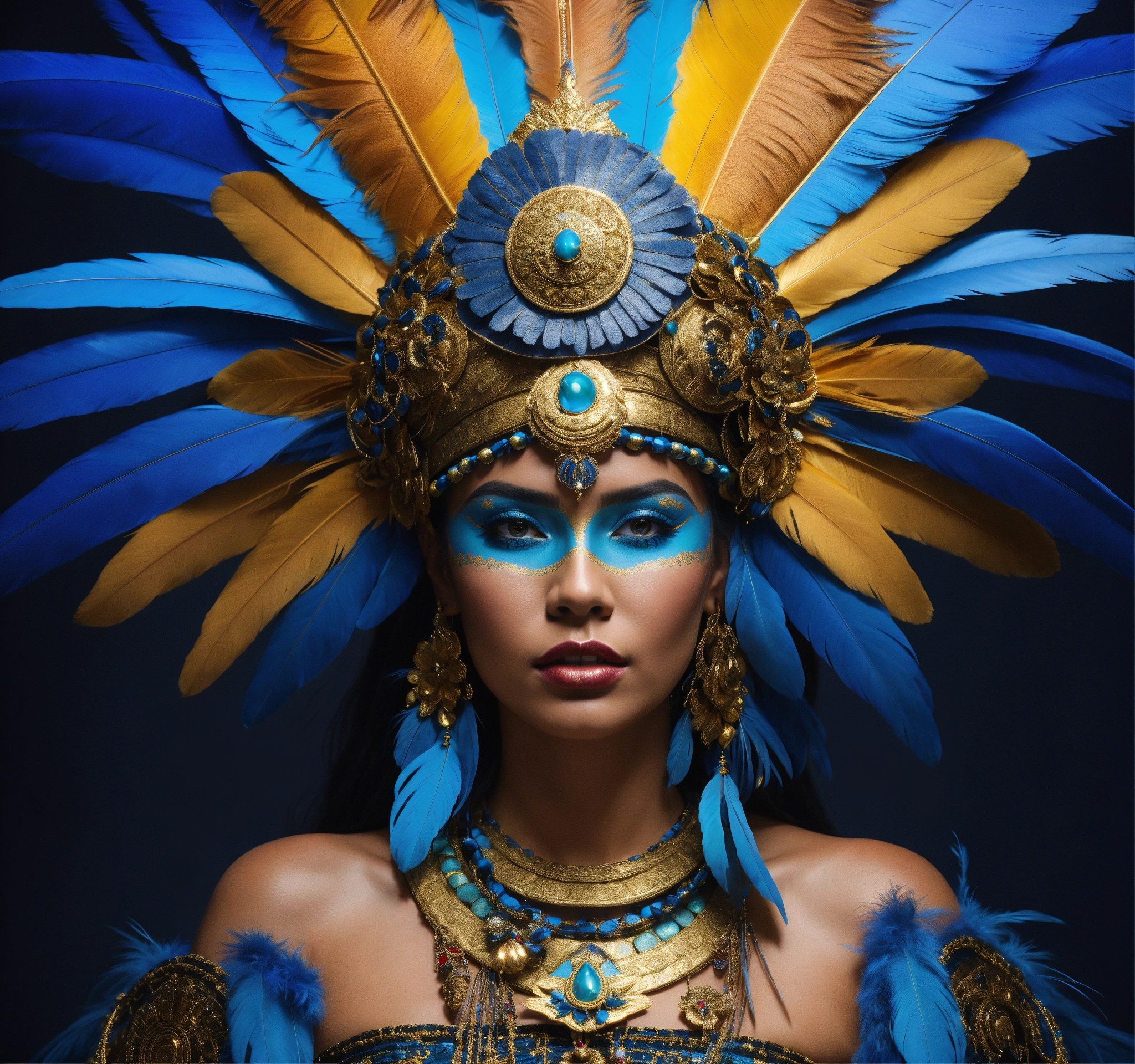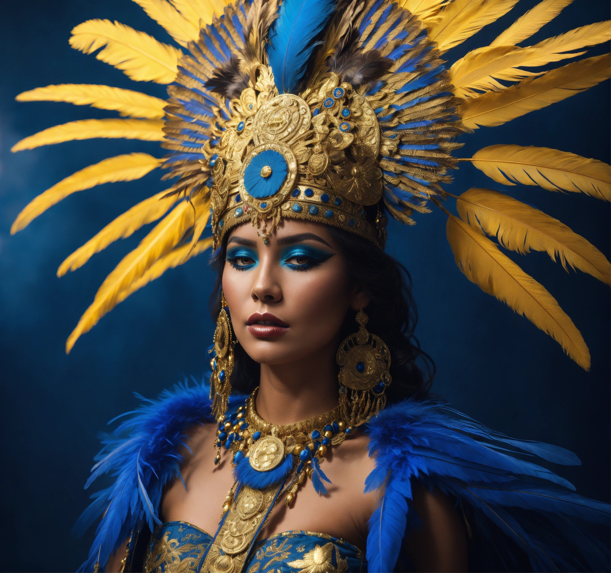 A tan skin mayan queen all blue and gold elaborate outfit, with huge headpiece center piece, blue/gold makeup with oversized headdress with long bird feathers, with depth of field, fantastical edgy and regal themed outfit, captured in vivid colors, extremely detailed, realistic photo, 4k realistic photo.