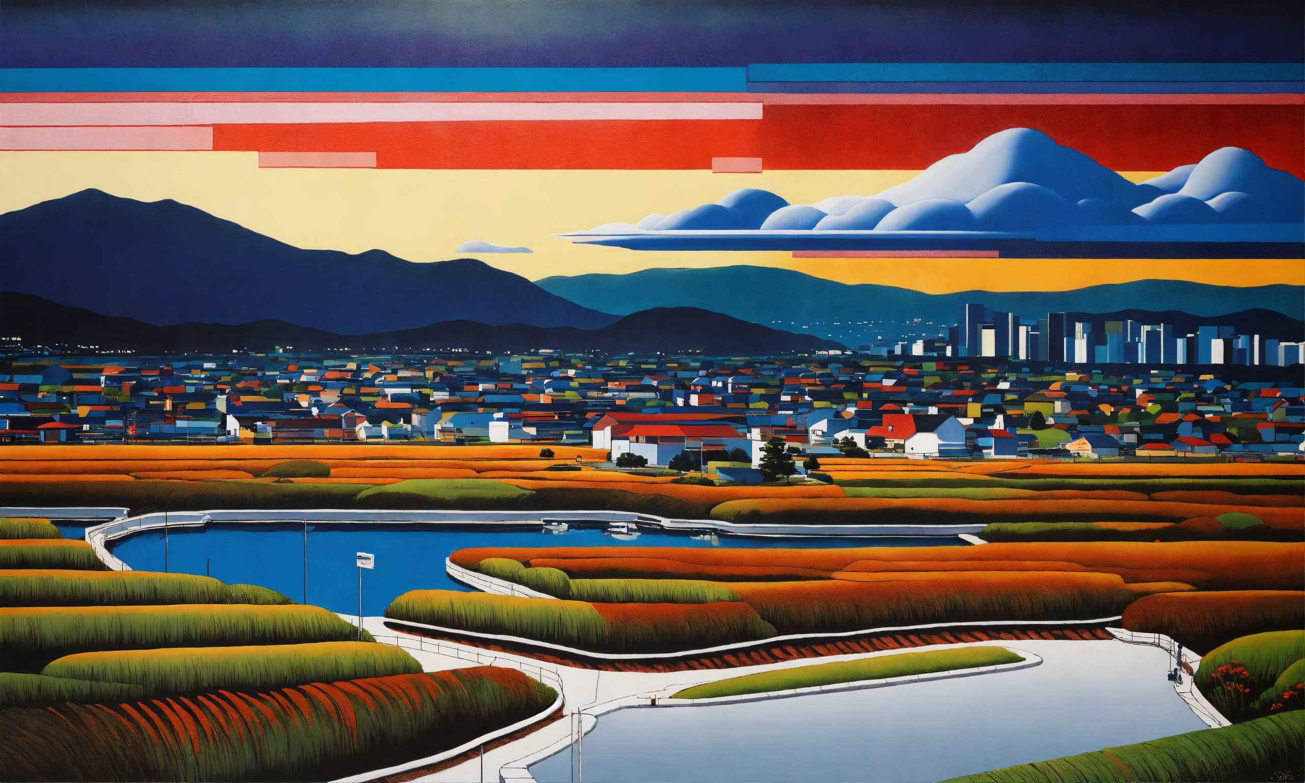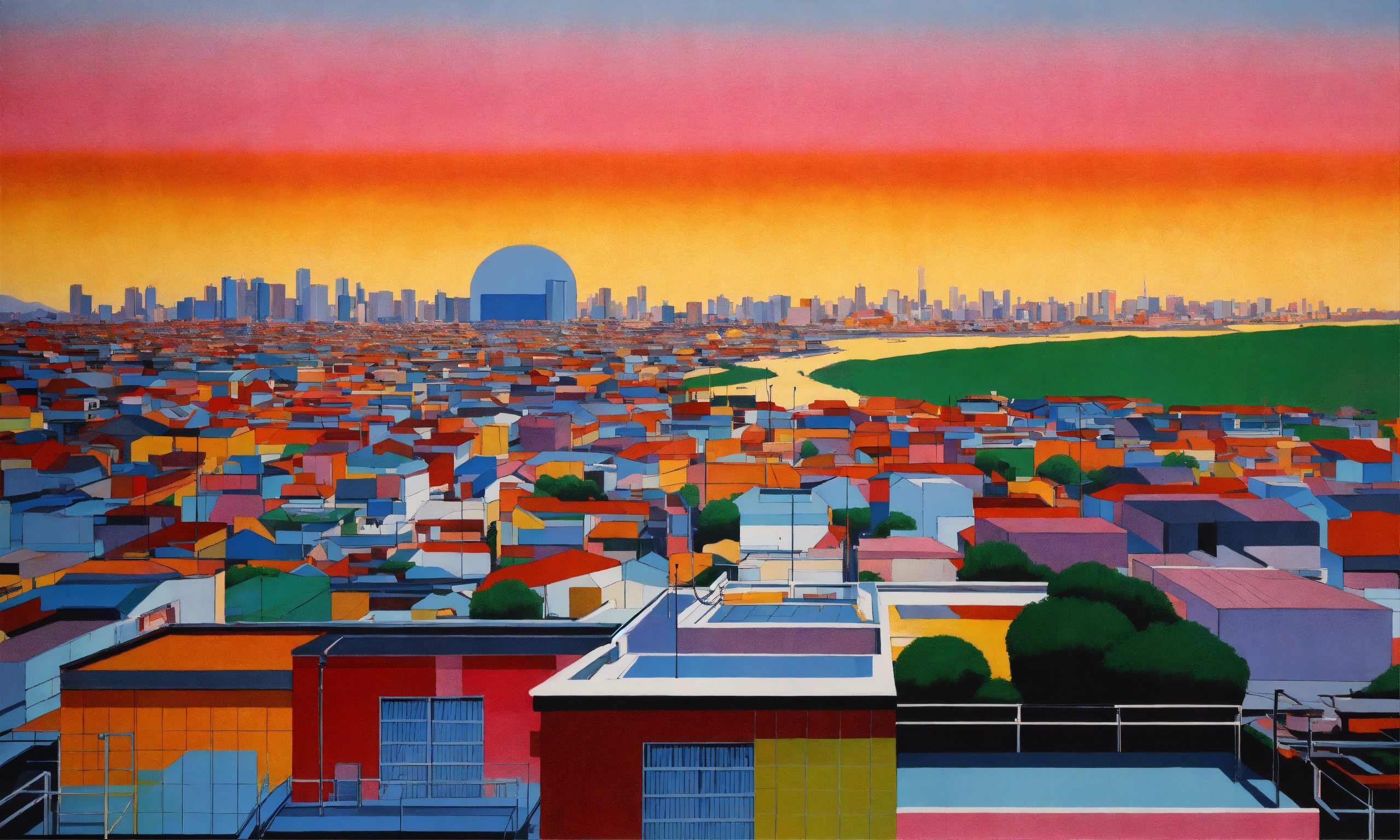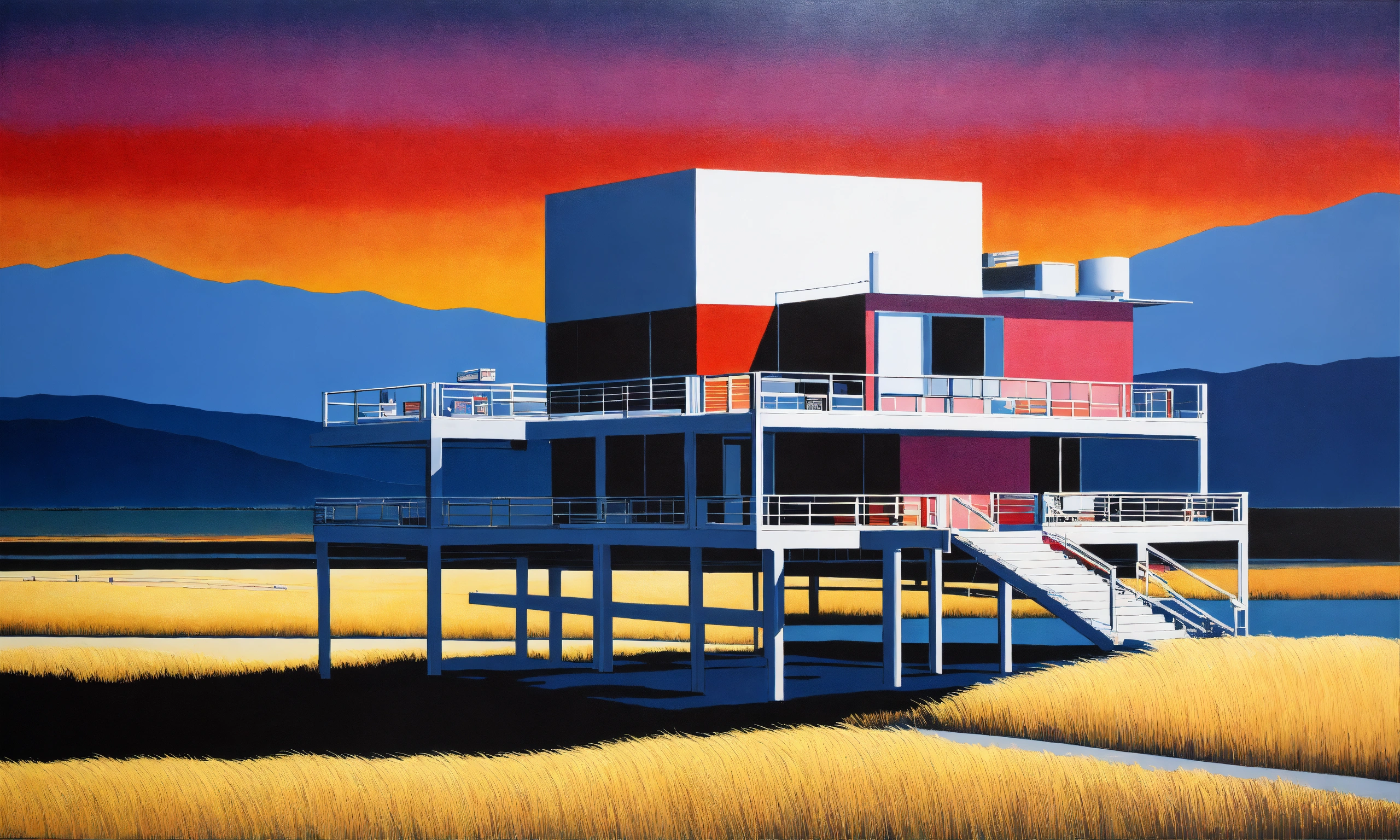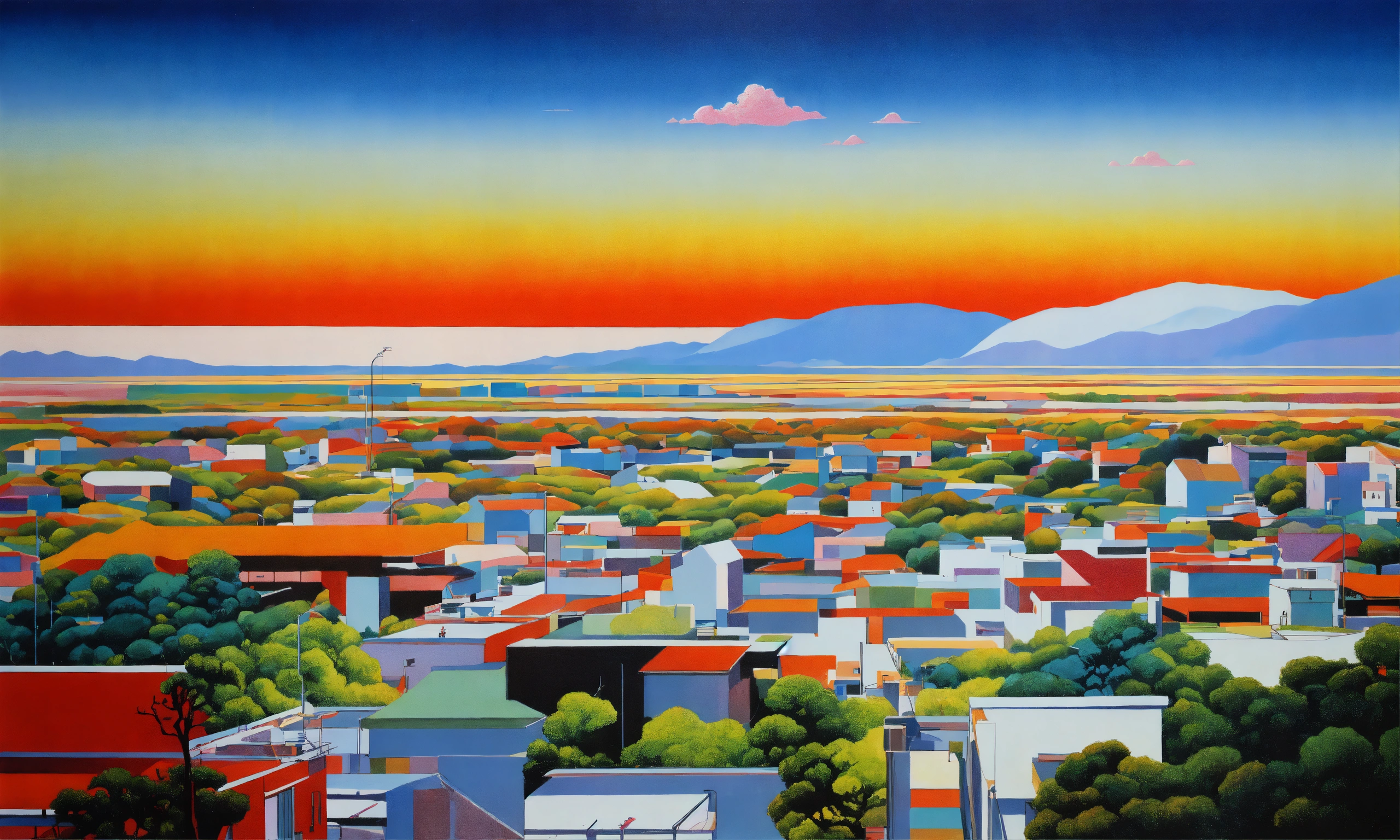 Hiroshi nagai art syle, air brushed, acrylic painting, white penthouse, minimalistic americano landscape, vibrant colours, grained