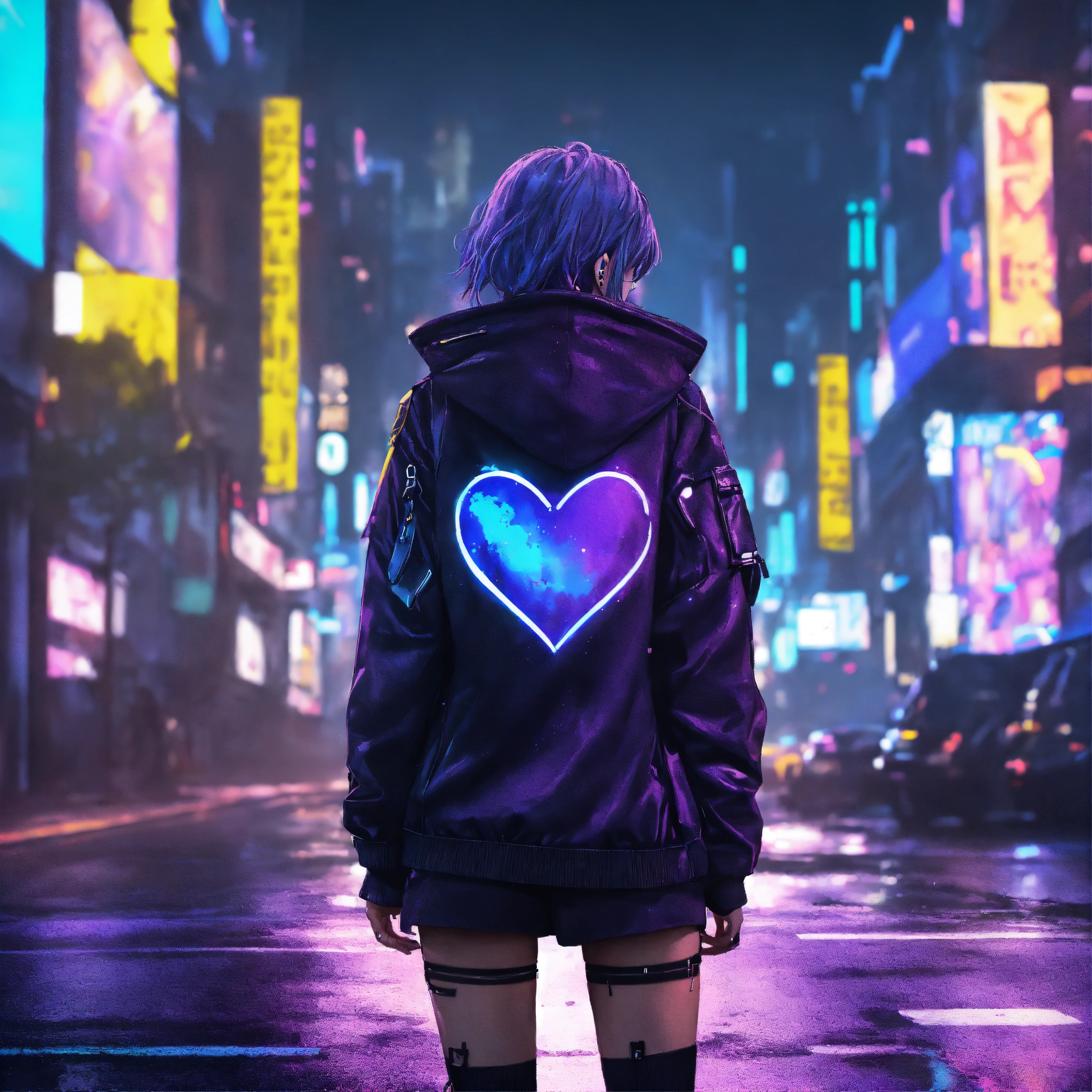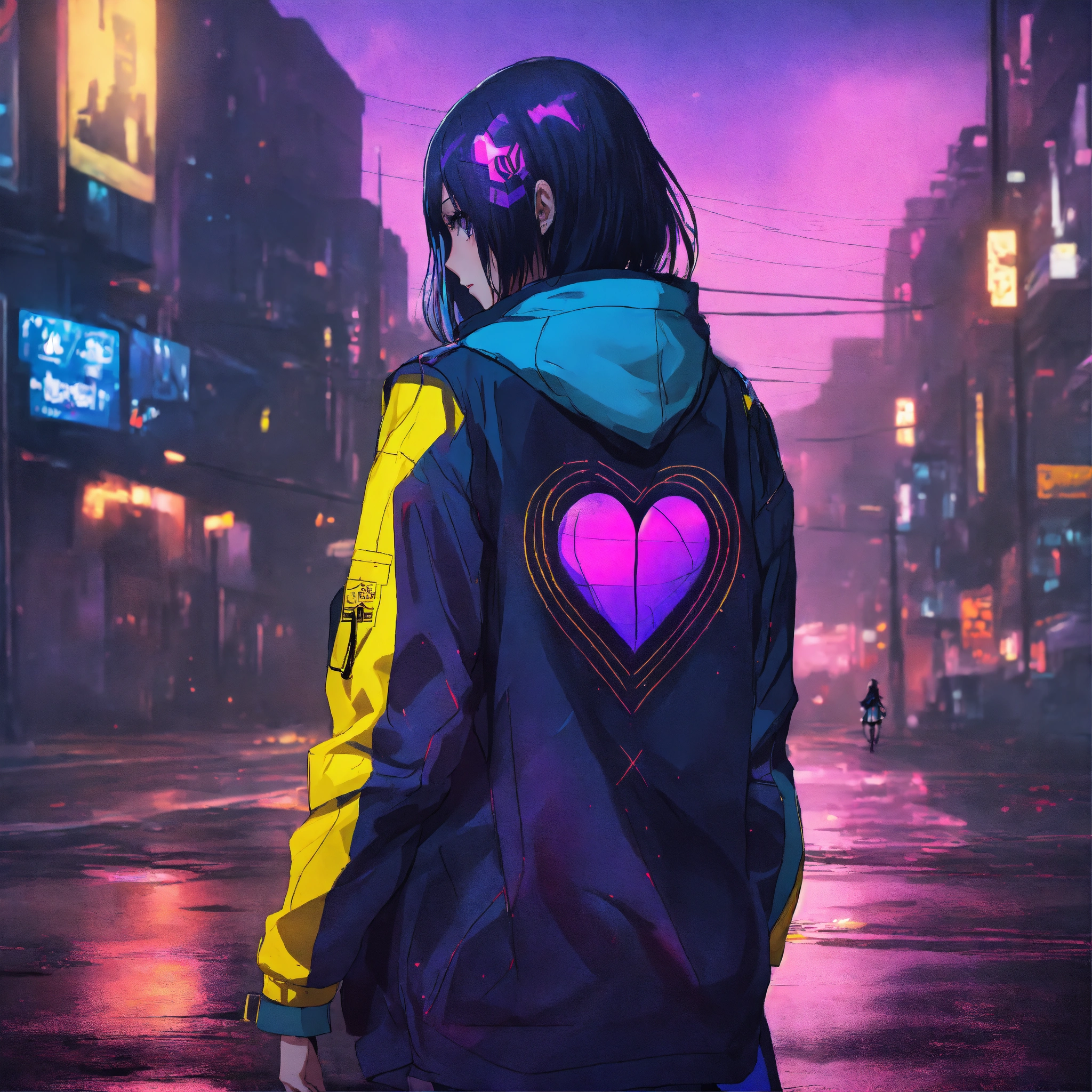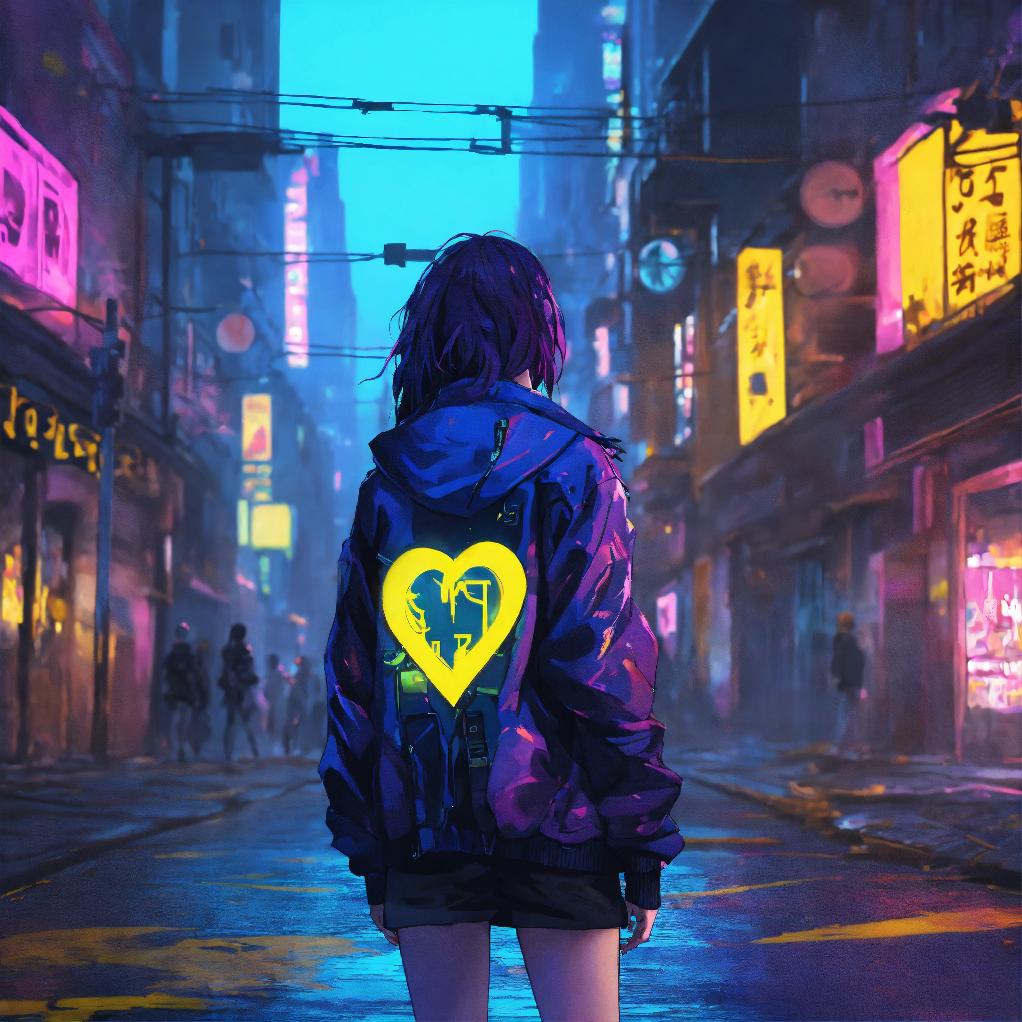 Cyberpunk city heart broken gothic girl standing in the middle of the street while it is a dark night anime style colourful blue purple and yellow heart on the back of their jacket, empty street