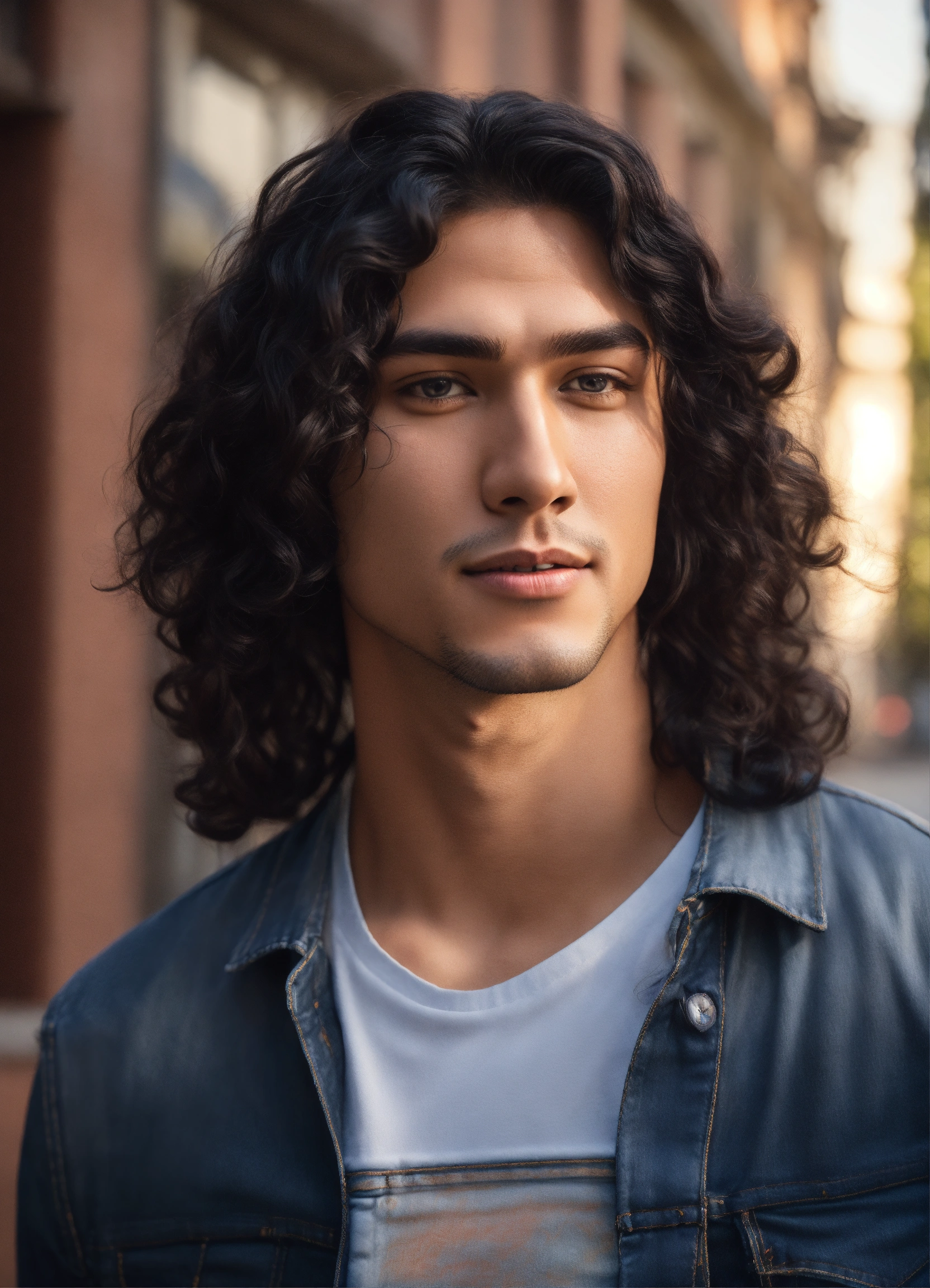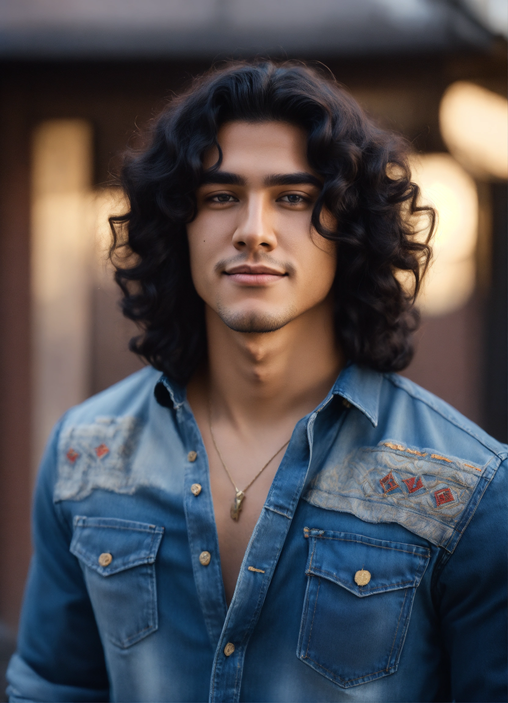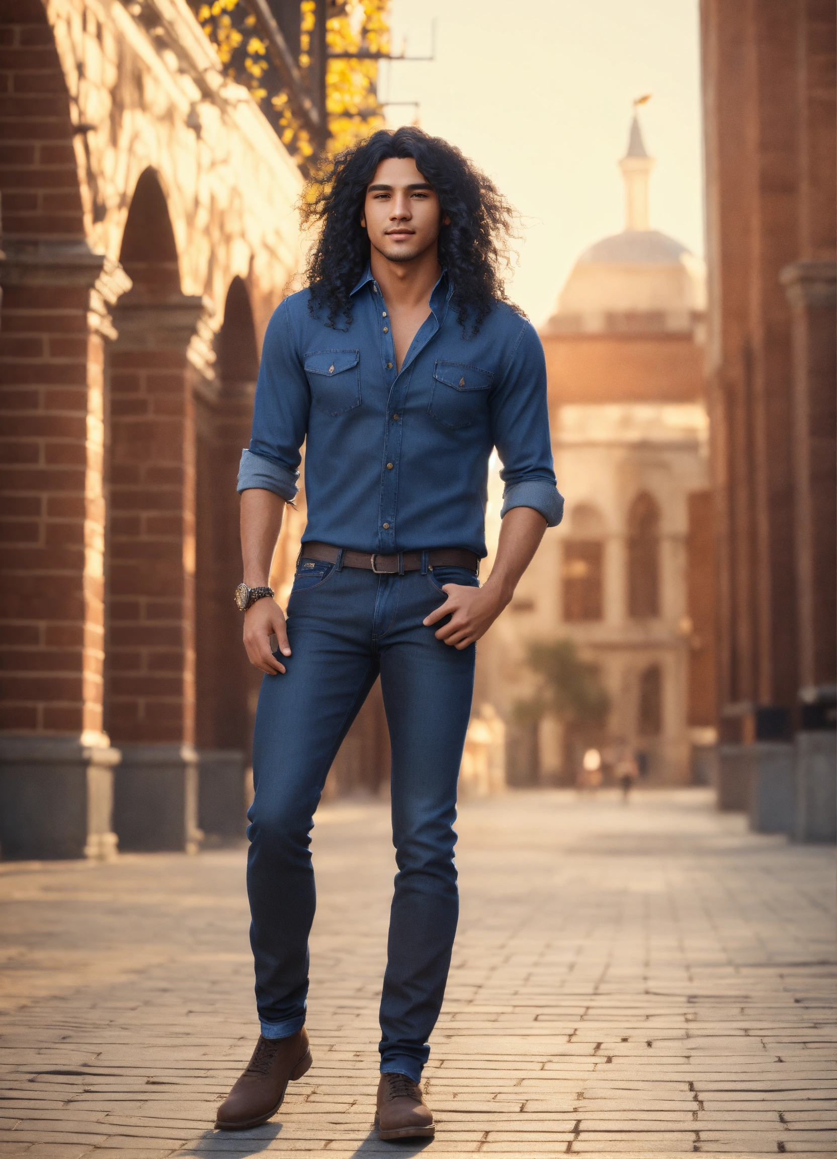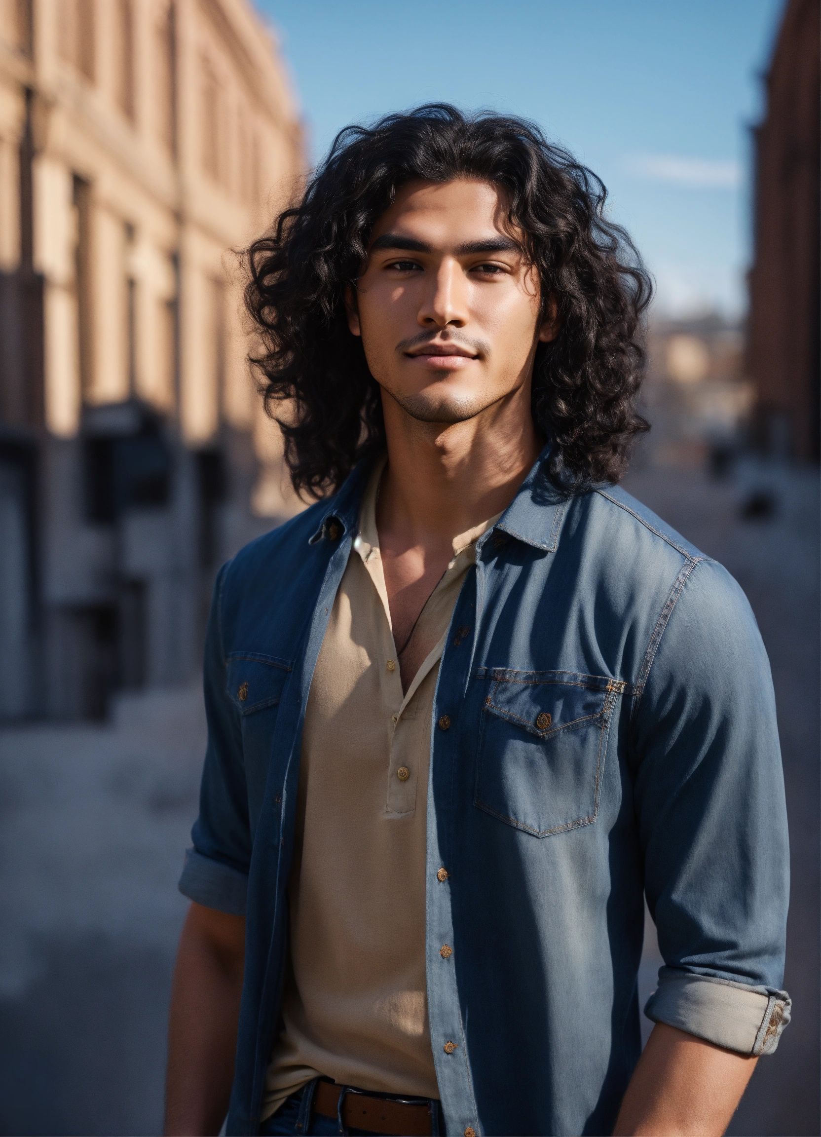 Handsome college student, very long black curly hair, dimple chin, native american features, in haute couture jeans and shirt, on sunny day, athelitic build, happy outlook, 8k, unreal engine