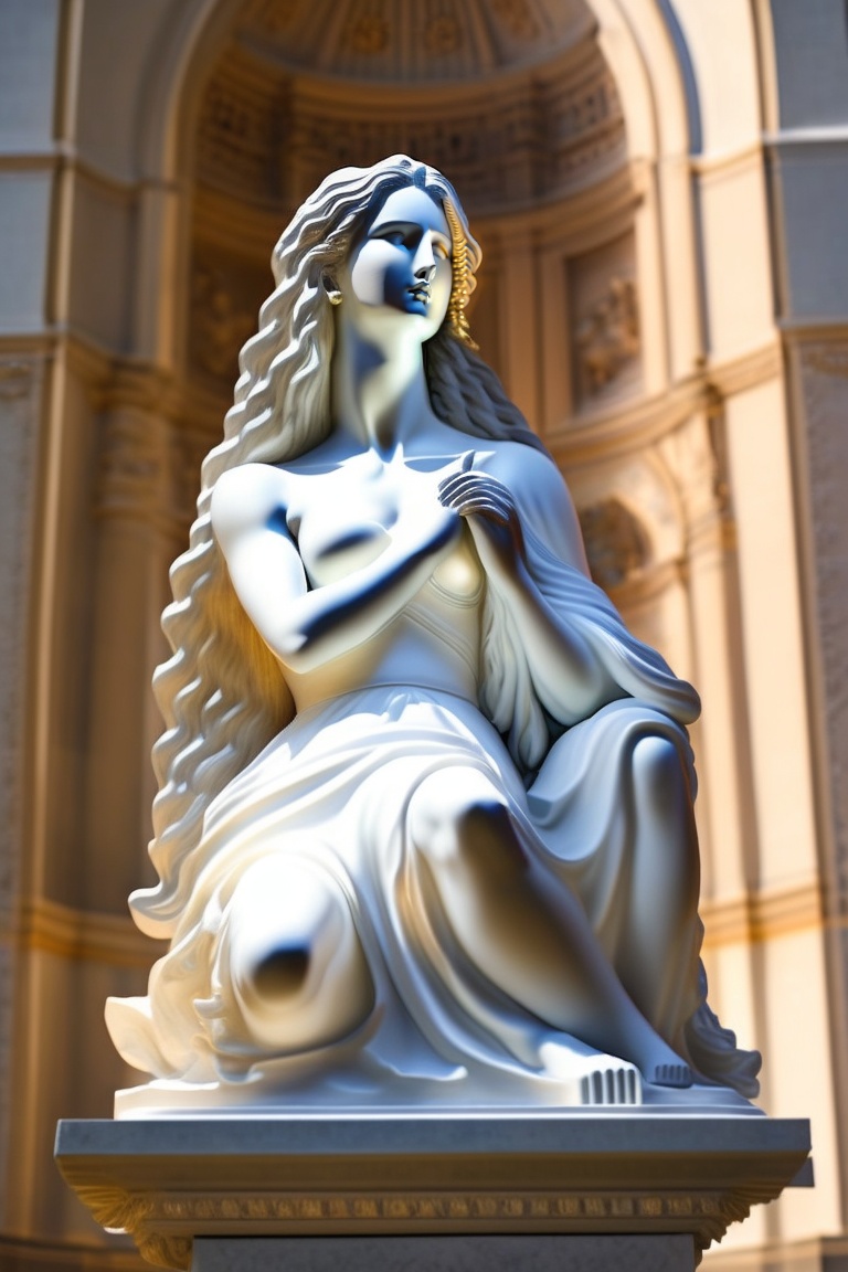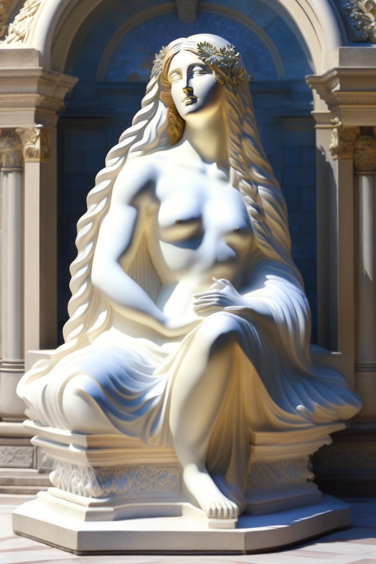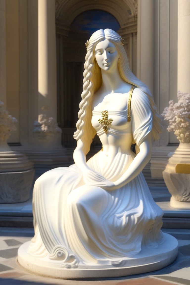 Renaissance painting, a statuette is in front of a white stone tree, the seated female figure with long, partially braided hair had her eyes half-closed, stretching her body towards the sun with her arms spread wide, in her hands she held a dagger and a dare, a closed eye is painted on her forehead and a wide-open eye on her chest, illuminated by the midday rays, imposing and beautiful, like the rest of the hall lit by the noonday sun, she shone with the same meaningful whiteness, whire colours.