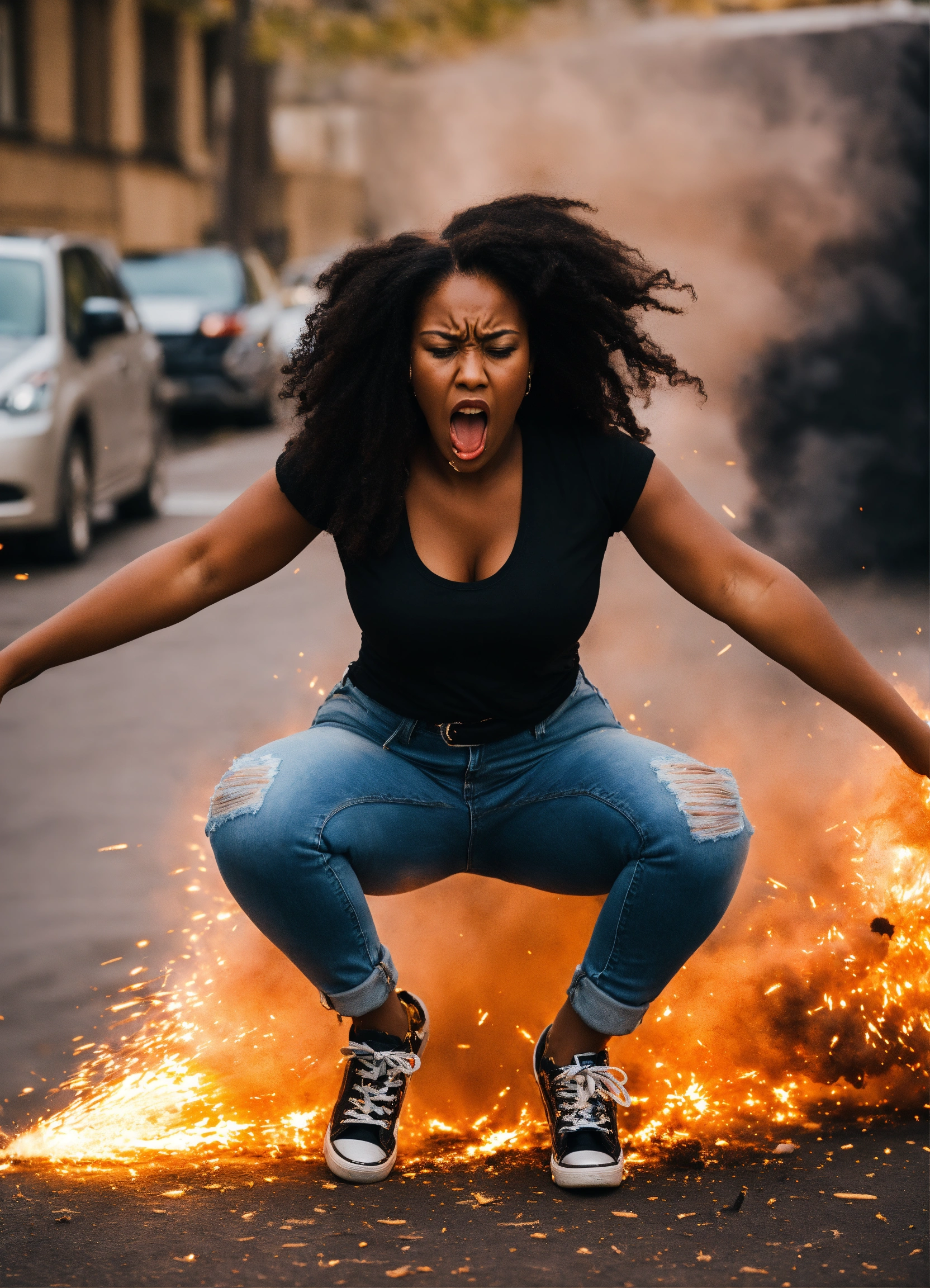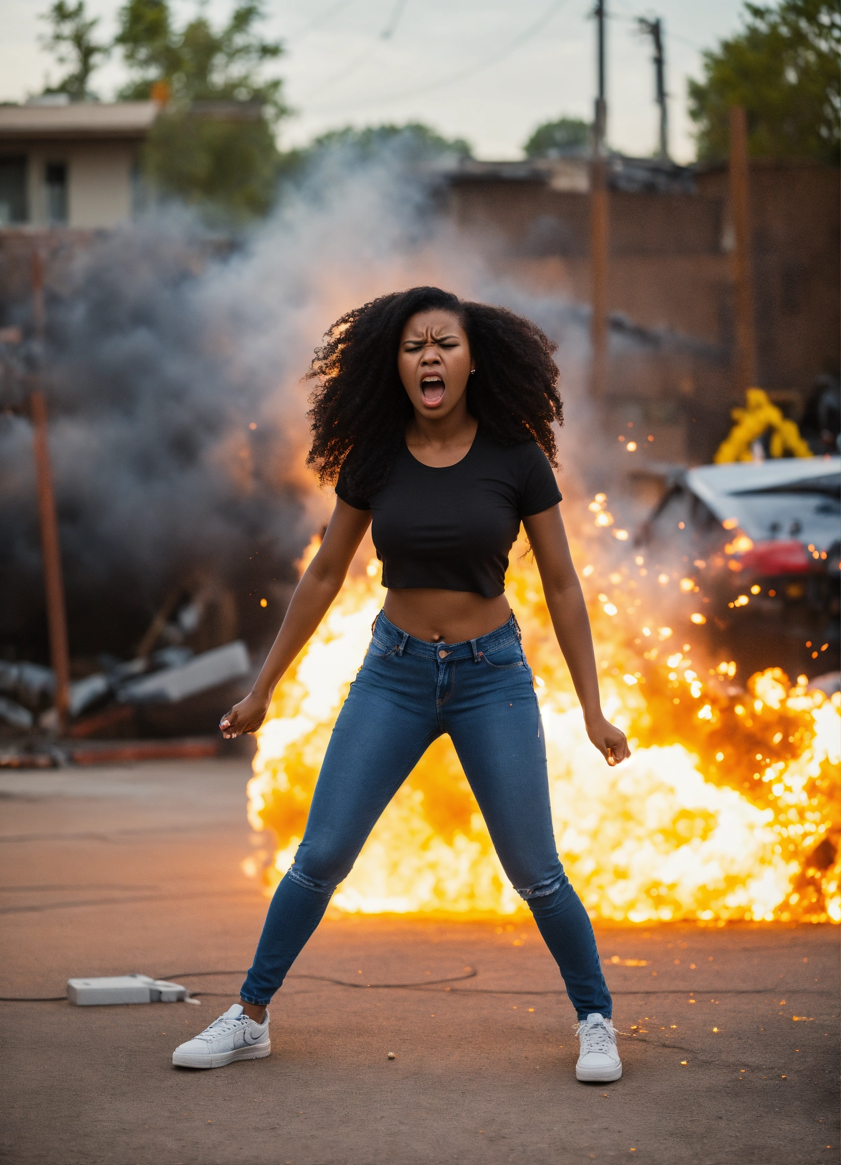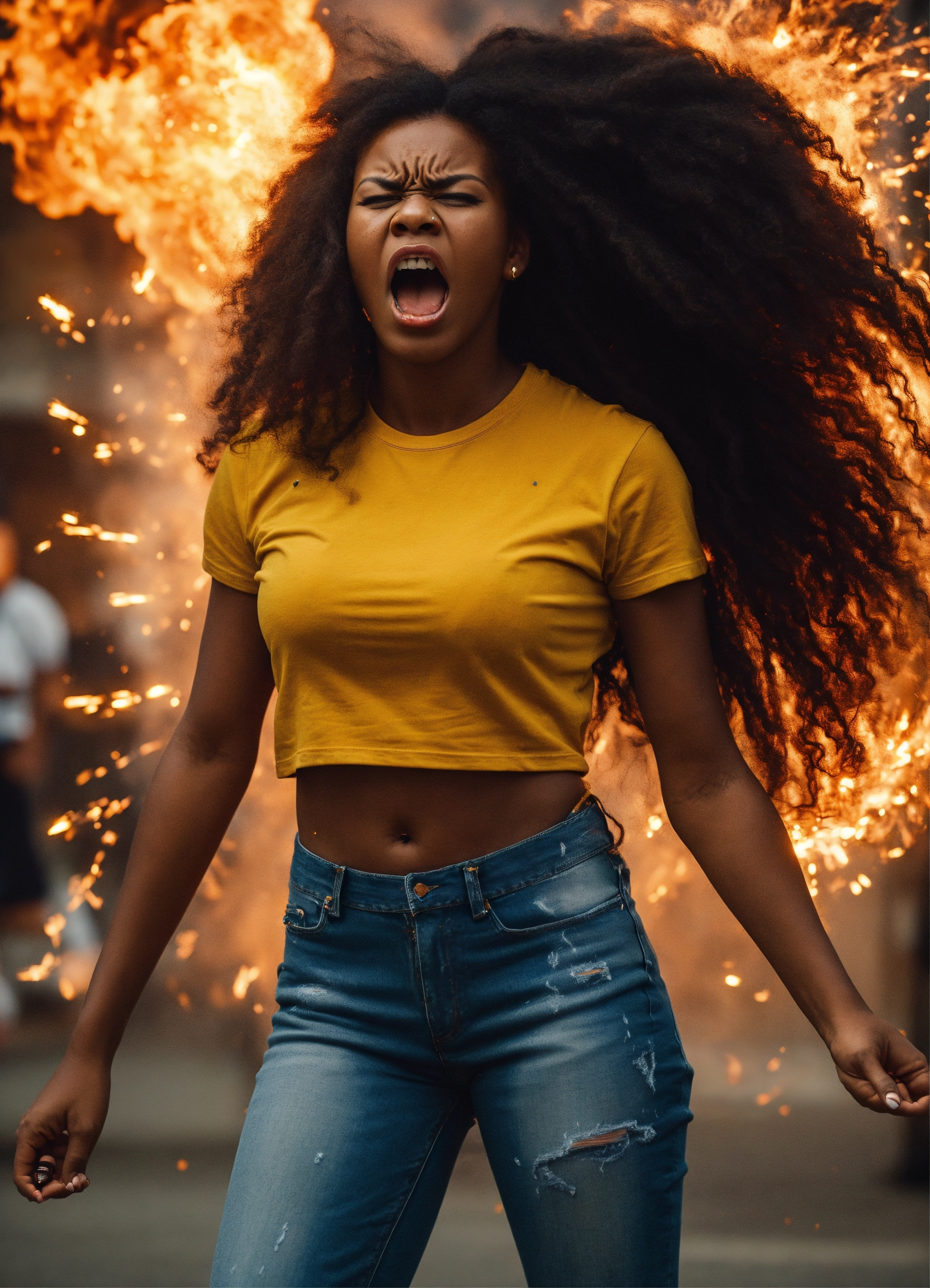 A beautiful black woman with long hair, wearing a t-shirt and jeans, woman getting very angry and exploding with anger