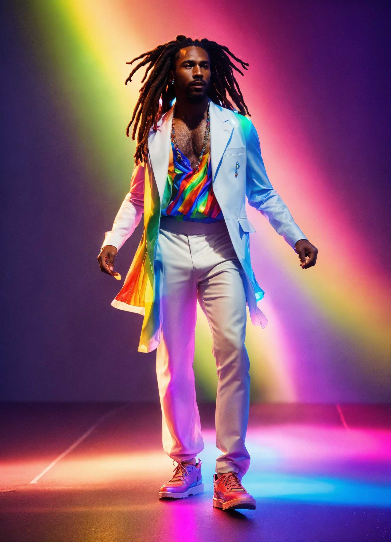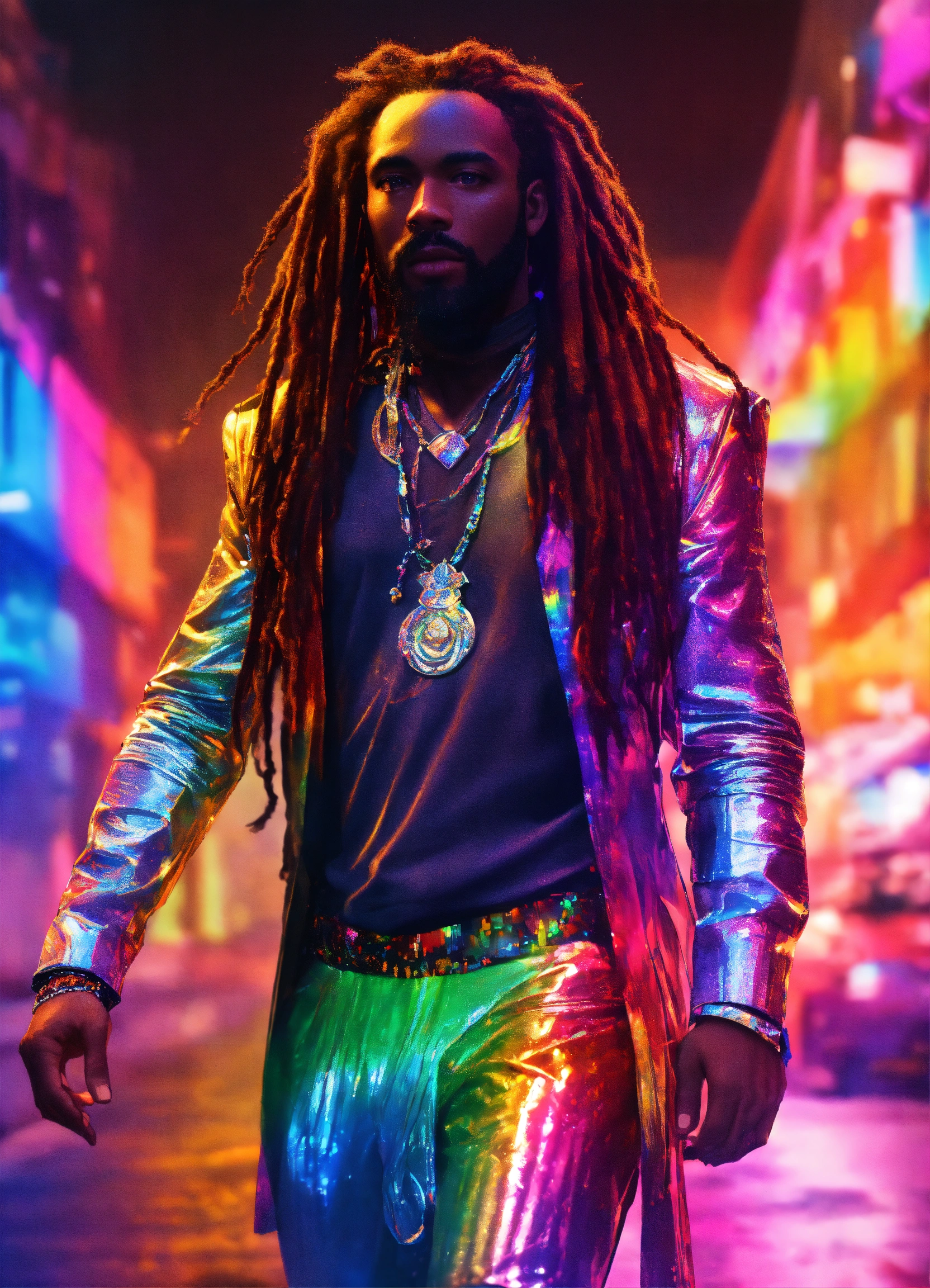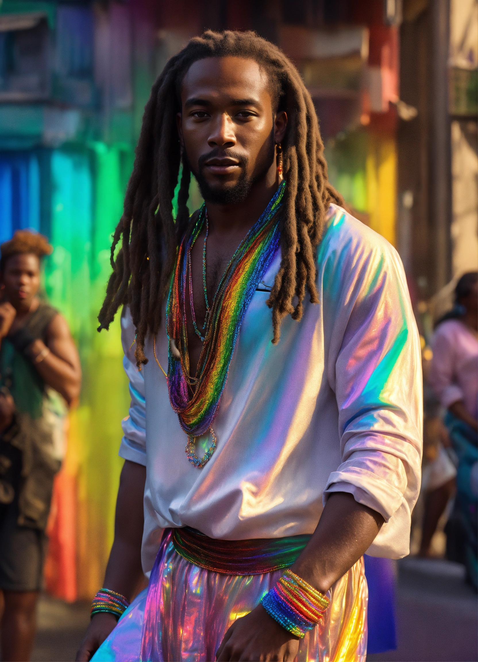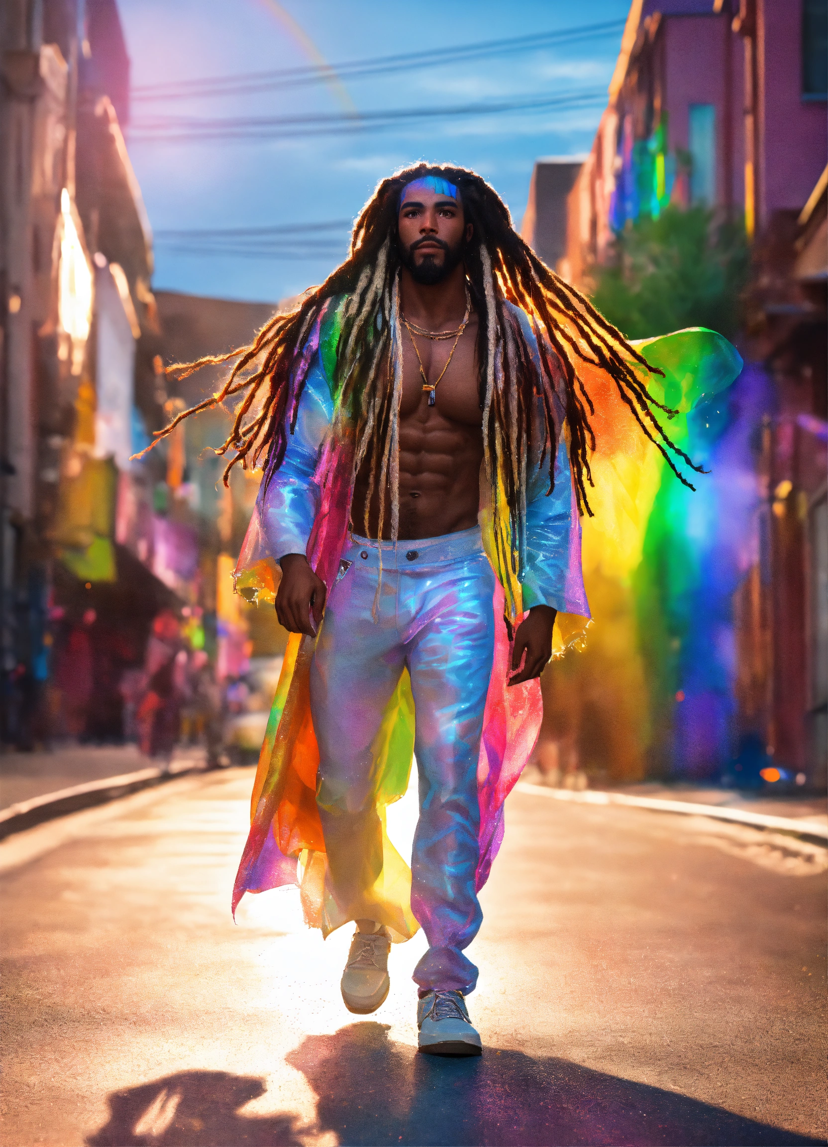 Hologram of a black man with long flowing dreadlocks, well-built, virile, 6' 5" tall, he has iridescent black skin that reflects all the colors of the rainbow, full body shot, striding up the street confidently, looking directly into camera, wearing white iridescent clothing, african style iridescent clothing that reflects all the colors of the rainbow, 3d render