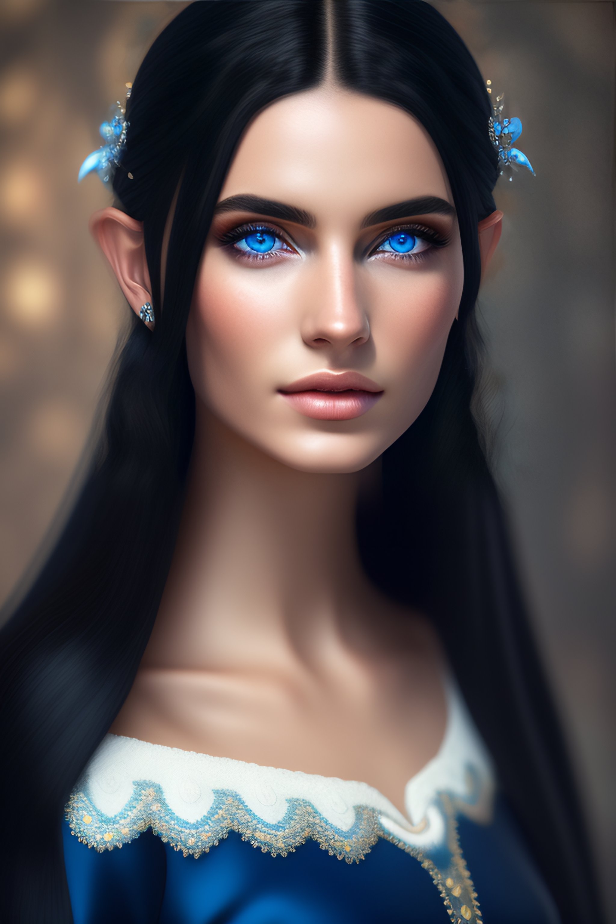 Deep dark fantasy, european girl with long black hair, white pepper skin, blue eyes, elf, 8k, high resolution
