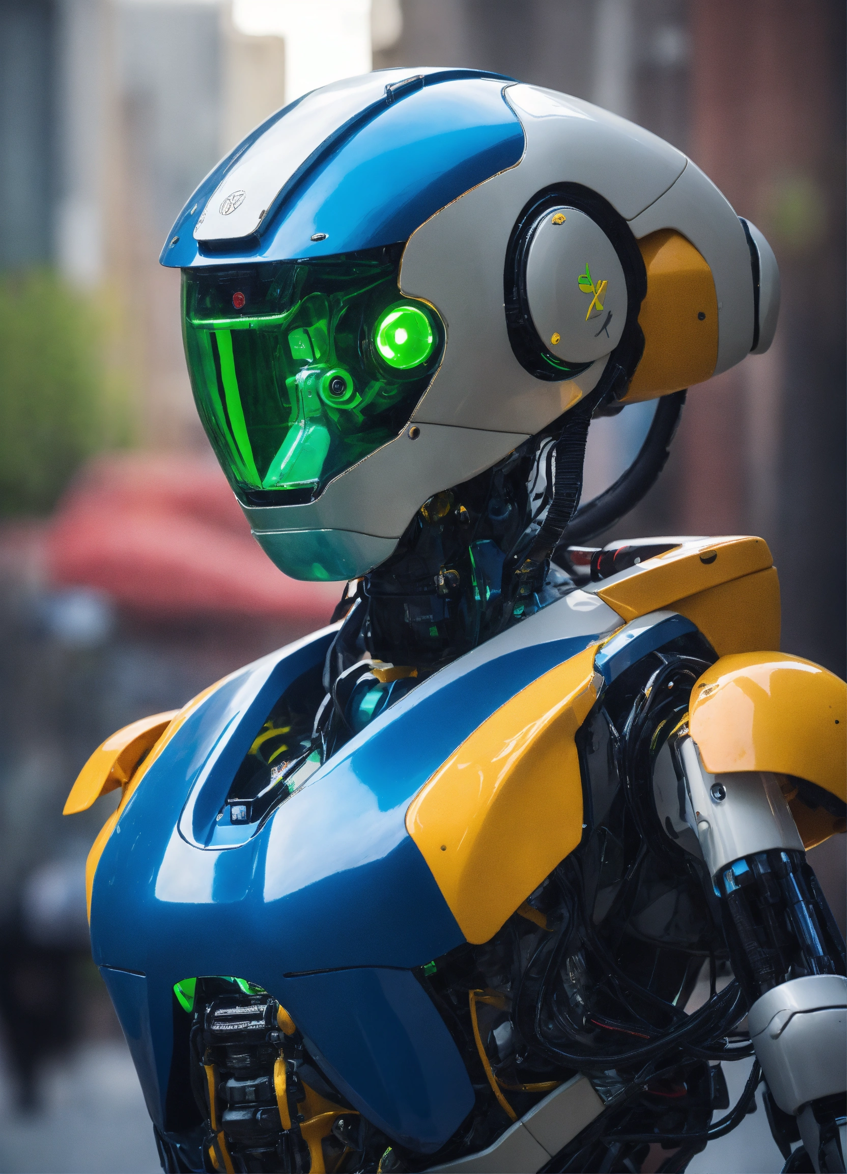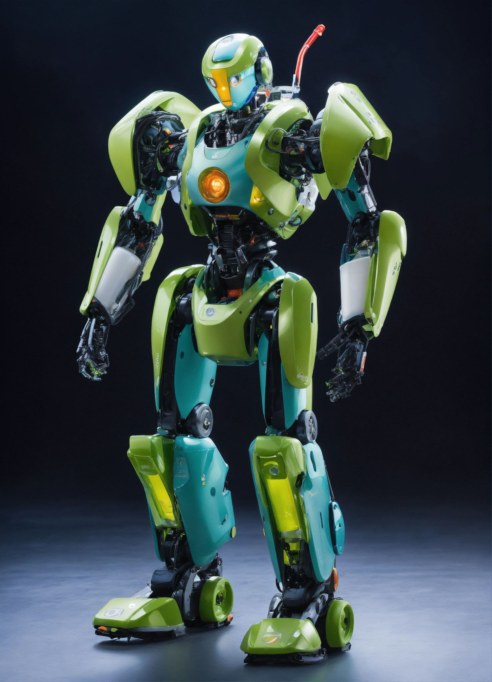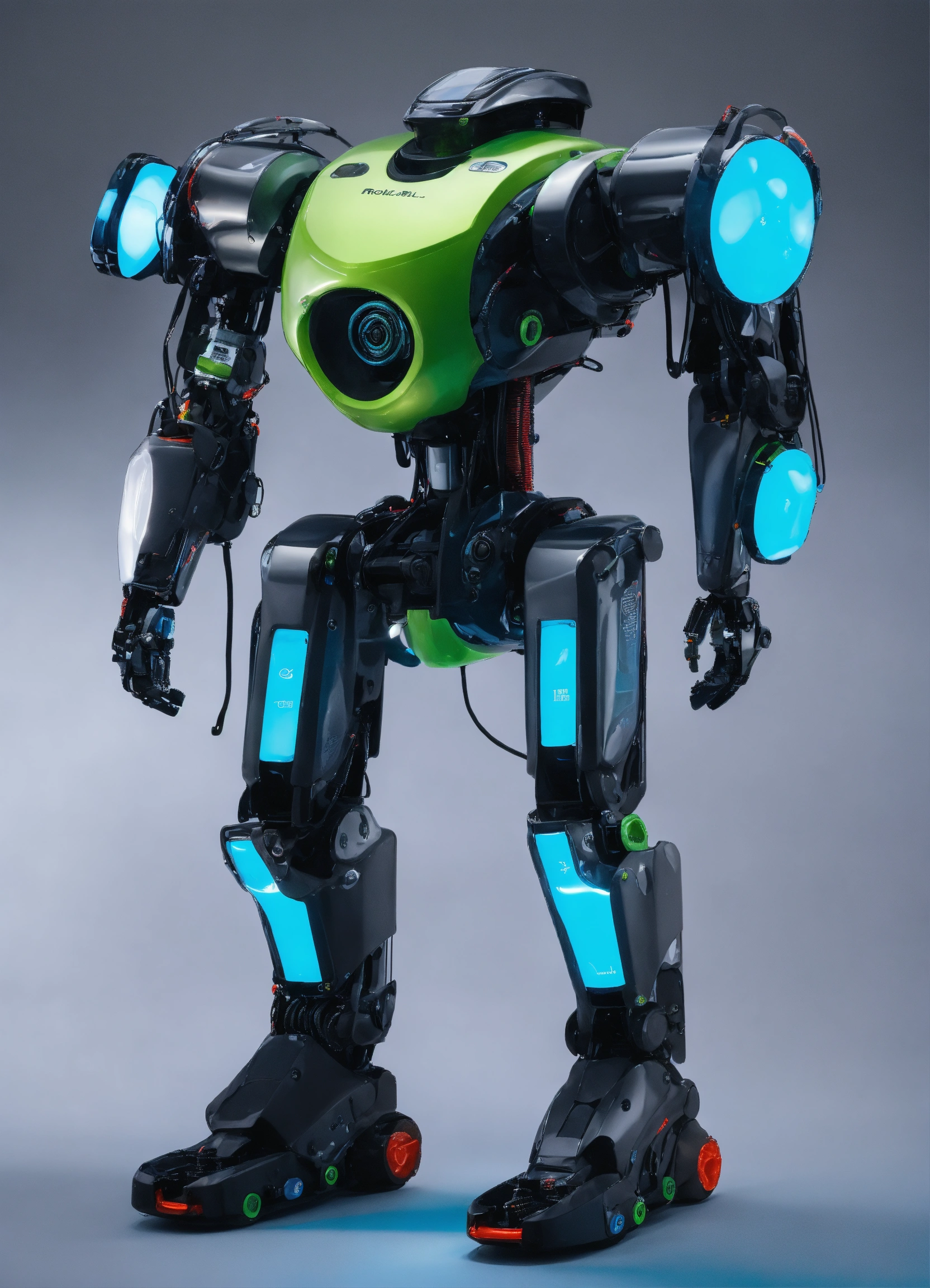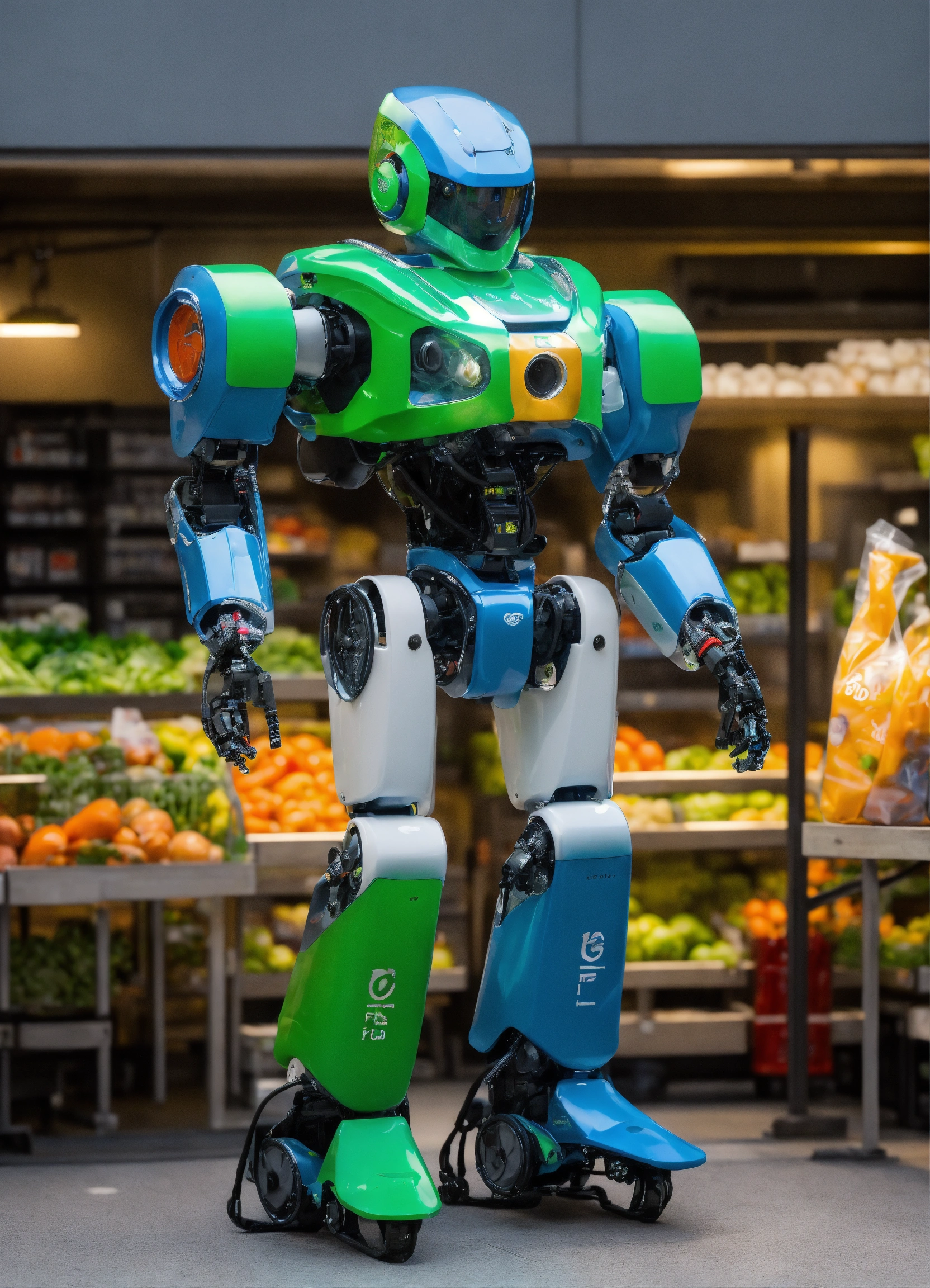 Picture a state-of-the-art humanoid robot a highly realistic male face with detailed skin, clear eyes, and wind-swept black hair atop a sporty robotic frame. it sprints, holding groceries a milk bottle, sealed bread pack, shiny soft drink, and a basket of colorful veggies. a sports backpack clings to its back. the background, while transparent, subtly blends from a deep blue at the bottom to a vibrant green at the top, emphasizing the robot's form and purpose.