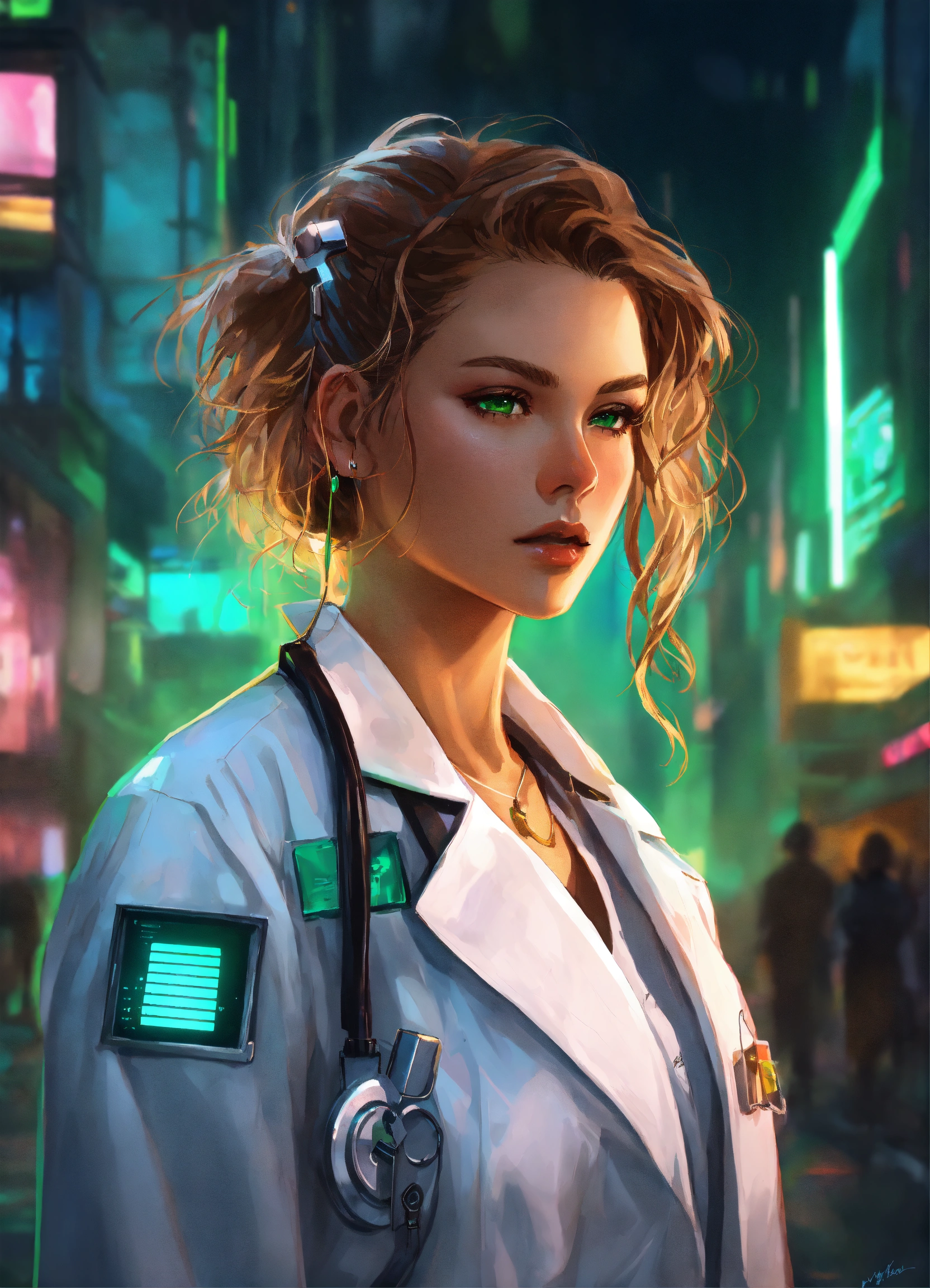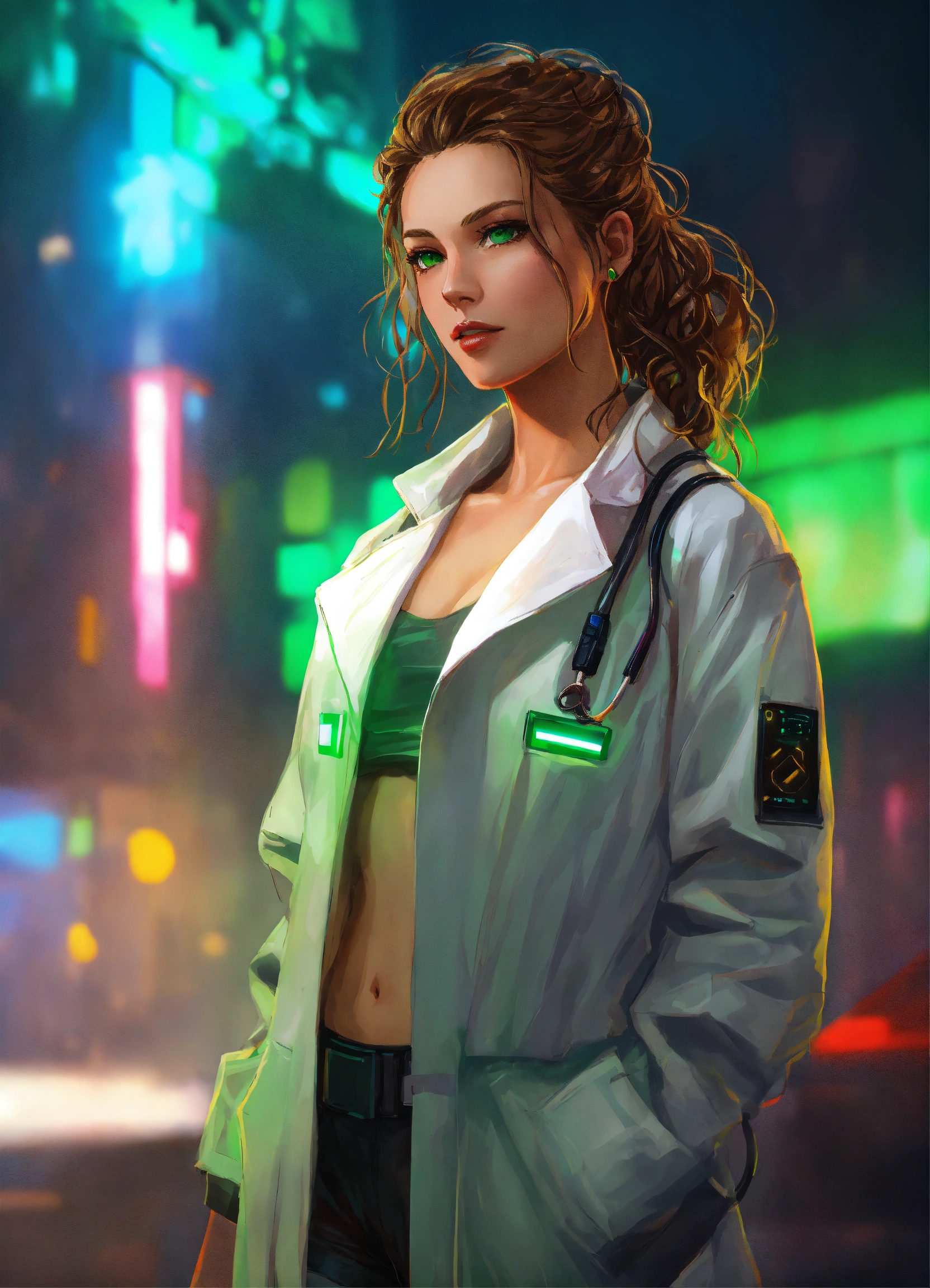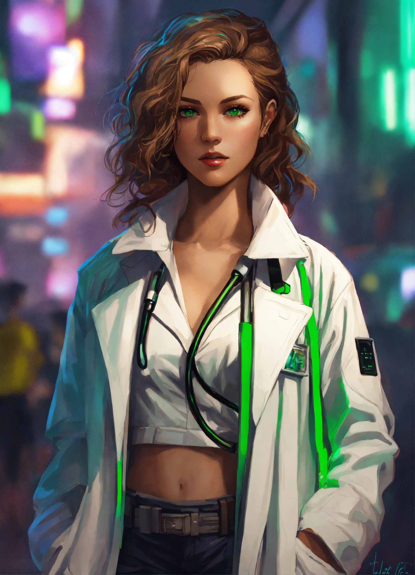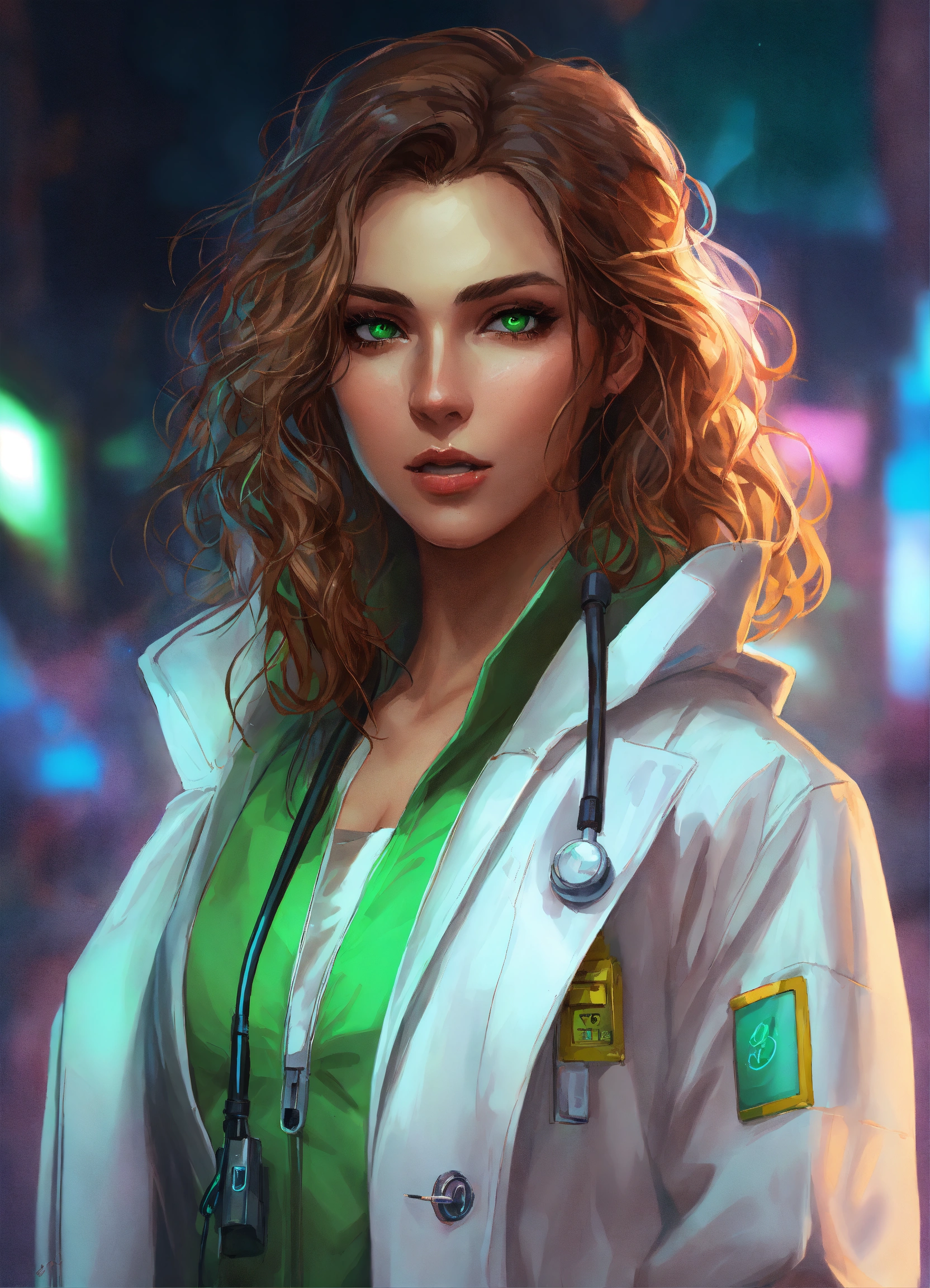 Digital portrait of a cyberpunk female doctor with wavy light brown hair, green eyes, off-the-shoulder white coat, shorts, and heels.