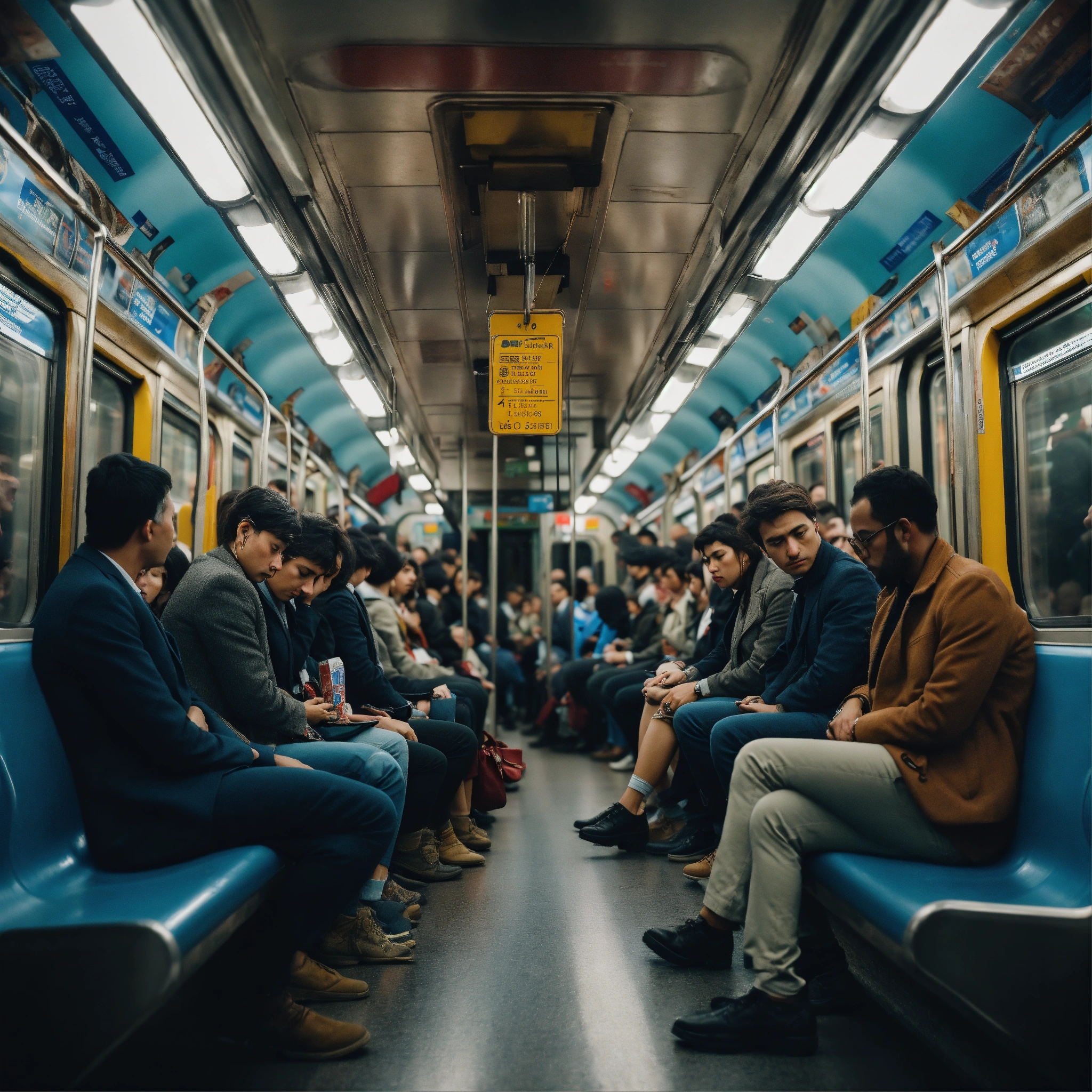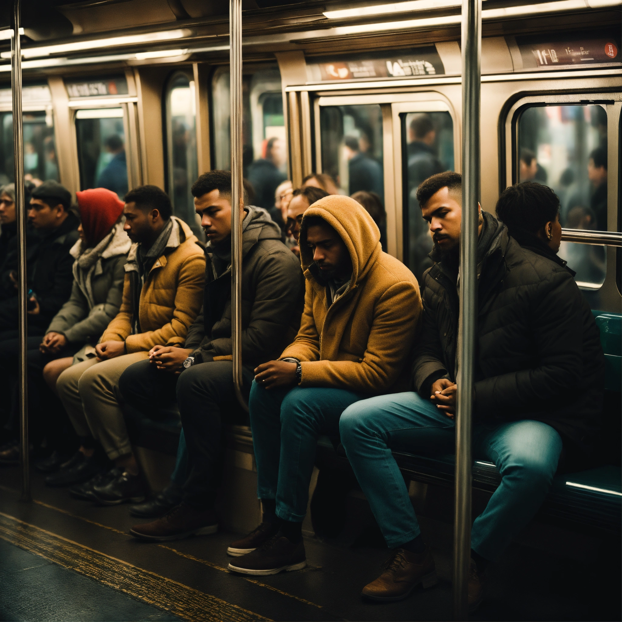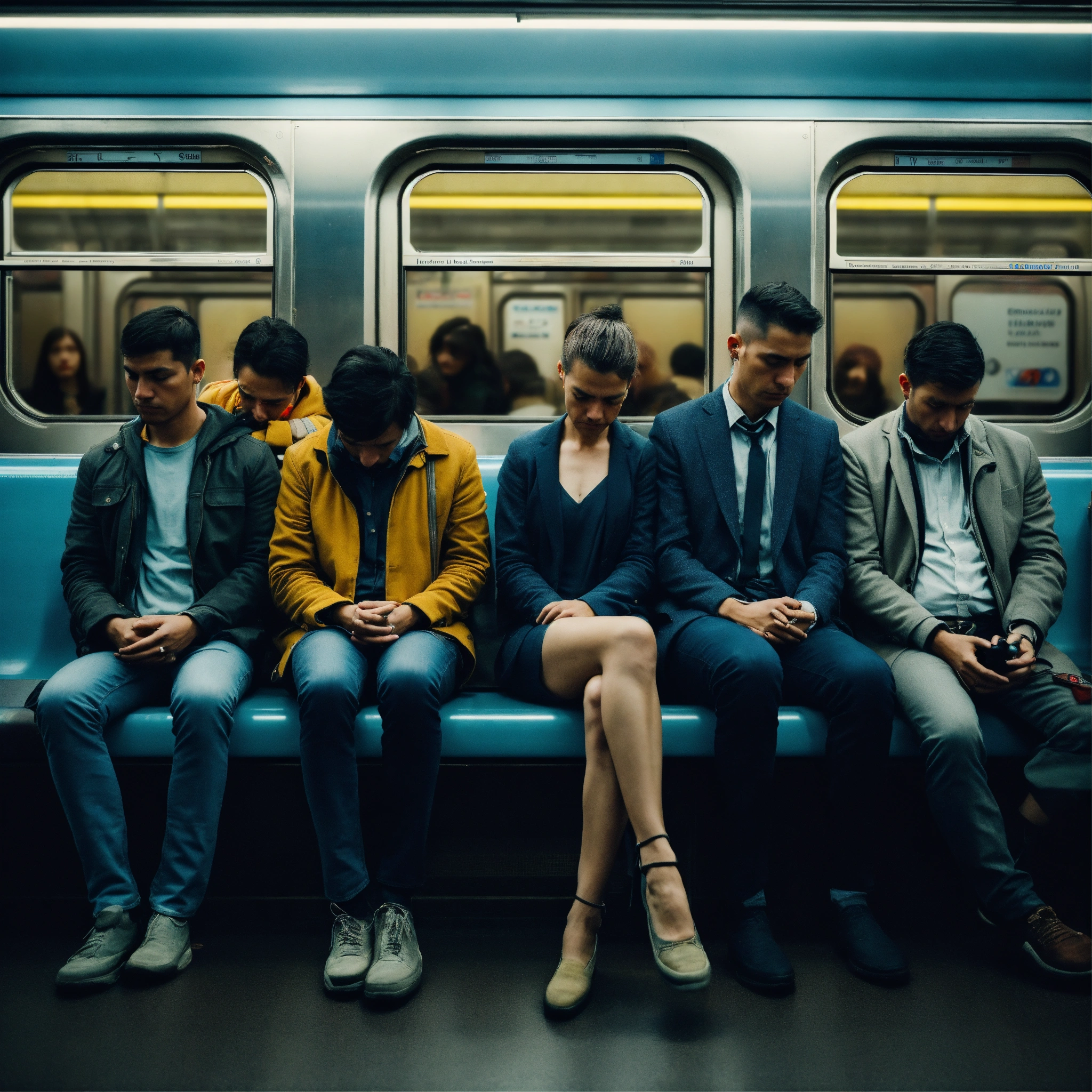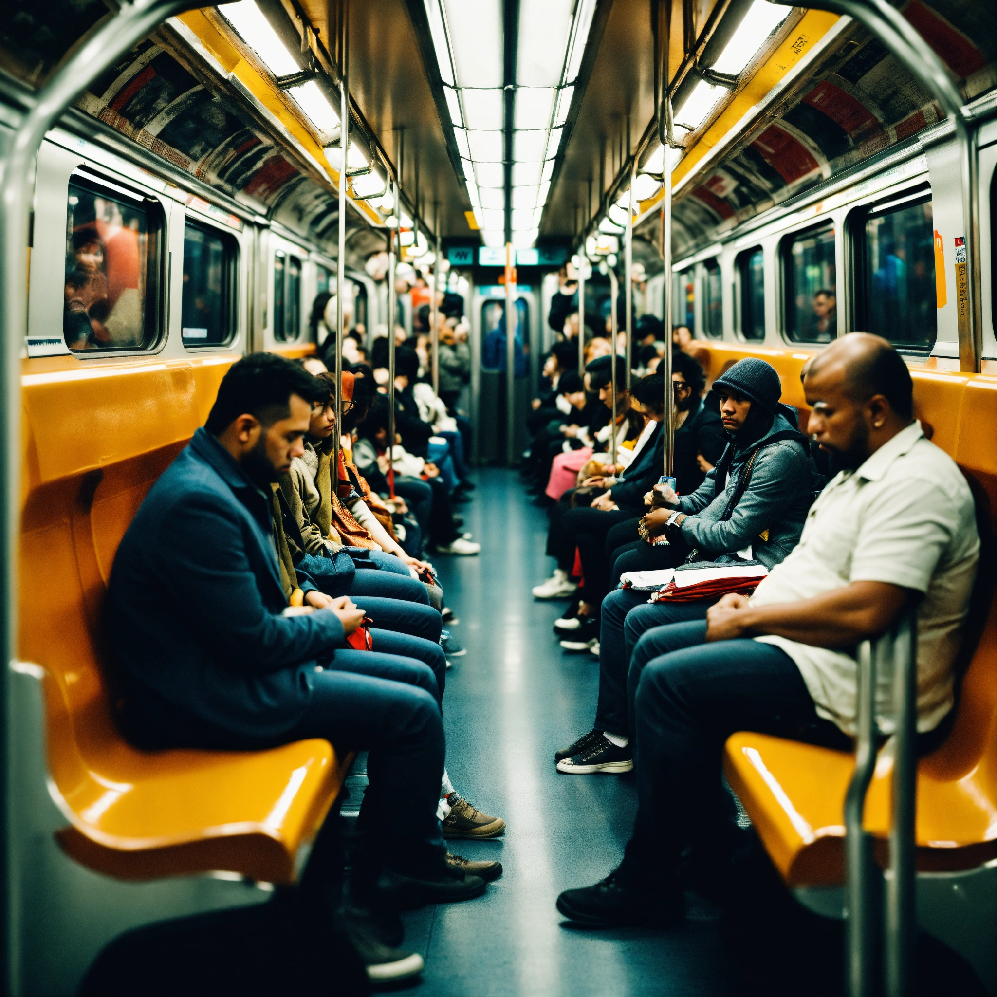 People with no heads sitting in a very crowded subway train during rush hour, commuting, sad expressions. intricate details, photo taken on hasselblad, creative photoshoot, unreal render 8k