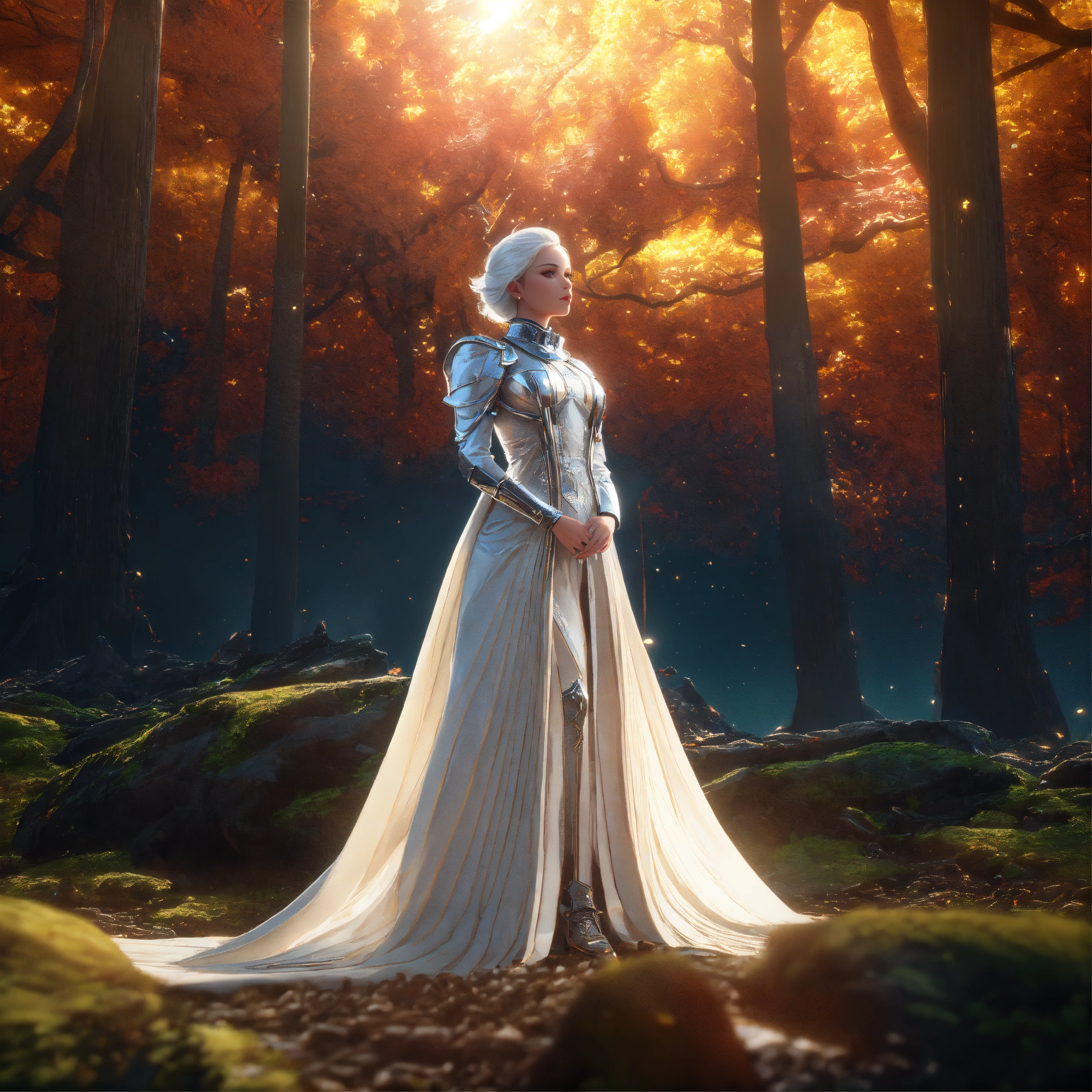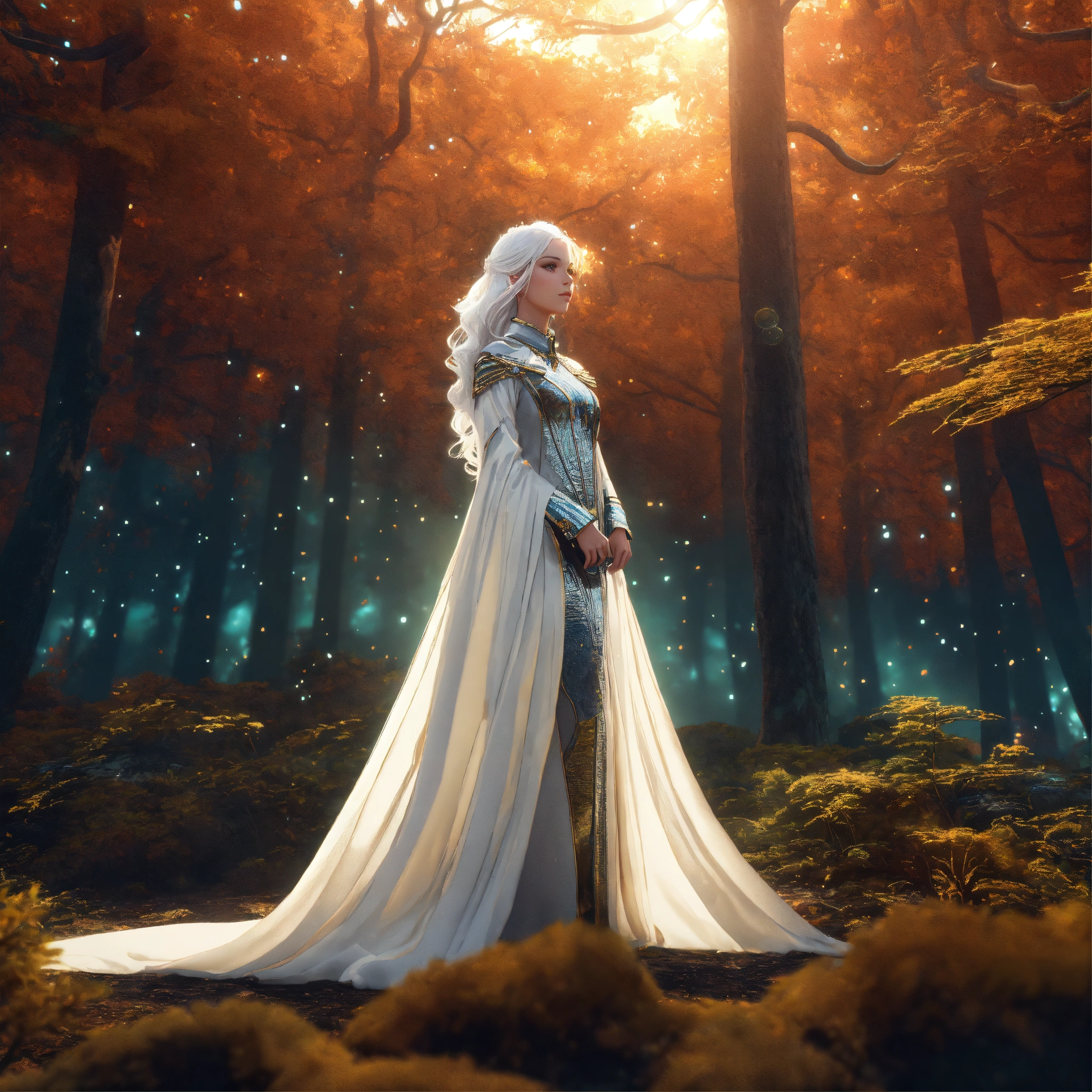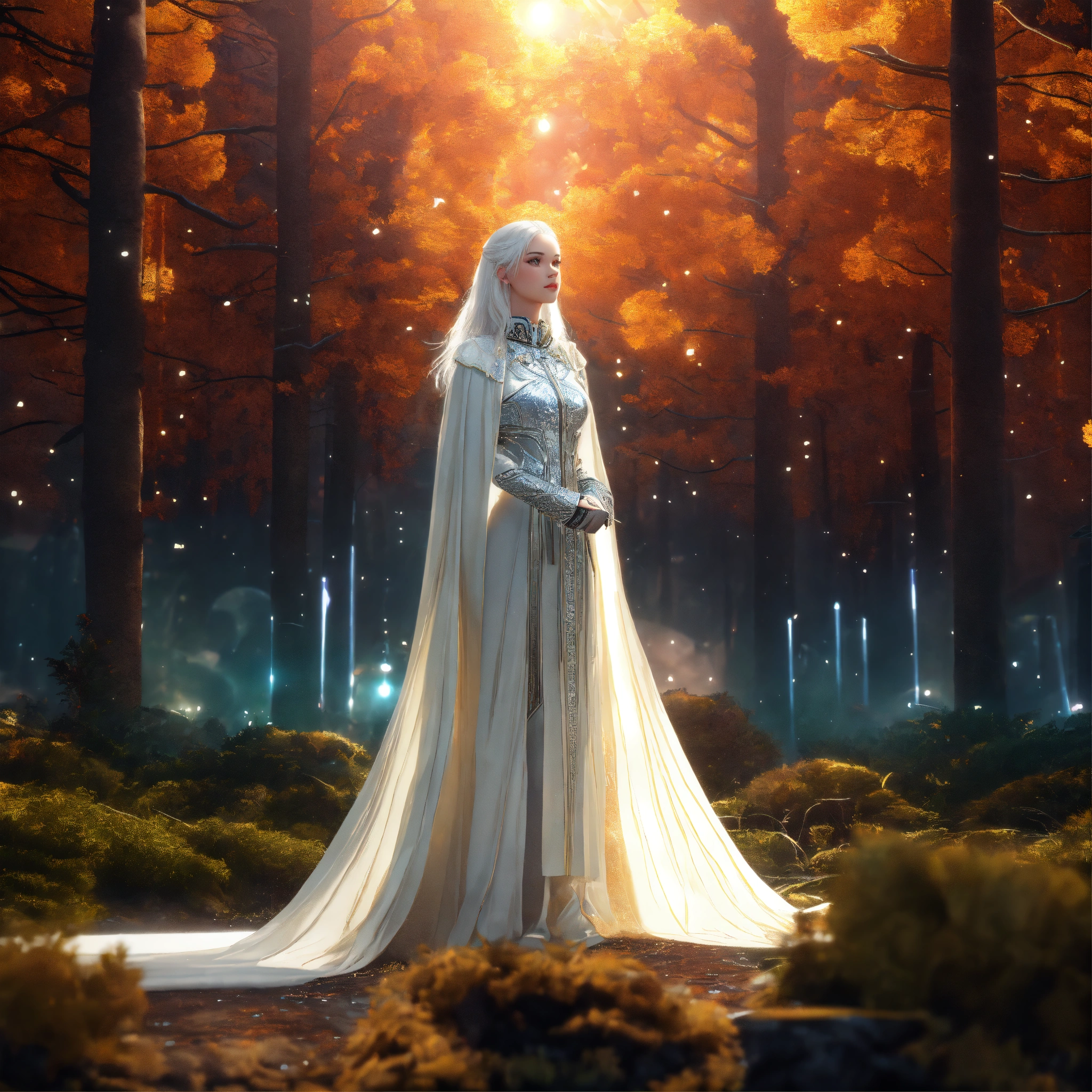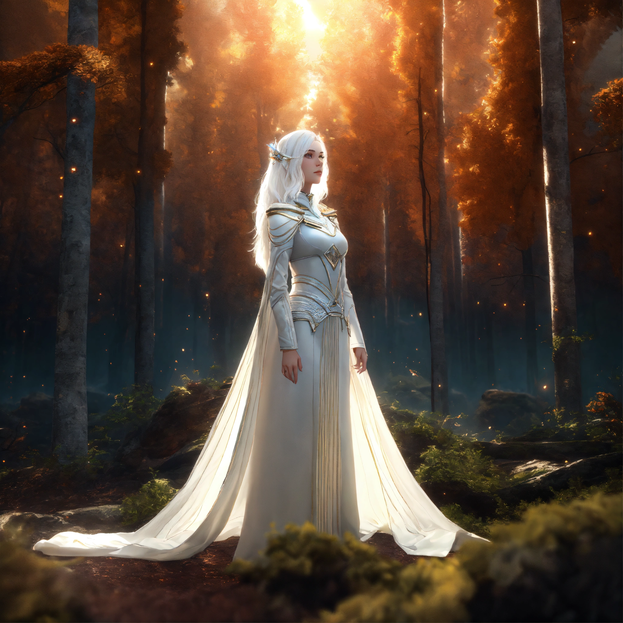 Young woman queen white hair all body, forest nebula, sun backgound, cinema 4d scifi 3d scene of a showing, hyper realism, realistic shading, realistic render, detailed textures, photorealistic, wide shot, landscape