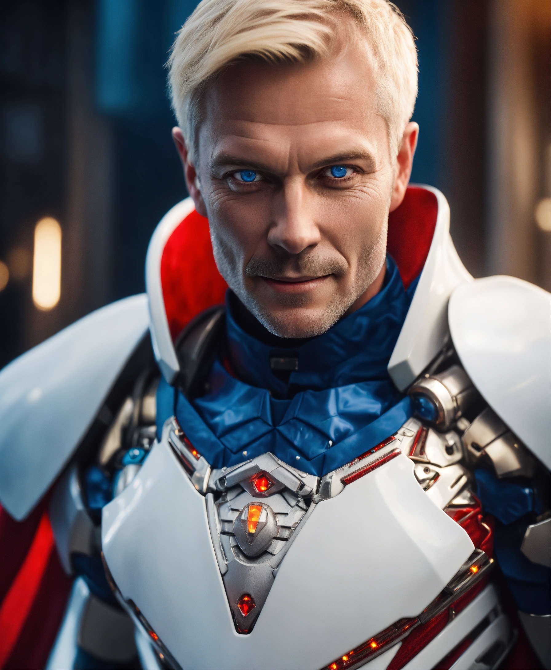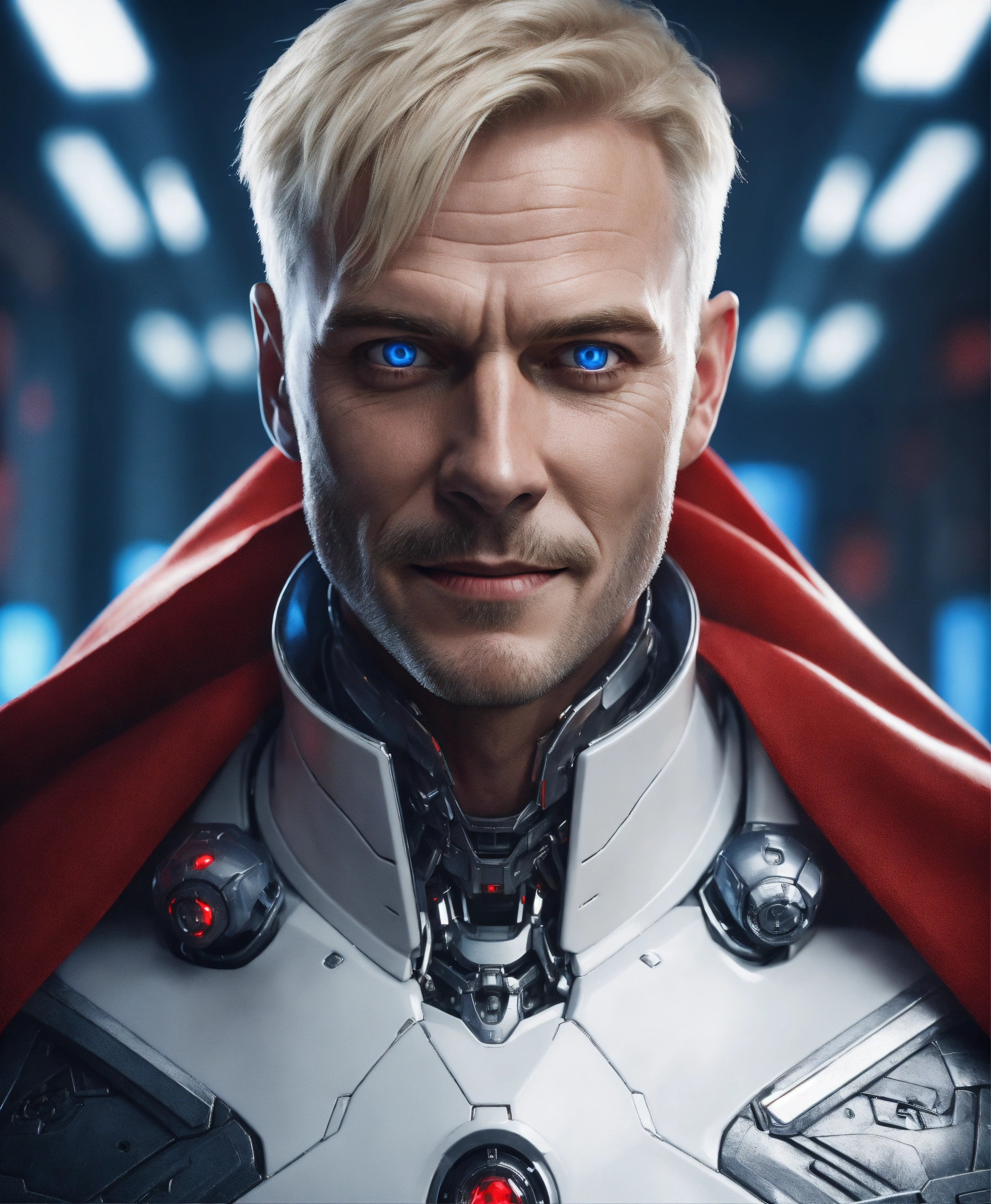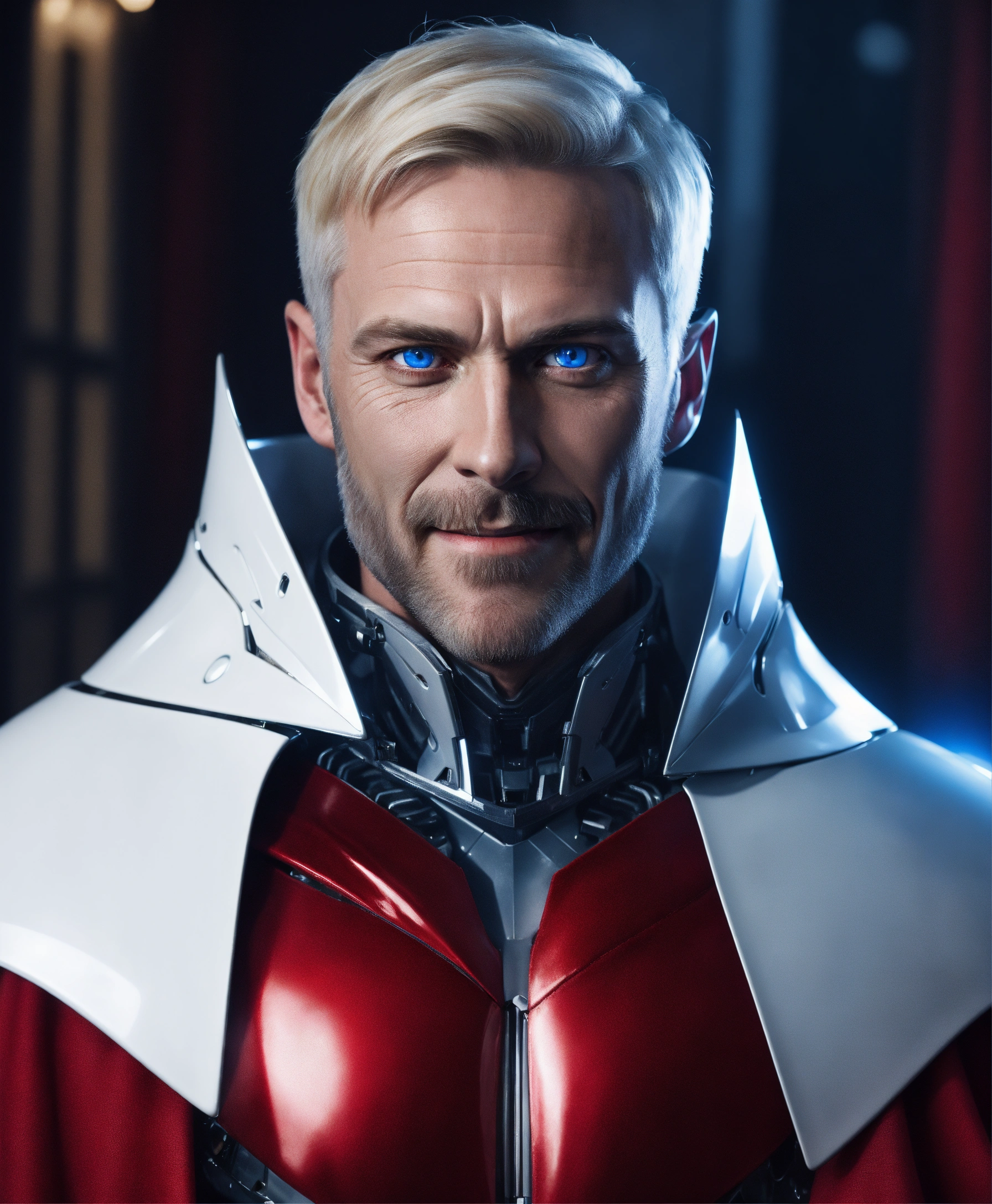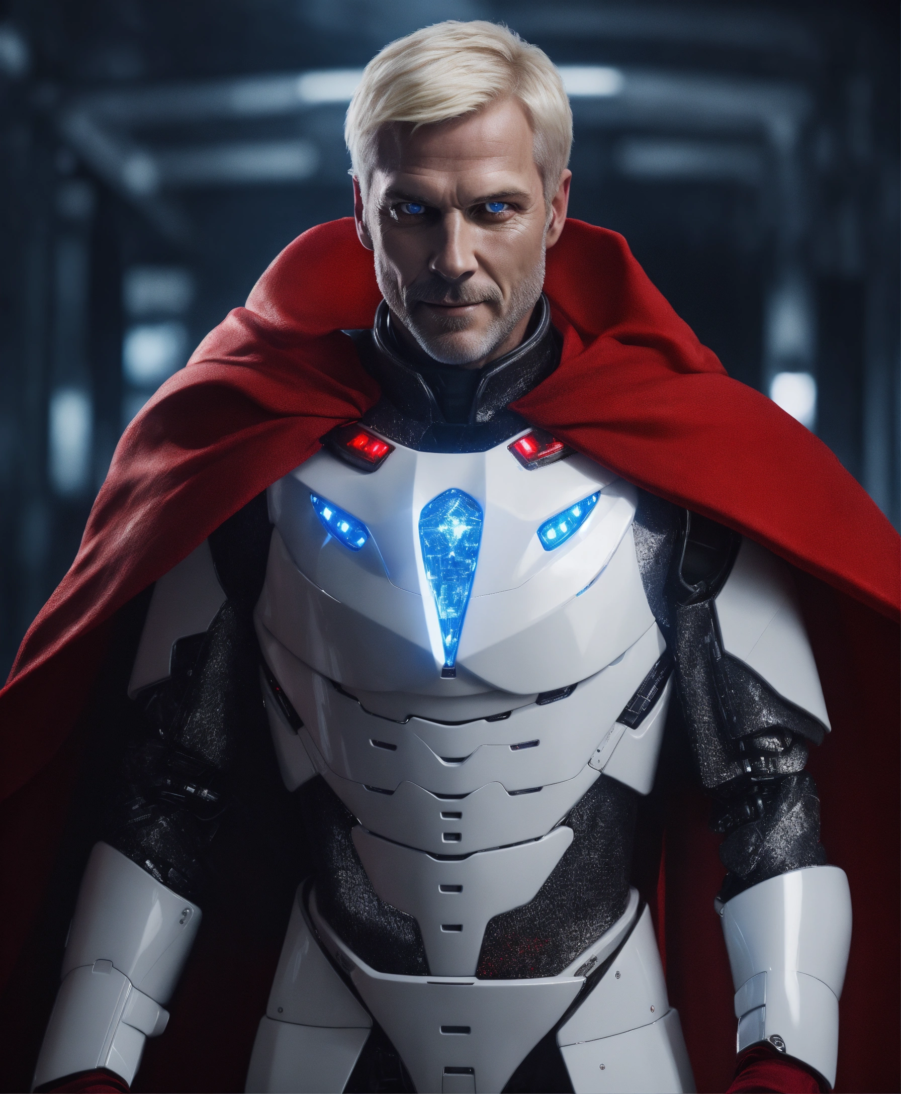 A realistic photo of psychopath 45 years old scary man with deep blue eyes, intimidating traits, creepy psycho smile, slim face, sharp nose, white blonde well groomed short hair, wearing a white robotic armor, with a red cape, dramatic ilumination, hyperrealistic, hyperdetailed, 8 k