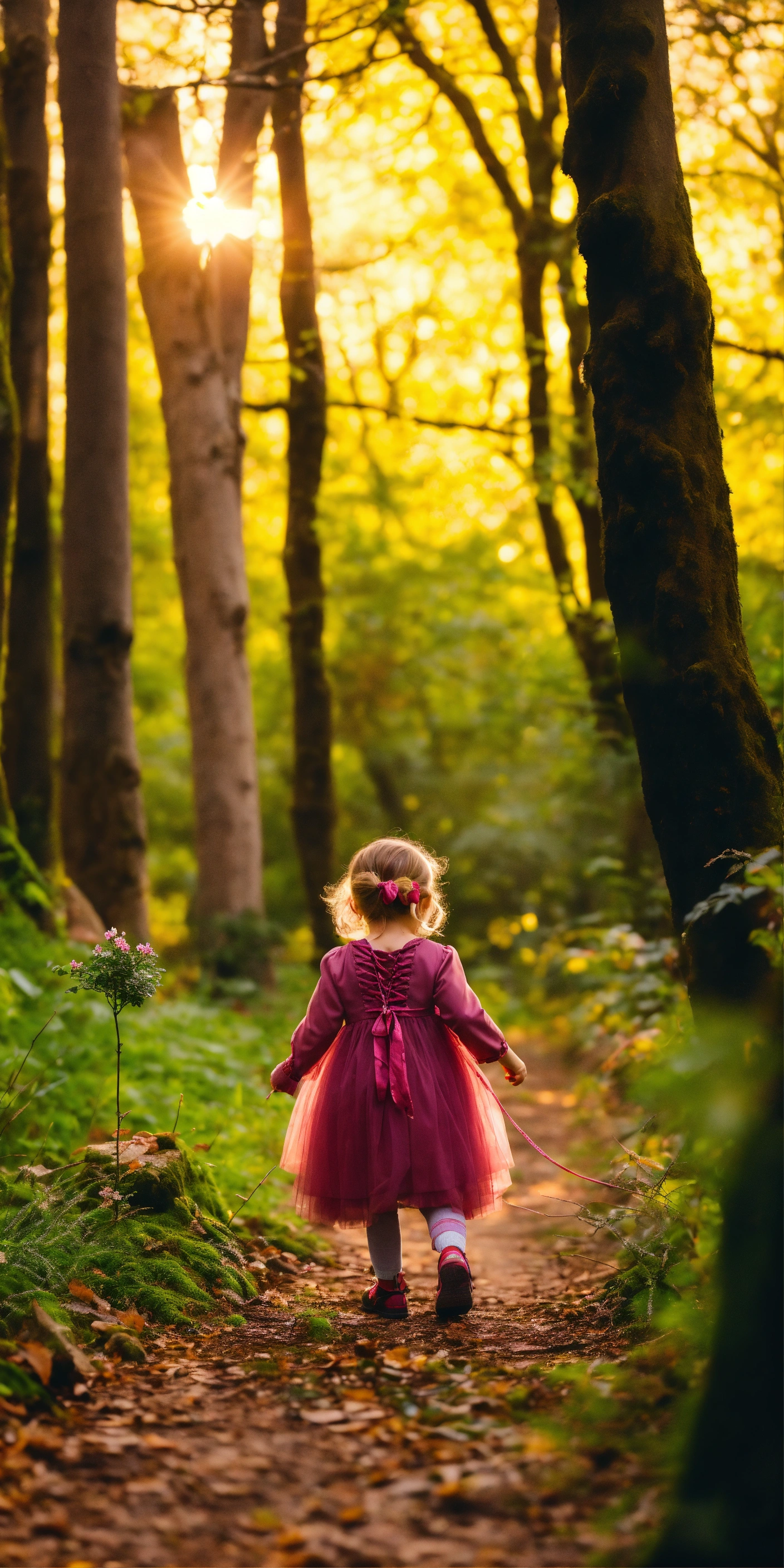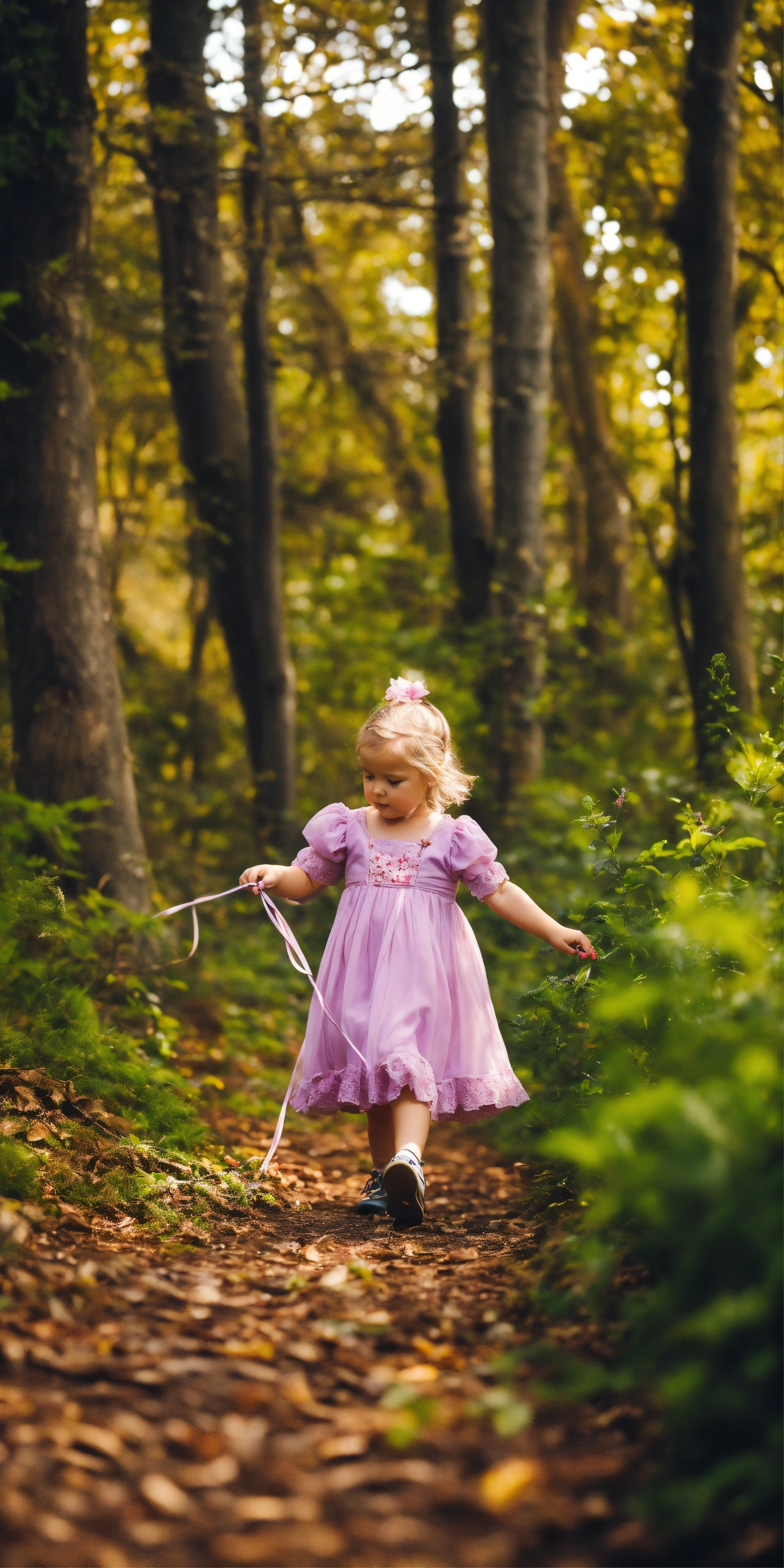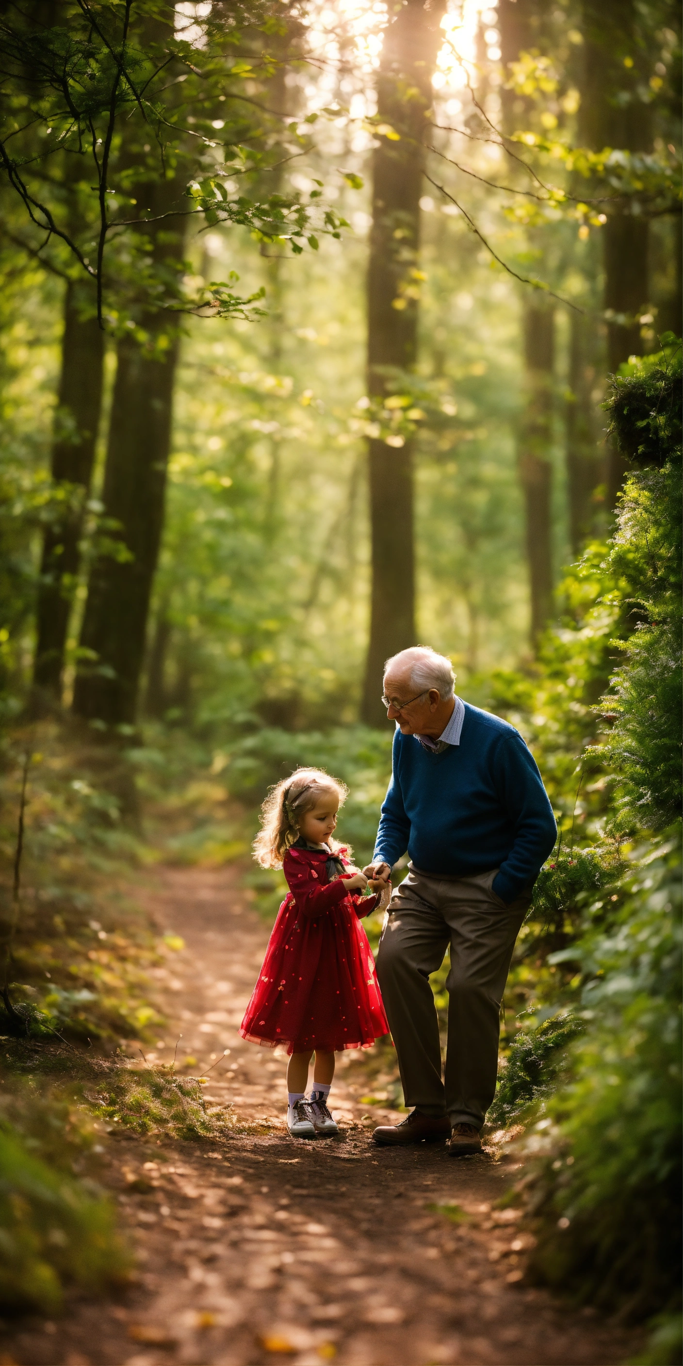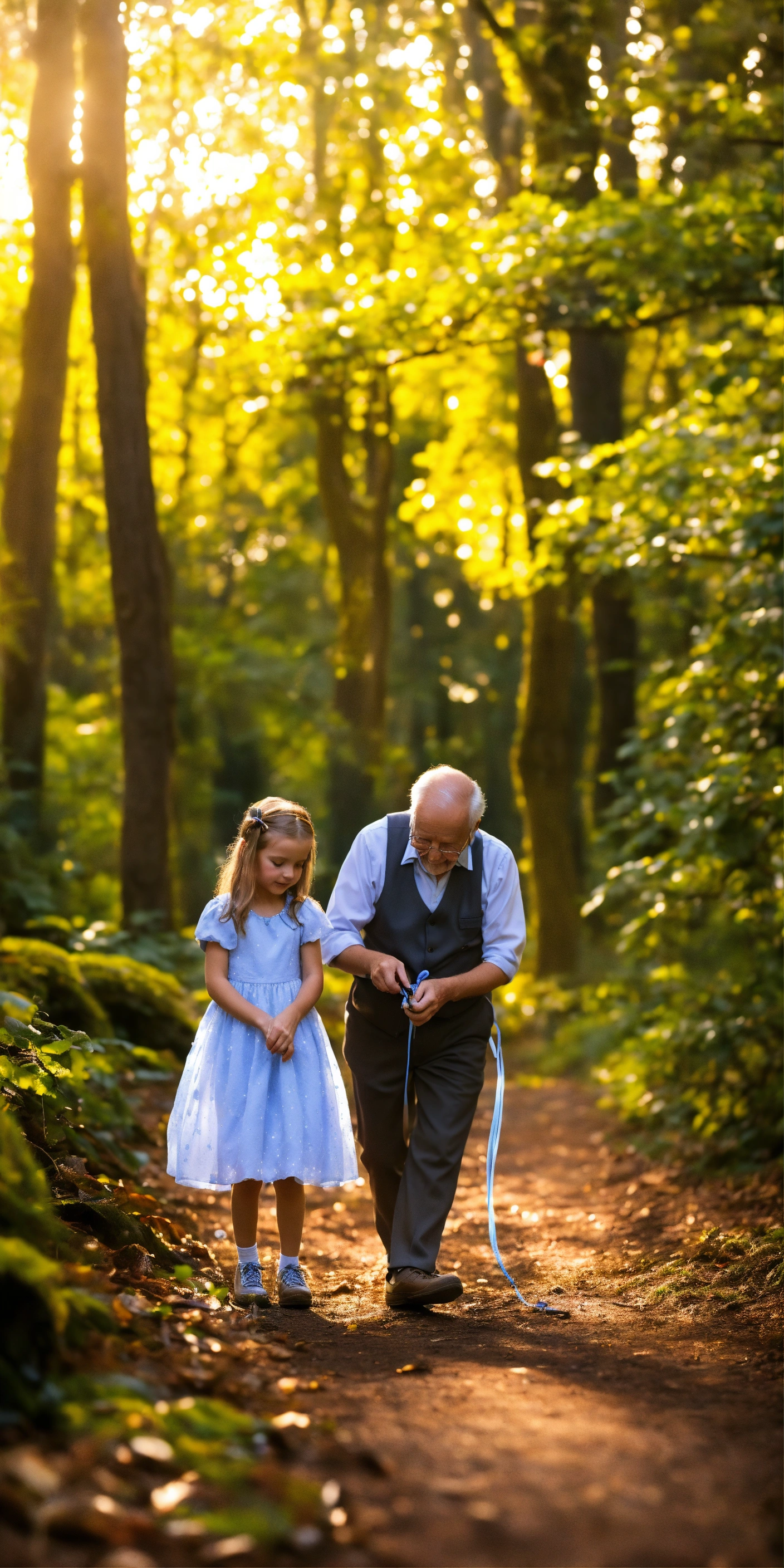 Small girl in fancy frock exploring the mystical woods. loving grandad, teaching her how to tie shoelaces
