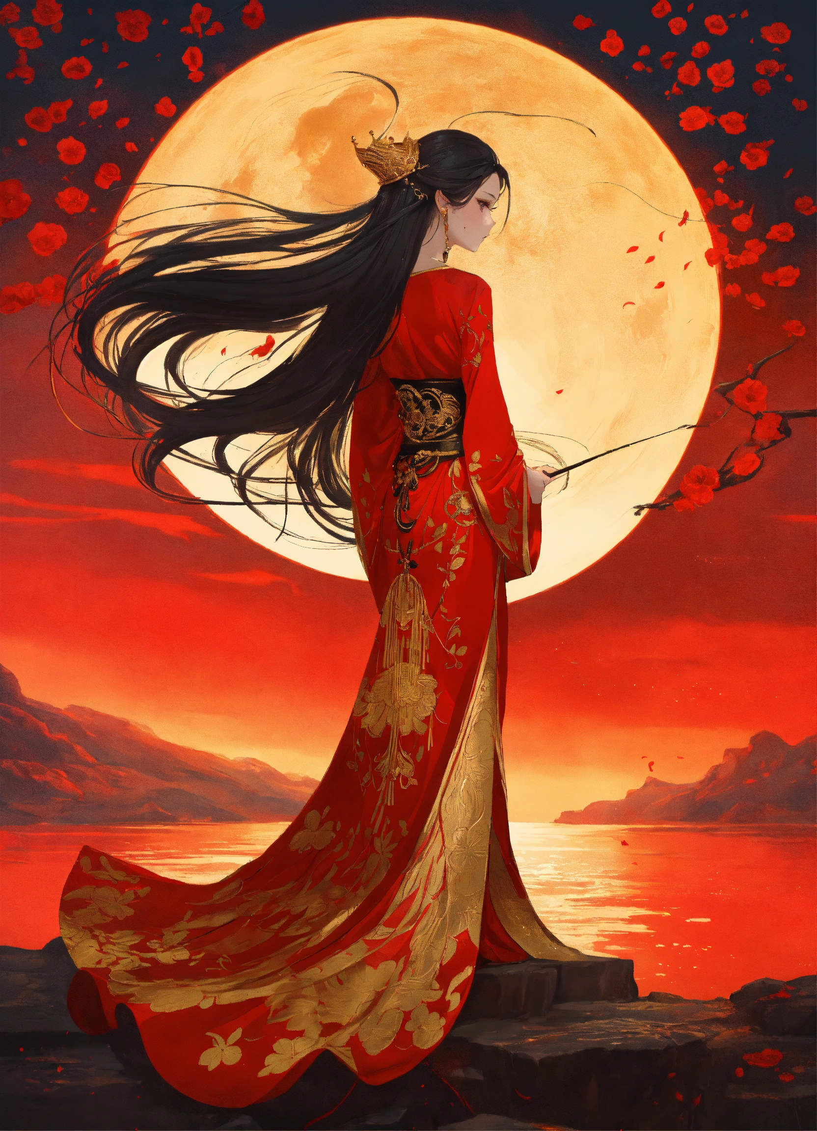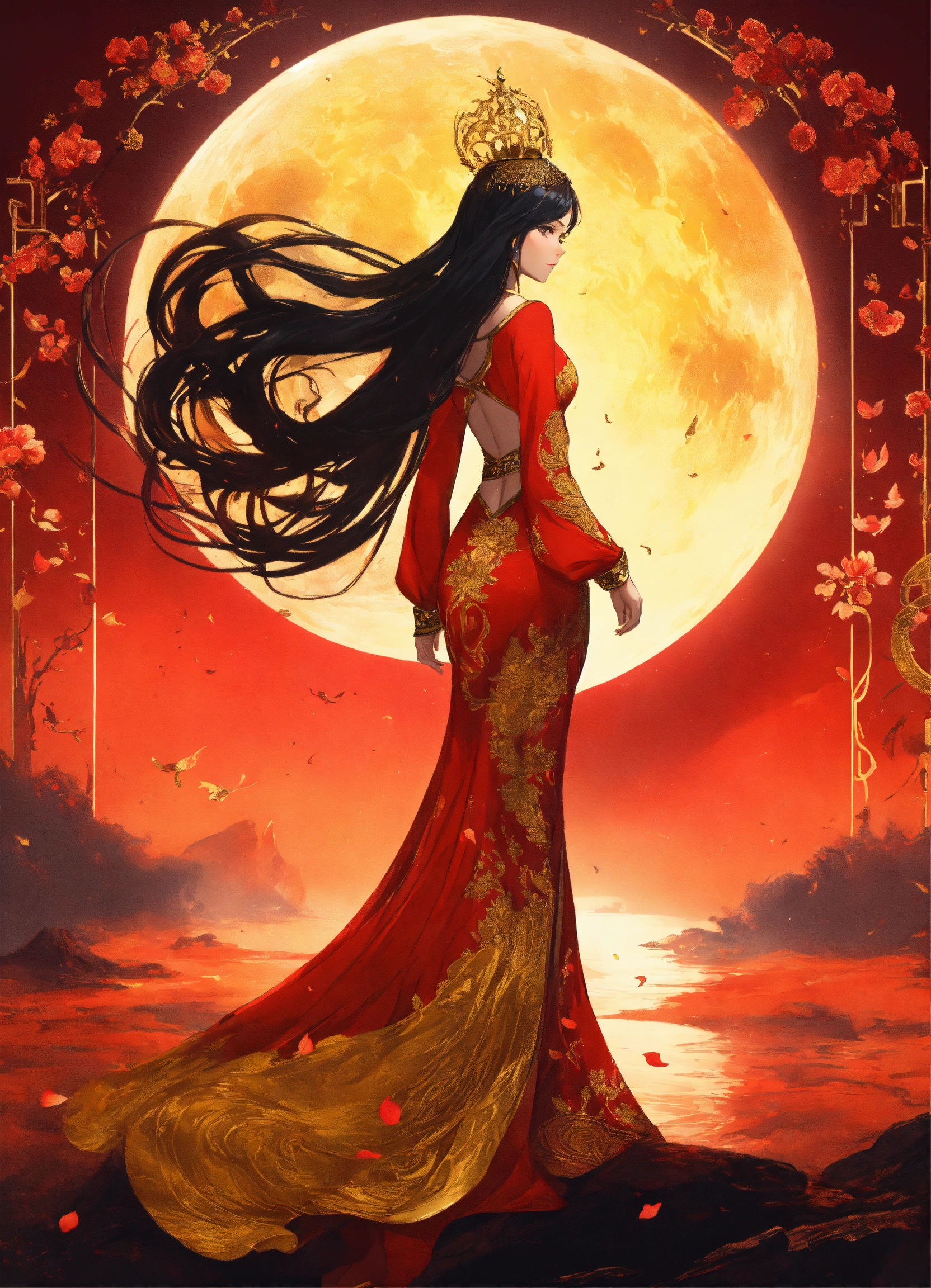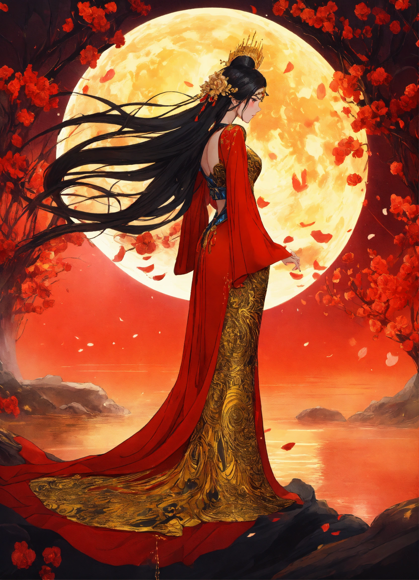 Black and gold ink, the full body back of a mysterious asian beautiful goddess in a gold-decorated red full-length dress dress against a large full moon, playing the harp, a goddess with her long hair down her long hair. with a golden crown on one's head, no low-cut dress. fluttering with red petals night. m.c.p.a. ink art, fantasy landscape, ultra-precise eyes, line art, black background, ultra-precise art, detail flamboyant face, natural skin, water splash, color splash art, black ink, liquid melting, dreamy, shining, glamour, shadow, oil on canvas, brush strokes, smooth, ultra high definition, 8k, unreal engine 5, ultra sharp focus, complex artwork masterpiece, ominous, golden ratio, very detailed, vibrant, production cinematic character lender, ultra high definition model