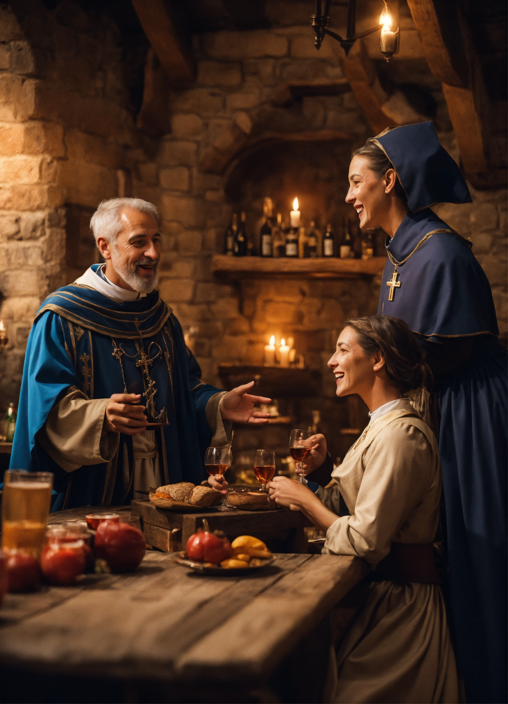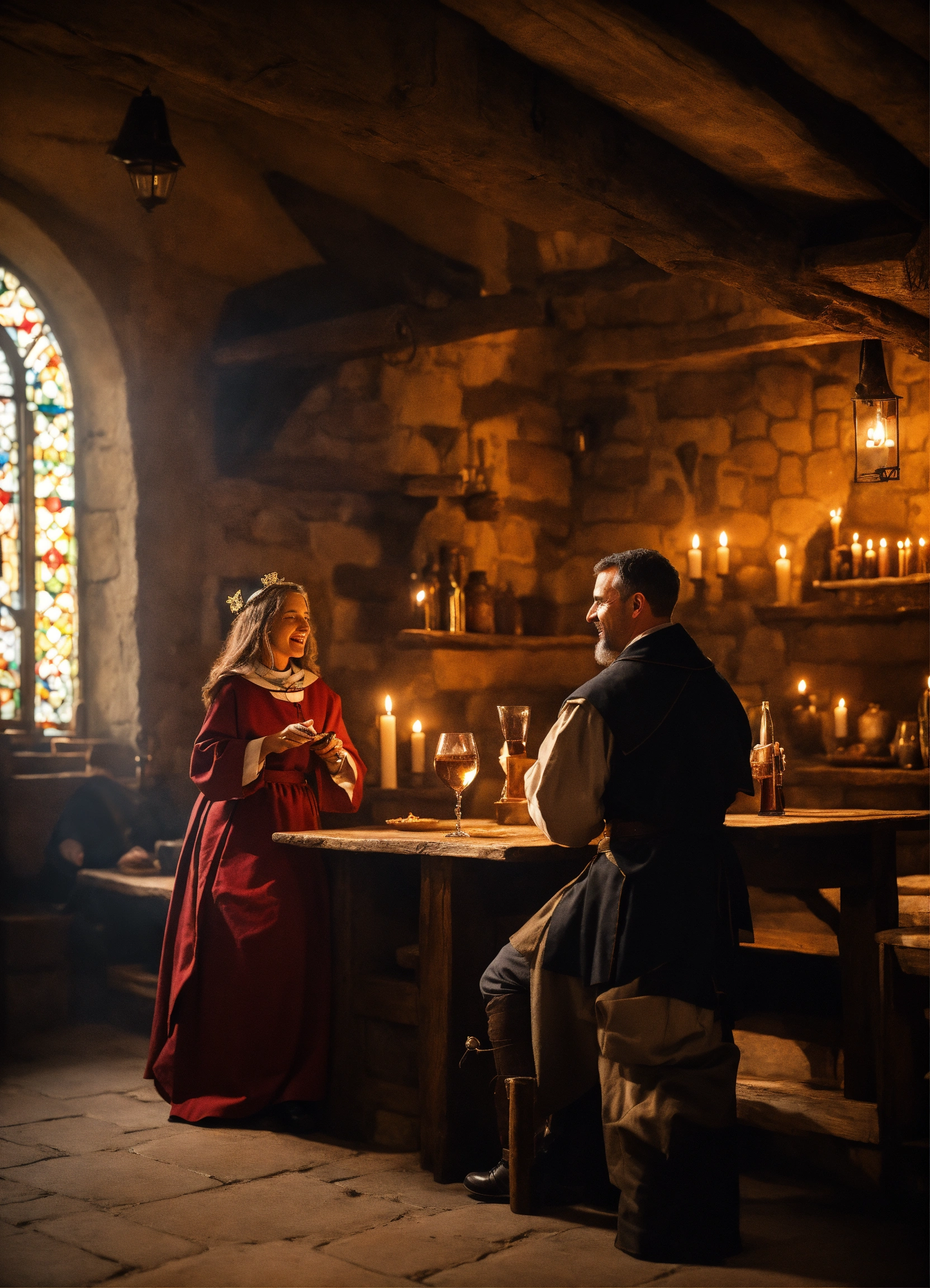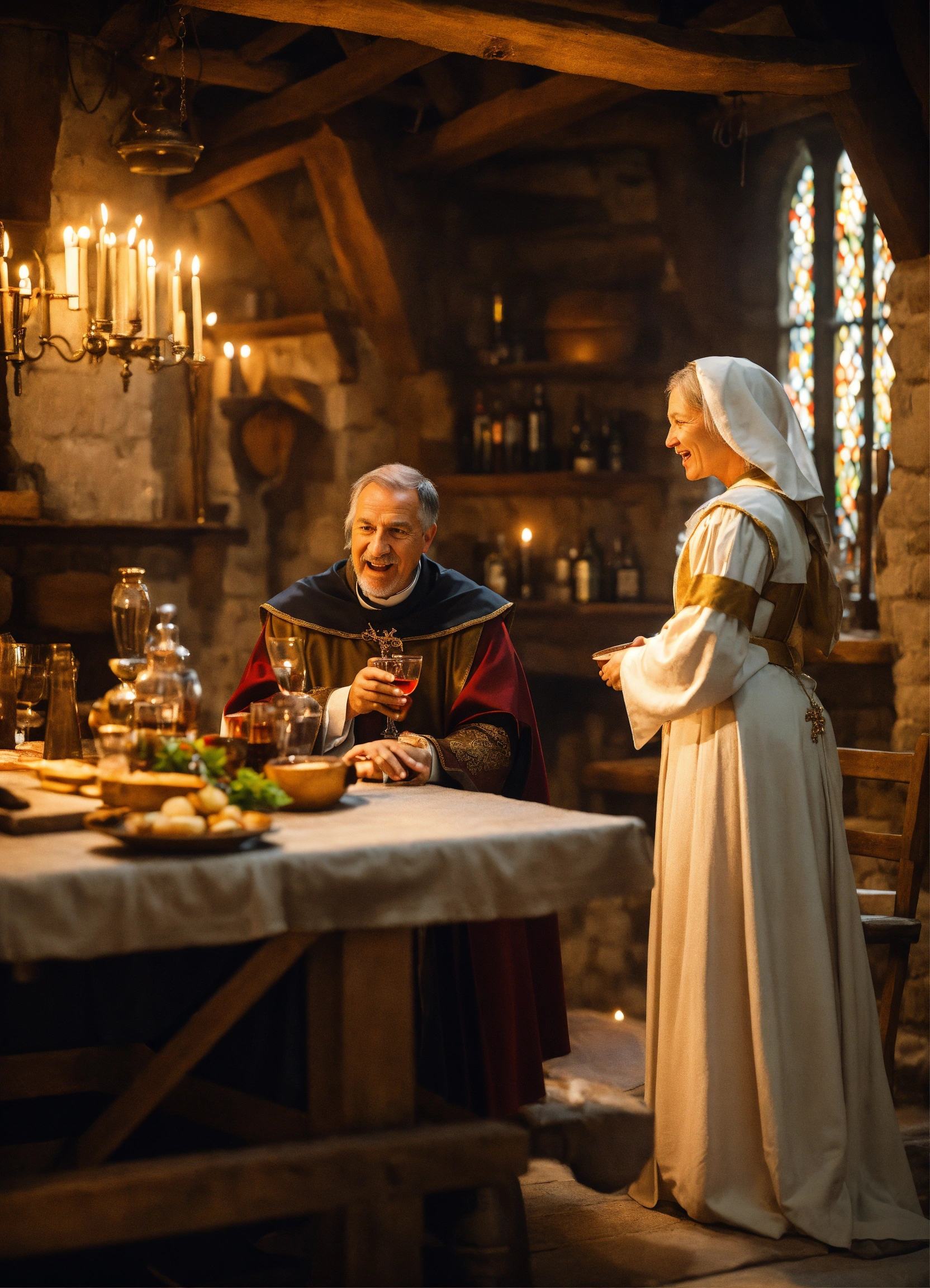 priest talking to a woman in medieval tavern.