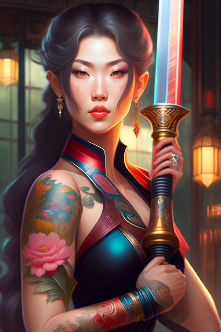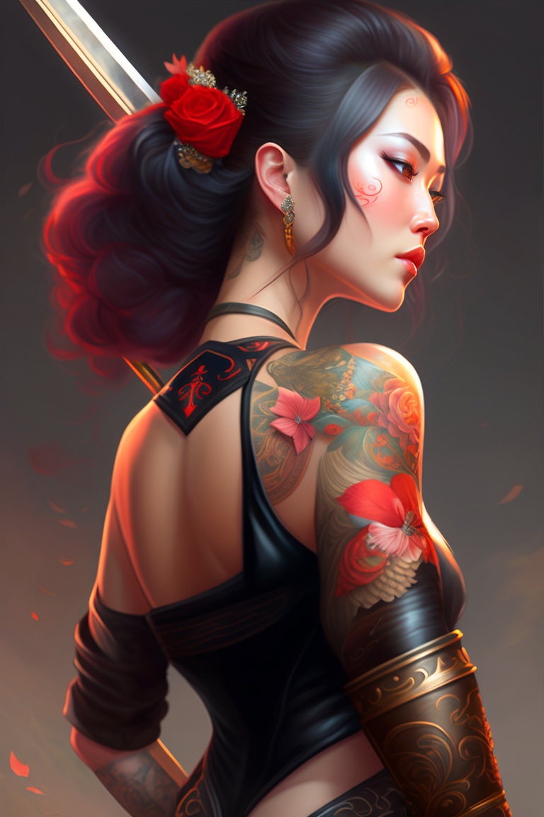 Tattooed yakuza girl holding a japanese sword, intricate, elegant, highly detailed, digital painting, artstation, concept art, smooth, sharp focus, illustration, art by artgerm and greg rutkowski and alphonse mucha and william - adolphe bouguereau
