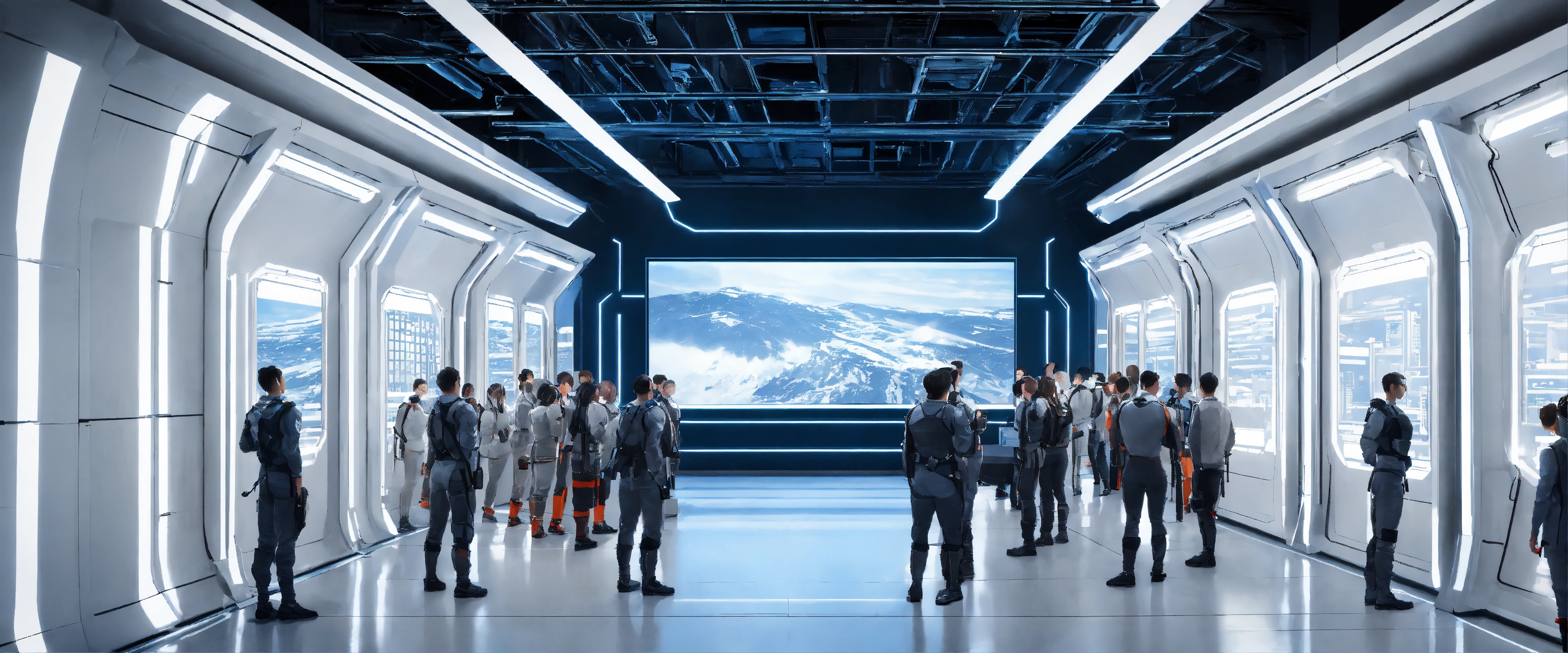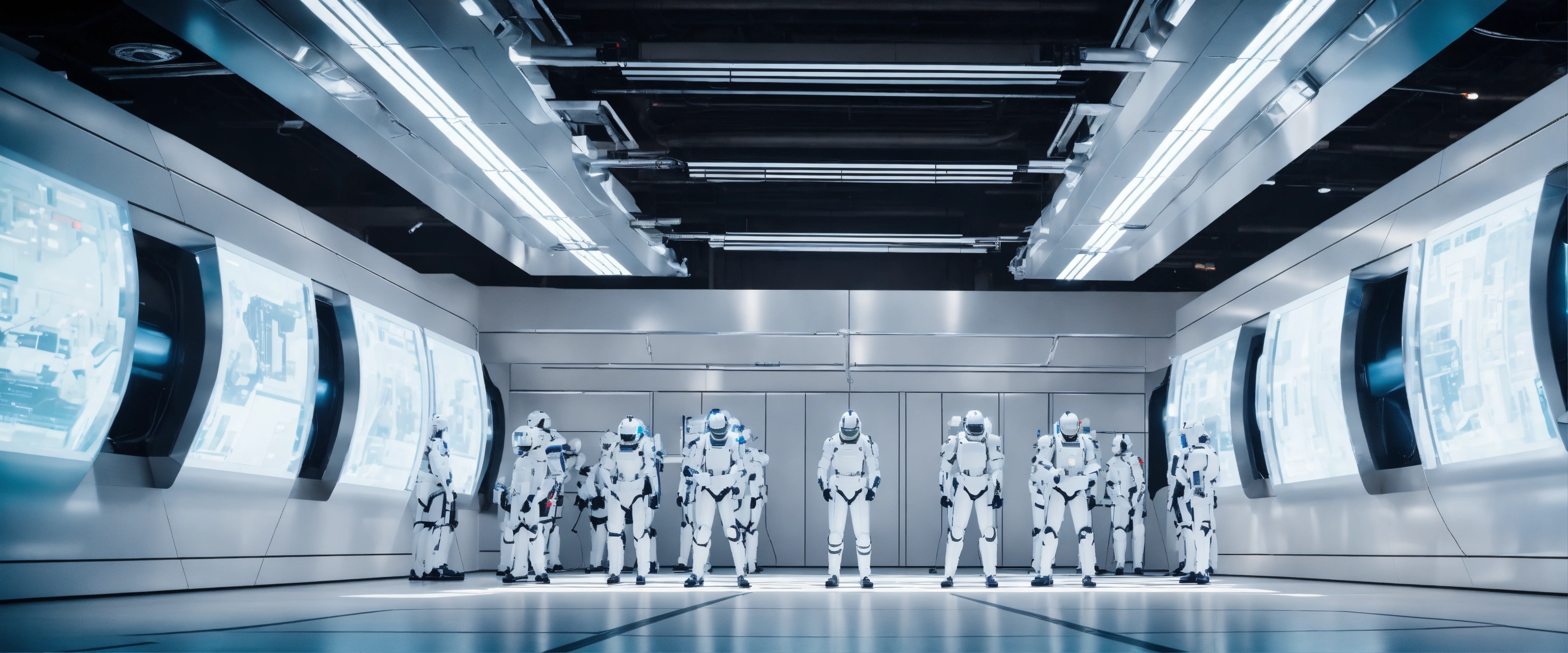 A realistic photo of a crowded, colossal, cubic, futuristic training room with white metal walls, white illumination, sci-fi, no windows, hyperrealistic, hyperdetailed, 8k