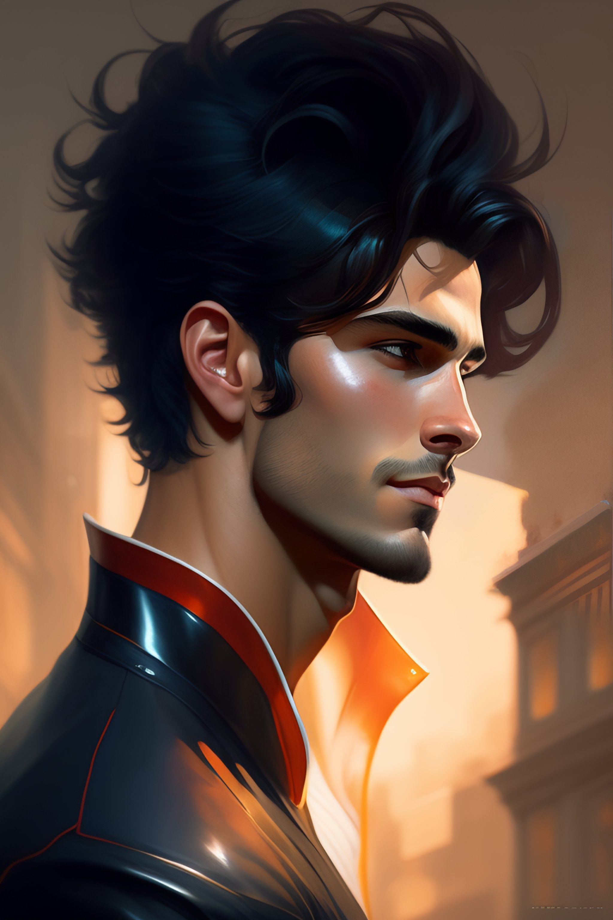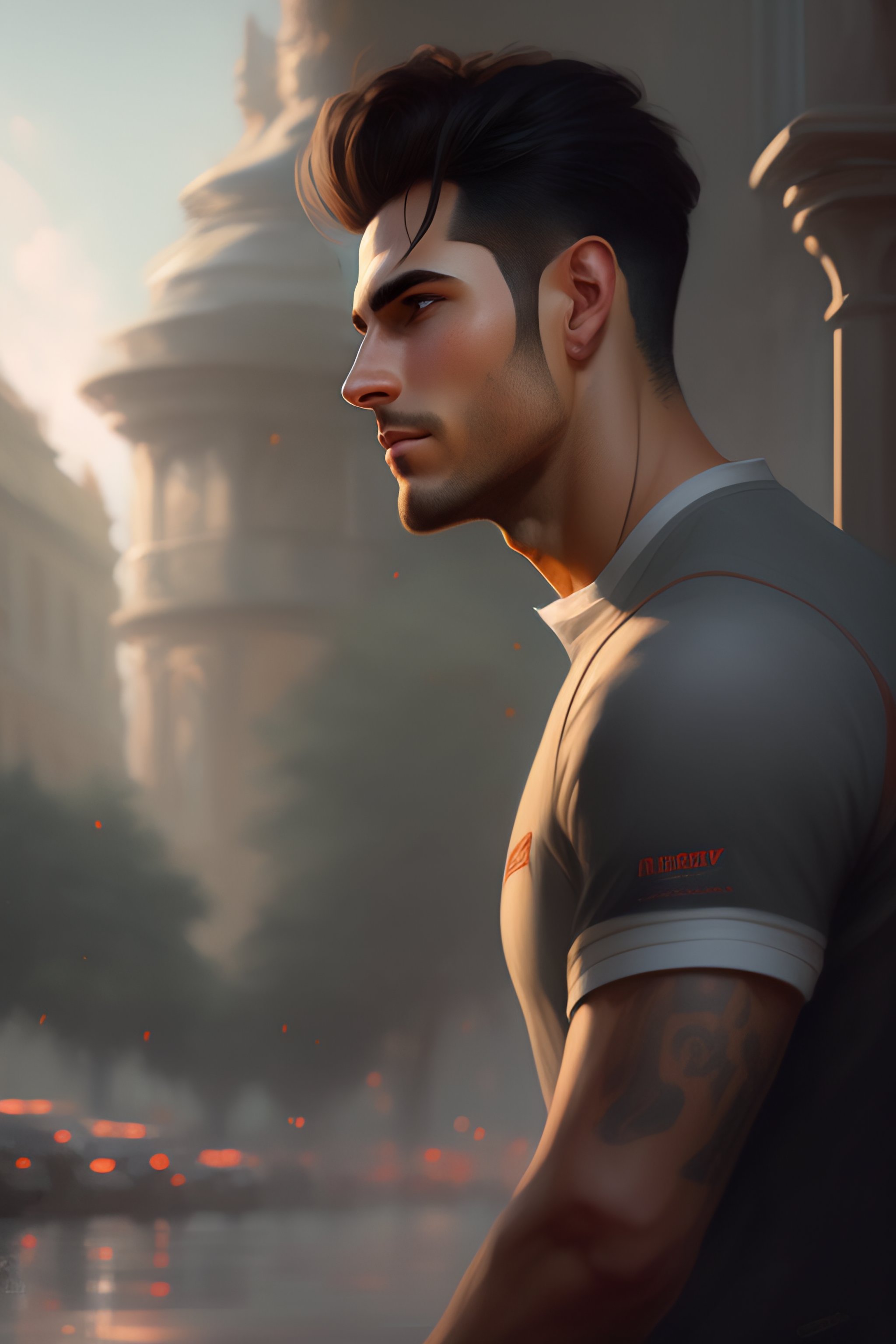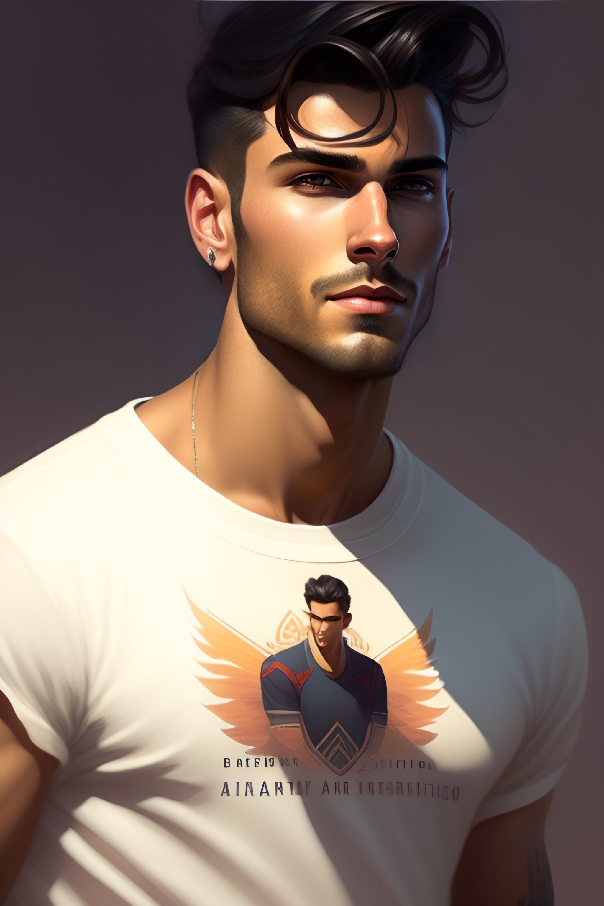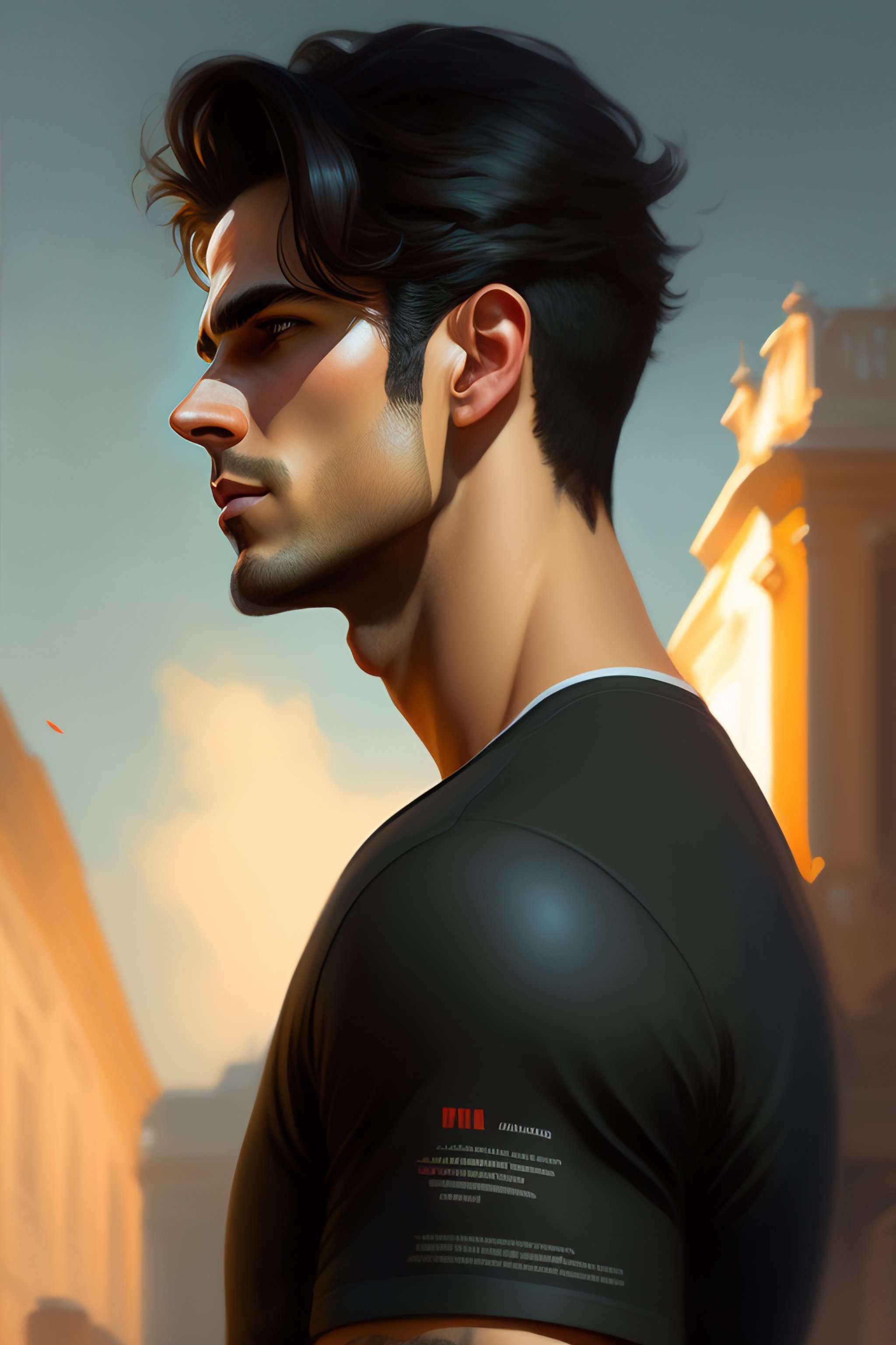 Handsome young guy, dark hair, profile view, wearing a t-shirt, excited, high detail, popular artstation digital painting, concept art, sharp focus, illustration, greg rutkowski and alphonse mucha