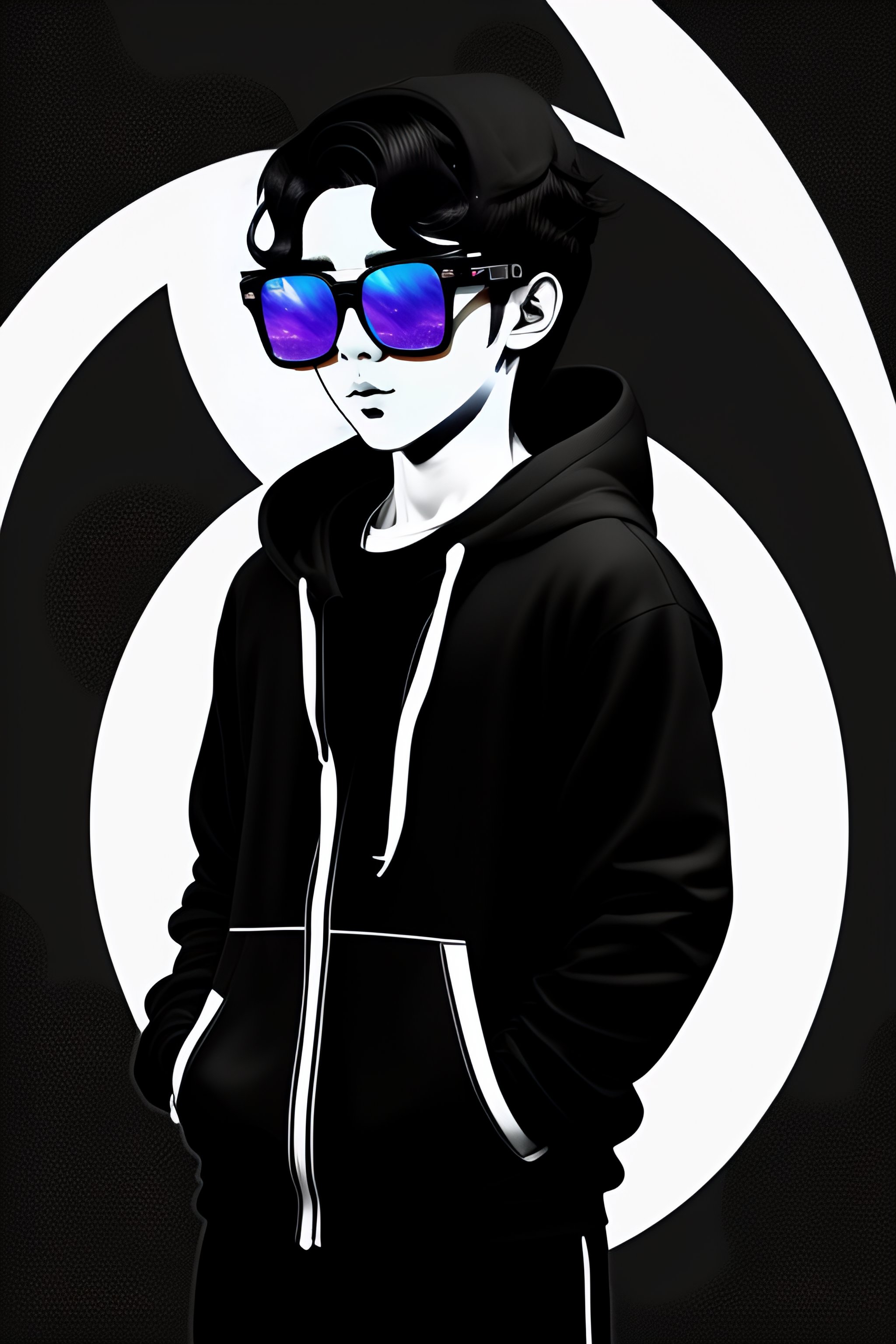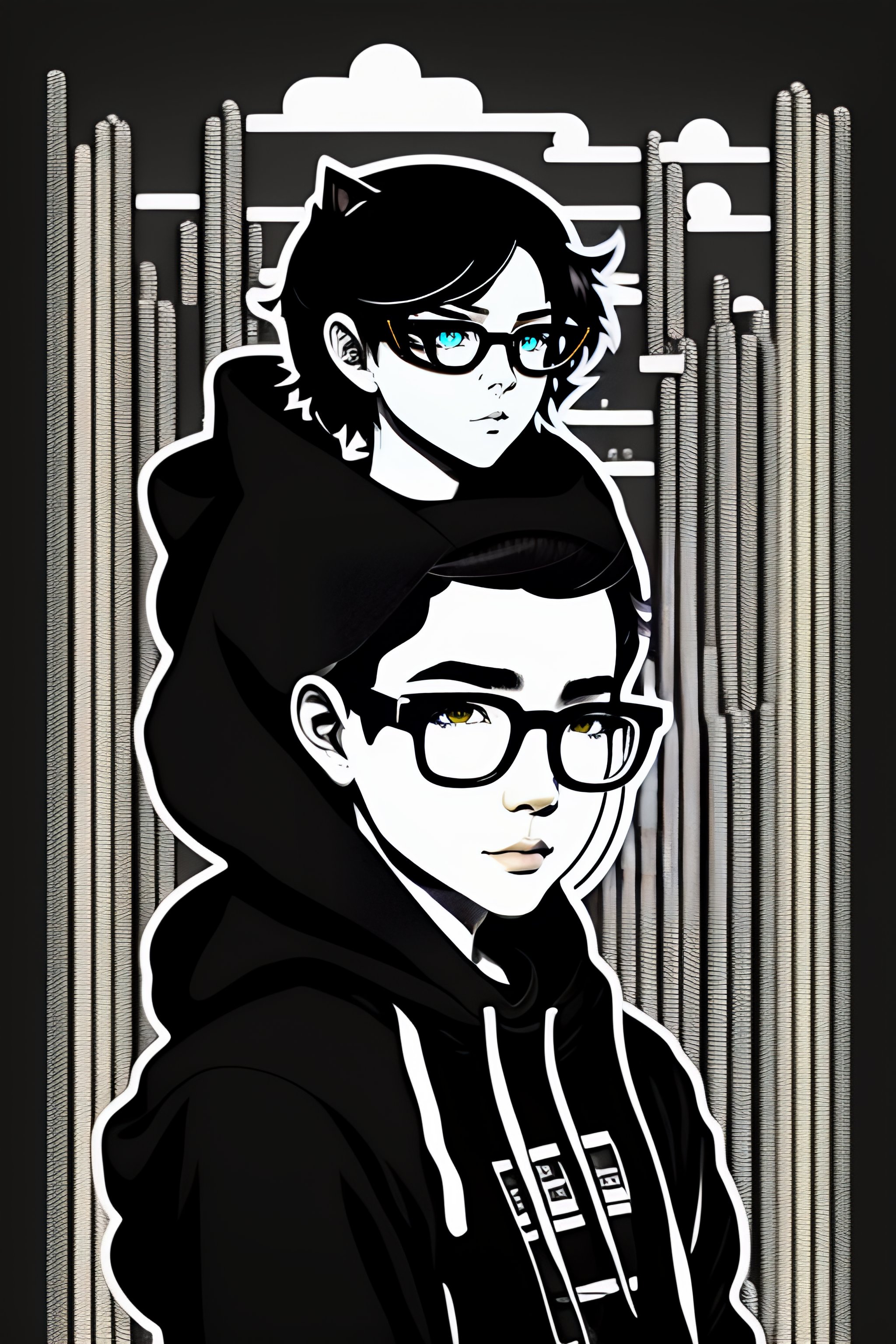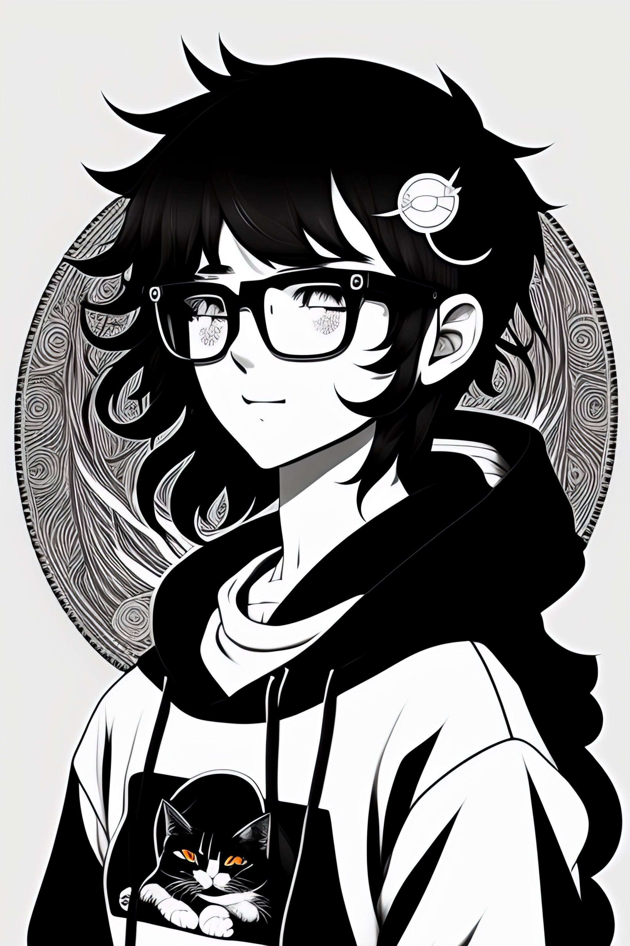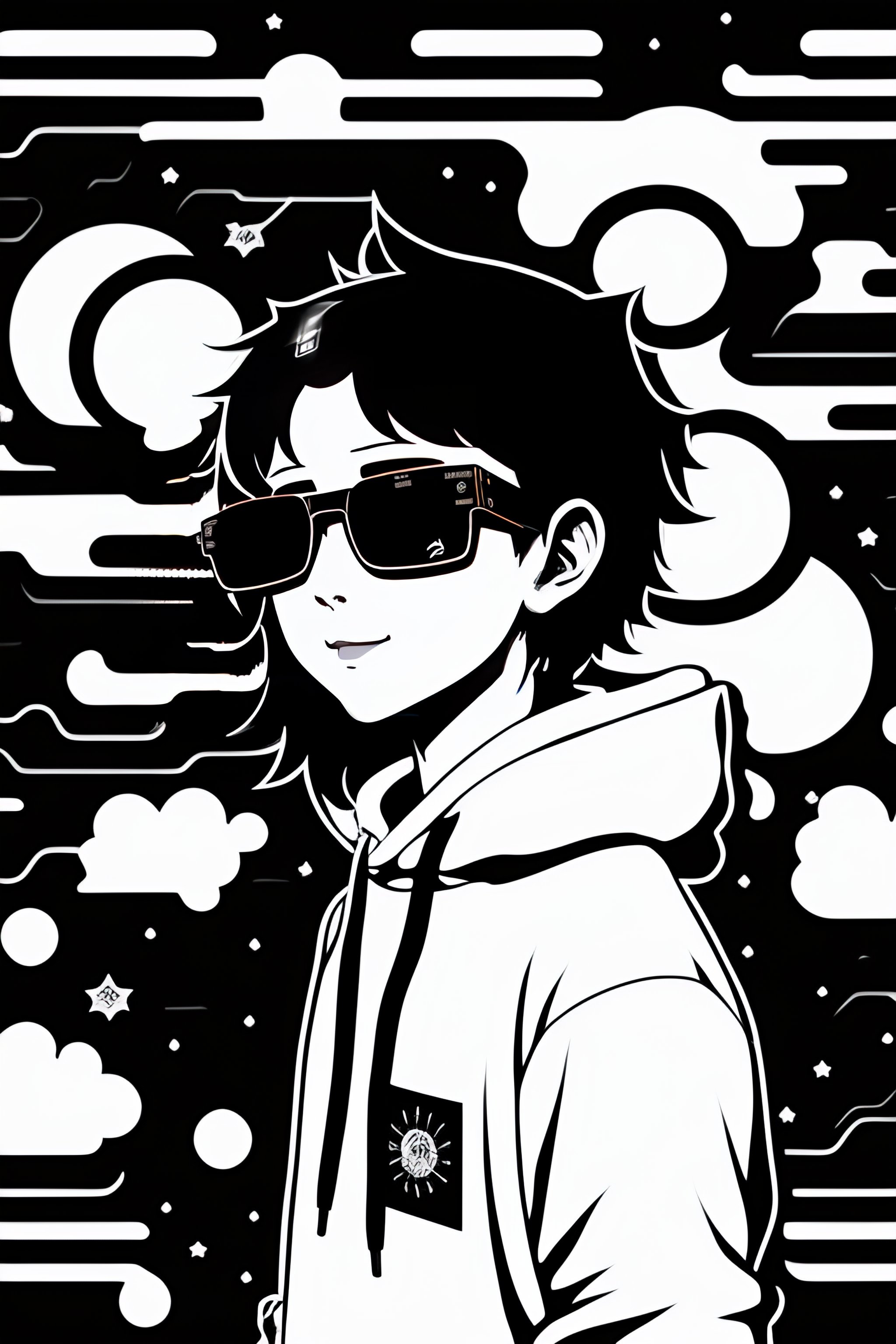 Twitch vtuber model, boy in black hoodie, long dark hair, black and white cat ears, black sun glasses, line art, retro anime, manga, black and white, pixels 8 bit, pen drawing, sticker, glitch, pattern, hypno circle, space