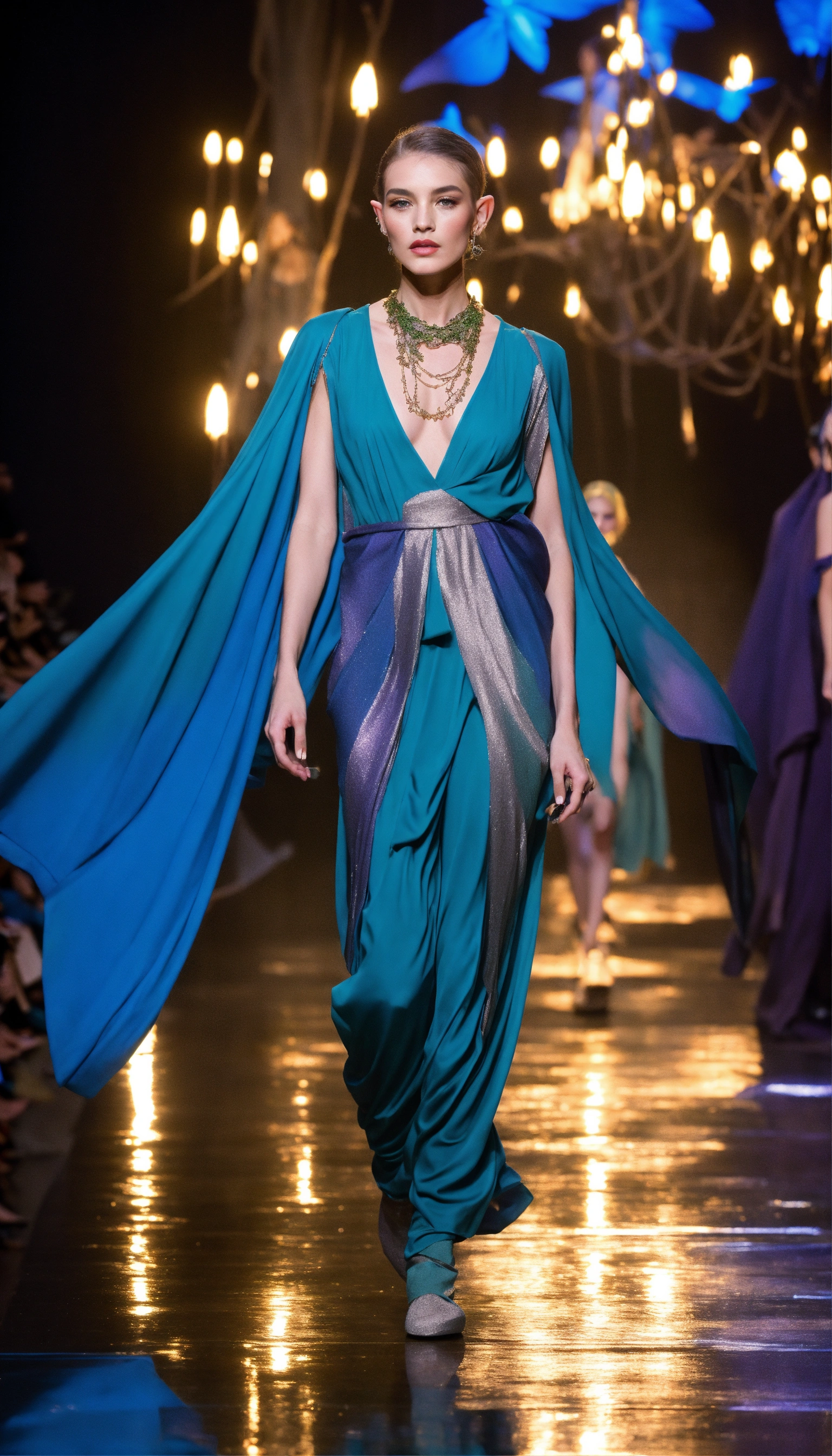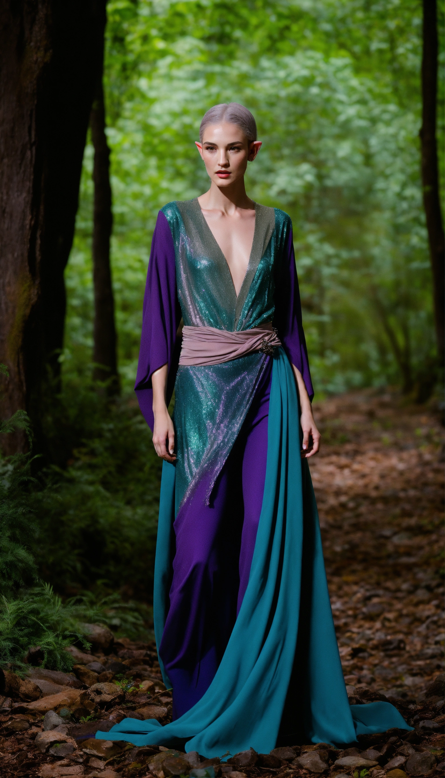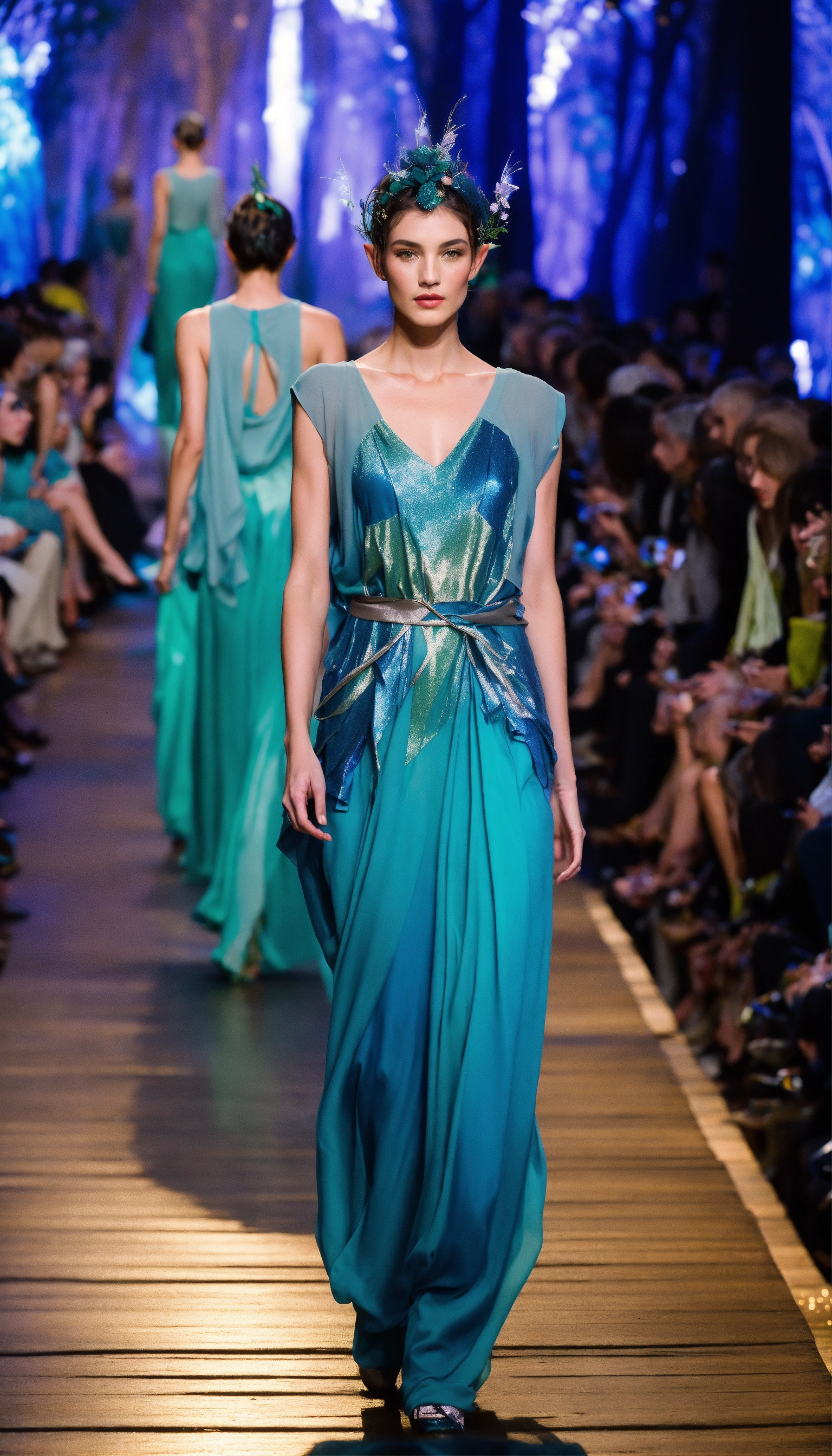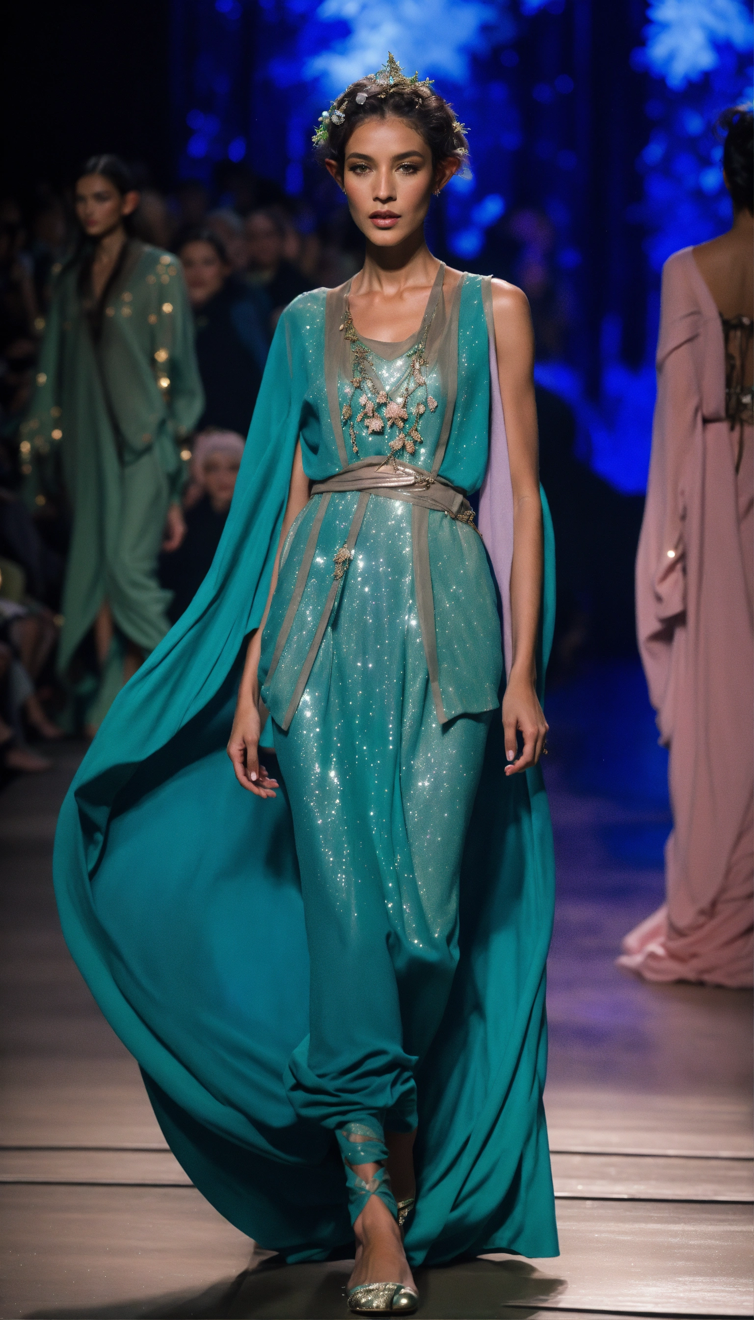 Lothlorien androgynous elves walking runway during elvin fashion week wearing dolman sleeve elvish donna karan fashion in blues, teals, purples, pinks, whites, greys, greens, beige, stone, metallics, shimmer at an enchanted forest runway at starry nighttime, fireflies