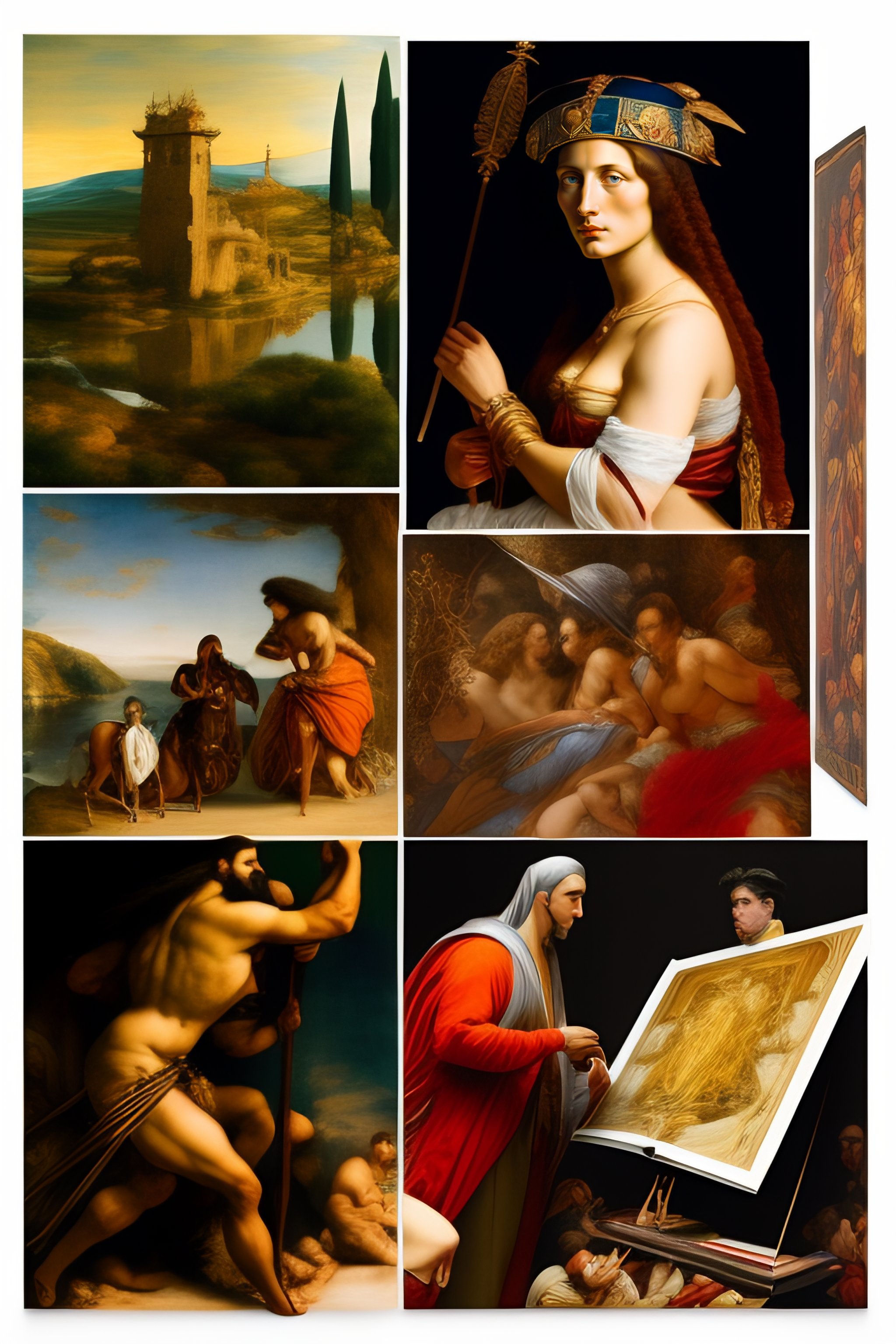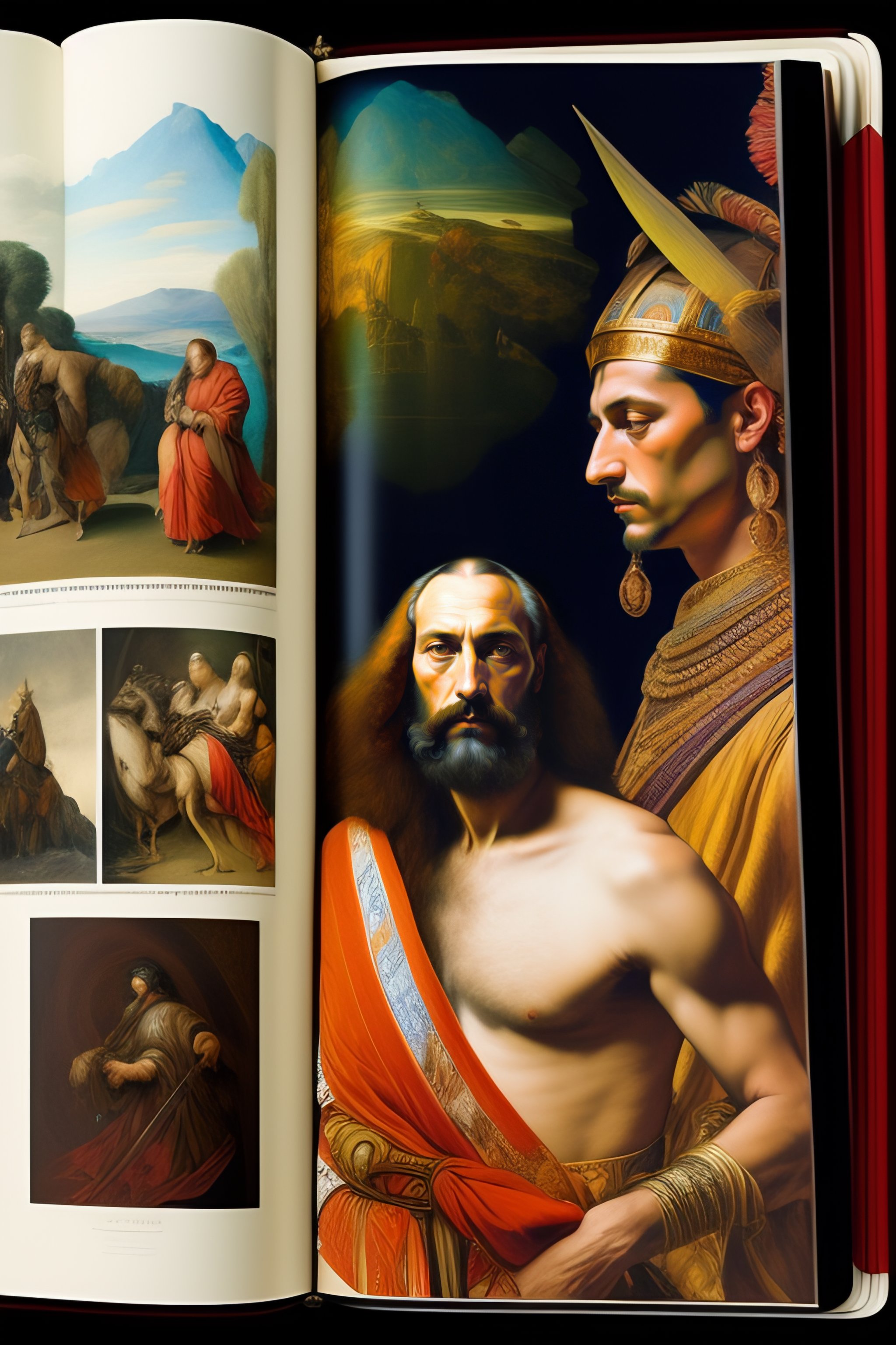 Complete large frame, complex composition, sketchbook, tiziano, renacentist with dressing draped, georges de la tour, tiepolo, van dyck, goya, chalk drawing, diego velazquez, andrea del sarto, tiepolo, carlo maratti, disney cartoon, gustave courtois, bernardino mei, gericault, bernini, cambrian, jacek malczewski, richard dadd, hieronymus bosch, draped tribal man, dominique ingres, complete open sketchbook in table
