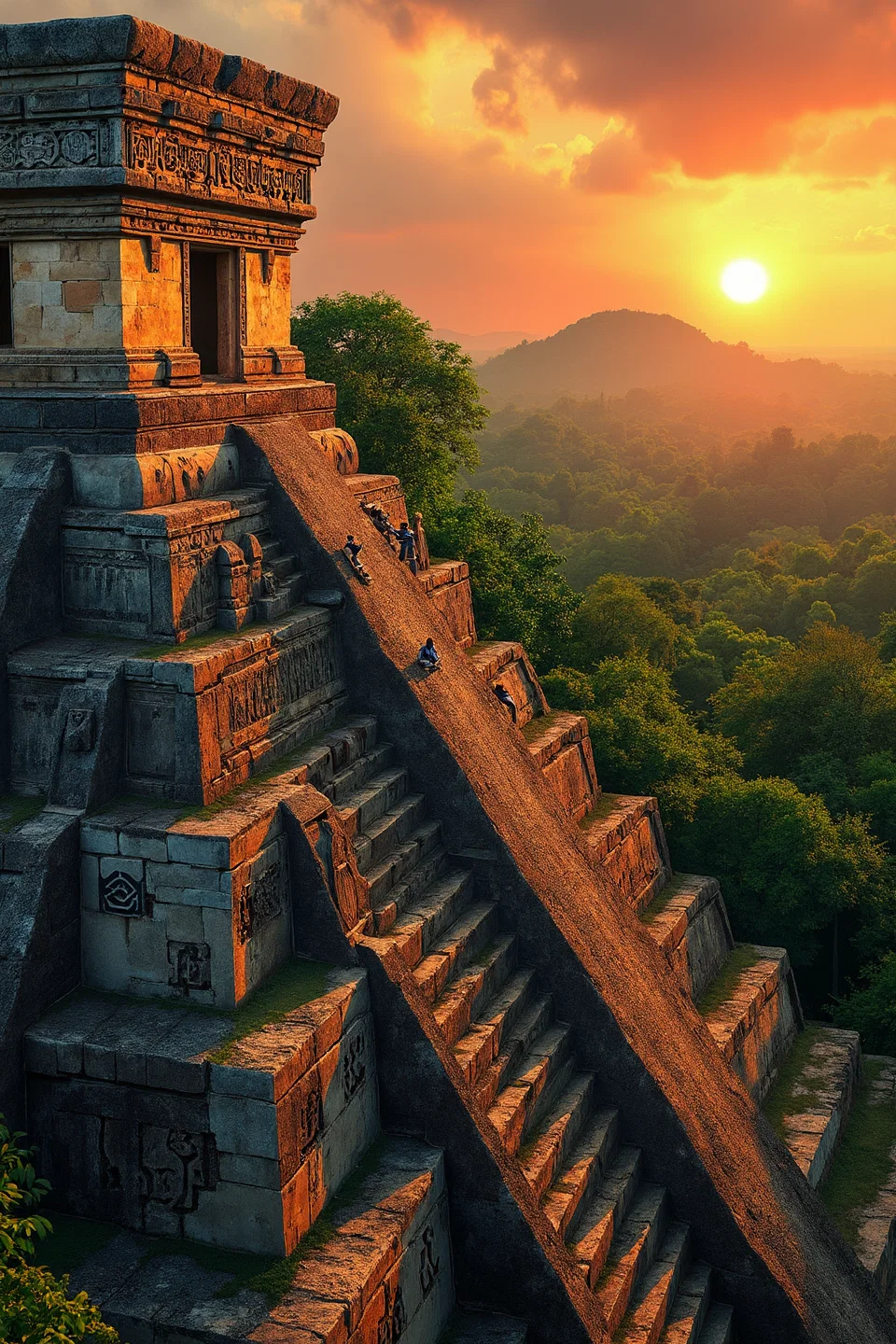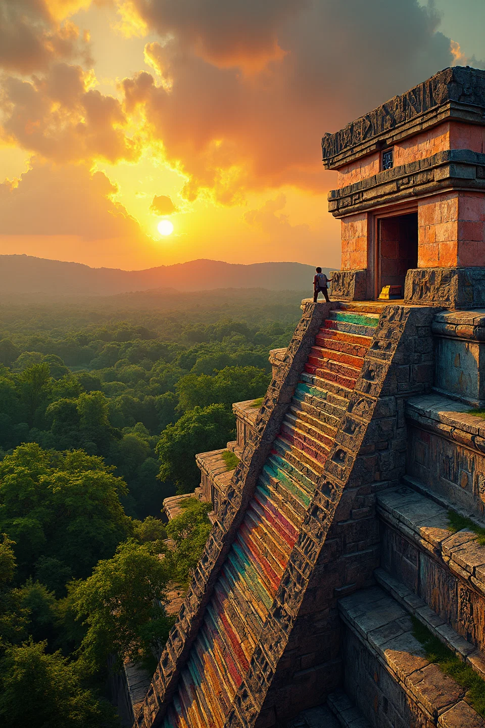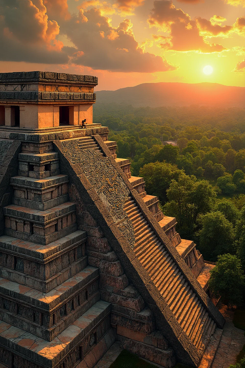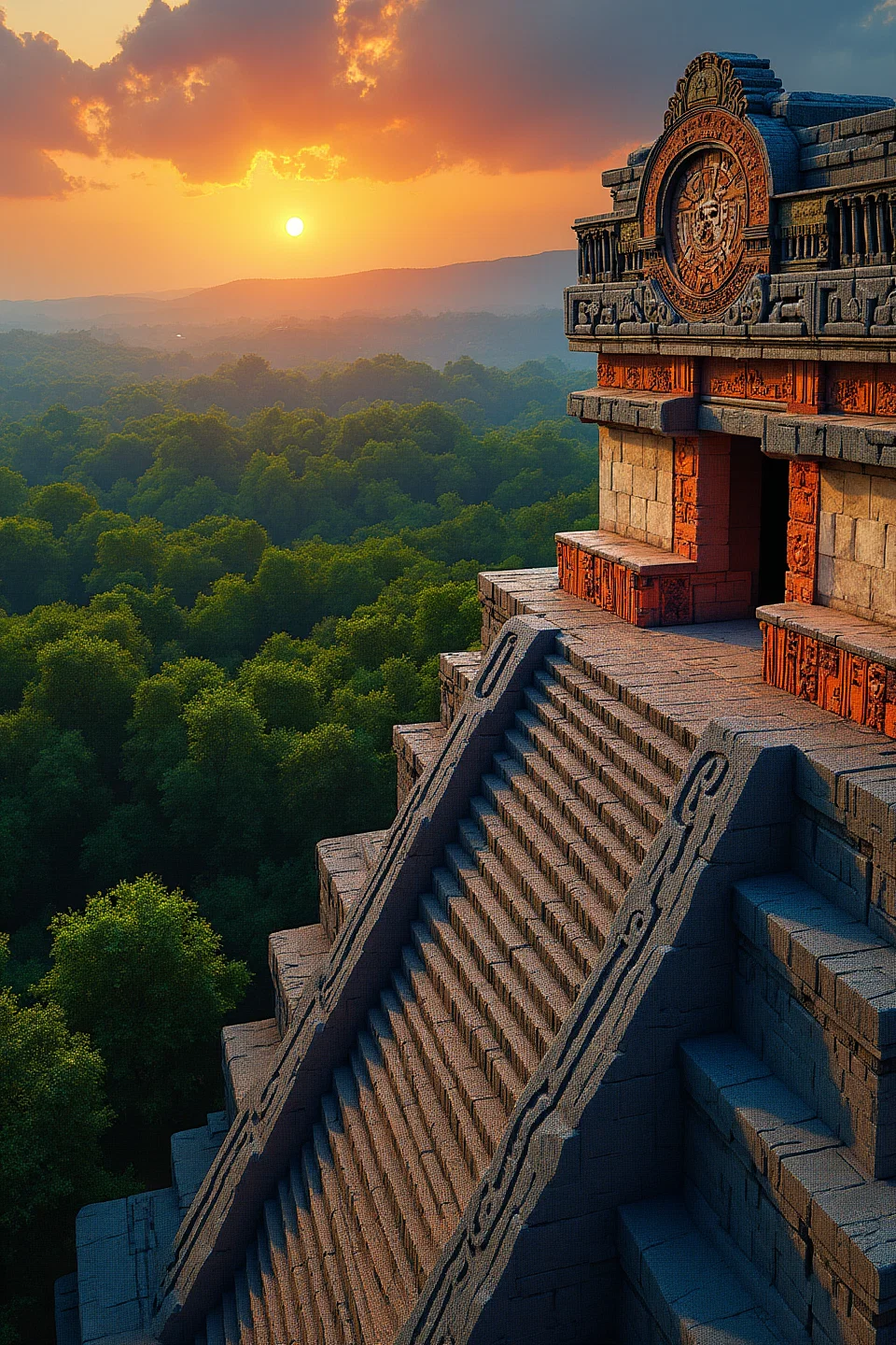 An aztec craftsman is carving the aztec calendar, on top of an aztec temple. a temple can be seen in the distance. beautiful green forest. photographic style, minimalist and very colorful.use colors #6b8d5c, #c0fea5, #ffd623, #ed461f, #b2e5df, #3a7181, #77b381, #264049, #7e6739, and #aa340e.