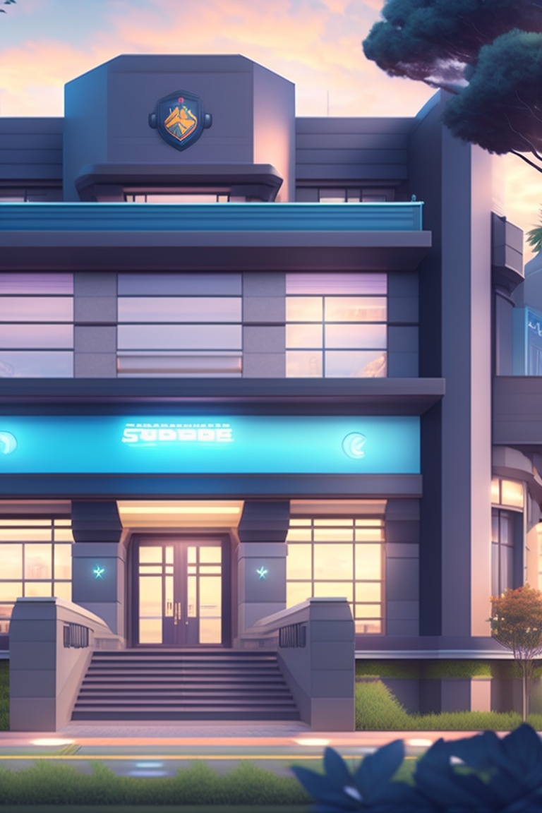 An anime high school building for superheroes, 4k, hd, detailed, front view with students with superpowers walking inside