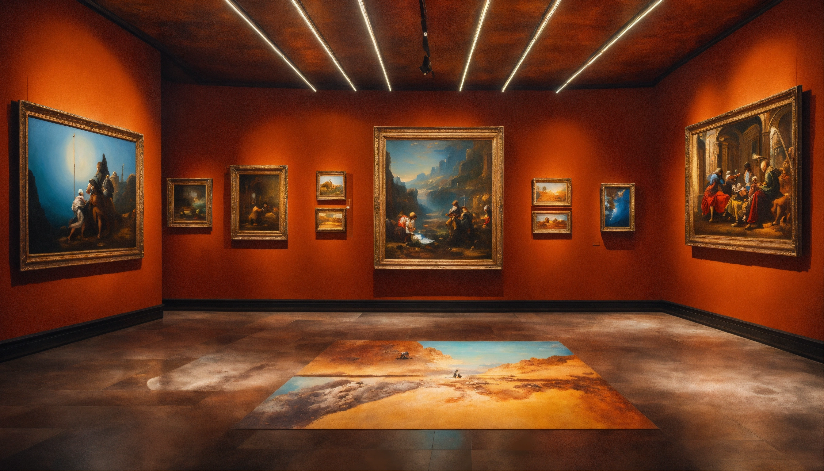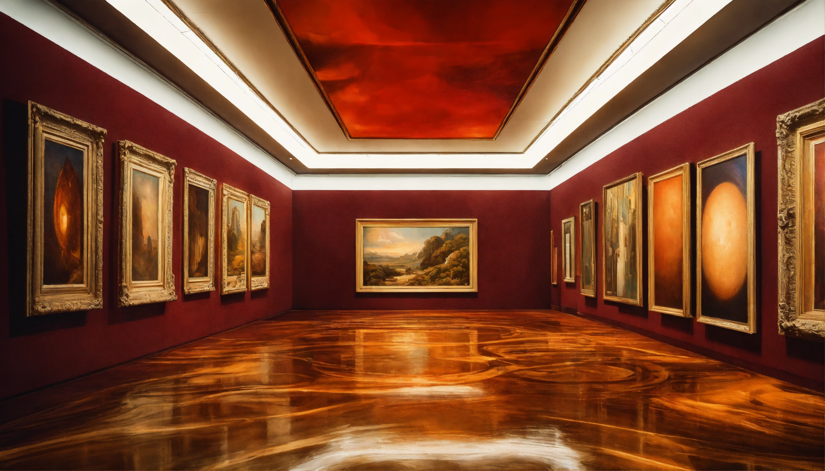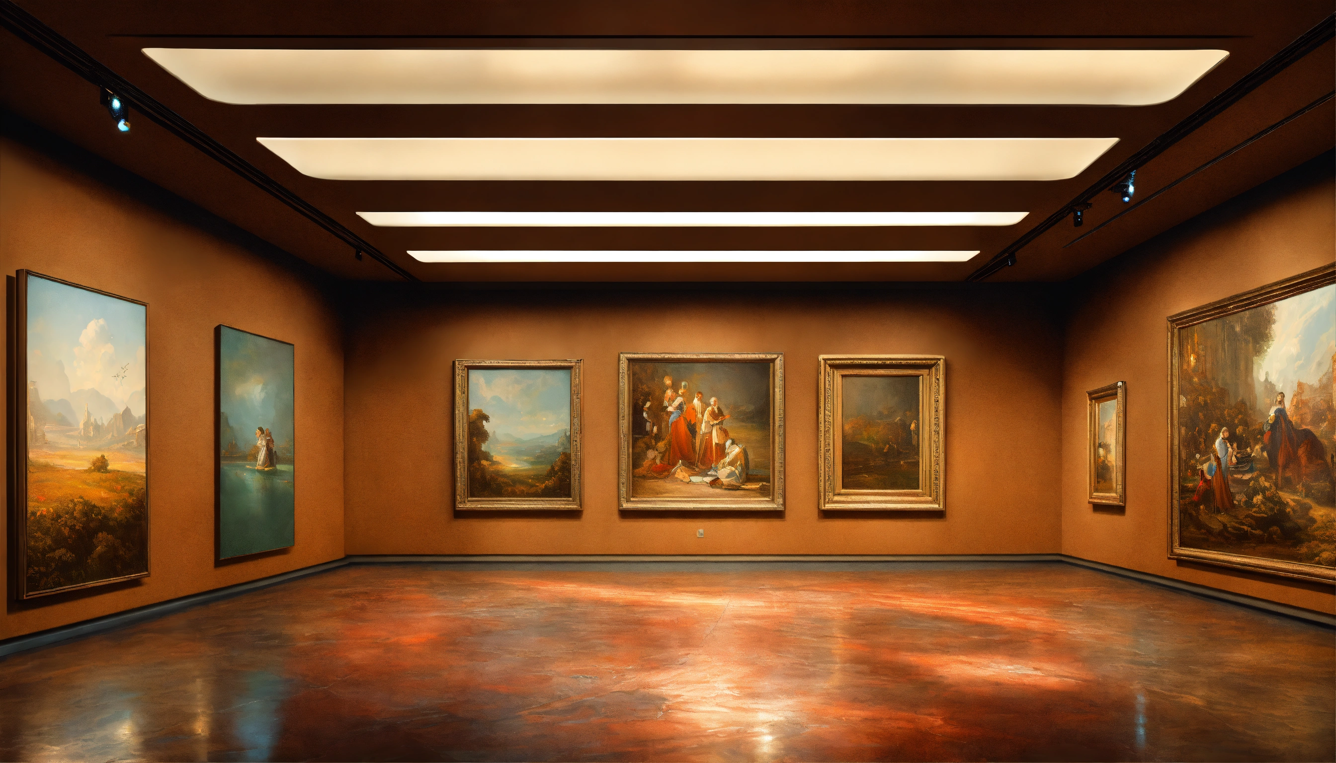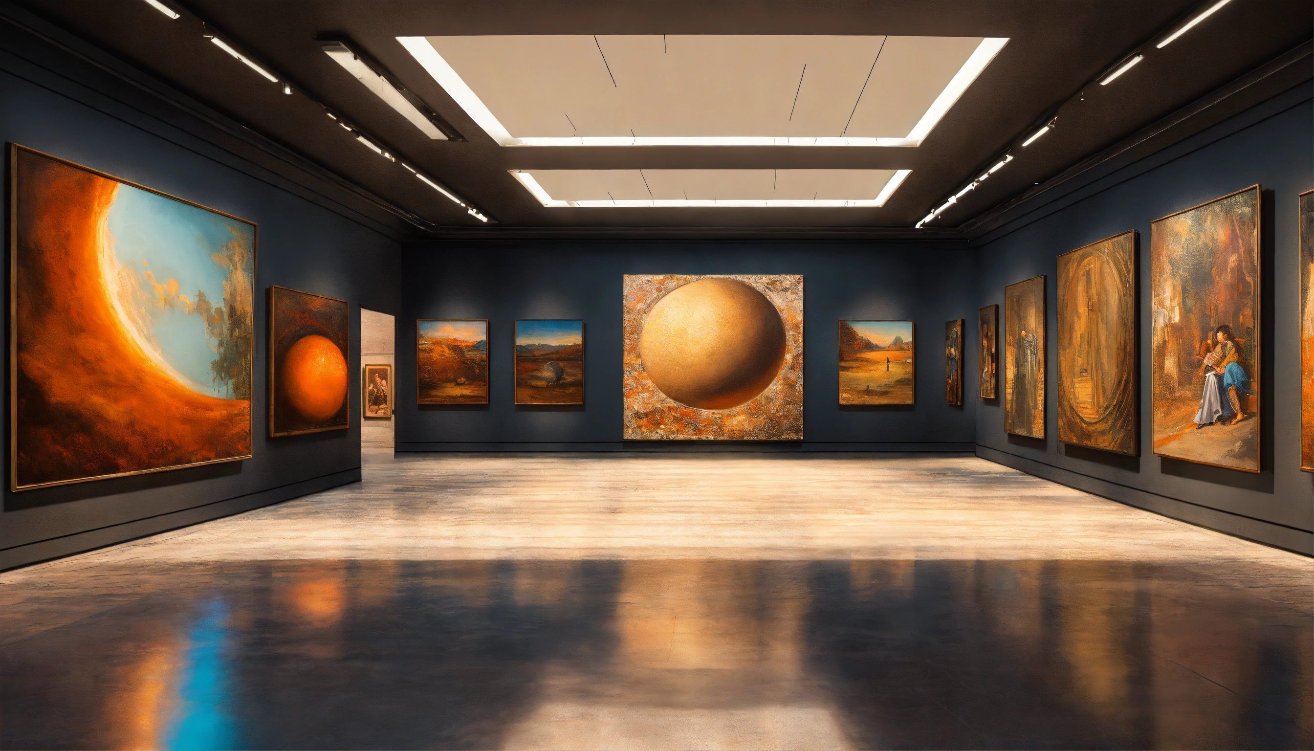 Hyperrealistic interior of futuristic art gallery with three even paintings on the wall, beautiful floor and ceiling, highly detailed by ricardo boffil and saturno butto, 8k hdr