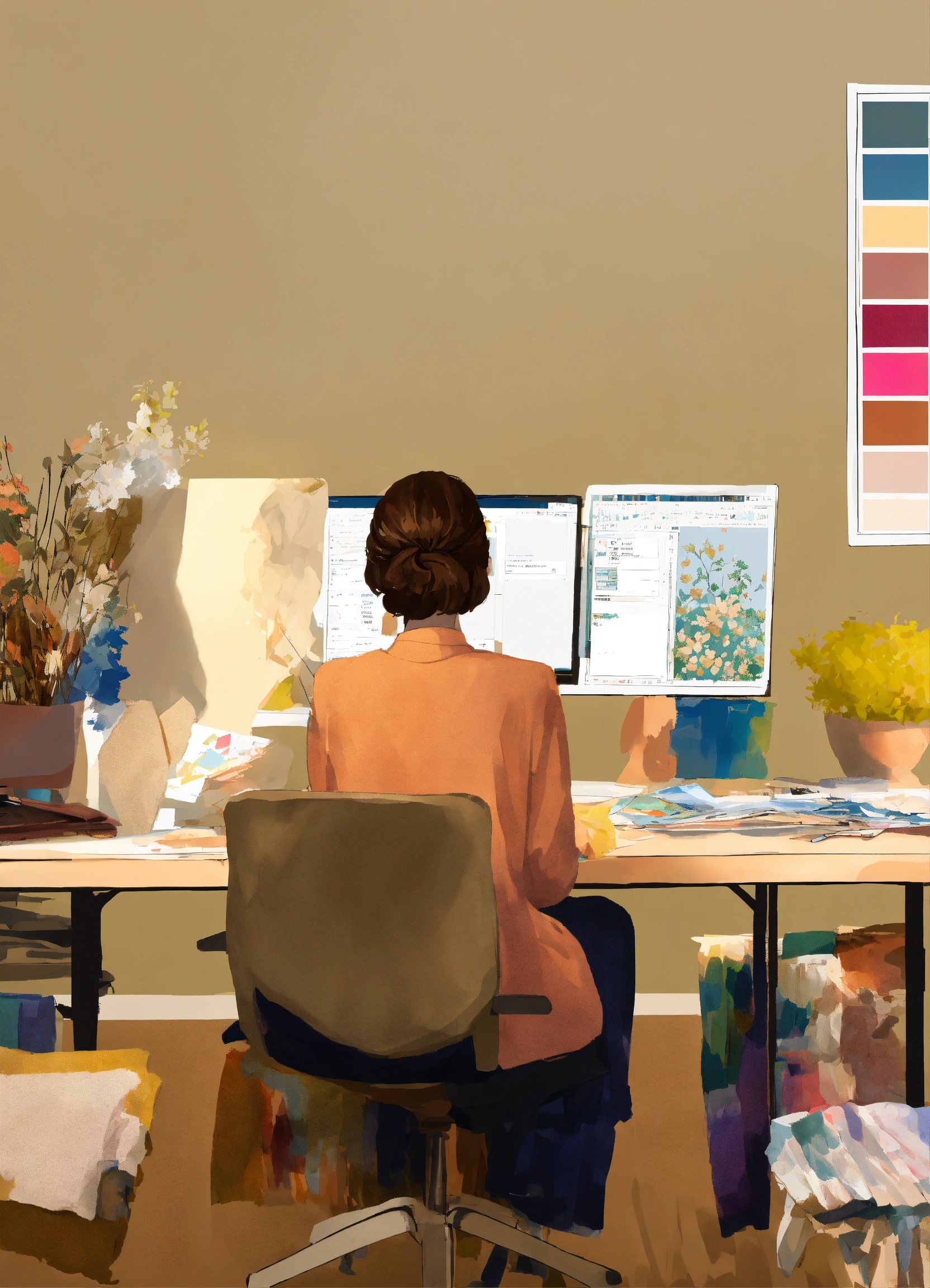 Create an image of a woman with light brown hair working with a color palette and fabrics, and using a computer, seen from behind and without her face showing. the image should only focus on the computer and the woman from behind. draw the white background. the computer must be a mac and there must be few objects on the table where she works.
