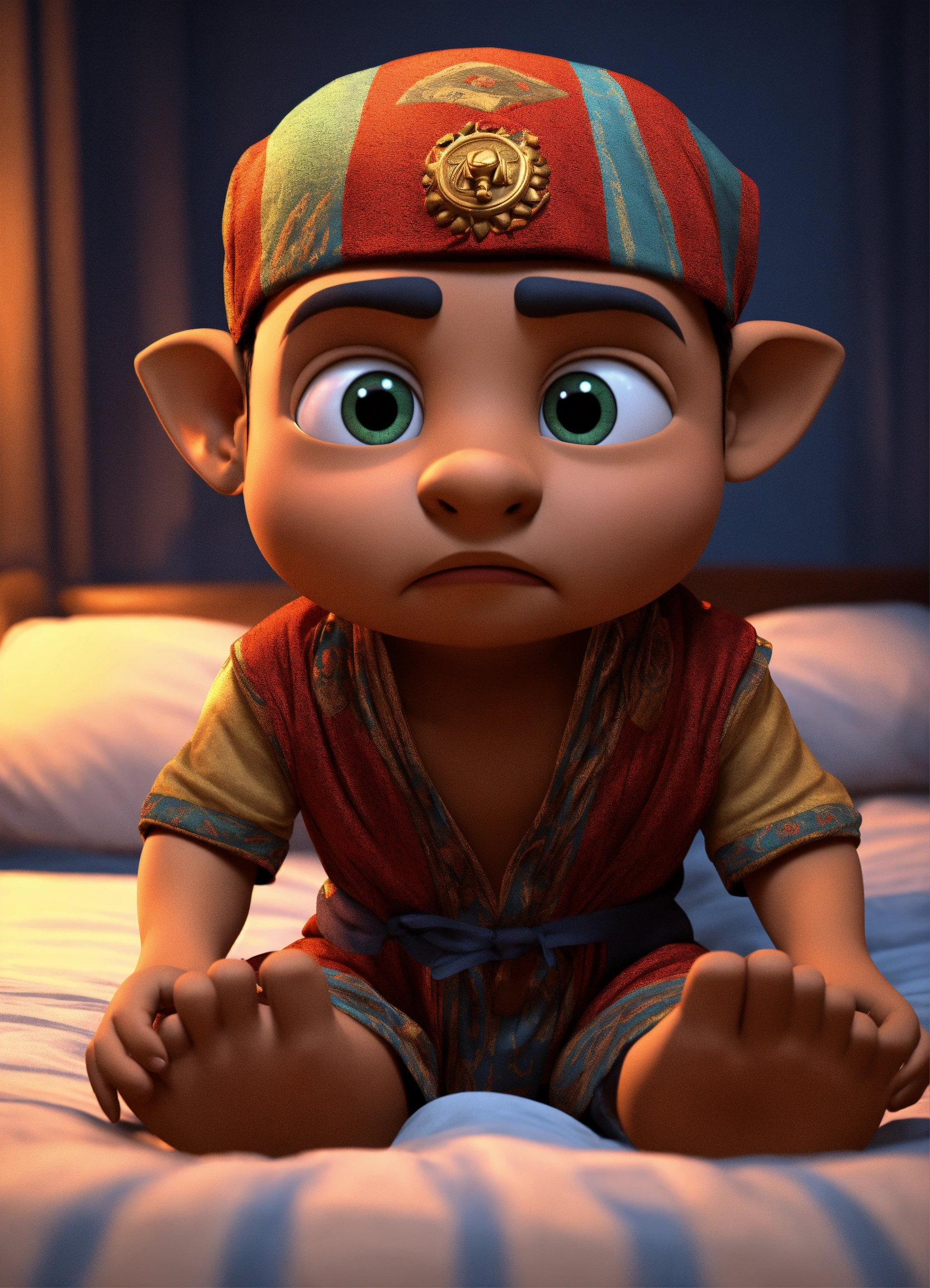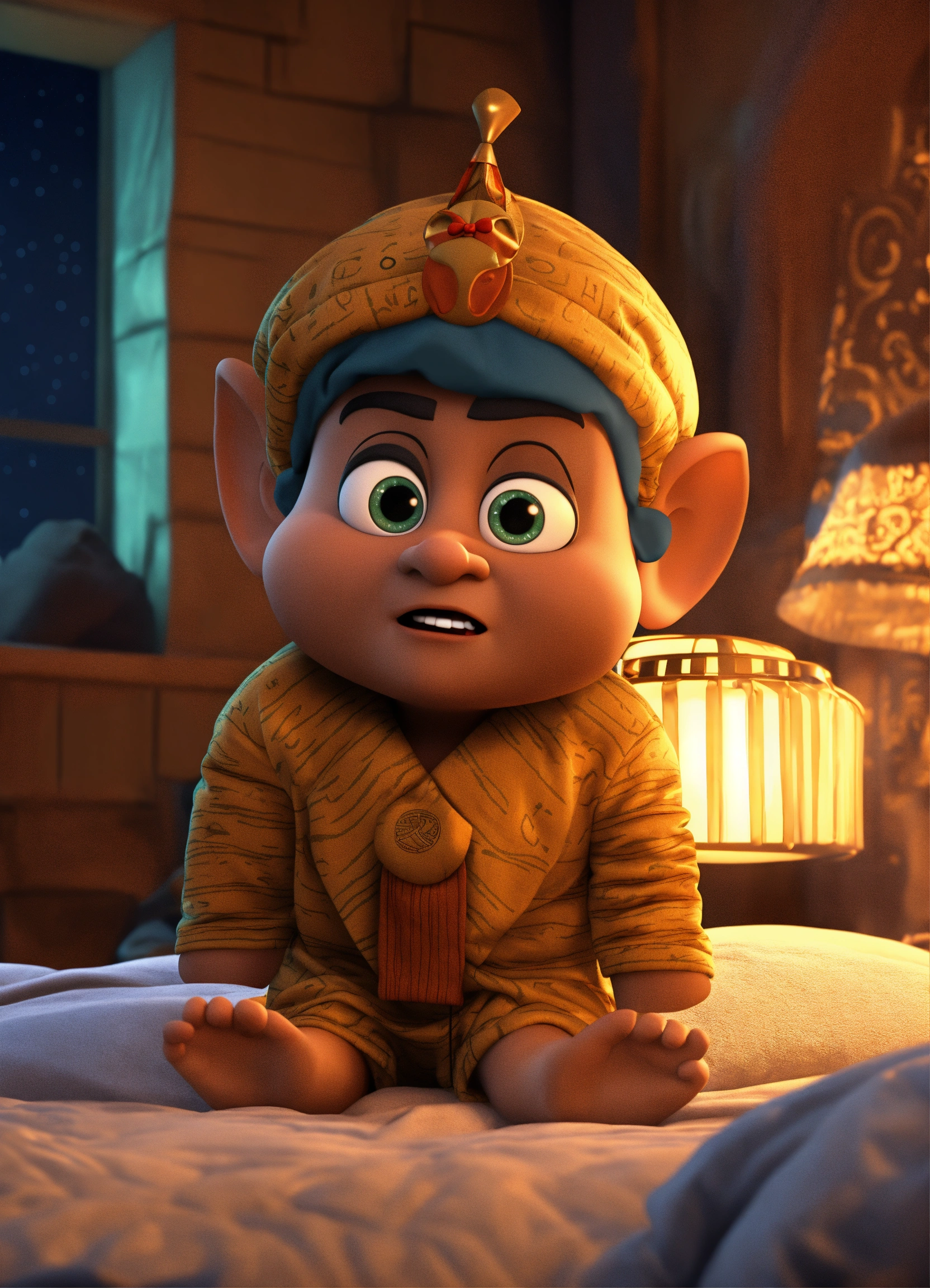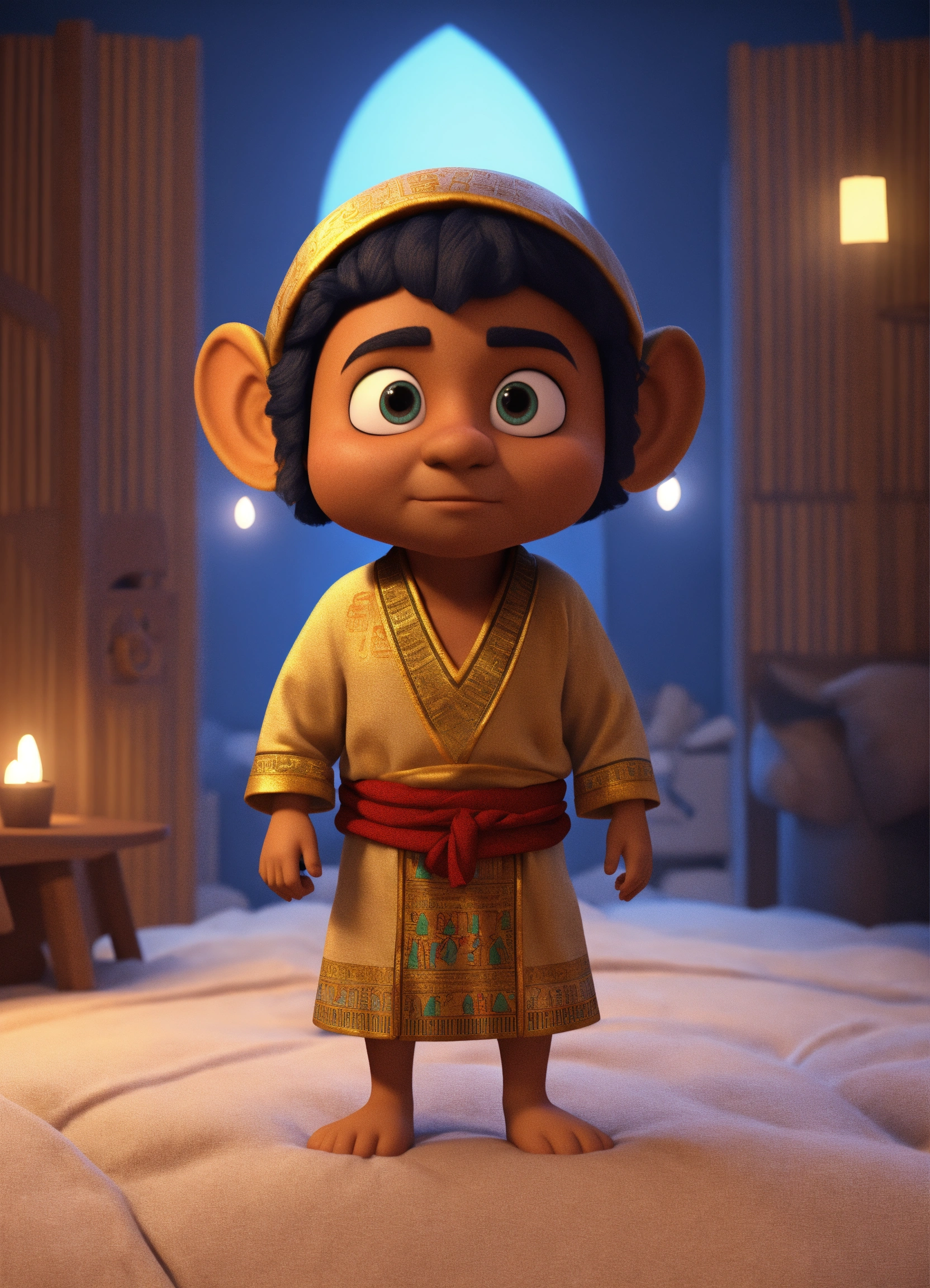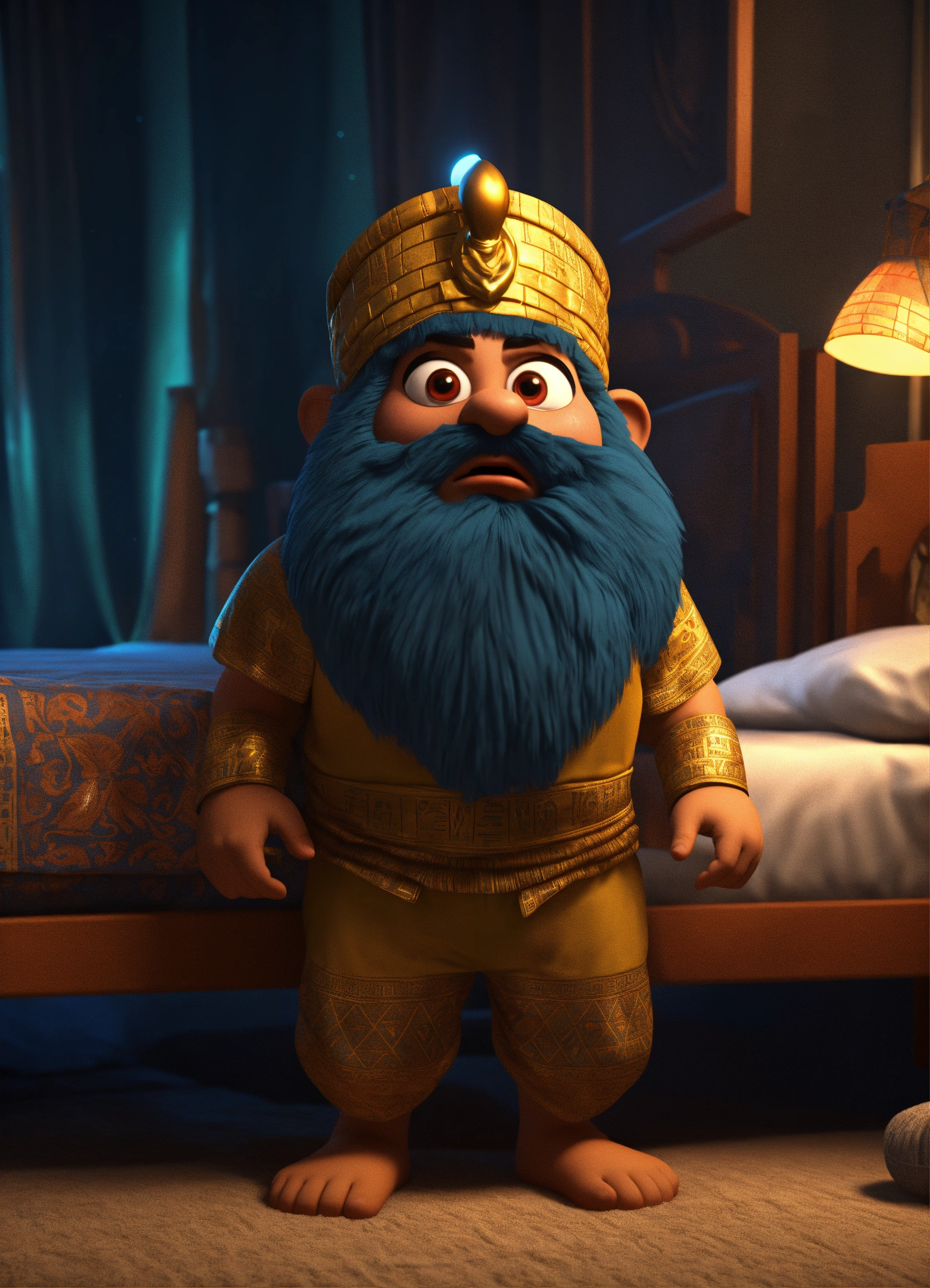 An egyptian dwarf who escapes from bed and wearing pajamas a frightened face in the middle of the night 3d animation style