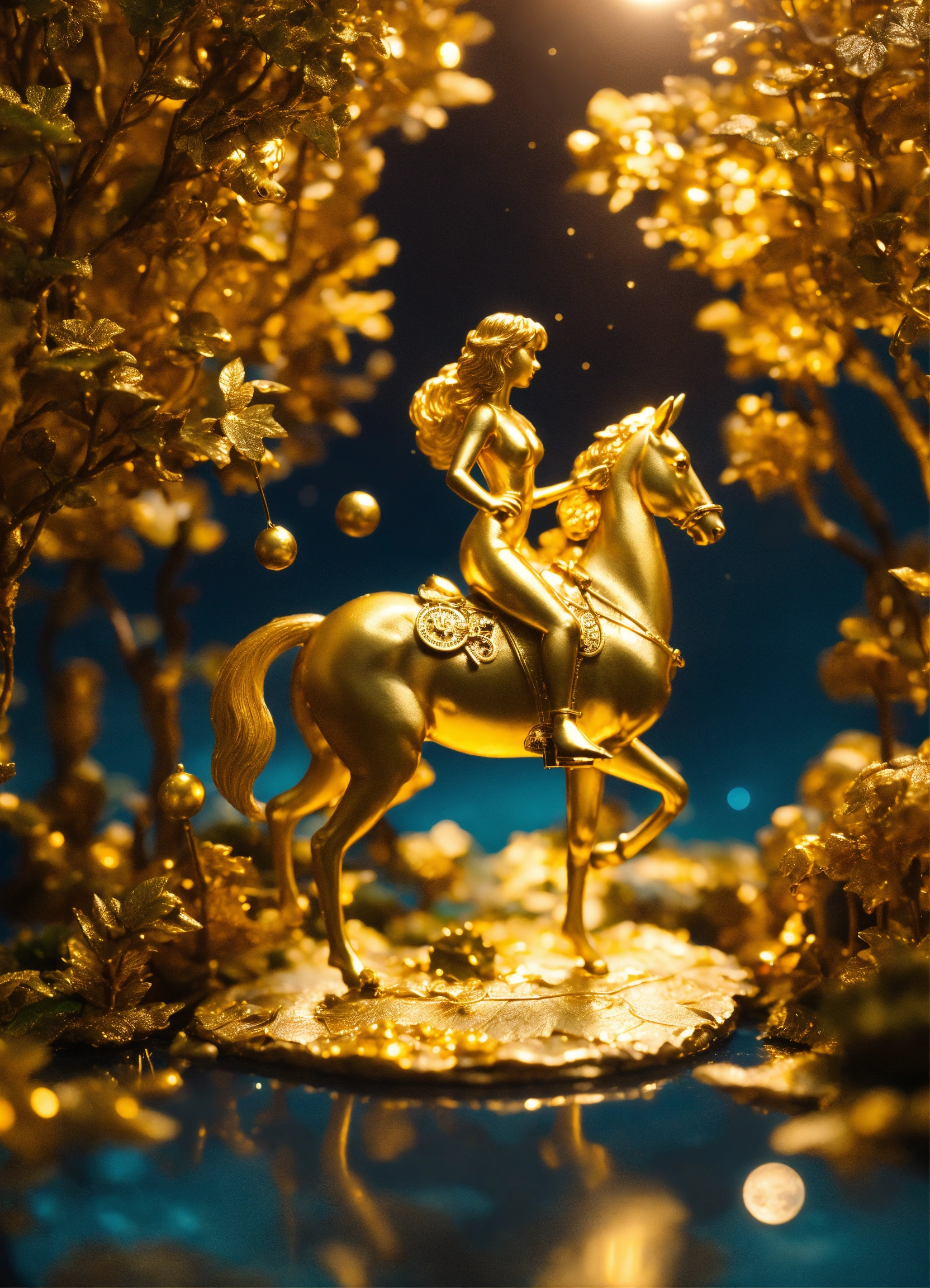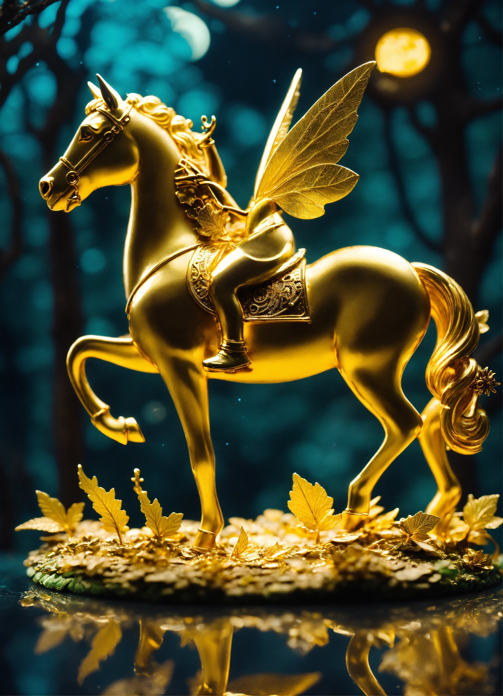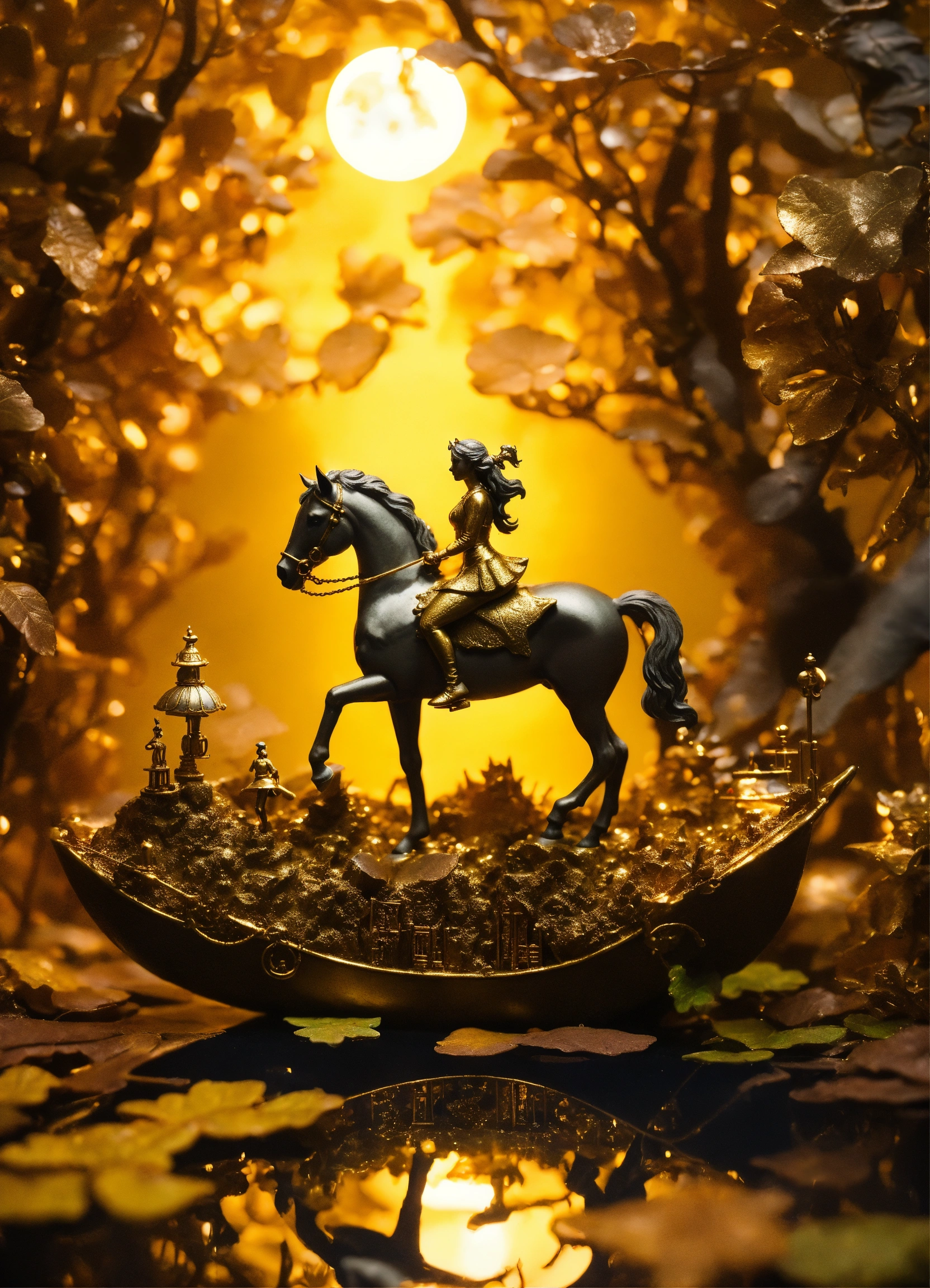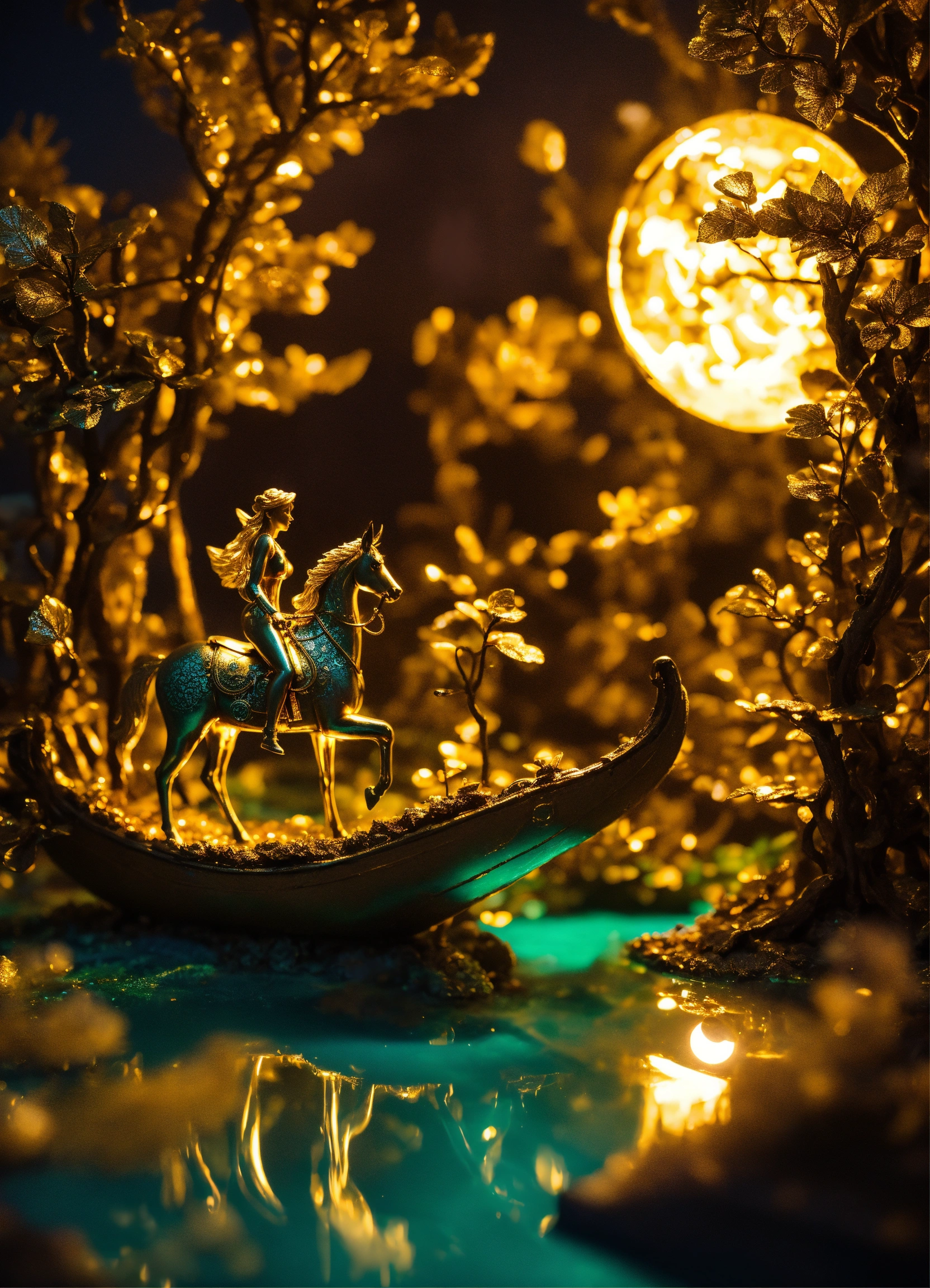 An enchanted forest made of liquid gold, a centaur sailing on a leaf, claymation figures, steampunk inspired, rich and detailed, glowing moonlight, fairy woodland.
