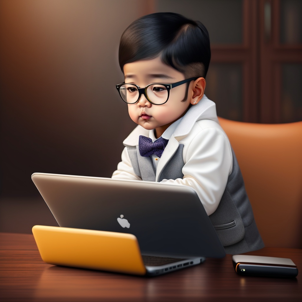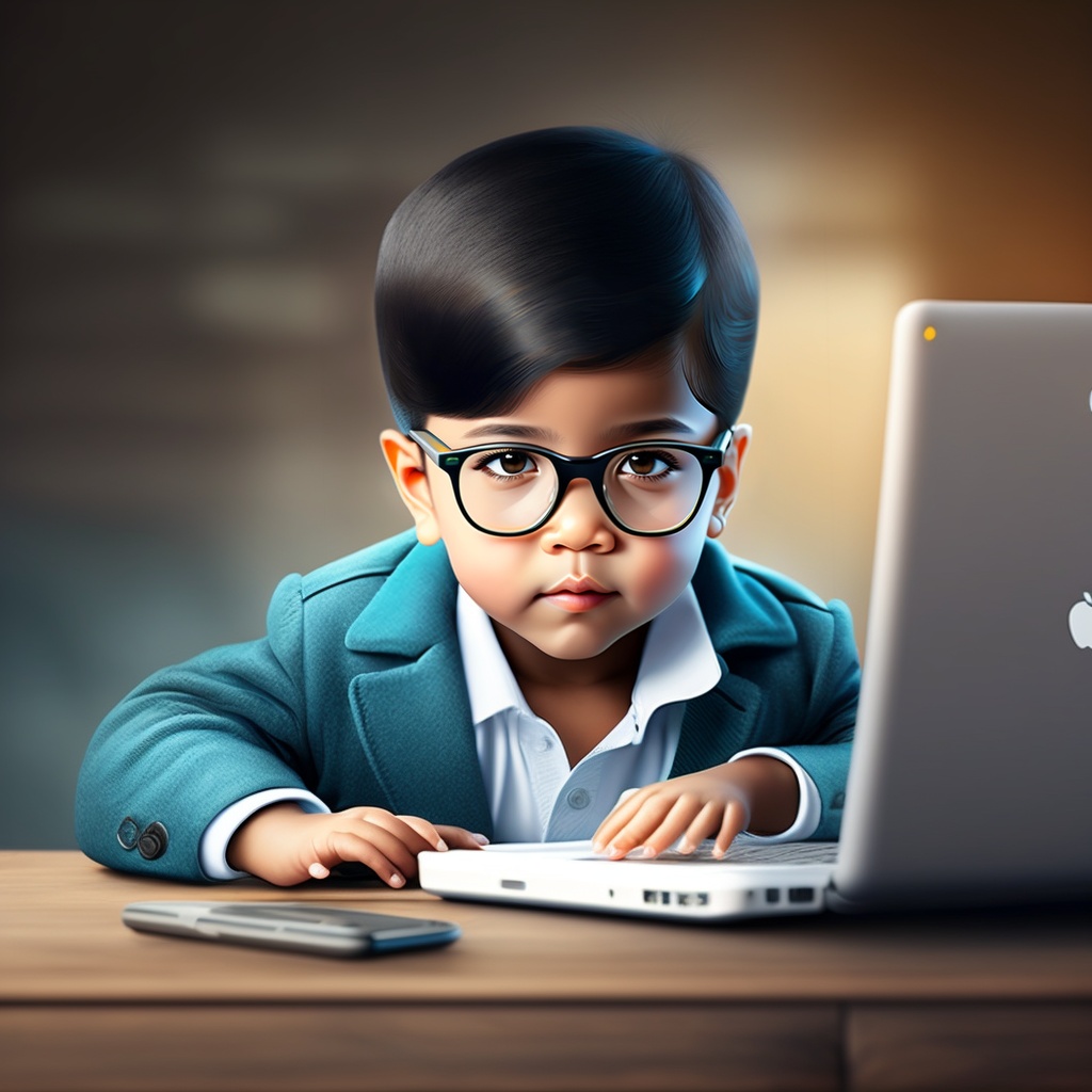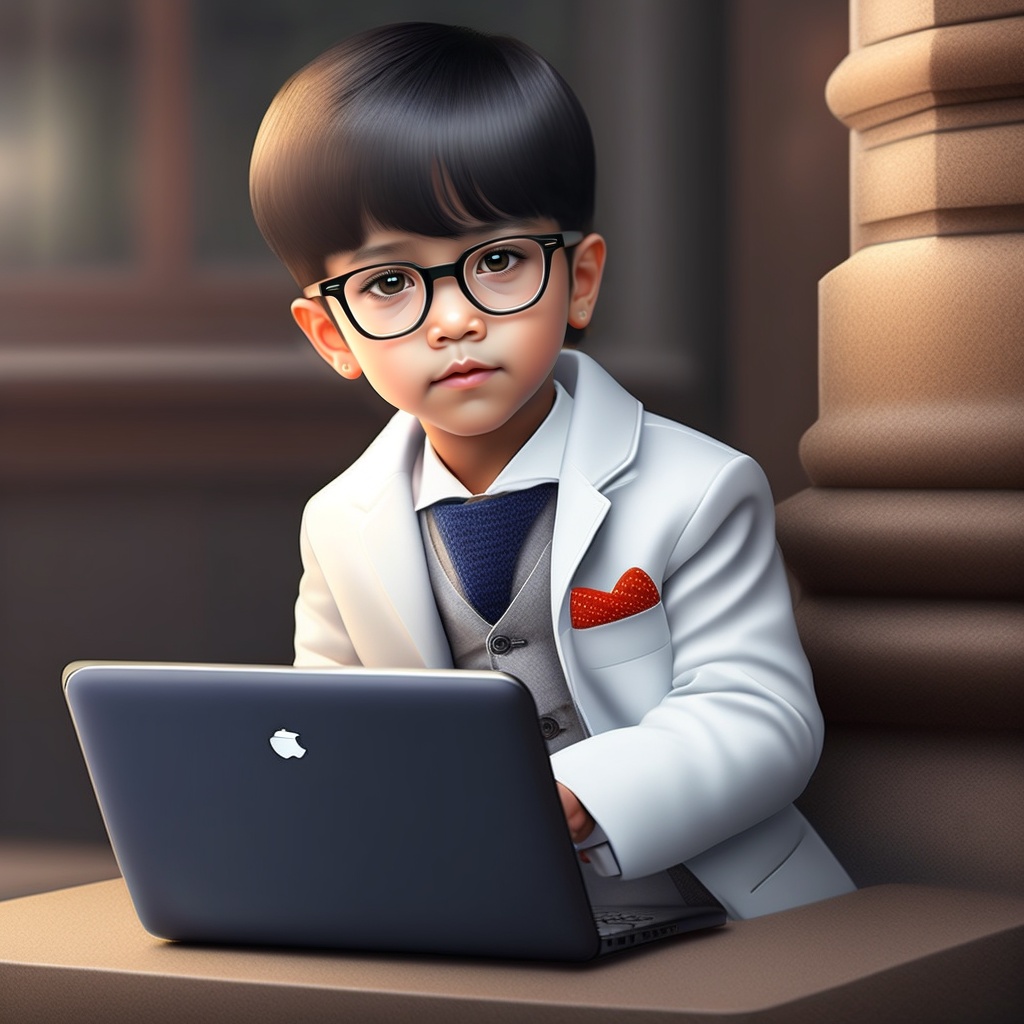 A whatsapp dp where kid wear glasses with white pent coat, black hair, poor home background using laptop