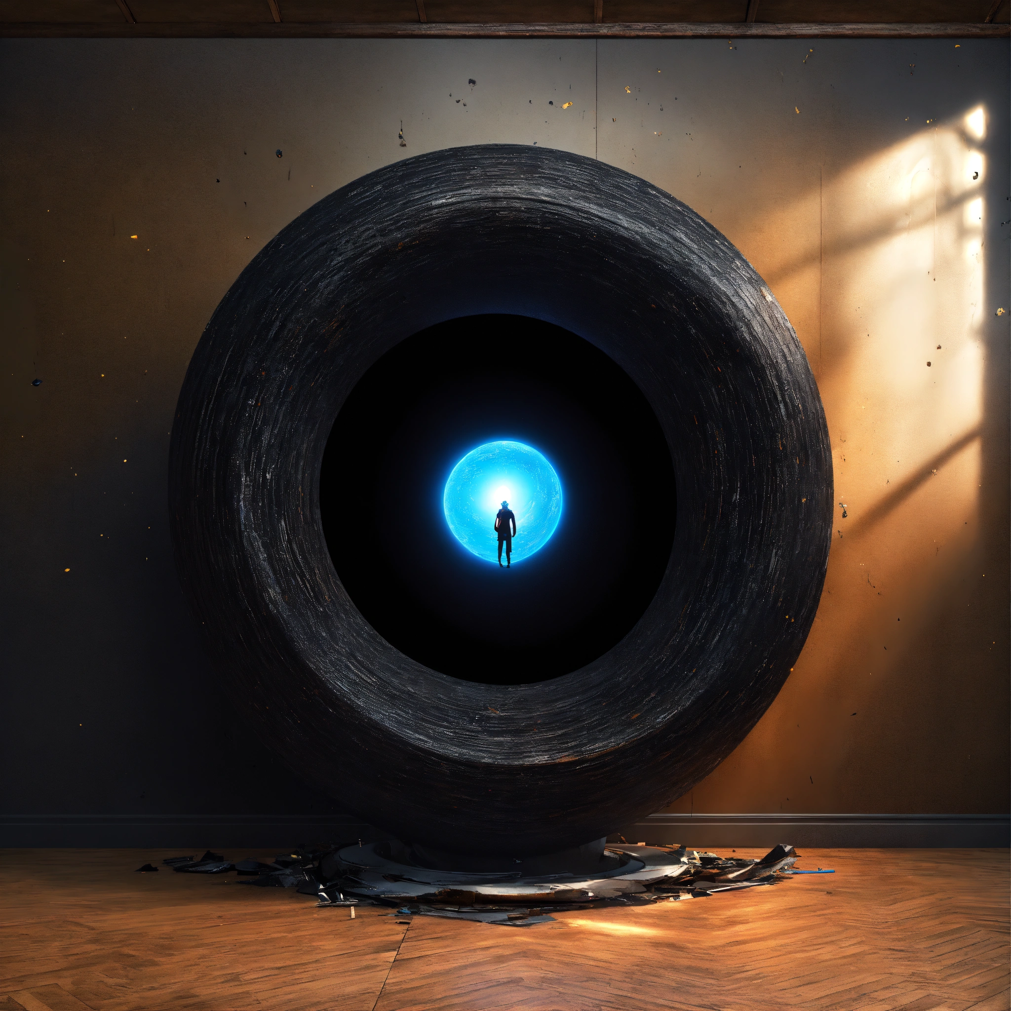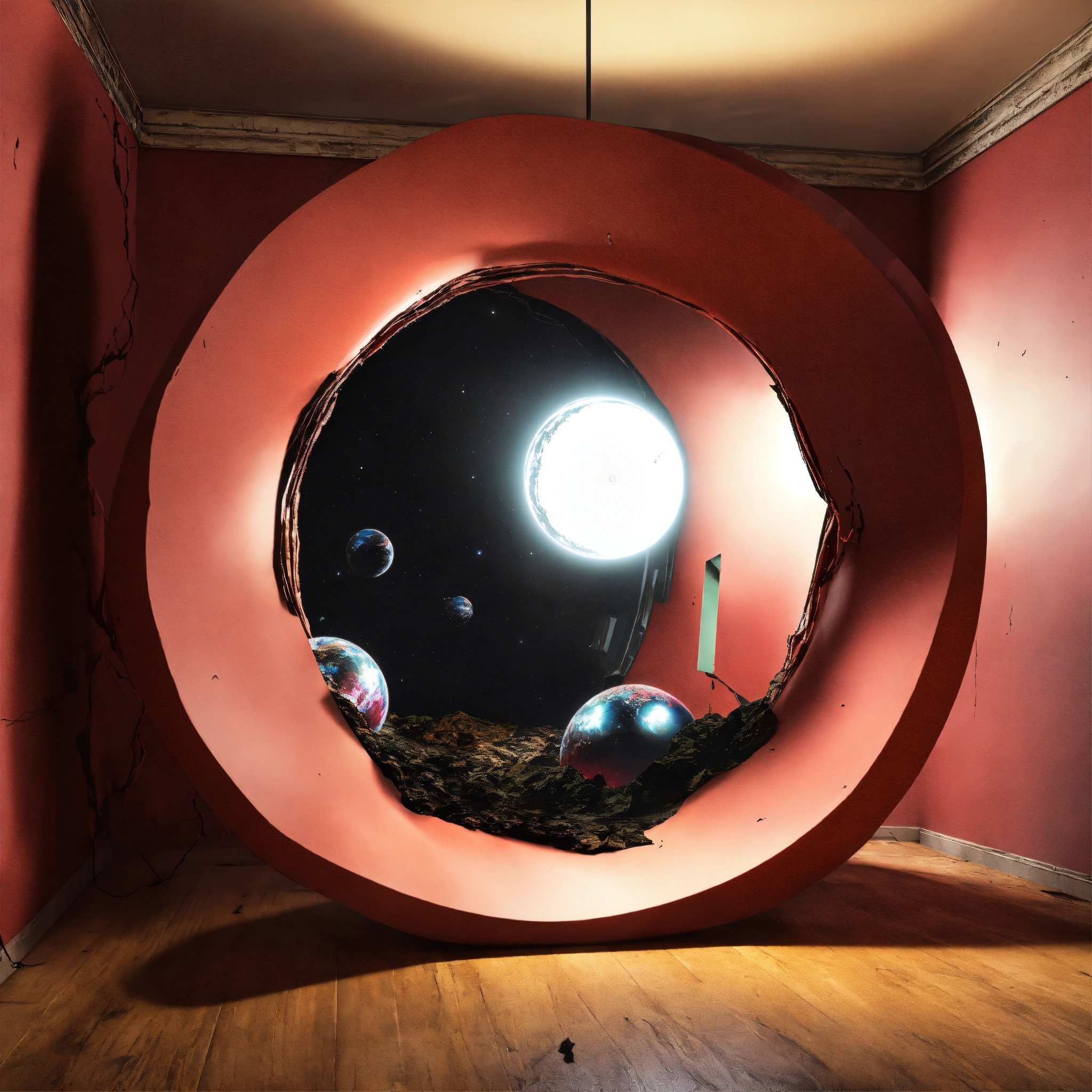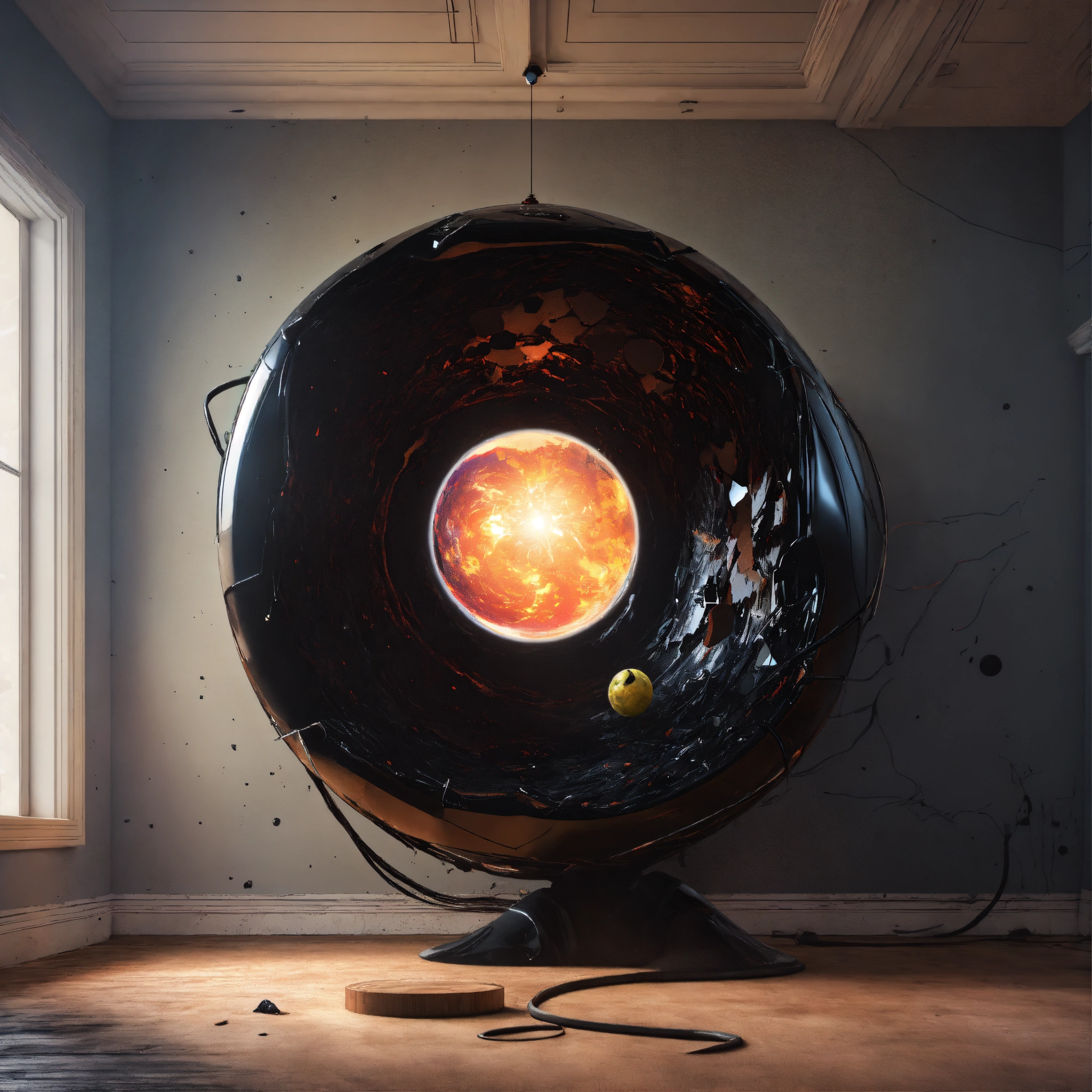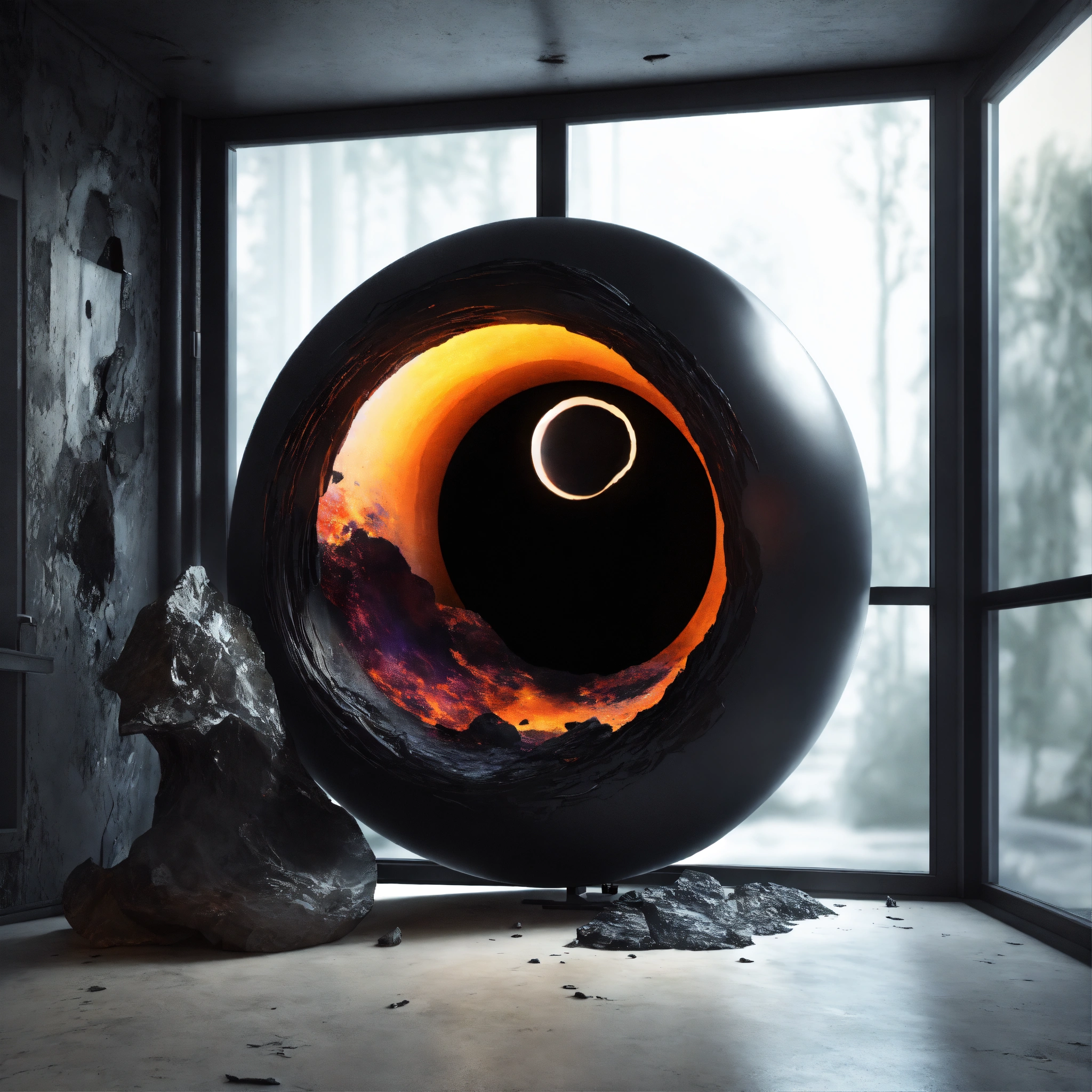 3d digital art black hole holding strange alien object odd shape damaged out of place indoor
