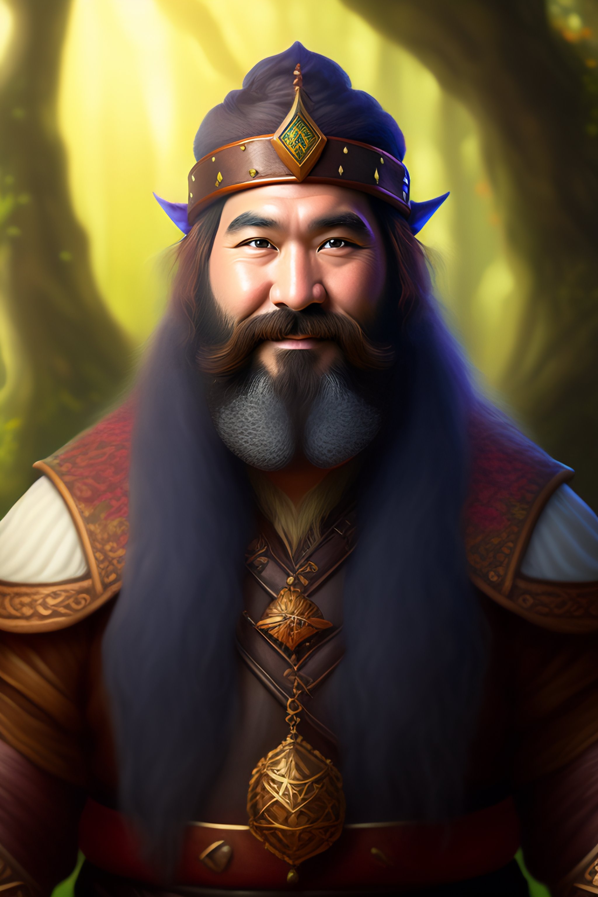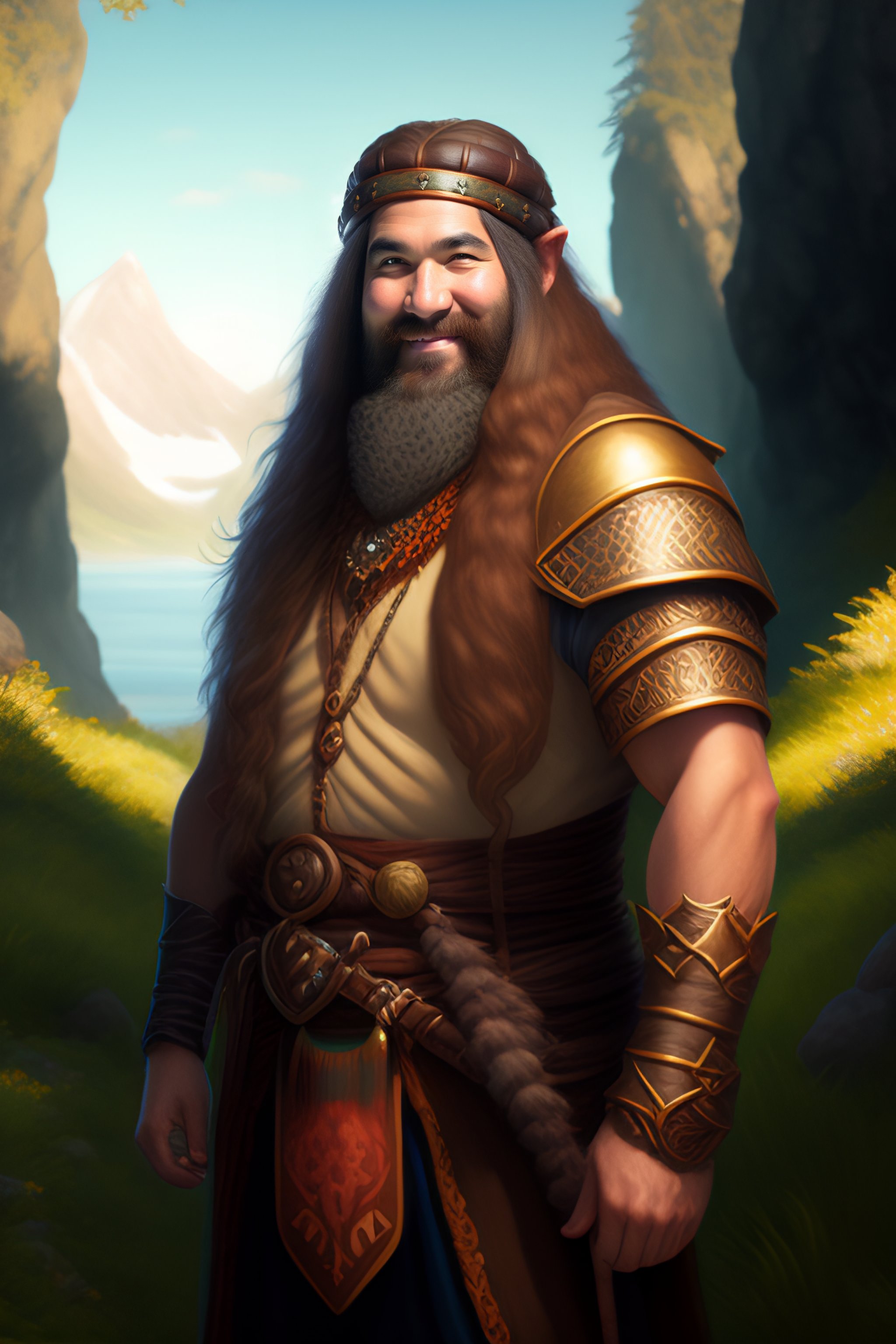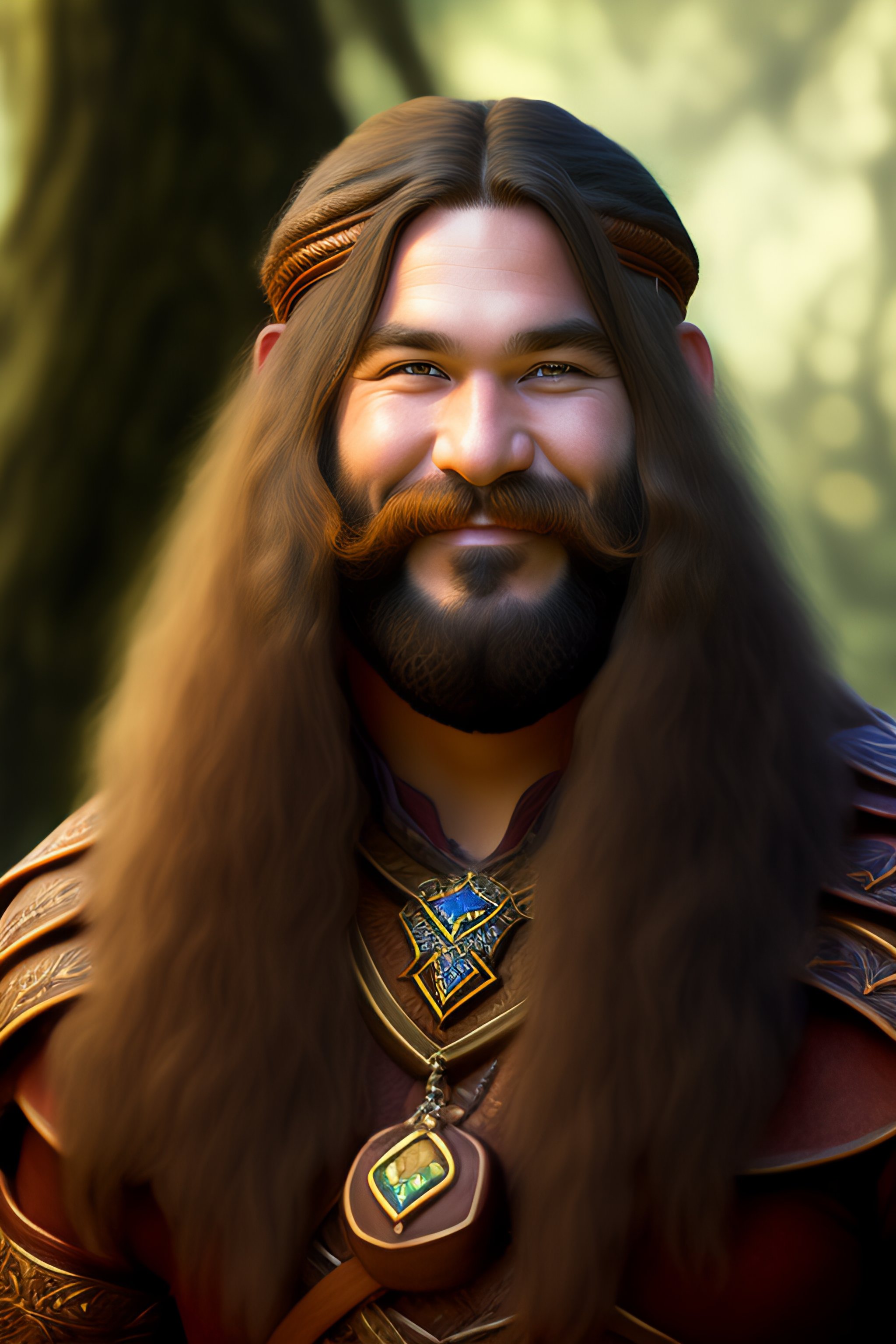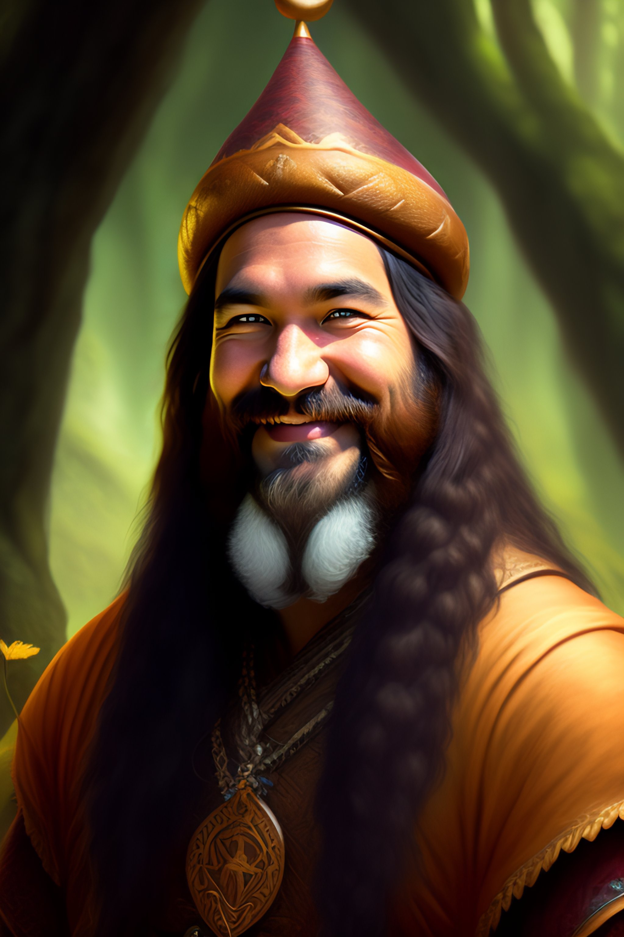Portrait of a d&d deep gnome druid, 145 lbs in weight, 4 feet tall, 39 years old, scar on face, long hair, smiling