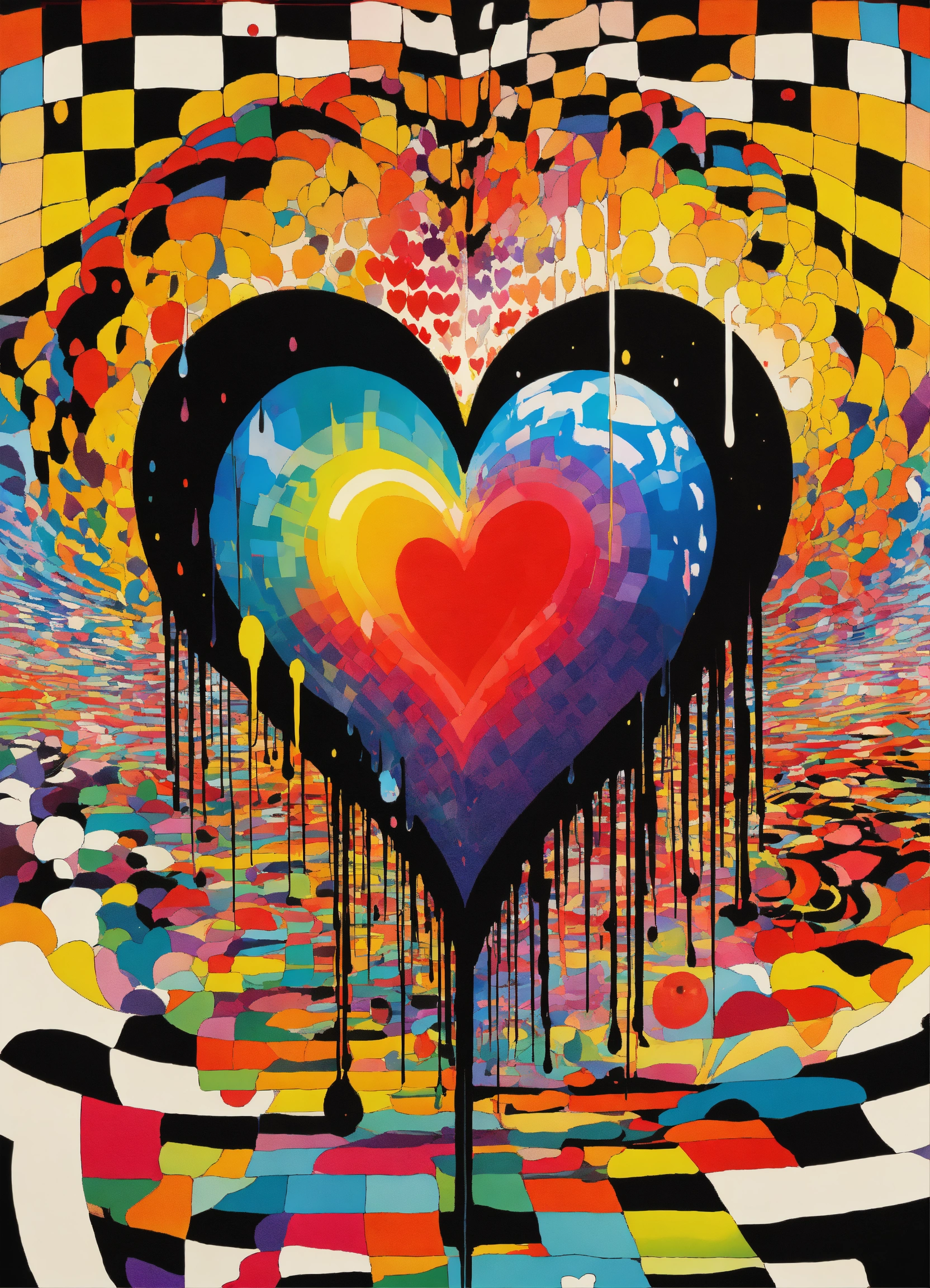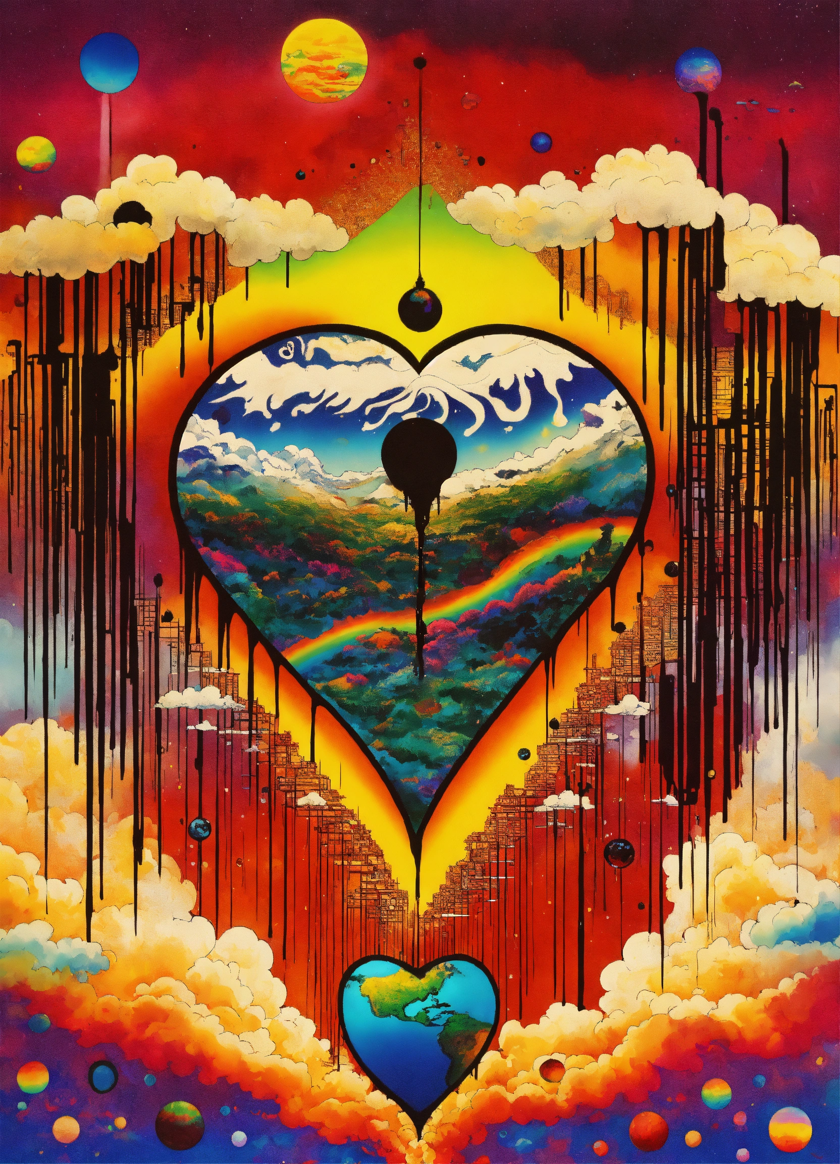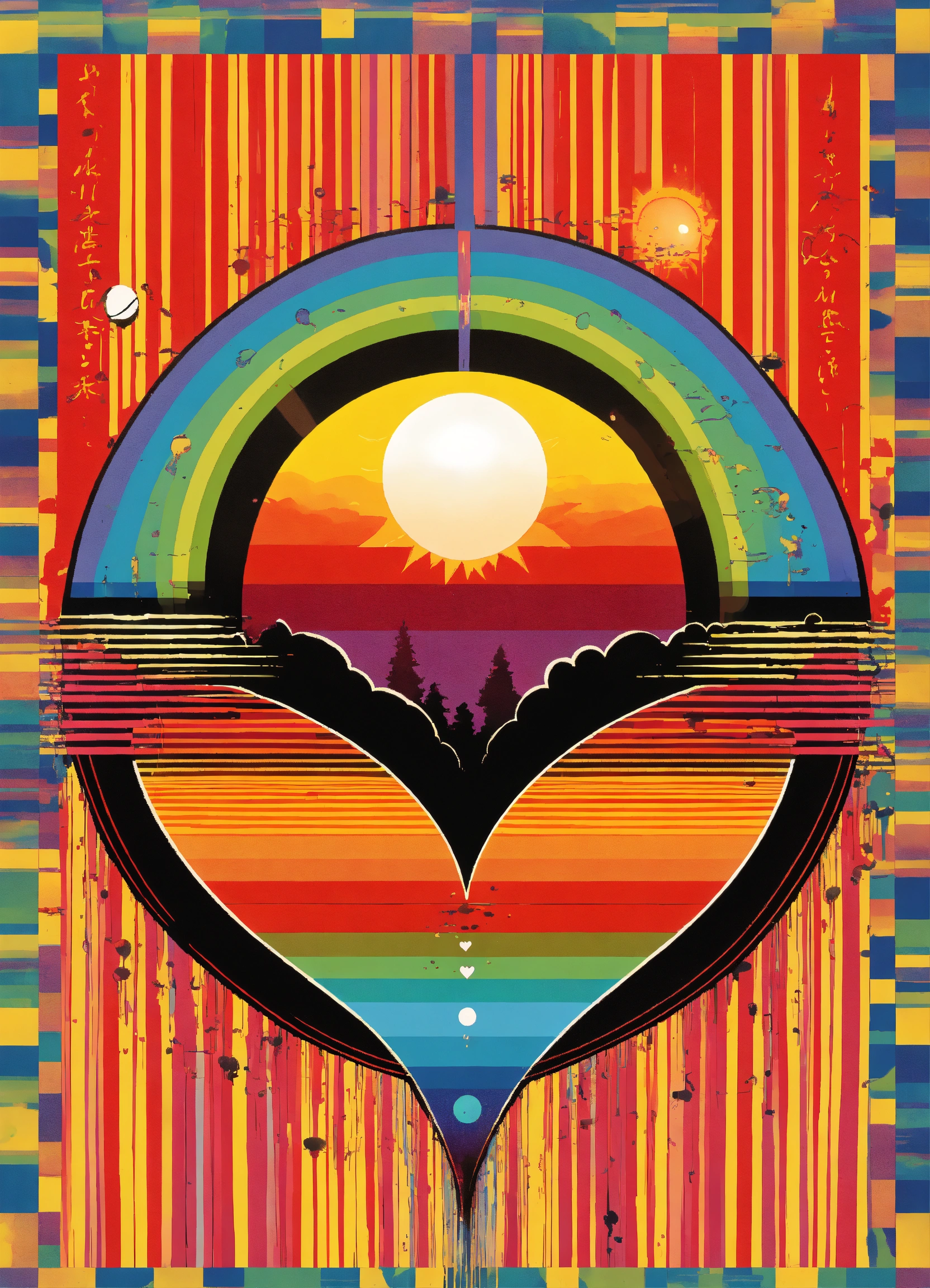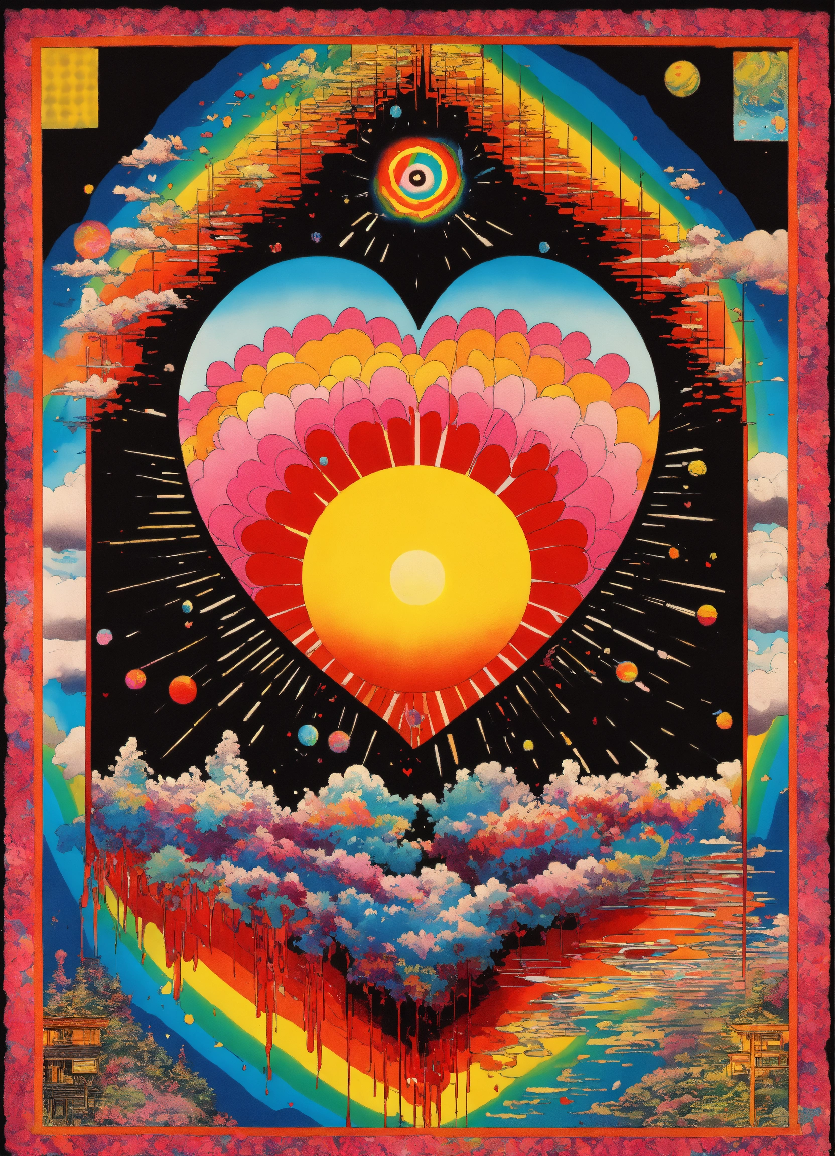 Big love heart japanese vintage poster, oriental, big sun, abstract psychedelic vortex, rainbow melting eyeball merging into dripping love-heart, dream dimension merging into nebula merging into sun, rainbow geometrical clouds dripping, the four corners of the earth, black and white checkerboard patterns dripping by jake holschuh