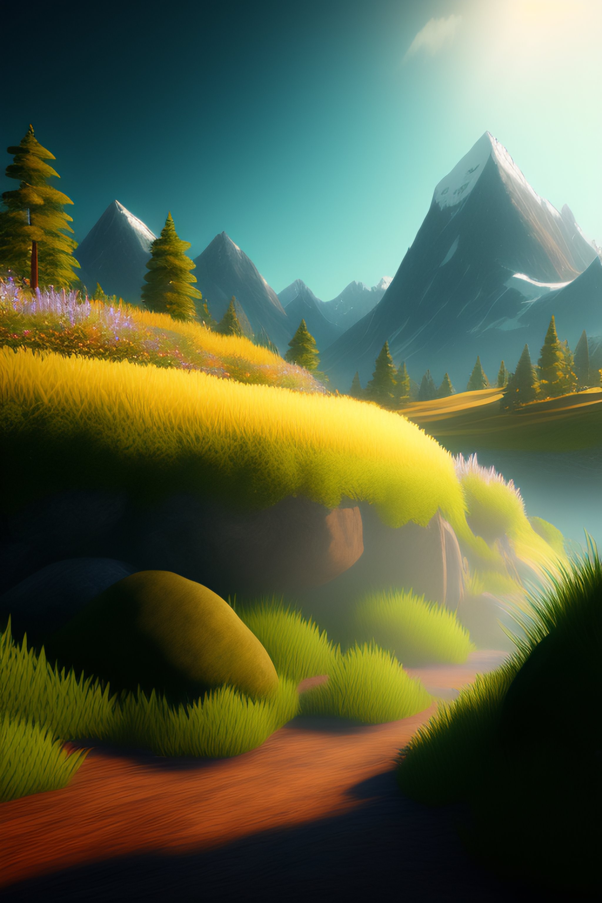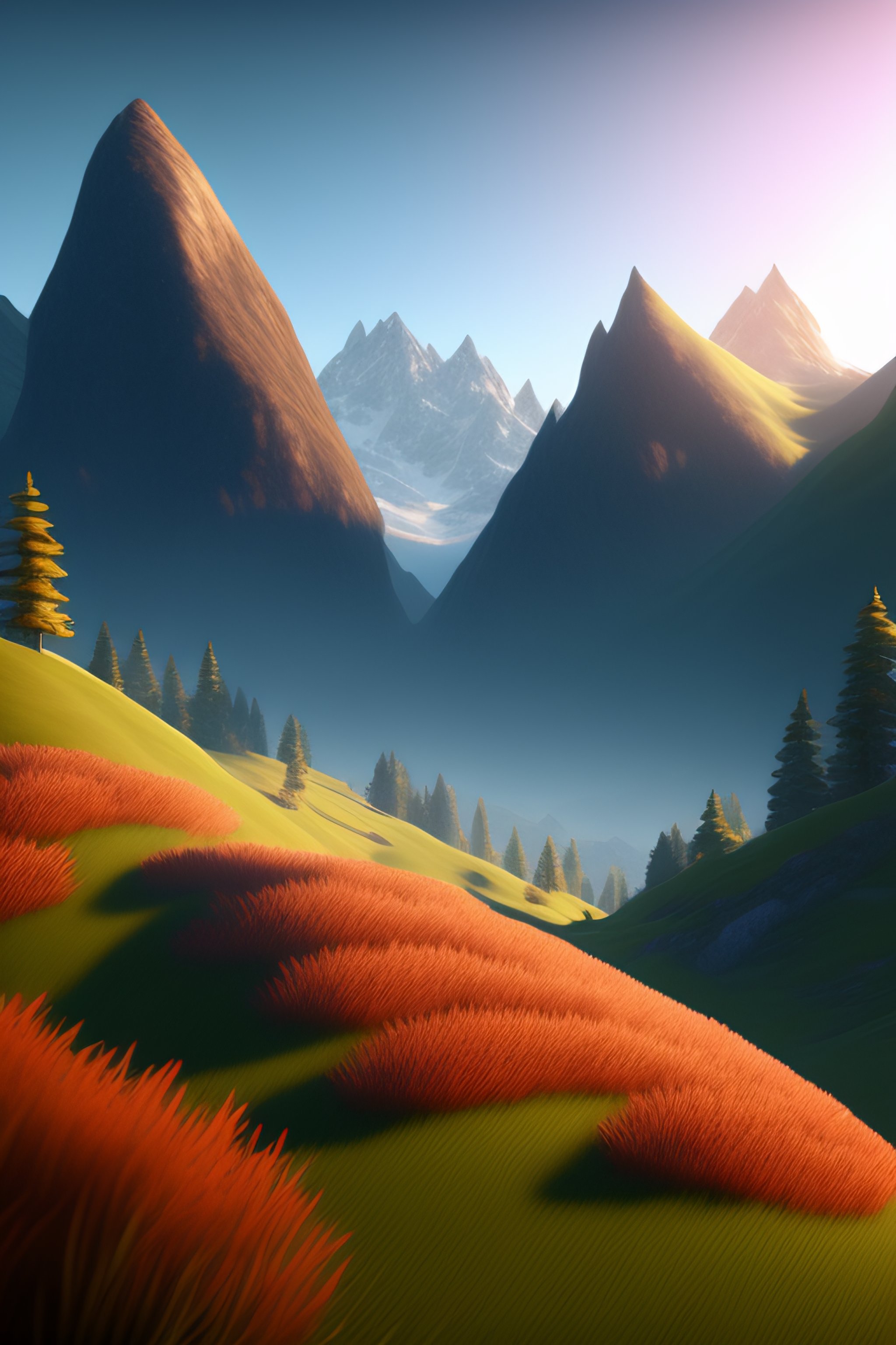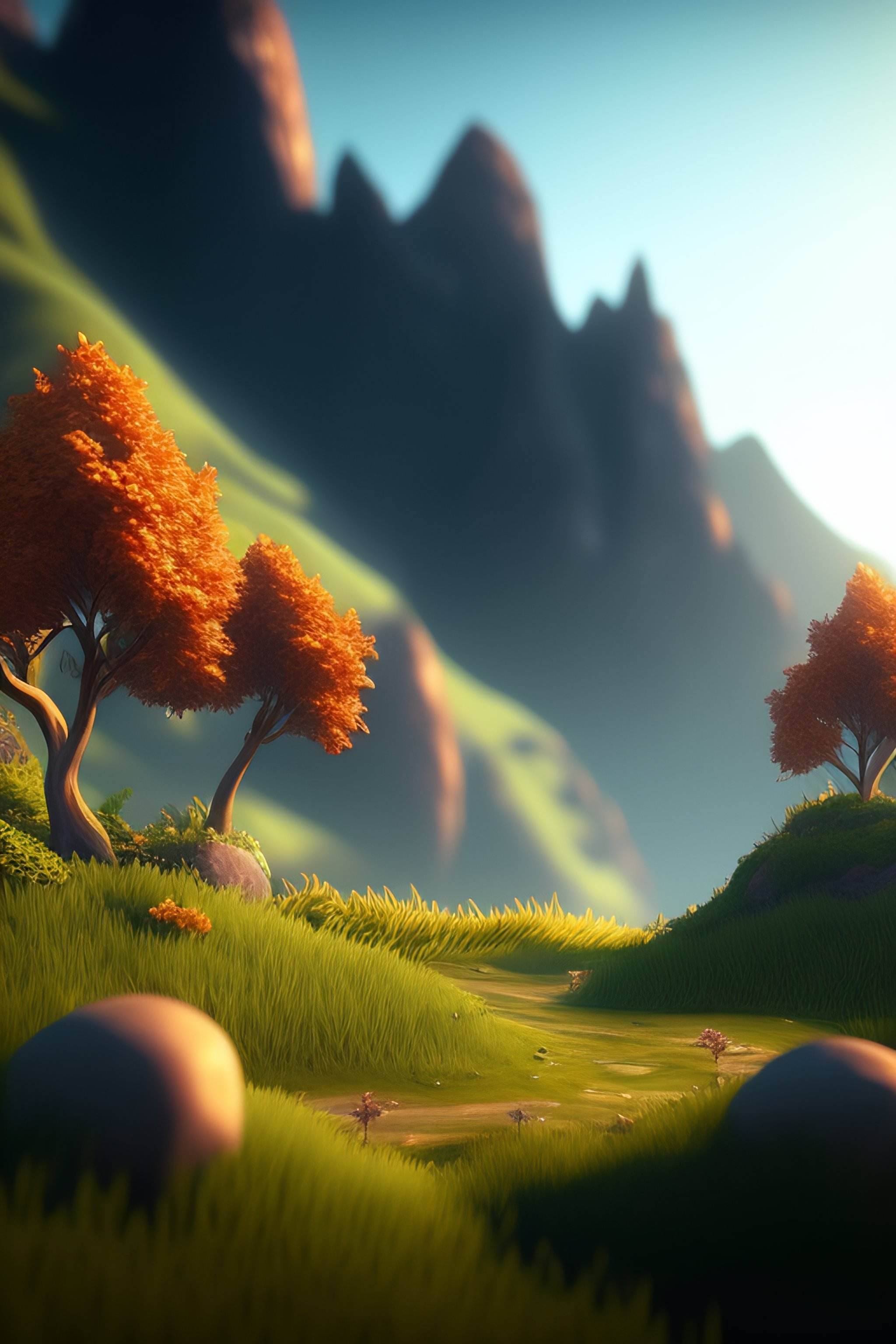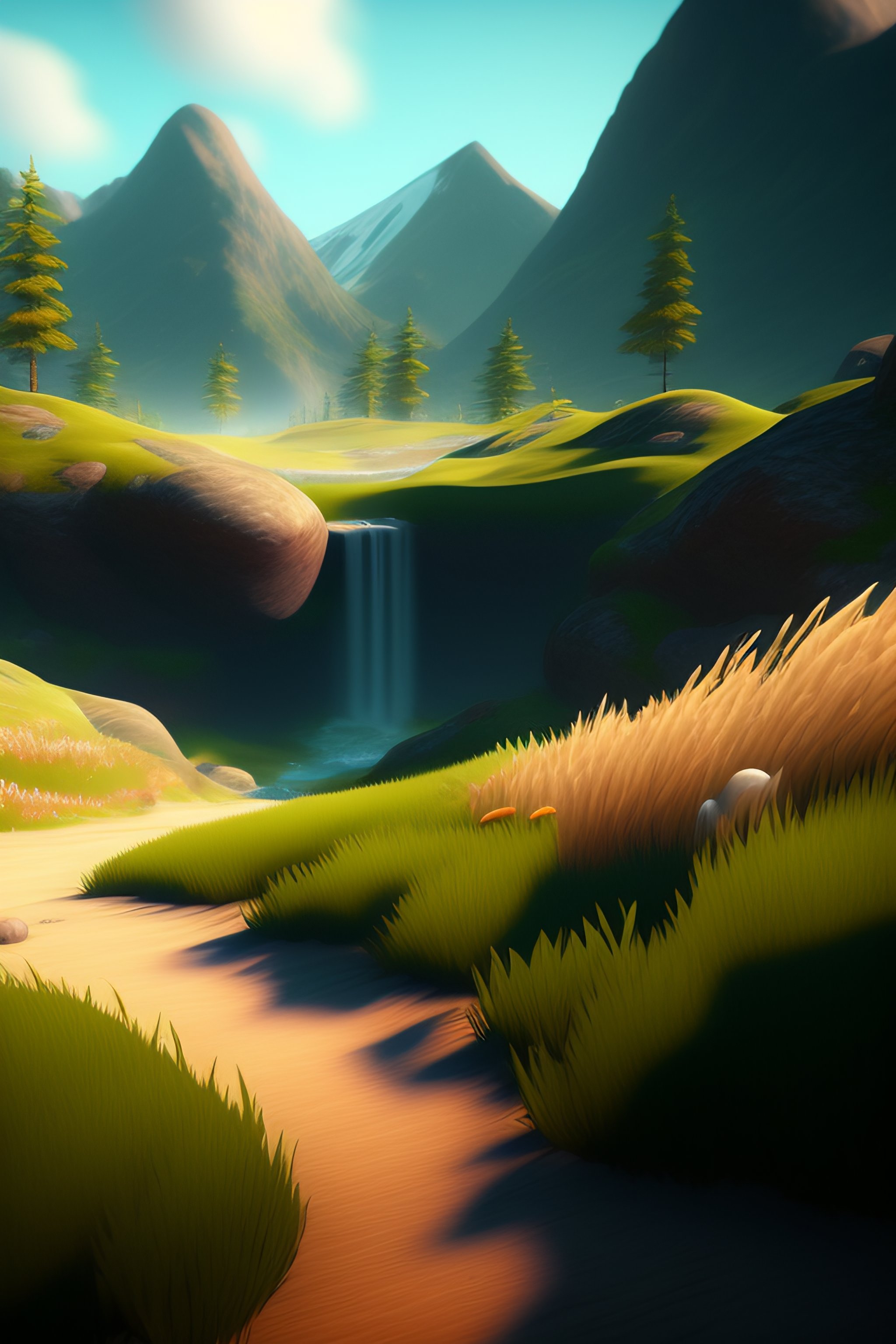 A beautiful realistic looking 3d render, nature scene used for a game, perhaps a mountainous background, lots of grassy areas the player can walk around on