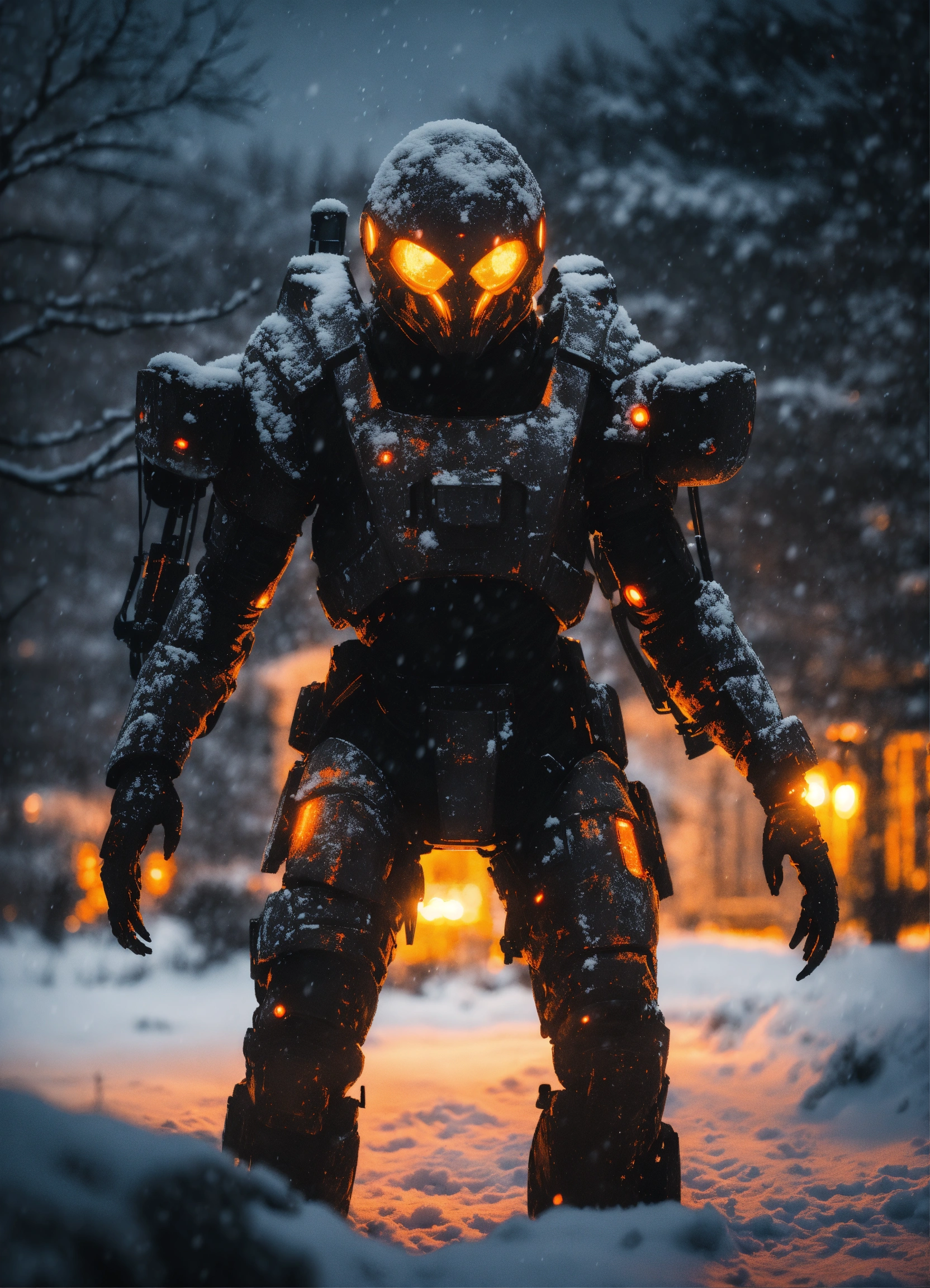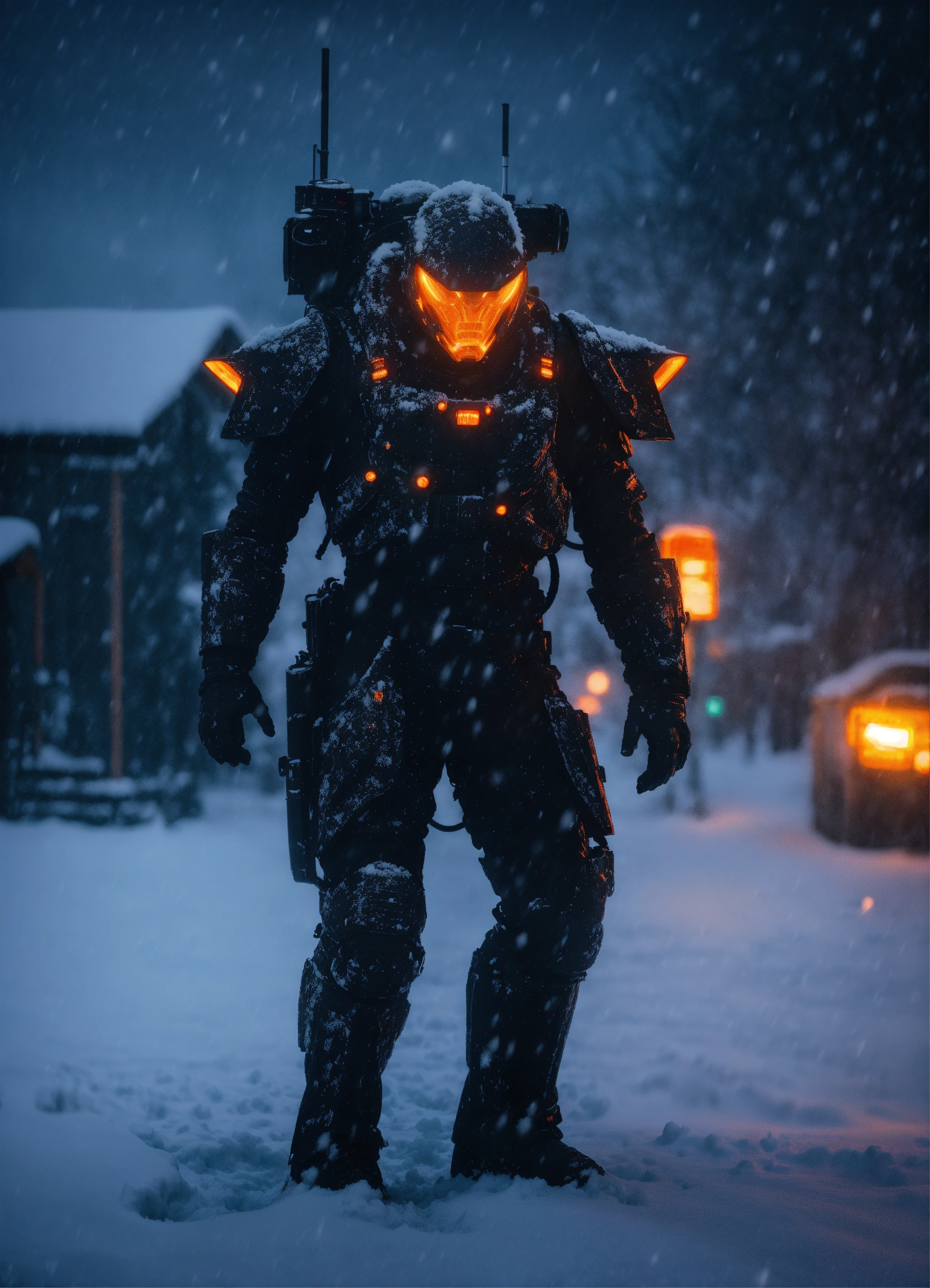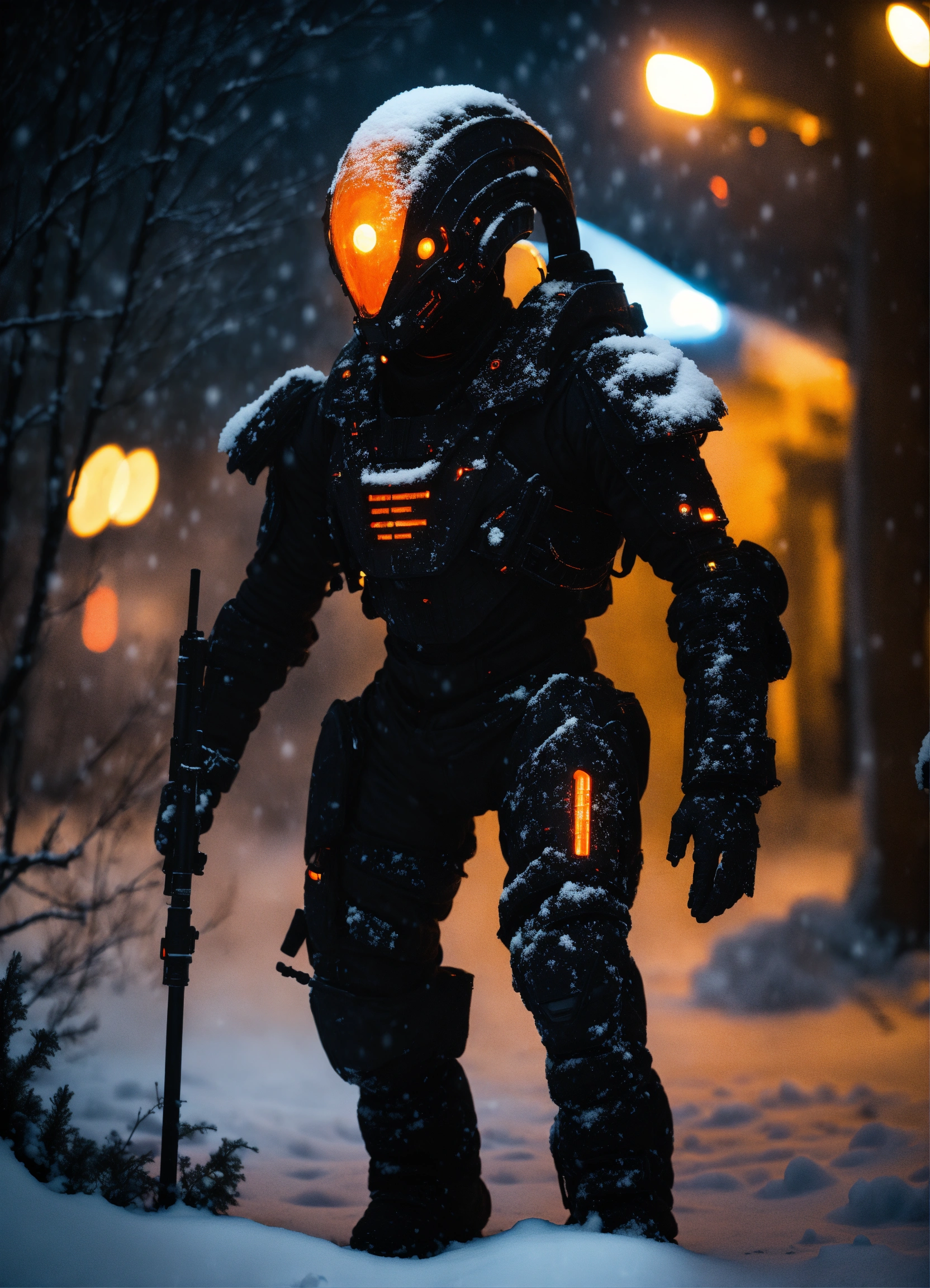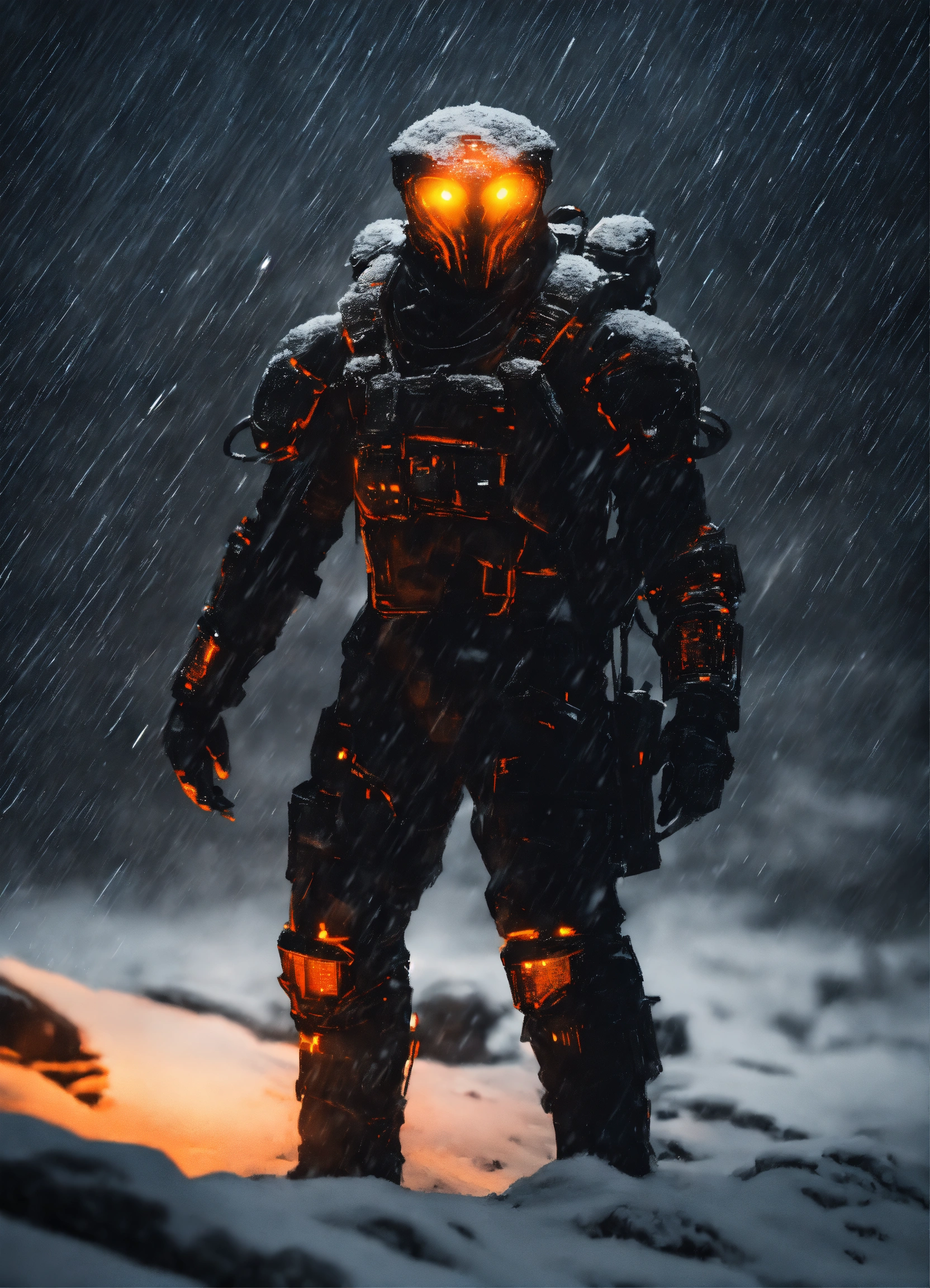 A alien soldier monster, distant full body portrait in a landscape, wearing black whit orange lights, during a snow storm, dark lighting, intricate details, depth of field, in a cold snowstorm, outdoors, night